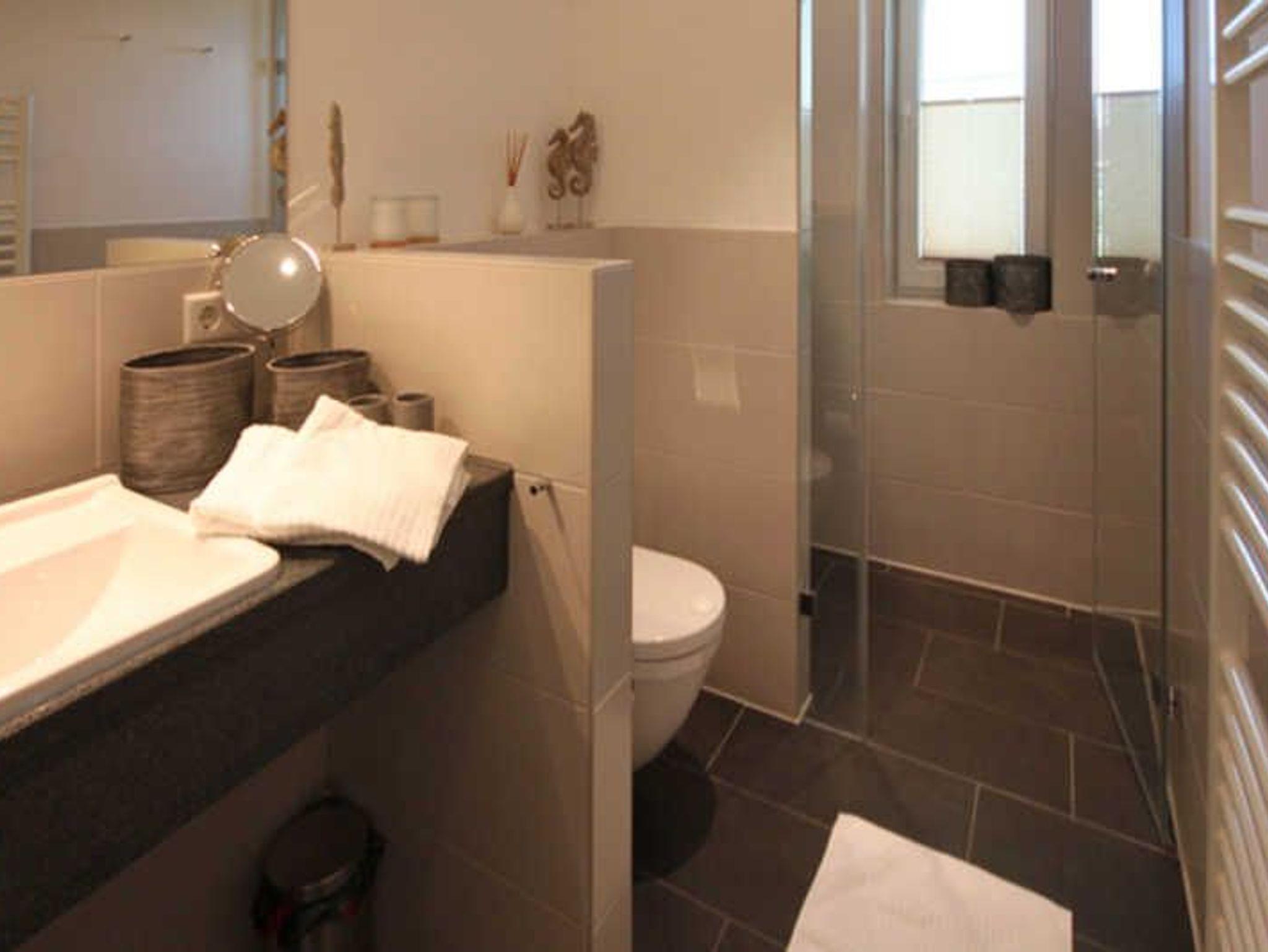 Das Duschbad besticht mit einer bodengleichen Dusche und einem großen Waschtisch mit einem entsprechendem Spiegel über die ganze Breite des Waschtischs. Zur Wohnung gehören auch ein separetes Gäste-WC und ein Abstellraum. Eine Waschmaschine und ein Trockner stehen im separaten Hauswirtschaftsraum im Erdgeschoss des Objekts zur Verfügung (gegen Gebühr / 1,00 Euro Münzen).