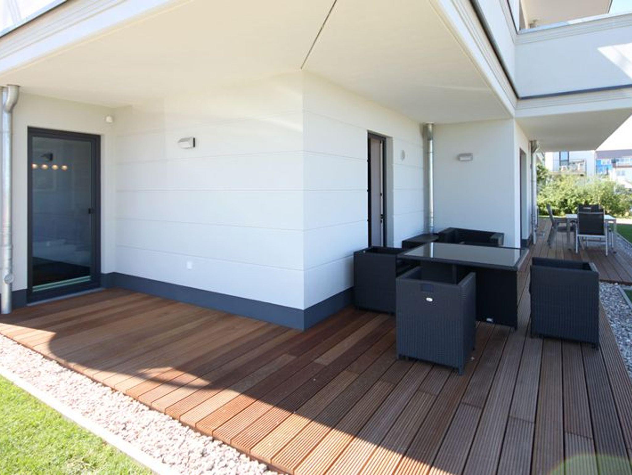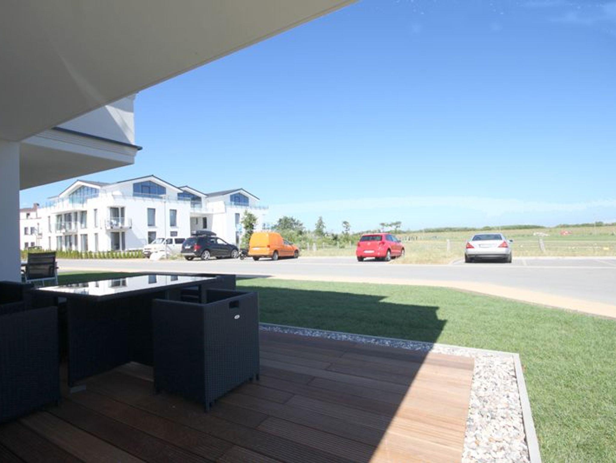 Die Wohnung befindet sich im Erdgeschoss der Residenz am Meer und verfügt über eine große, nach Nordosten ausgerichtete Terrasse. Diese ist mit einem Rattan-Tisch, vier Rattan-Stühlen und einem Loungesessel ausgestattet und kann über den Wohnbereich betreten werden.