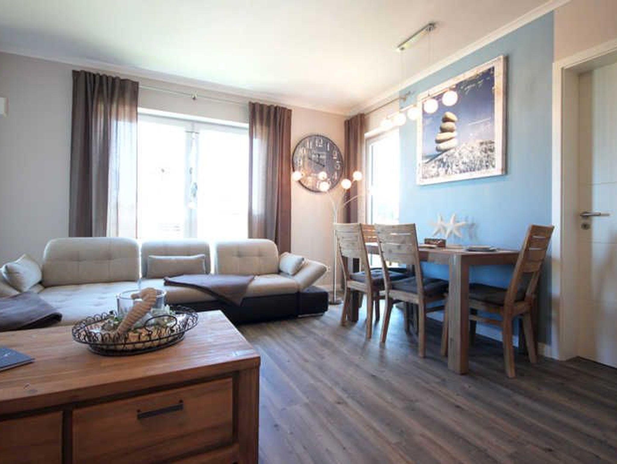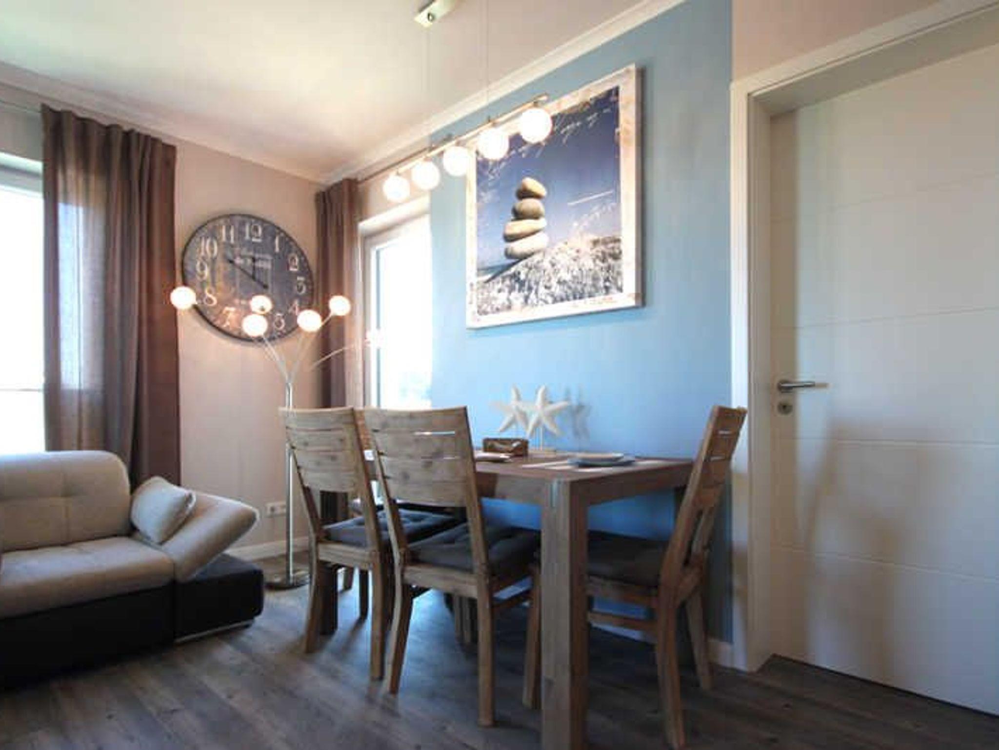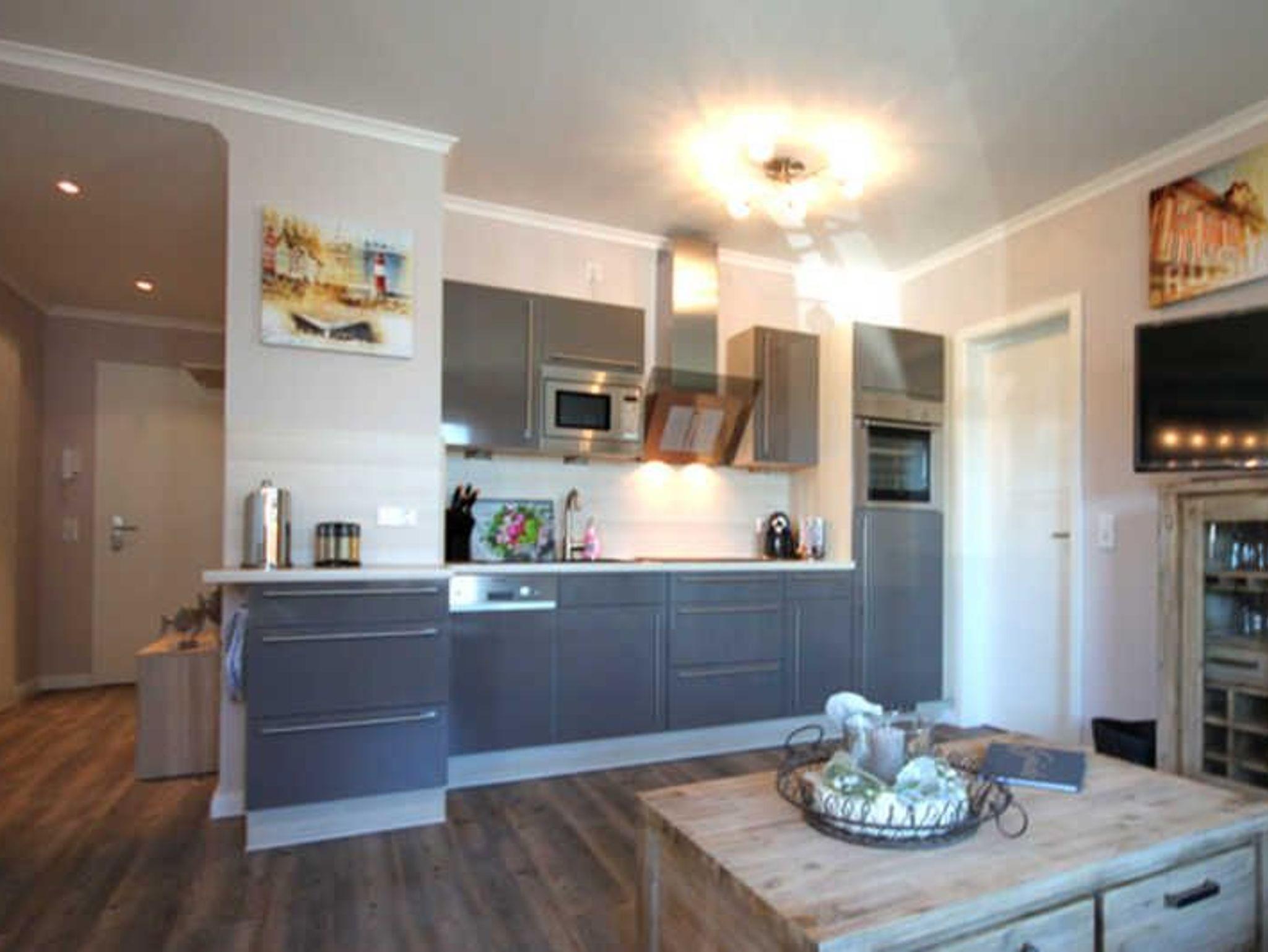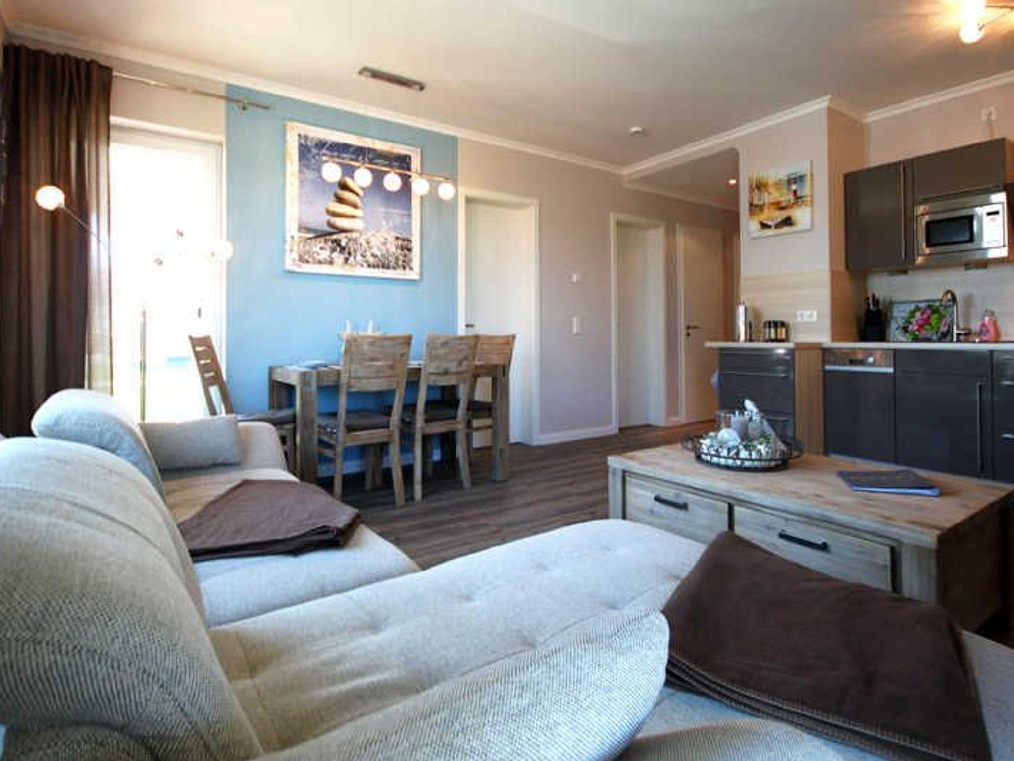 Im Wohnraum bietet sich die große, L-förmige Couch zum Relaxen an. Zur Unterhaltung stehen Ihnen ein großer TV-Flachbildschirm und ein DVD-Player zur Verfügung. Ein großer Holztisch kann nicht nur für gemeinsame Mahlzeiten sondern auch für gemeinsame Spieleabende genutzt werden. An allen Fenstern sind Sicht-und Sonnenschutzplissees angebracht, im Wohnraum sind zusätzlich Übergardinen. Im offenen Küchenbereich befinden sich ein Geschirrspüler, ein Kühlschrank mit Gefrierfach, ein Backofen mit Cerankochfeld, eine Mikrowelle, eine Kaffeemaschine, ein Senseo Kapselautomat sowie die nötigen Kochutensilien.