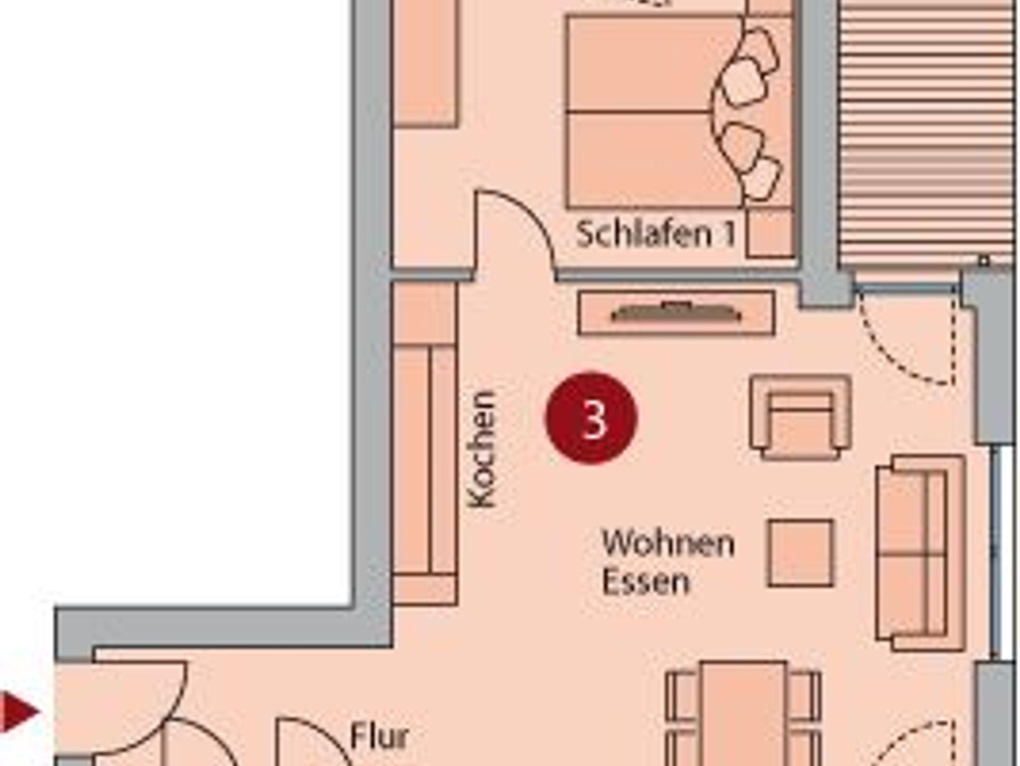 Freundliche Drei-Zimmer-Wohnung für vier Personen mit zwei Schlafräumen und Zugang zu Terrasse mit Gartenanteil