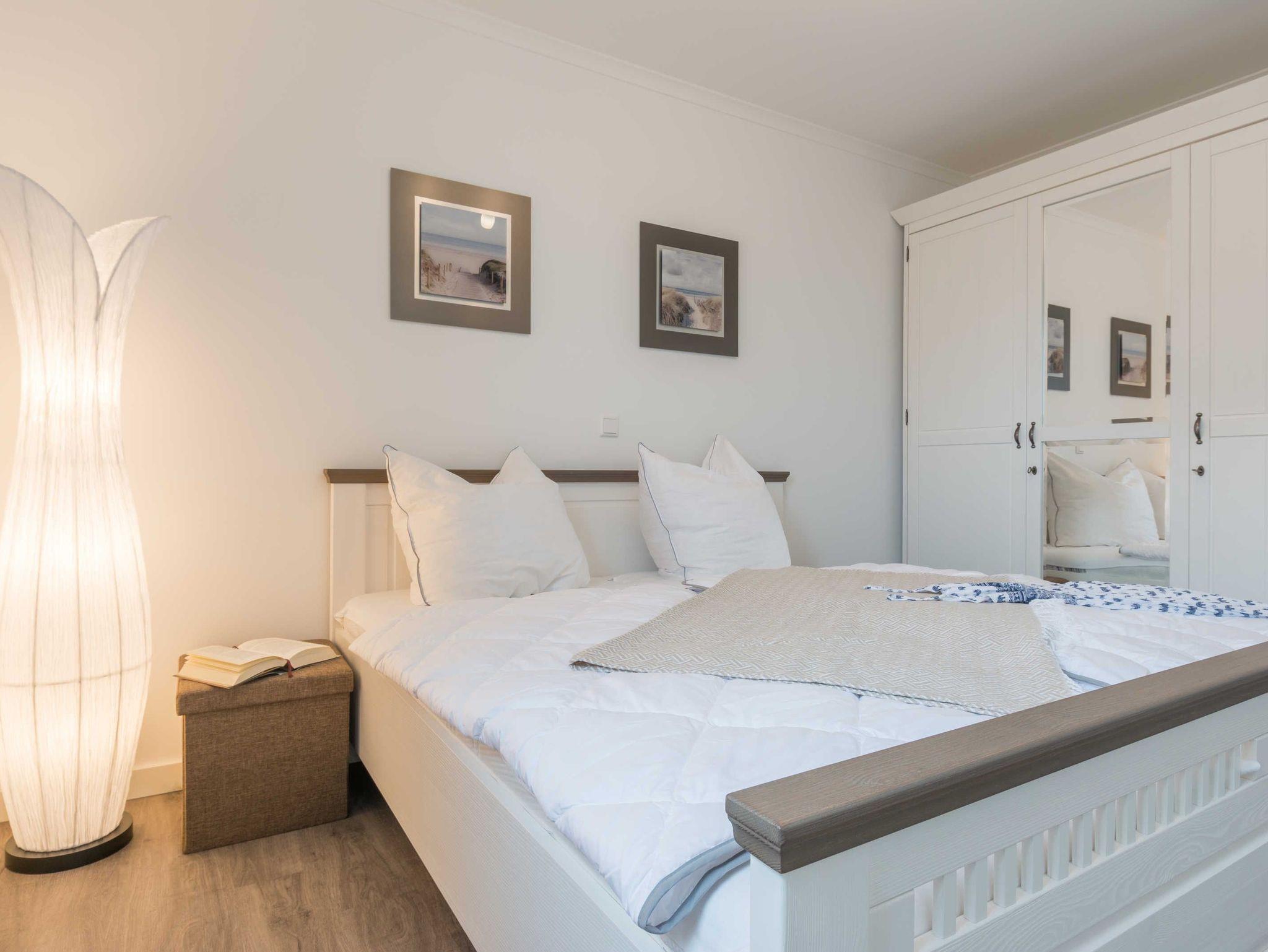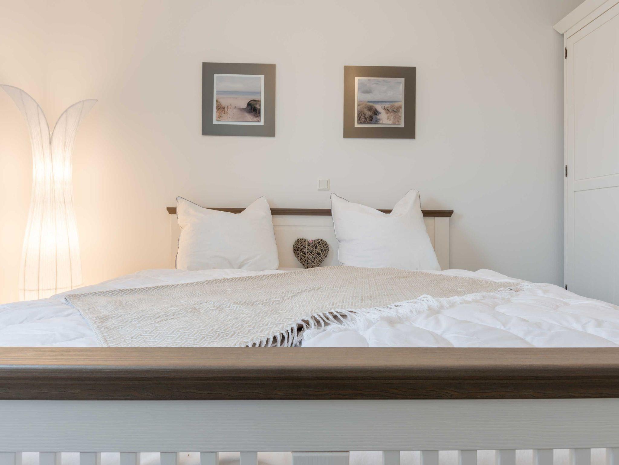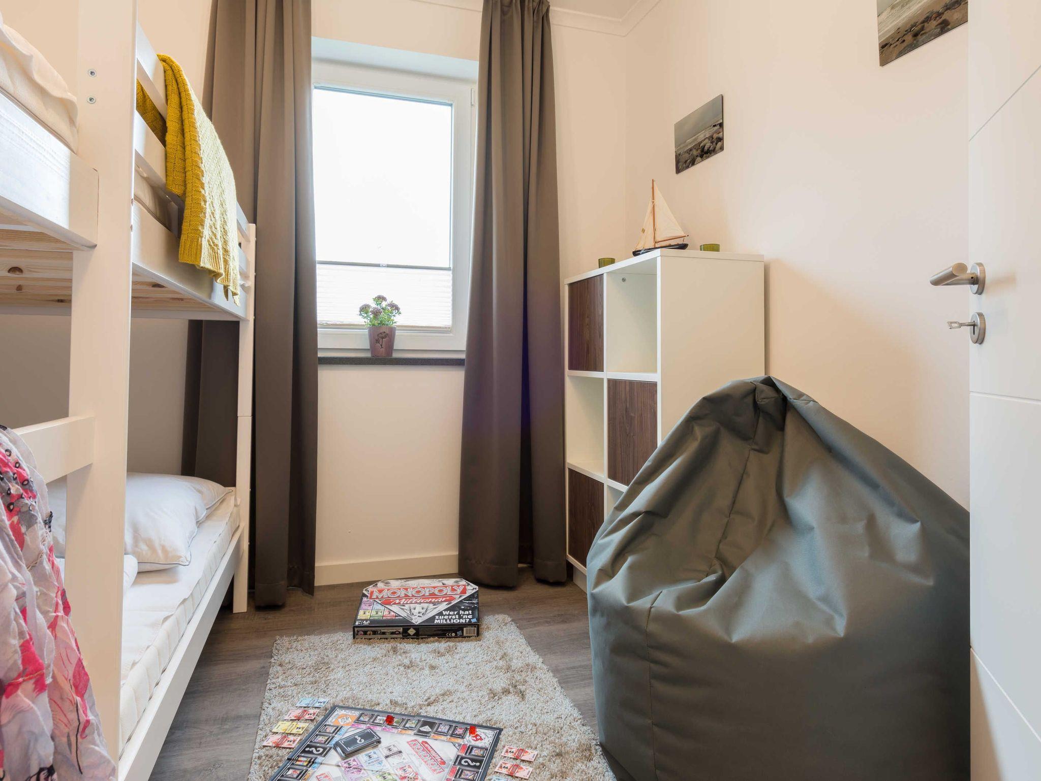 Die liebevoll eingerichtete 3-Zimmer-Ferienwohnung bietet genug Platz für bis zu vier Personen. Vom Wohnraum aus haben Sie Zugang zur Terrasse mit Tisch und vier Stühlen. Von hier können Sie den Blick Richtung Deich genießen und den Tag beginnen oder enden lassen. Der Wohnbereich ist hell und gemütlich. Das Sofa mit Schlaffunktion (Liegefläche 150x200 cm) wird ergänzt durch einen Sitzsack, einen Flat-TV, einen Blu-Ray-Player sowie eine kleine Musikanlage. Die hochwertige Einbauküche verfügt über Kaffeemaschine, Toaster, Wasserkocher, Kühlschrank inklusive Tiefkühlfach, Geschirrspüler und Cerankochfeld mit vier Platten. Der große Esstisch mit vier bequemen Stühlen ermöglicht gemütliches Essen und ist auch bestens geeignet für gesellige Spieleabende. Das erste und größere Schlafzimmer ist mit einem komfortablen Bett (180x200 cm-bestehend aus zwei Matratzen 90x200 cm), einem geräumigen Kleiderschrank und einem Flat-TV ausgestattet. Im zweiten Schlafzimmer stehen ein Etagenbett (je 90x200 cm), ein kleiner Schrank mit Kinderbüchern und Spielesammlung sowie ein gemütlicher Sitzsack. Das helle Badezimmer mit bodengleicher Dusche verfügt über einen großen Waschtisch mit großem Spiegel, eine Toilette und einen Ablageschrank mit Haartrockner. Im Abstellraum befinden sich ein Elektrogrill, eine Stranddecke und Strandspielzeug.
