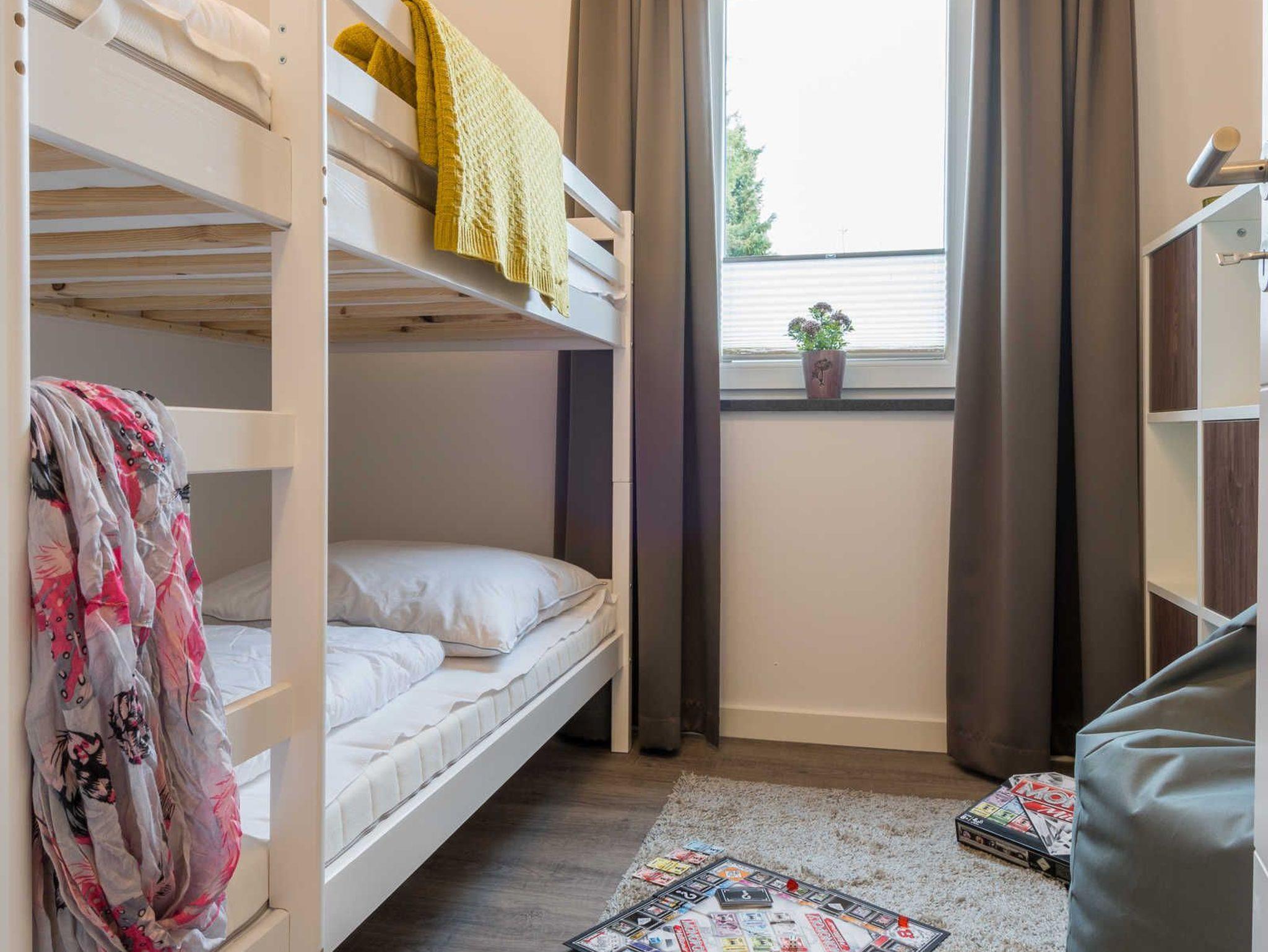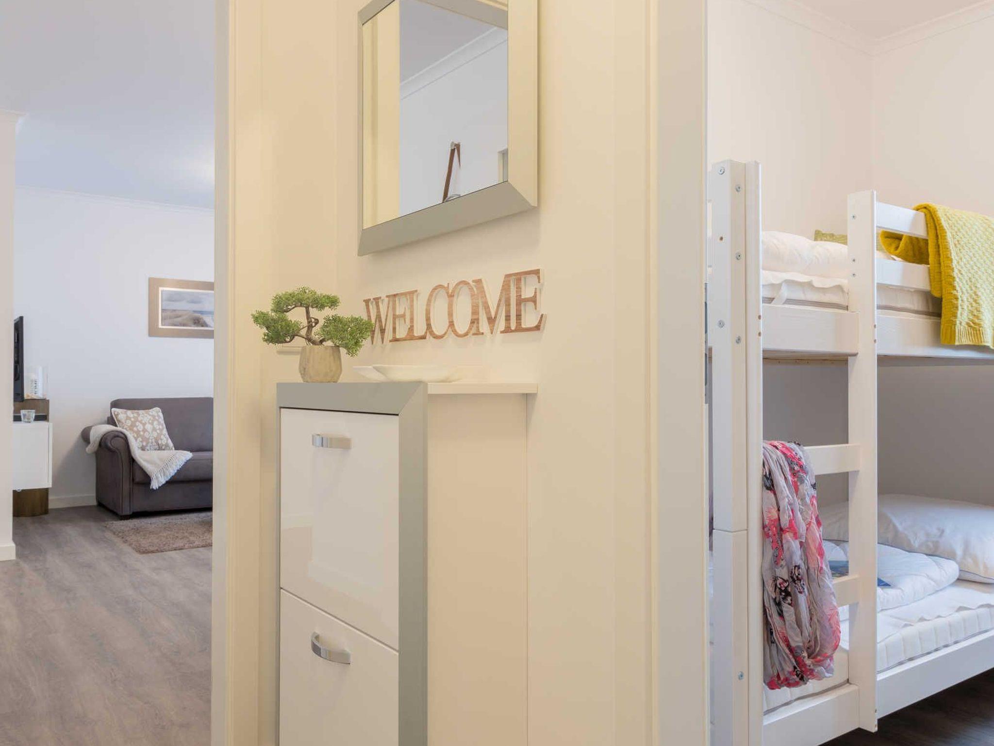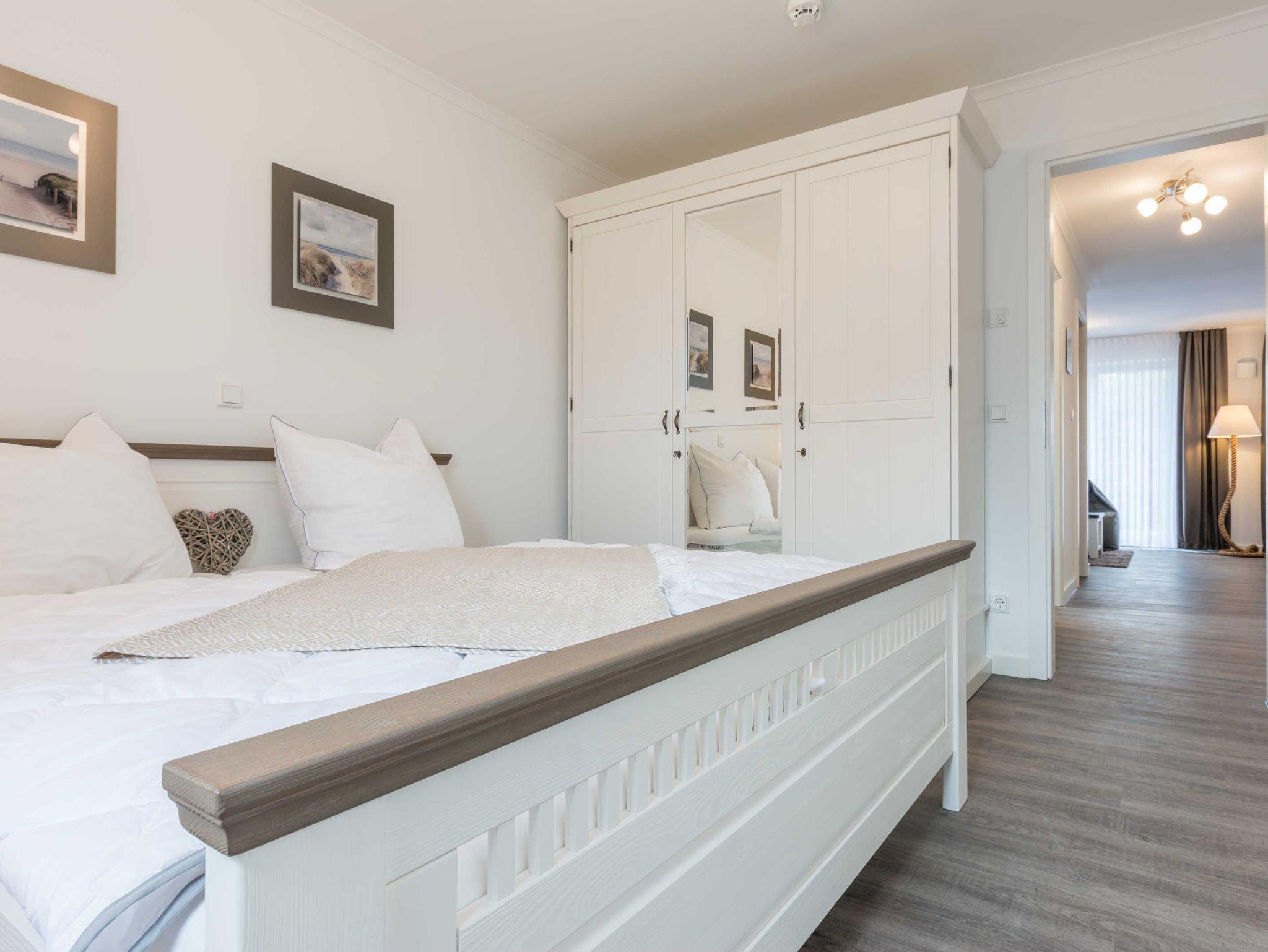 Die liebevoll eingerichtete 3-Zimmer-Ferienwohnung bietet genug Platz für bis zu vier Personen. Vom Wohnraum aus haben Sie Zugang zur Terrasse mit Tisch und vier Stühlen. Von hier können Sie den Blick Richtung Deich genießen und den Tag beginnen oder enden lassen. Der Wohnbereich ist hell und gemütlich. Das Sofa mit Schlaffunktion (Liegefläche 150x200 cm) wird ergänzt durch einen Sitzsack, einen Flat-TV, einen Blu-Ray-Player sowie eine kleine Musikanlage. Die hochwertige Einbauküche verfügt über Kaffeemaschine, Toaster, Wasserkocher, Kühlschrank inklusive Tiefkühlfach, Geschirrspüler und Cerankochfeld mit vier Platten. Der große Esstisch mit vier bequemen Stühlen ermöglicht gemütliches Essen und ist auch bestens geeignet für gesellige Spieleabende. Das erste und größere Schlafzimmer ist mit einem komfortablen Bett (180x200 cm-bestehend aus zwei Matratzen 90x200 cm), einem geräumigen Kleiderschrank und einem Flat-TV ausgestattet. Im zweiten Schlafzimmer stehen ein Etagenbett (je 90x200 cm), ein kleiner Schrank mit Kinderbüchern und Spielesammlung sowie ein gemütlicher Sitzsack. Das helle Badezimmer mit bodengleicher Dusche verfügt über einen großen Waschtisch mit großem Spiegel, eine Toilette und einen Ablageschrank mit Haartrockner. Im Abstellraum befinden sich ein Elektrogrill, eine Stranddecke und Strandspielzeug.