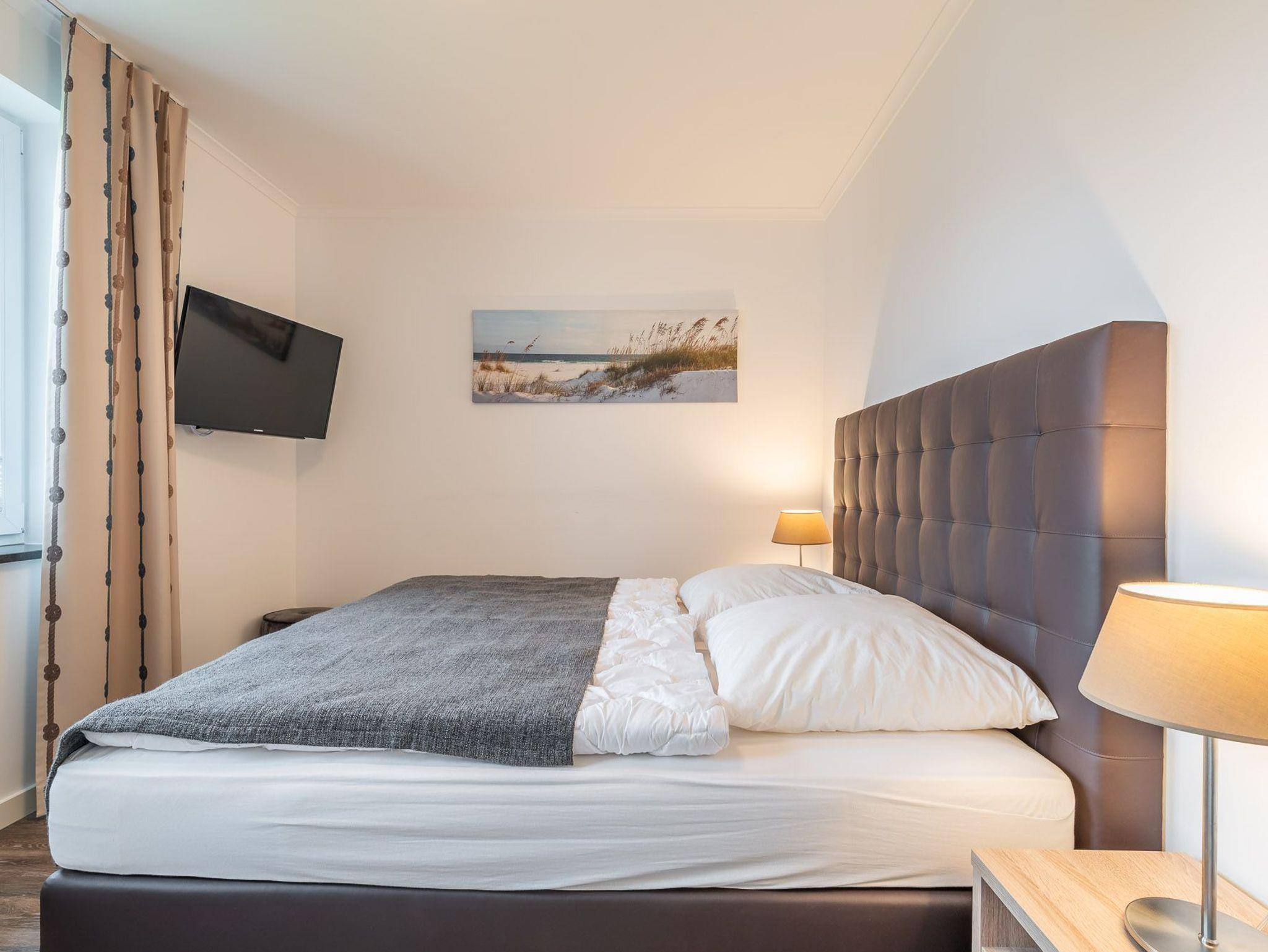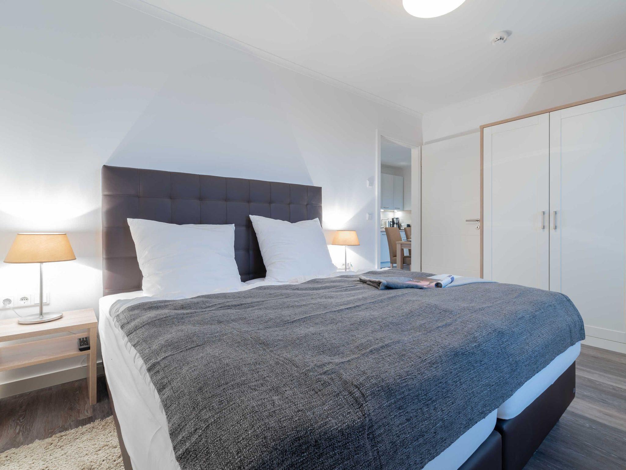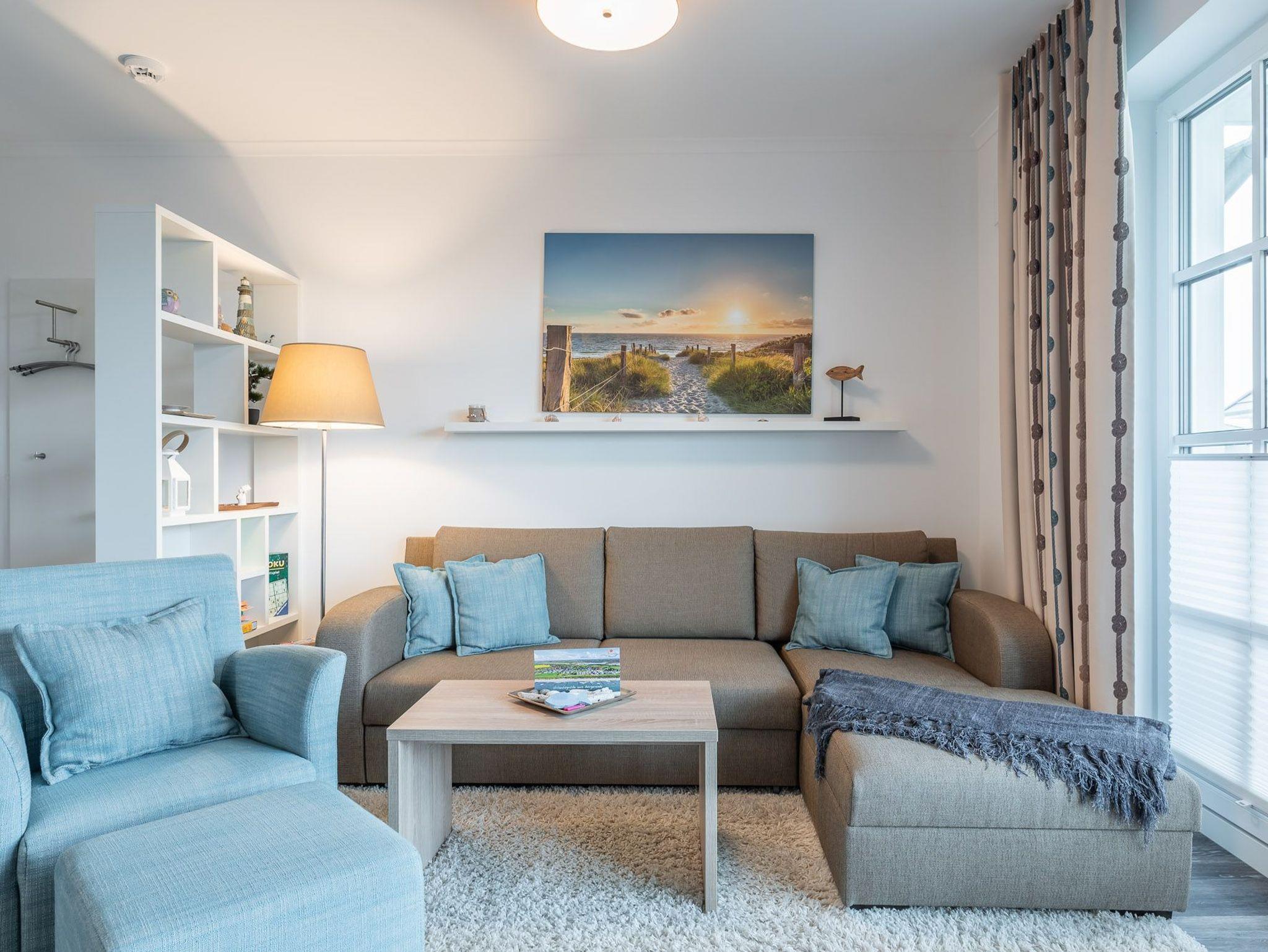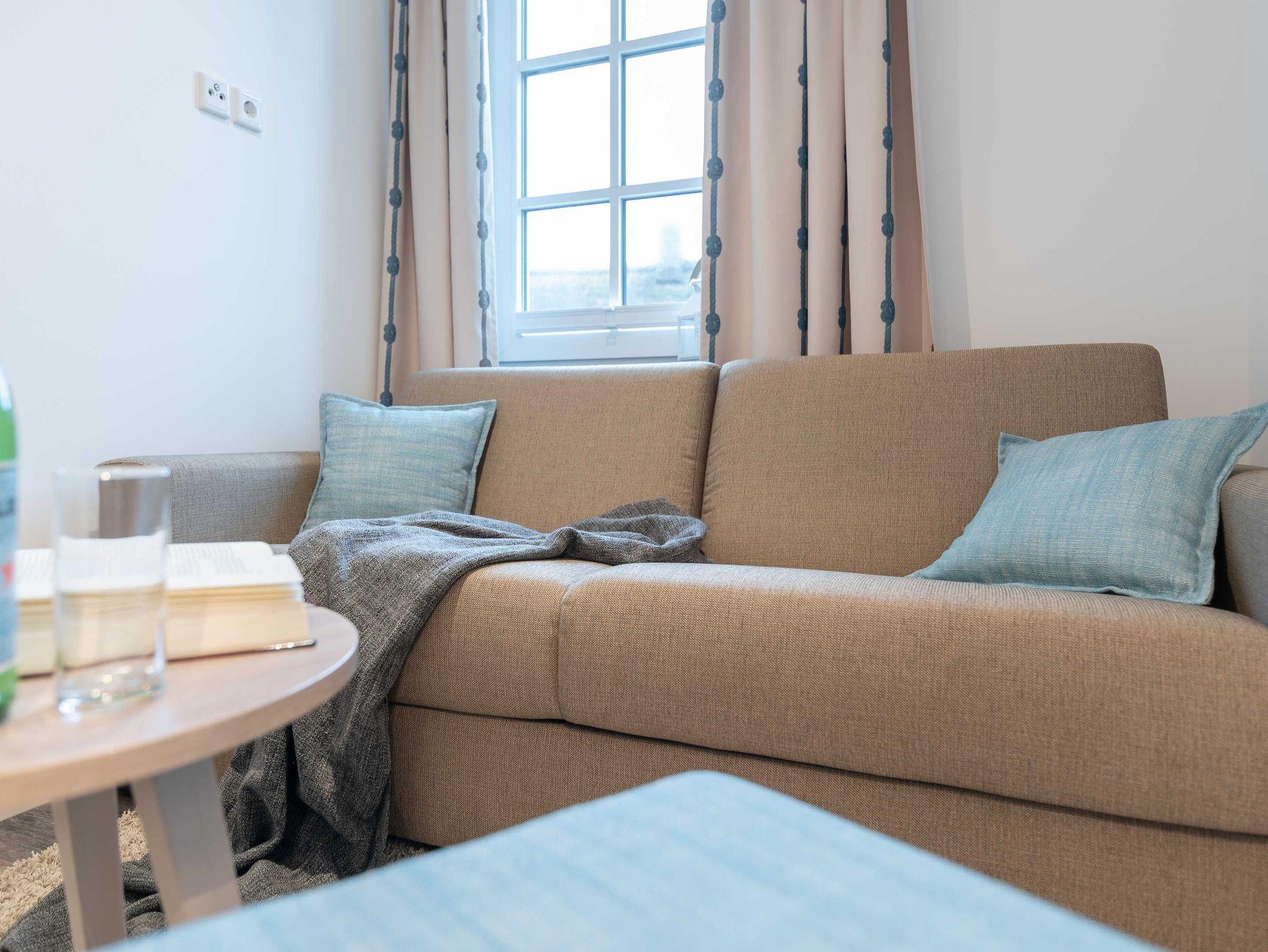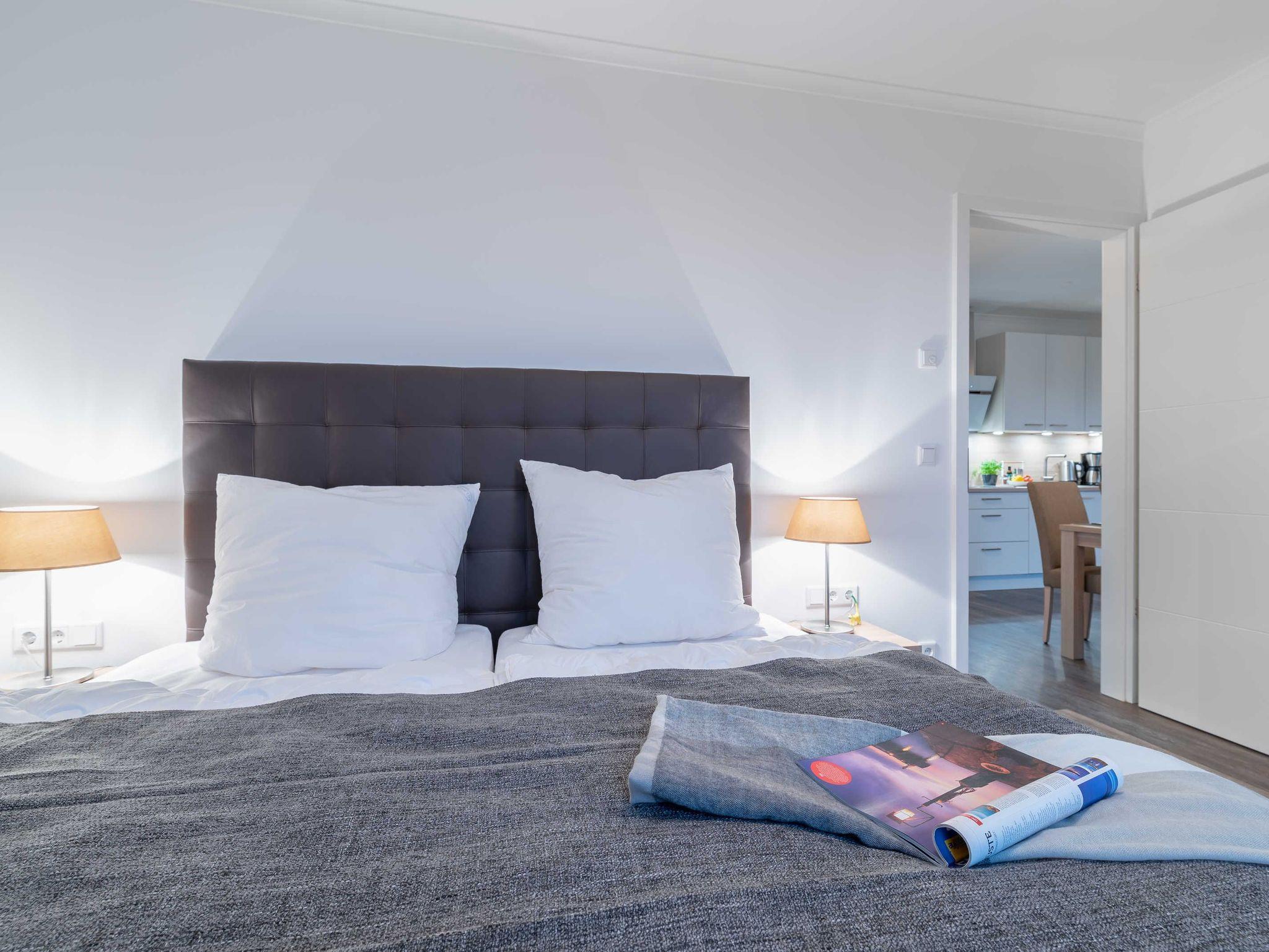 Der Wohnbereich mit Zugang zum Balkon ist hell und lichtdurchflutet. Das große bequeme Ecksofa mit Schlaffunktion und einem Topper (Liegefläche 150 x 200 cm) wird ergänzt durch einen Sessel mit Fußhocker, einem Flat-TV und einer Musikanlage. Ein klassischer Holzesstisch mit vier Stühlen vervollständigt die Einrichtung. Die hochwertige Einbauküche verfügt über einen Kühlschrank mit Tiefkühlfach, ein Vier-Platten-Glaskeramikkochfeld, eine Mikrowelle mit Grillfunktion, eine Kaffeemaschine, einen Toaster, einen Wasserkocher, einen Mixer und eine Küchenwaage. Das erste Schlafzimmer ist mit einem komfortablen Boxspringbett (180 x 200 cm / getrennte Matratzen) und einem geräumigen Kleiderschrank ausgestattet. Des Weiteren befindet sich hier noch ein Flachbild-TV. Ein weiteres Zimmer bietet die Möglichkeit einer ausklappbaren Couch mit kleinem Tisch und einem Kleiderschrank. Verdunklungsplissees sowie Verdunklungsgardinen sorgen für die nötige Nachtruhe. Die Zimmer bieten genug Platz für ein Kinderreisebett. Dies beziehungsweise Wäscheset und Kinderhochstuhl können kostenpflichtig zugebucht werden. Die eingebaute Fußbodenheizung verteilt wohlige Wärme in allen Räumen. Das helle Badezimmer mit bodengleicher Dusche verfügt über einen großen Waschtisch, ein Ablageregal mit Haartrockner, Handtuchheizkörper und ein Fenster für frische Küstenluft. Vom Balkon aus haben Sie Blick auf das Meer.