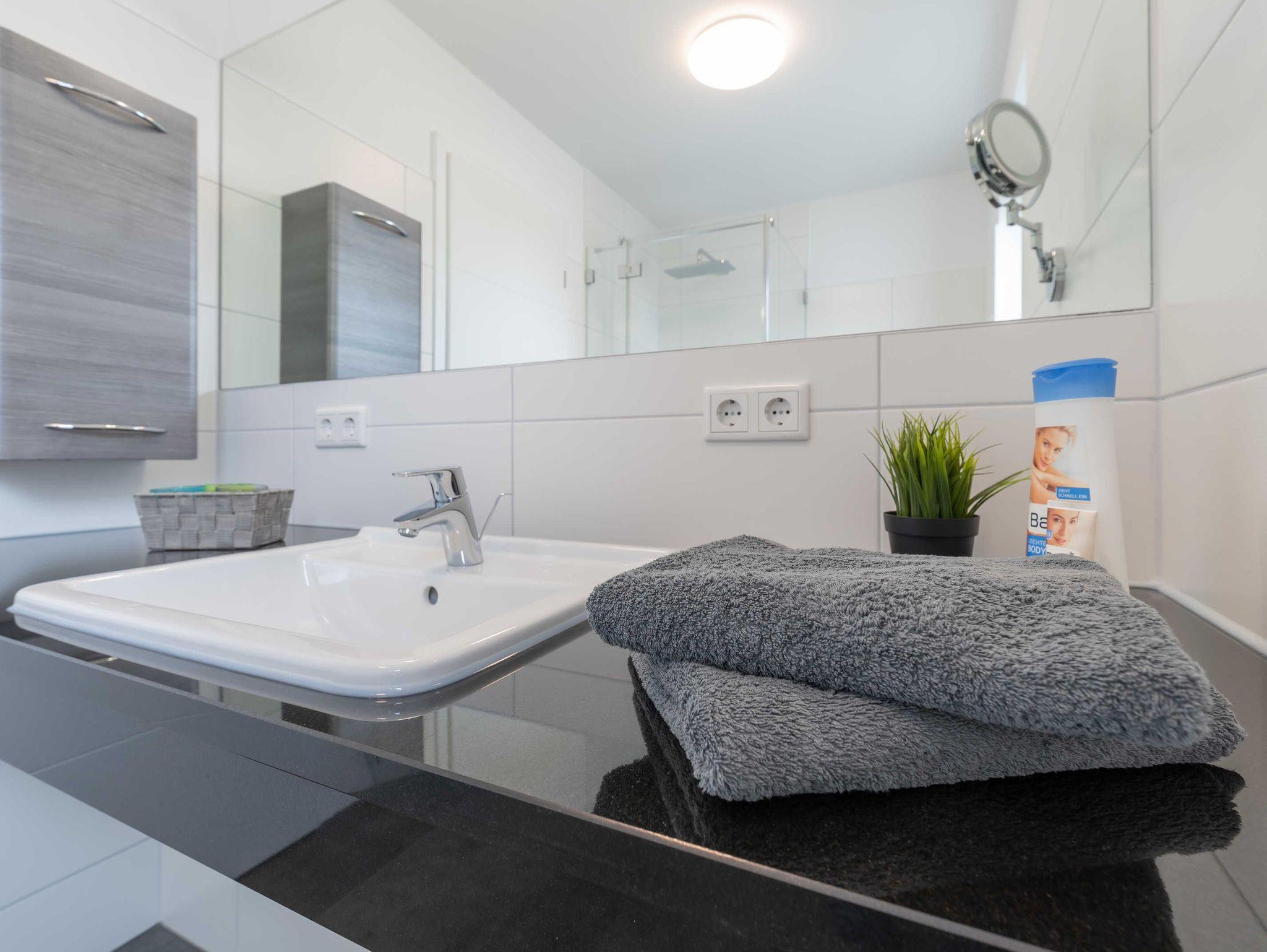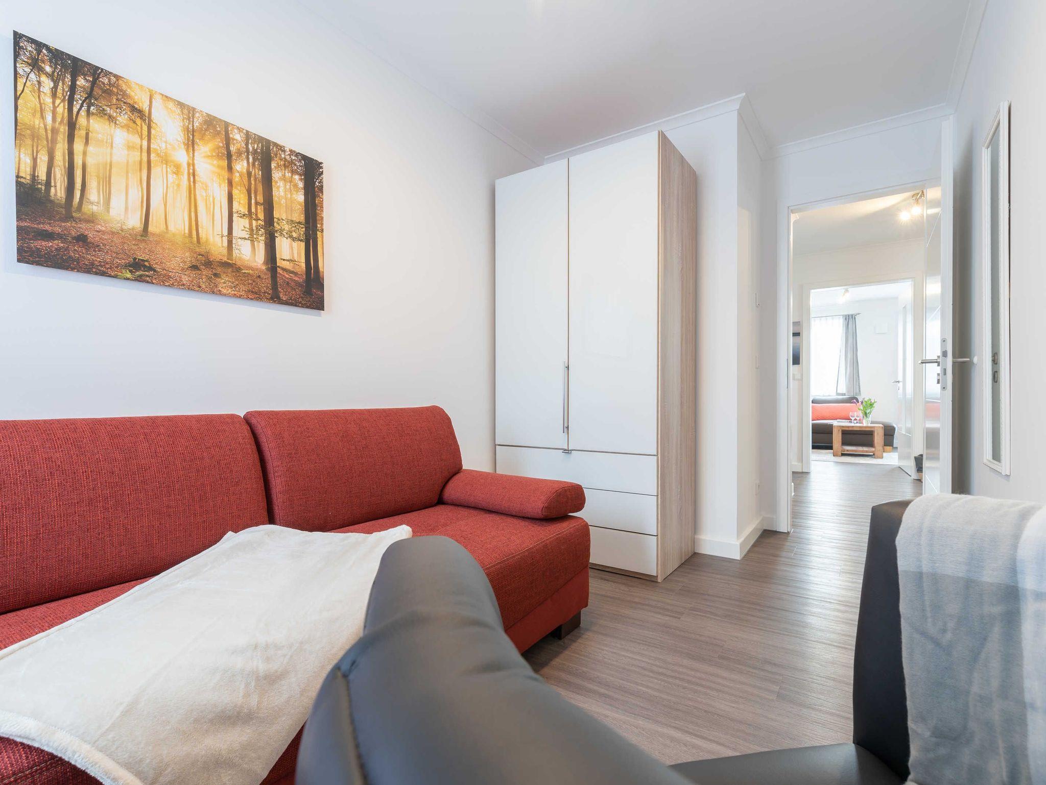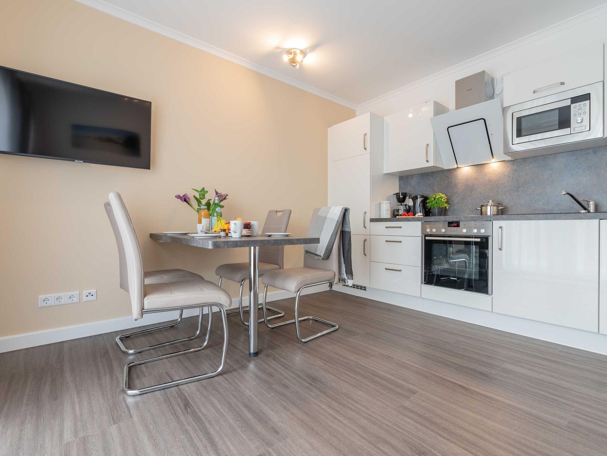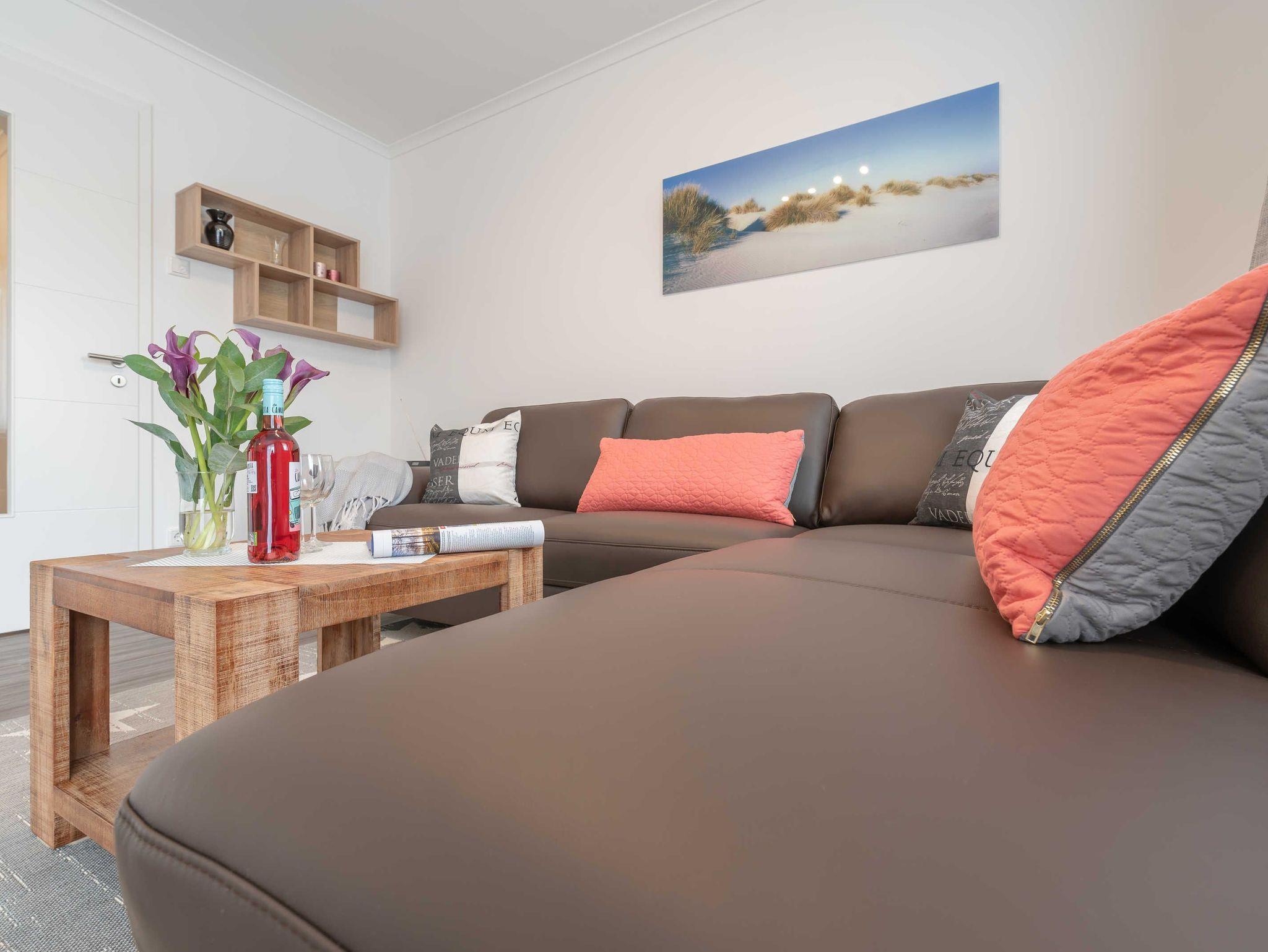 Diese schöne 61 qm große Ferienwohnung ist für 4 Personen ausgestattet. Im Wohnraum befinden sich eine gemütliche Eckcouch, ein Flachbild-TV und ein Esstisch mit bequemen Stühlen. Vom hier aus haben Sie Zugang zur Terrasse. Der offene Koch- und Essbereich mit komplett ausgestatteter, moderner Einbauküche bietet Mikrowelle, Backofen, Geschirrspüler und Kühlschrank inklusive Gefrierfach. Im ersten Schlafzimmer empfangen Sie ein großes Doppelbett und ein geräumiger Kleiderschrank. Im zweiten Schlafzimmer erwarten Sie eine Schlafcoach und ebenfalls ein Kleiderschrank. Das Bad ist mit einer bodengleichen Dusche und einem großen Waschtisch mit durchgehenden Spiegel ausgestattet.