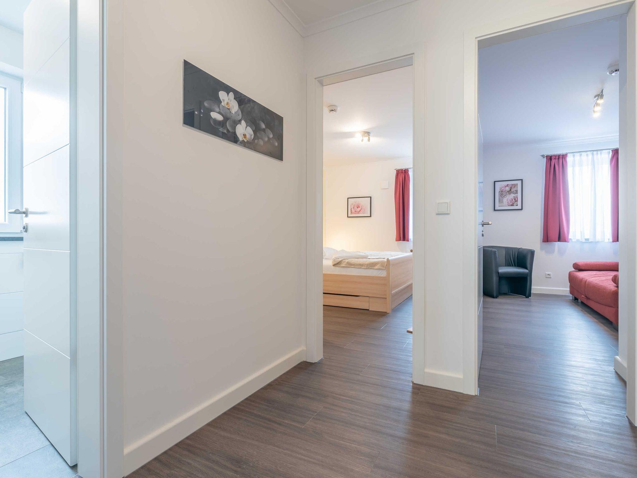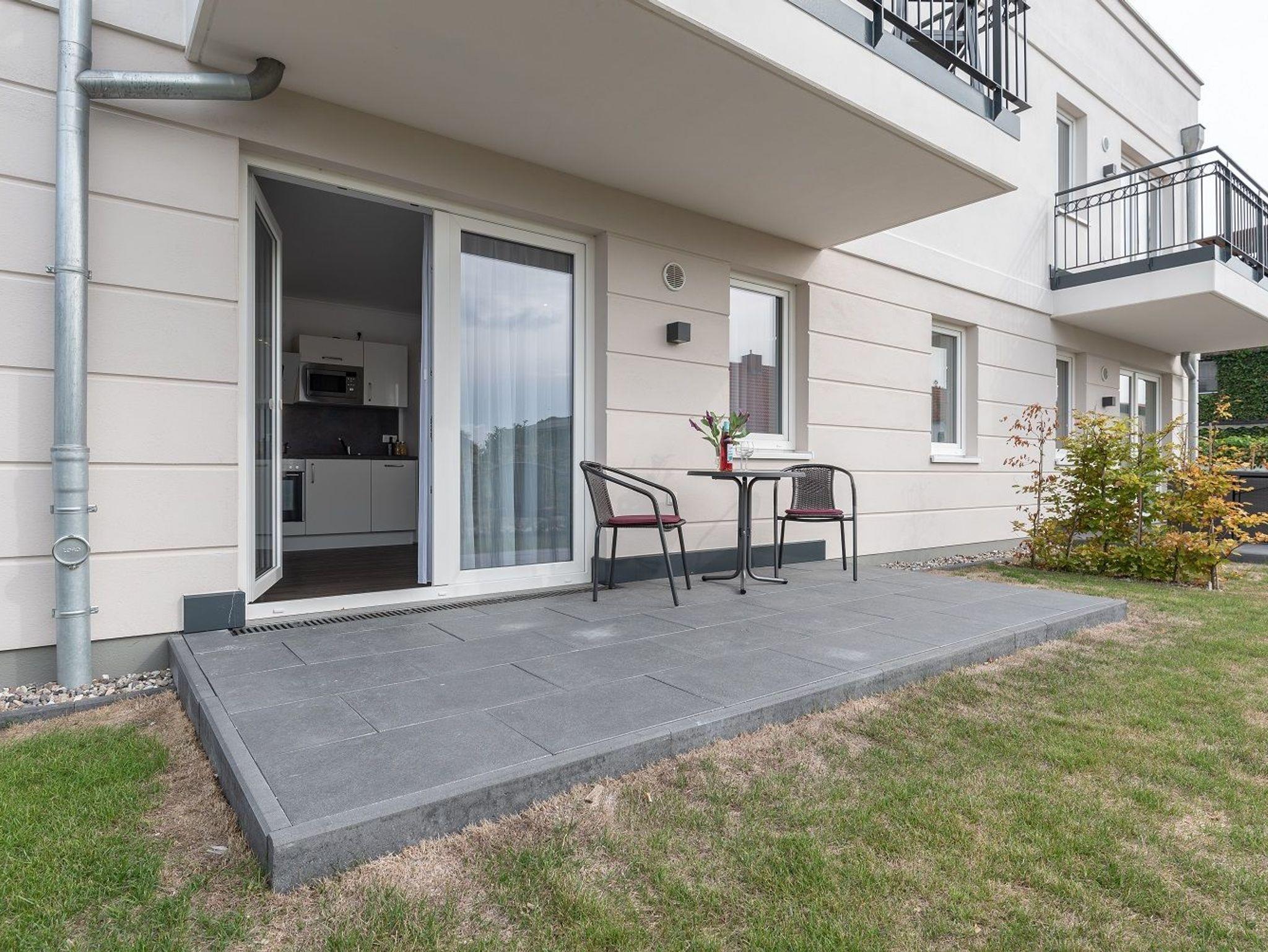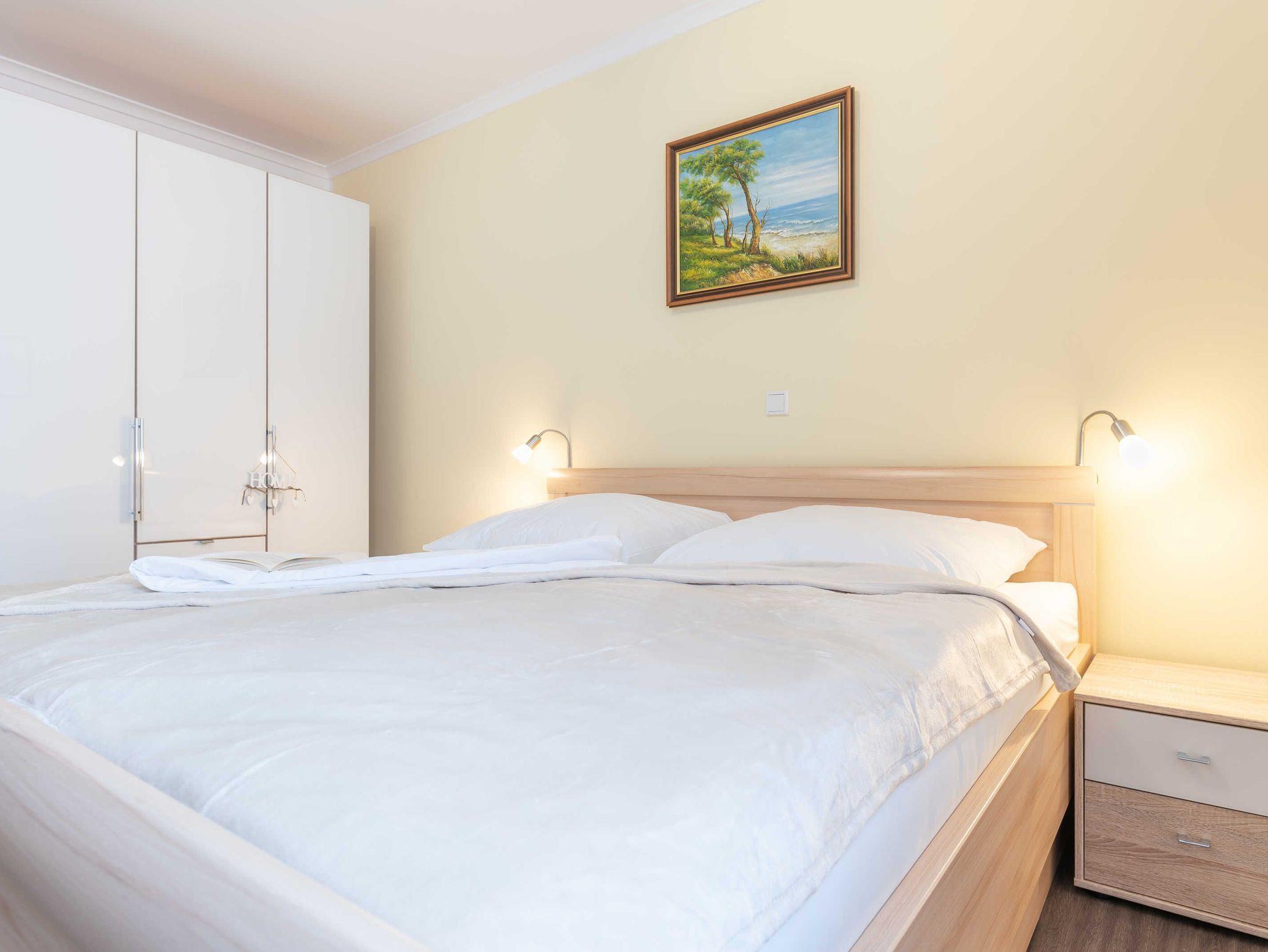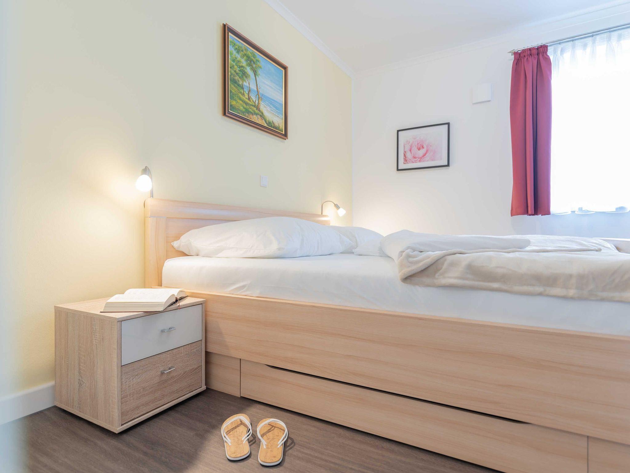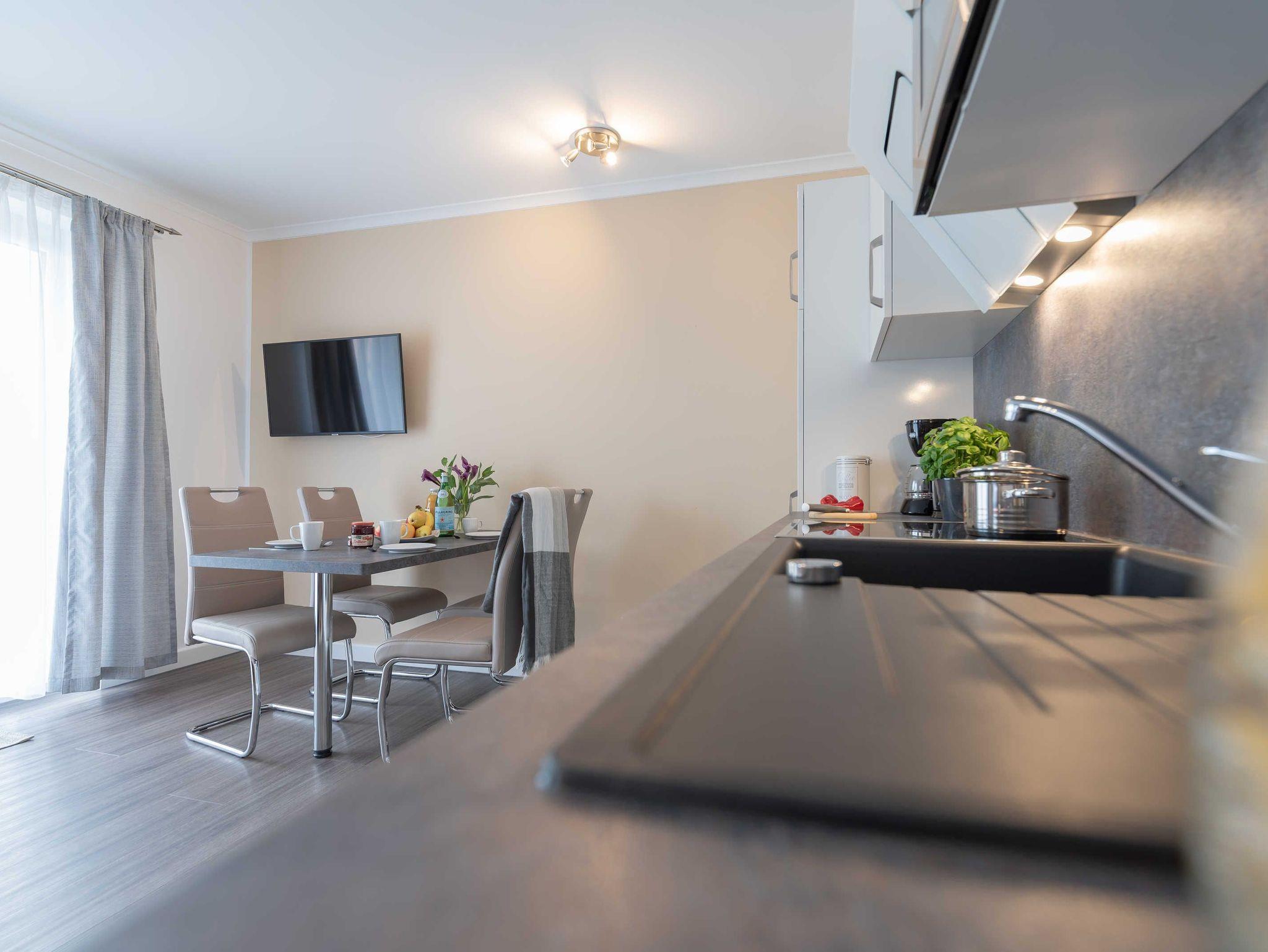 Diese schöne 61 qm große Ferienwohnung ist für 4 Personen ausgestattet. Im Wohnraum befinden sich eine gemütliche Eckcouch, ein Flachbild-TV und ein Esstisch mit bequemen Stühlen. Vom hier aus haben Sie Zugang zur Terrasse. Der offene Koch- und Essbereich mit komplett ausgestatteter, moderner Einbauküche bietet Mikrowelle, Backofen, Geschirrspüler und Kühlschrank inklusive Gefrierfach. Im ersten Schlafzimmer empfangen Sie ein großes Doppelbett und ein geräumiger Kleiderschrank. Im zweiten Schlafzimmer erwarten Sie eine Schlafcoach und ebenfalls ein Kleiderschrank. Das Bad ist mit einer bodengleichen Dusche und einem großen Waschtisch mit durchgehenden Spiegel ausgestattet.