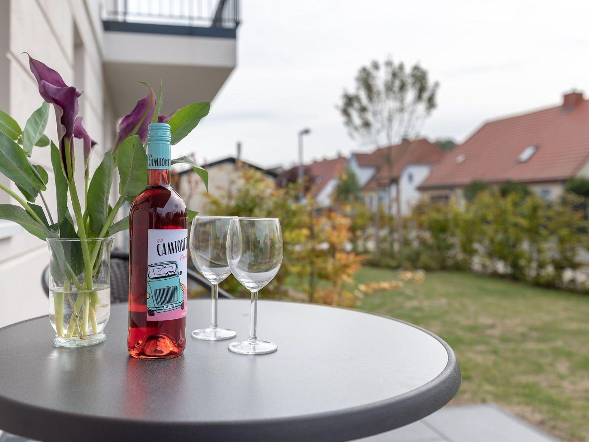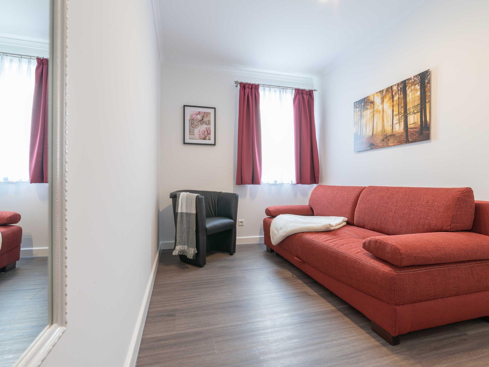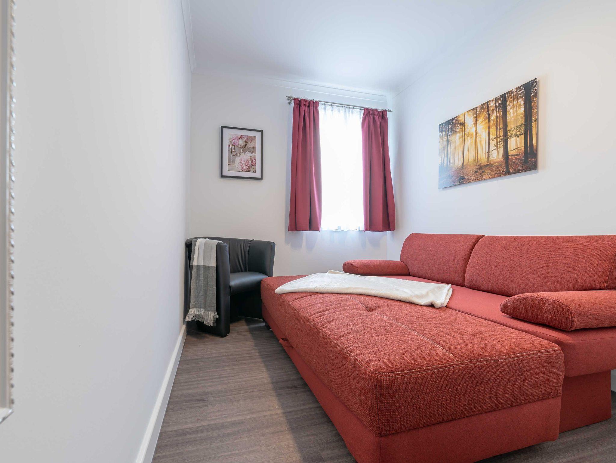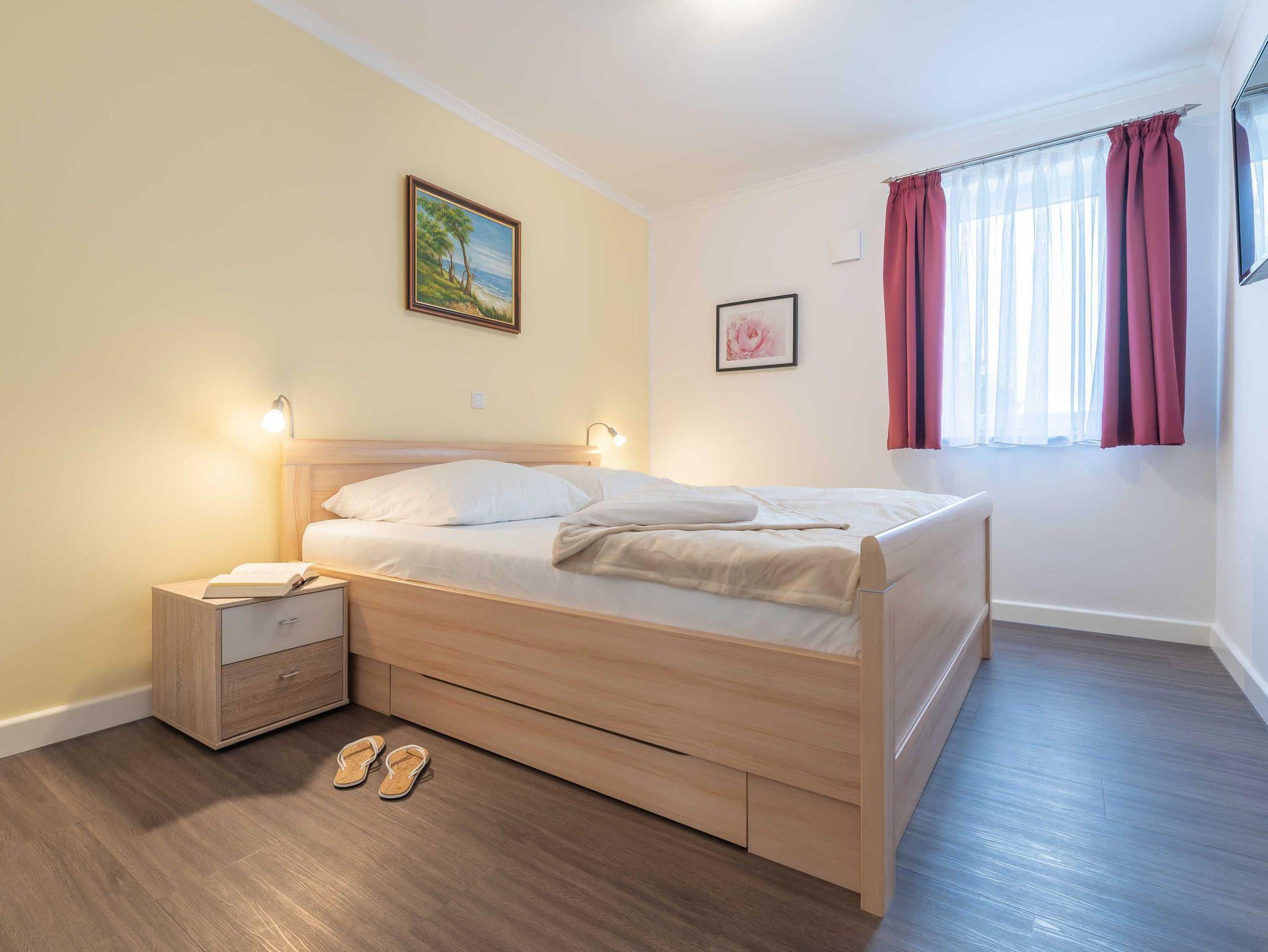 Diese schöne 61 qm große Ferienwohnung ist für 4 Personen ausgestattet. Im Wohnraum befinden sich eine gemütliche Eckcouch, ein Flachbild-TV und ein Esstisch mit bequemen Stühlen. Vom hier aus haben Sie Zugang zur Terrasse. Der offene Koch- und Essbereich mit komplett ausgestatteter, moderner Einbauküche bietet Mikrowelle, Backofen, Geschirrspüler und Kühlschrank inklusive Gefrierfach. Im ersten Schlafzimmer empfangen Sie ein großes Doppelbett und ein geräumiger Kleiderschrank. Im zweiten Schlafzimmer erwarten Sie eine Schlafcoach und ebenfalls ein Kleiderschrank. Das Bad ist mit einer bodengleichen Dusche und einem großen Waschtisch mit durchgehenden Spiegel ausgestattet.