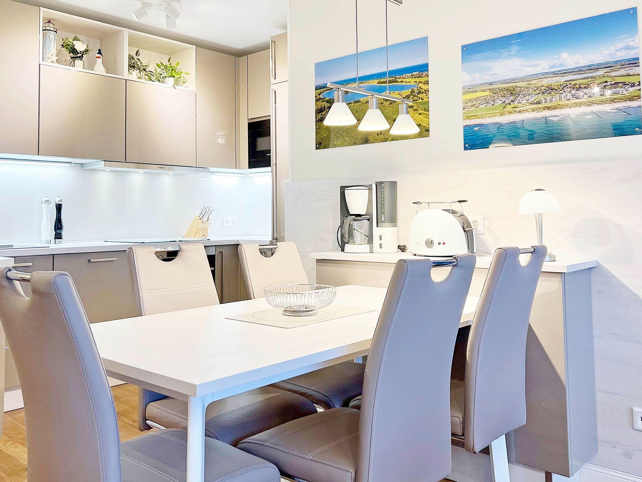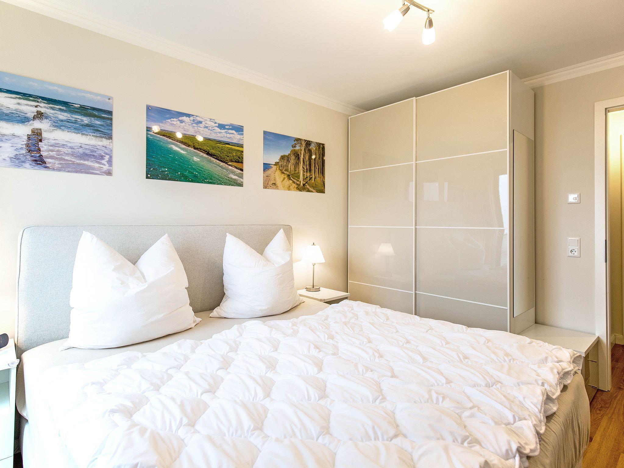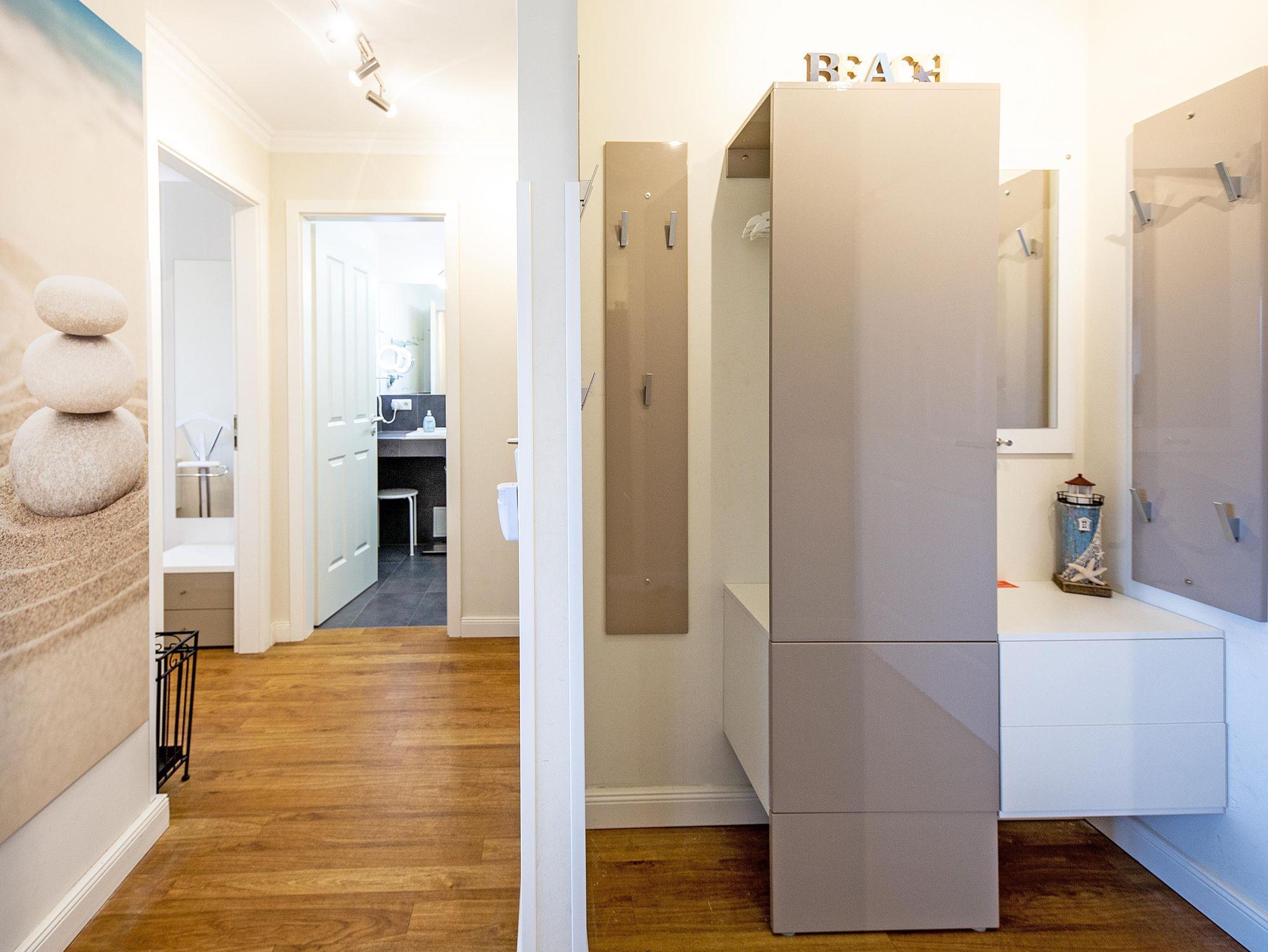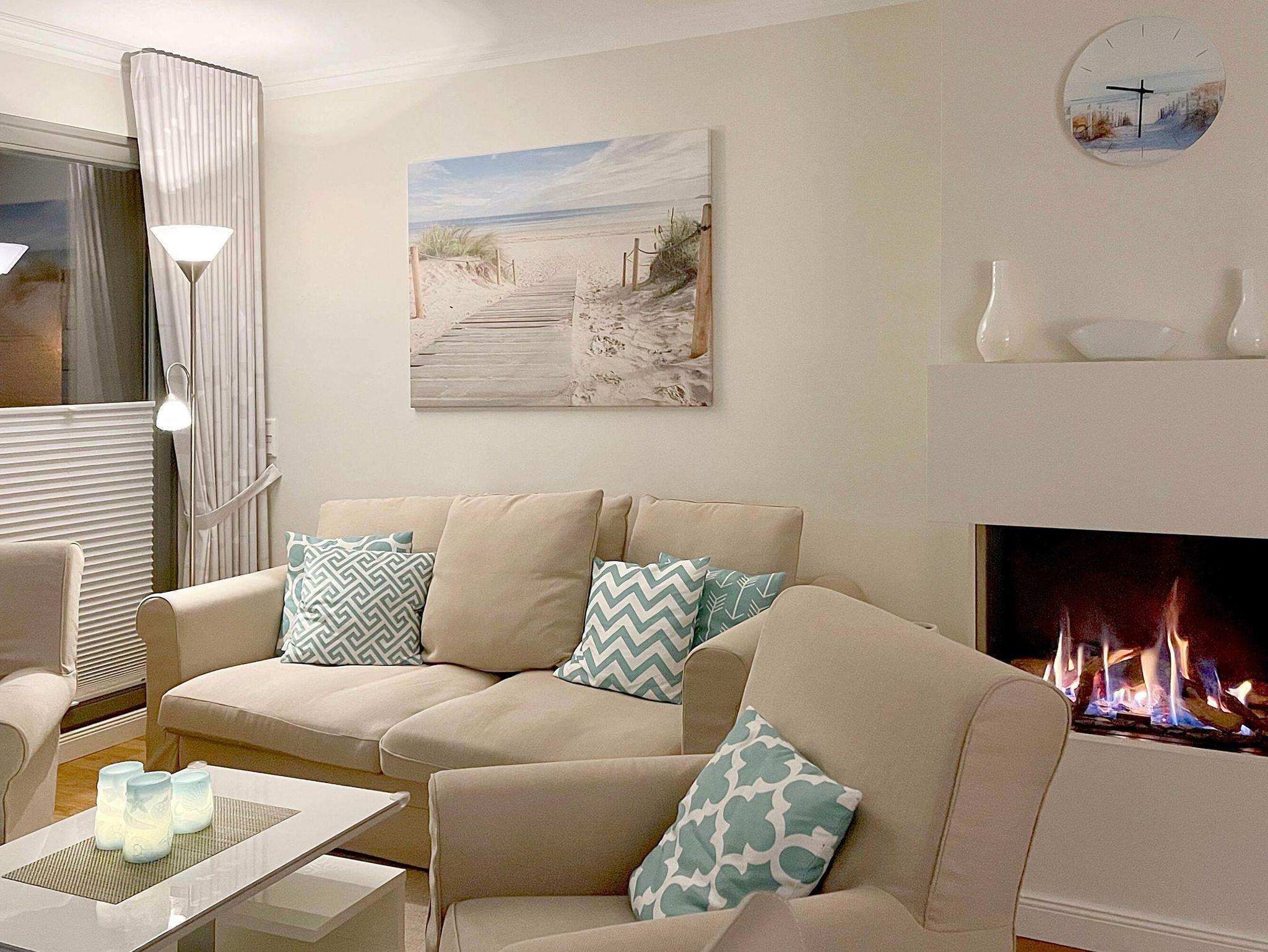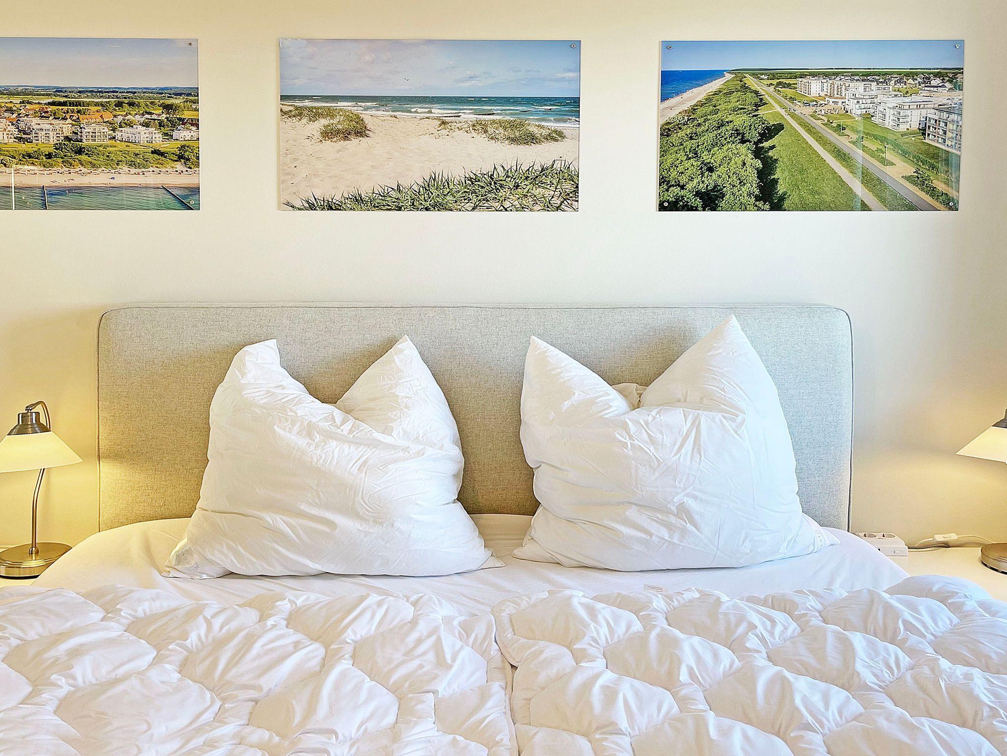 Im November 2021 neu eingerichtet, bietet diese großzügige Wohnung Platz für bis zu fünf Personen. Zwei Schlafzimmer und zwei Bäder sind perfekt für einen entspannten Aufenthalt. Eines der Schlafzimmer verfügt über ein angrenzendes Bad, ein sogenanntes ?Bad en Suite?. Das zweite Bad erreicht man über einen Zwischenflur. Die Bäder sind umfassend mit einer bodentiefen Dusche, großem LED-Wandspiegel, Ablagen, Handtuchtrockner, Föhn, Personenwaage und weiteren Annehmlichkeiten ausgestattet. In den Schlafräumen erwarten Sie je ein modernes Boxspringbett mit durchgehender Matratze von 1,80 x 2,00m (linkes Schlafzimmer mittelfeste Matratze/ rechtes Schlafzimmer feste Matratze) Außerdem verfügen beide über Kleiderschrank mit Ganzkörperspiegel und eine Wandkommode. Über diesen sind moderne 43 Zoll TV- Geräte angebaut worden. Den vorhandenen Kosmetiktisch im ersten Schlafzimmer können Sie zudem als Schreibtisch nutzen. Installierte Fliegengitter sorgen in allen drei Zimmern für unbeschwerten Schlafkomfort. Bitte beachten Sie, dass in den Schlafzimmern kein Platz für den Aufbau eines zusätzlichen Kinderreisebetts ist. Im Wohnbereich empfängt Sie eine bequeme Sitzgarnitur mit ausziehbarer Schlafcouch, ein TV-Board mit einem supergroßen OLED-Fernseher, Blu-ray-Player und einem ganzen Schwung an DVDs. Ein weiteres stimmungsvolles Highlight ist der gut nutzbare Gas-Kamin. Der Bereich erstreckt sich über eine komplett eingerichtete Küchenzeile und einen Esstisch mit fünf Stühlen für gemeinsame Mahlzeiten und gesellige Spieleabende. Die integrierte Induktionsherdplatte (4-Kochstellen) sorgt für eine schnellere Zubereitung Ihrer Gerichte. Weiterhin stehen ein Backofen, Geschirrspüler, Kühlschrank mit Gefrierfach, Mikrowelle, Kaffeemaschine, ?Nespressomaschine?, Wasserkocher und Toaster zur Verfügung. Es ist für ausreichende Abstell- und Unterbringungsmöglichkeiten gesorgt. Über den Wohnbereich gelangen Sie auf den herrlichen Balkon in Nord-Ausrichtung mit traumhaftem Ostseeblick. Im vorhandenen Strandkorb können Sie fantastische Sonnenuntergänge genießen. Die verbaute Fußbodenheizung sorgt in allen Räumen stets für wohlige Wärme. Zur Wohnung gehören zudem ein kostenfreier Tiefgaragenstellplatz und eine Abstellmöglichkeit für Fahrräder. Bitte beachten Sie die Durchfahrtshöhe von max. 1,90 m der Tiefgarage. Mit einem Personenaufzug gelangen Sie von der Tiefgarage aus direkt zu Ihrer Wohnung. Im Erdgeschoss der Wohnung befindet sich ein gekennzeichneter Abstellbereich für Kinderwagen. Eine Waschmaschine und ein Trockner stehen im separaten Hauswirtschaftsraum im Untergeschoss der Villa zu Ihrer Verfügung (gegen Gebühr / 1,00 Euro Münzen). Hier noch einige Hinweise: Es handelt sich um eine Nichtraucherwohnung. Haustiere sind nicht gestattet. Das WLAN steht kostenfrei in allen Zimmern zur Verfügung. Das Datenvolumen ist unbegrenzt, so dass Sie ohne Limit nach Herzenslust streamen können. Das Netz schwankt aber leider noch, wenn sich viele Nutzer in Börgerende im Internet befinden. Weiterhin befinden sich in der Wohnung ein Garderobenbereich, ein fest verbauter Safe für Ihre Wertsachen und zwei Abstellräume, in denen Sie bequem zusätzliche Dinge unterbringen können - auch die leeren Koffer. Hier finden Sie auch ein Bügelbrett und Dampfbügeleisen. Wäschesets, Kinderreisebett und Kinderhochstuhl können kostenpflichtig zugebucht werden. Ab der dritten Person wird ein Aufschlag in Höhe von 15,00 Euro/ÜN berechnet. Die Unterkunft befindet sich wenige Meter vom Badestrand entfernt in ruhiger Lage zur Promenade. Kein Autoverkehr! Sichern Sie sich einen der begehrten Strandkörbe nur ein paar Meter entfernt von den rauschenden Wellen der Ostsee (Anfang Mai - Ende August) und buchen Sie jetzt zu besonderen Konditionen (12,00 Euro pro Tag oder 75,00 Euro pro Woche.)