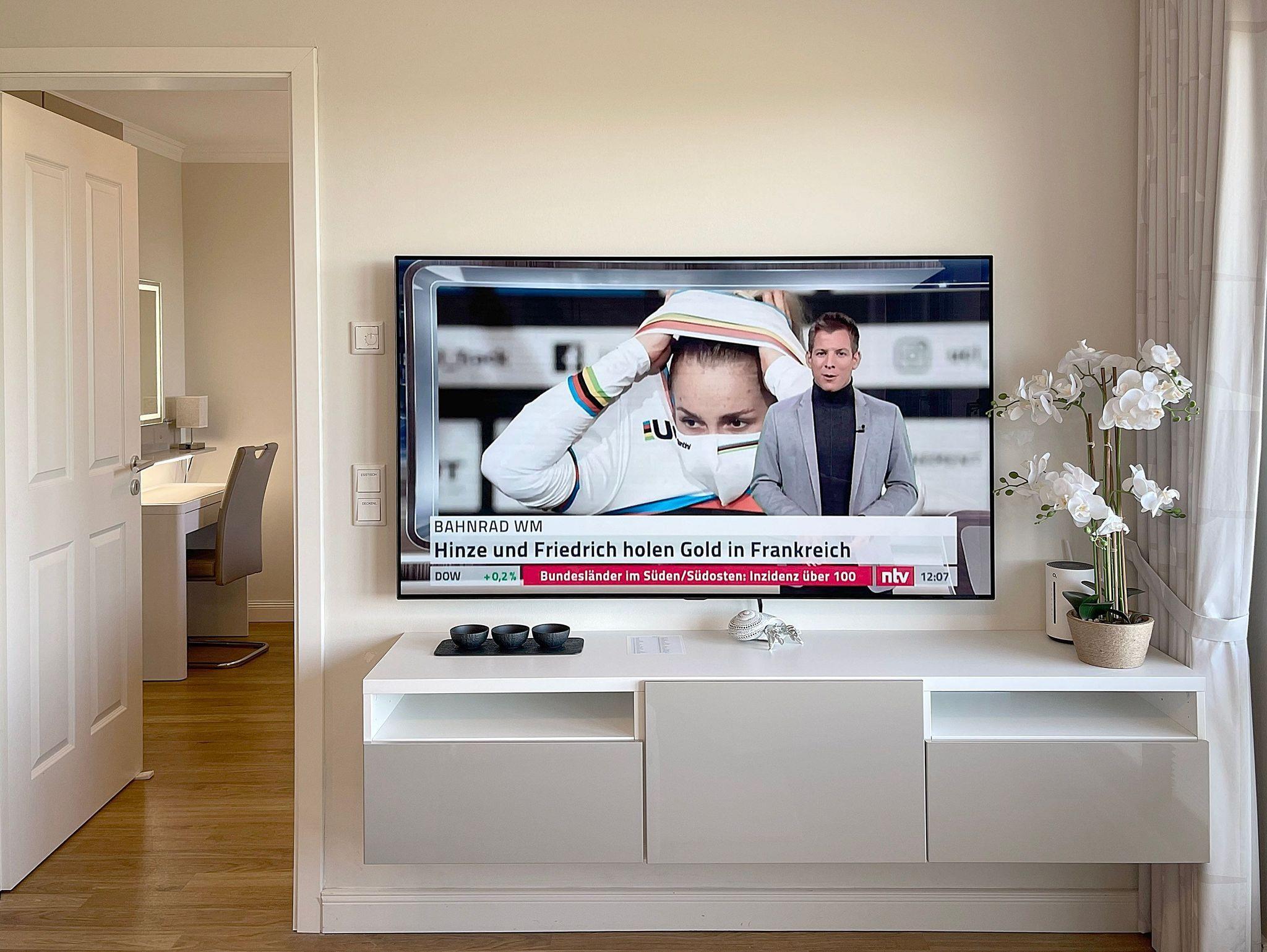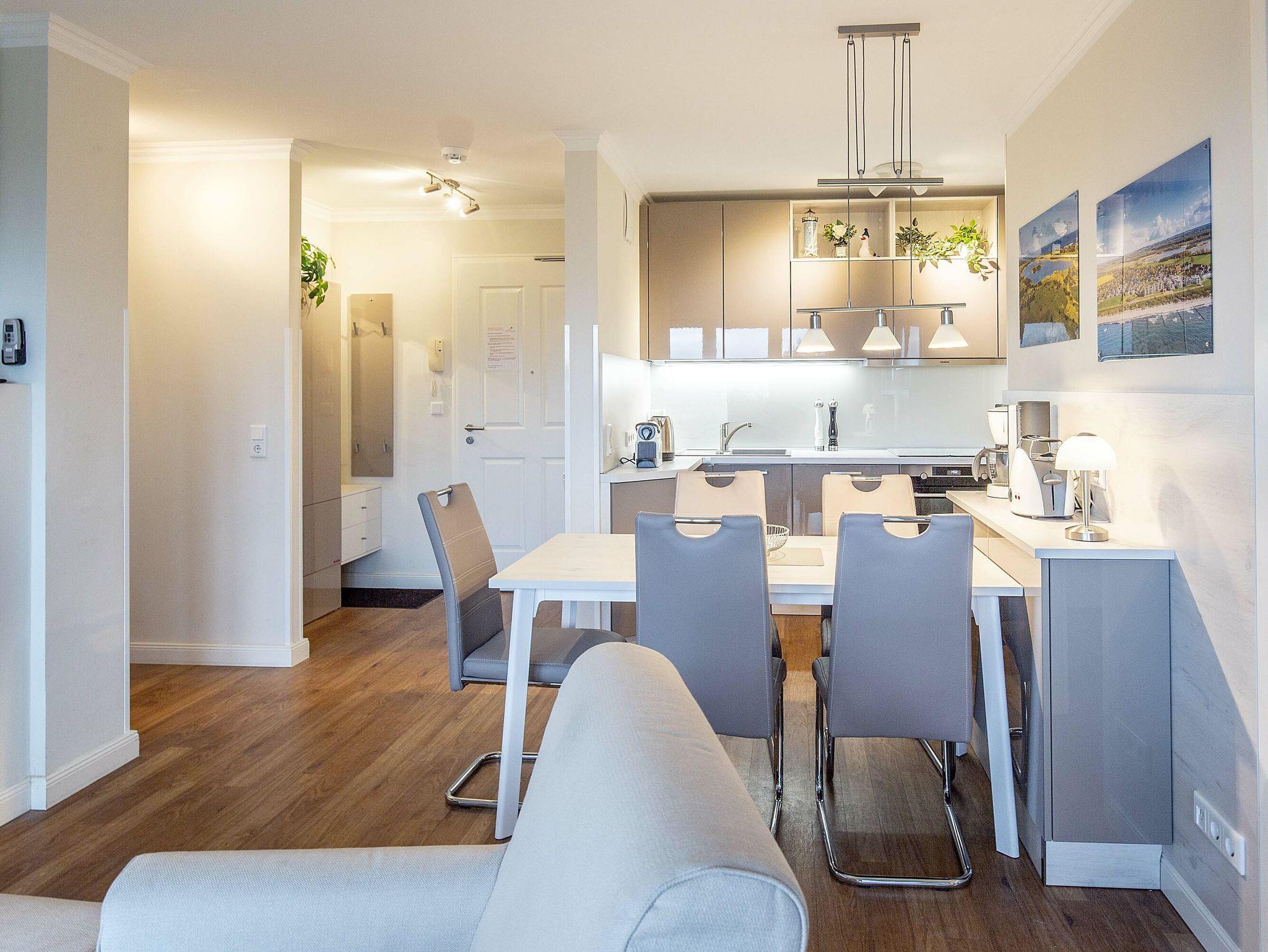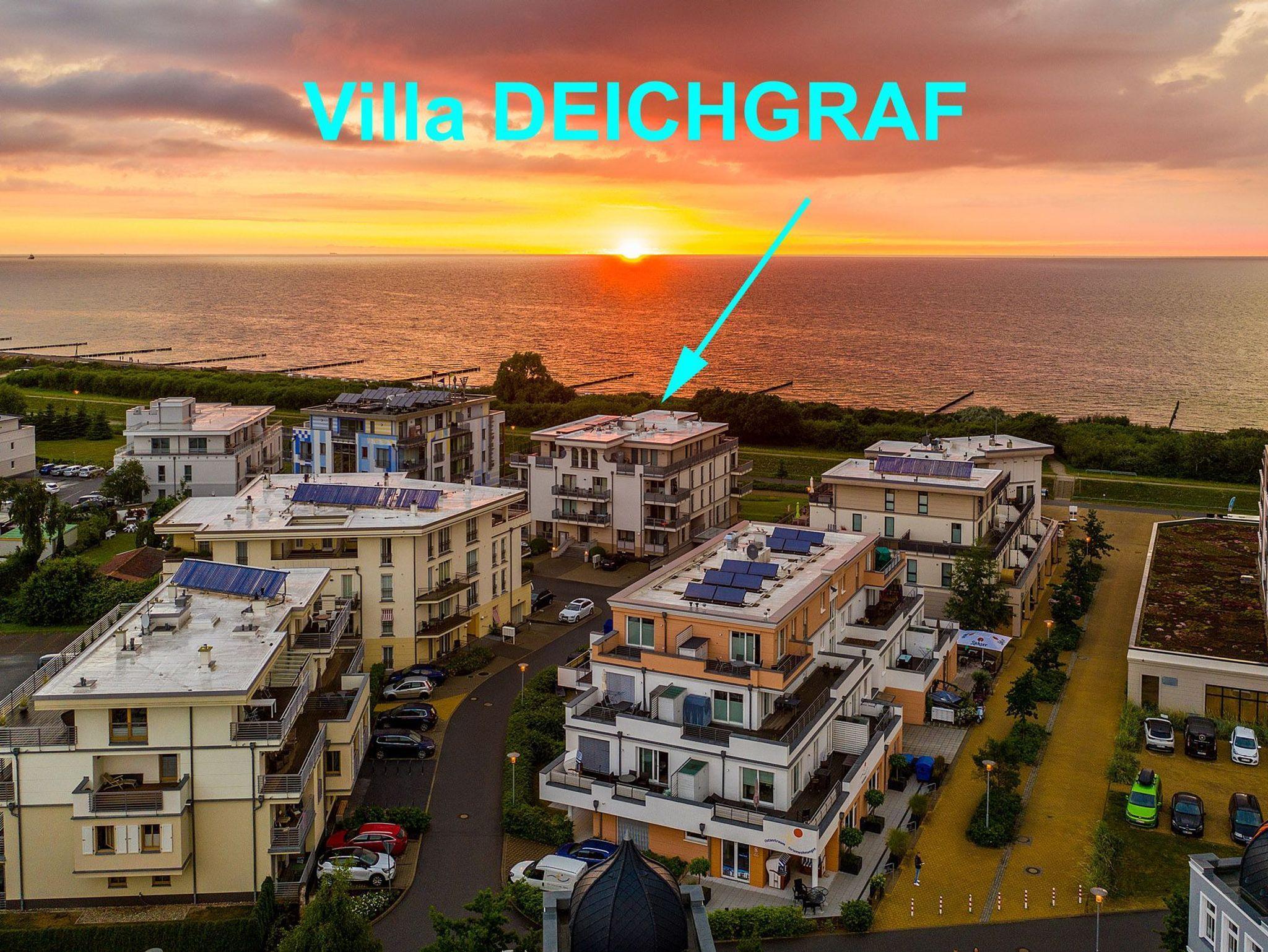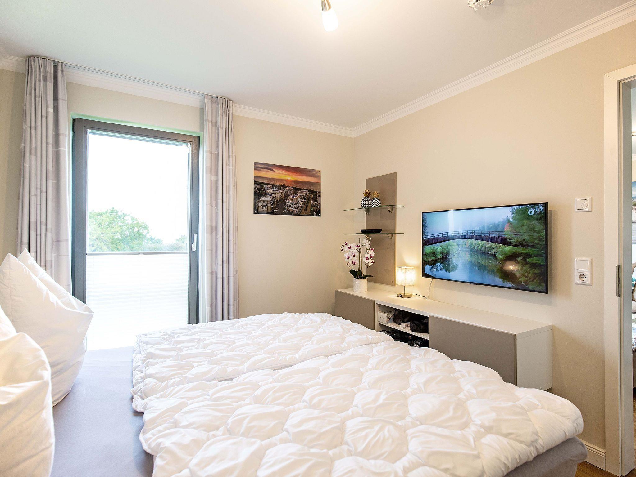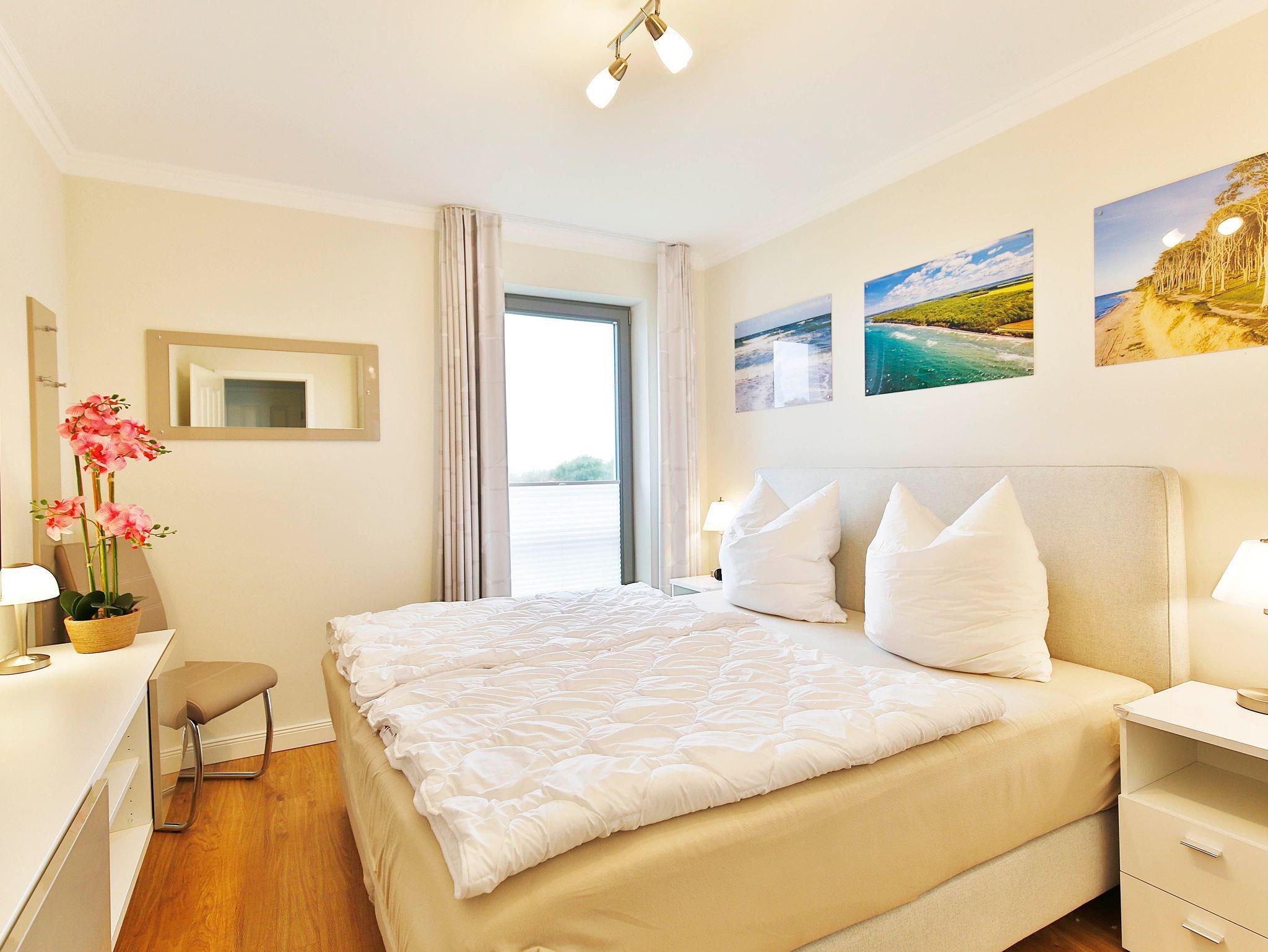 Im November 2021 neu eingerichtet, bietet diese großzügige Wohnung Platz für bis zu fünf Personen. Zwei Schlafzimmer und zwei Bäder sind perfekt für einen entspannten Aufenthalt. Eines der Schlafzimmer verfügt über ein angrenzendes Bad, ein sogenanntes ?Bad en Suite?. Das zweite Bad erreicht man über einen Zwischenflur. Die Bäder sind umfassend mit einer bodentiefen Dusche, großem LED-Wandspiegel, Ablagen, Handtuchtrockner, Föhn, Personenwaage und weiteren Annehmlichkeiten ausgestattet. In den Schlafräumen erwarten Sie je ein modernes Boxspringbett mit durchgehender Matratze von 1,80 x 2,00m (linkes Schlafzimmer mittelfeste Matratze/ rechtes Schlafzimmer feste Matratze) Außerdem verfügen beide über Kleiderschrank mit Ganzkörperspiegel und eine Wandkommode. Über diesen sind moderne 43 Zoll TV- Geräte angebaut worden. Den vorhandenen Kosmetiktisch im ersten Schlafzimmer können Sie zudem als Schreibtisch nutzen. Installierte Fliegengitter sorgen in allen drei Zimmern für unbeschwerten Schlafkomfort. Bitte beachten Sie, dass in den Schlafzimmern kein Platz für den Aufbau eines zusätzlichen Kinderreisebetts ist. Im Wohnbereich empfängt Sie eine bequeme Sitzgarnitur mit ausziehbarer Schlafcouch, ein TV-Board mit einem supergroßen OLED-Fernseher, Blu-ray-Player und einem ganzen Schwung an DVDs. Ein weiteres stimmungsvolles Highlight ist der gut nutzbare Gas-Kamin. Der Bereich erstreckt sich über eine komplett eingerichtete Küchenzeile und einen Esstisch mit fünf Stühlen für gemeinsame Mahlzeiten und gesellige Spieleabende. Die integrierte Induktionsherdplatte (4-Kochstellen) sorgt für eine schnellere Zubereitung Ihrer Gerichte. Weiterhin stehen ein Backofen, Geschirrspüler, Kühlschrank mit Gefrierfach, Mikrowelle, Kaffeemaschine, ?Nespressomaschine?, Wasserkocher und Toaster zur Verfügung. Es ist für ausreichende Abstell- und Unterbringungsmöglichkeiten gesorgt. Über den Wohnbereich gelangen Sie auf den herrlichen Balkon in Nord-Ausrichtung mit traumhaftem Ostseeblick. Im vorhandenen Strandkorb können Sie fantastische Sonnenuntergänge genießen. Die verbaute Fußbodenheizung sorgt in allen Räumen stets für wohlige Wärme. Zur Wohnung gehören zudem ein kostenfreier Tiefgaragenstellplatz und eine Abstellmöglichkeit für Fahrräder. Bitte beachten Sie die Durchfahrtshöhe von max. 1,90 m der Tiefgarage. Mit einem Personenaufzug gelangen Sie von der Tiefgarage aus direkt zu Ihrer Wohnung. Im Erdgeschoss der Wohnung befindet sich ein gekennzeichneter Abstellbereich für Kinderwagen. Eine Waschmaschine und ein Trockner stehen im separaten Hauswirtschaftsraum im Untergeschoss der Villa zu Ihrer Verfügung (gegen Gebühr / 1,00 Euro Münzen). Hier noch einige Hinweise: Es handelt sich um eine Nichtraucherwohnung. Haustiere sind nicht gestattet. Das WLAN steht kostenfrei in allen Zimmern zur Verfügung. Das Datenvolumen ist unbegrenzt, so dass Sie ohne Limit nach Herzenslust streamen können. Das Netz schwankt aber leider noch, wenn sich viele Nutzer in Börgerende im Internet befinden. Weiterhin befinden sich in der Wohnung ein Garderobenbereich, ein fest verbauter Safe für Ihre Wertsachen und zwei Abstellräume, in denen Sie bequem zusätzliche Dinge unterbringen können - auch die leeren Koffer. Hier finden Sie auch ein Bügelbrett und Dampfbügeleisen. Wäschesets, Kinderreisebett und Kinderhochstuhl können kostenpflichtig zugebucht werden. Ab der dritten Person wird ein Aufschlag in Höhe von 15,00 Euro/ÜN berechnet. Die Unterkunft befindet sich wenige Meter vom Badestrand entfernt in ruhiger Lage zur Promenade. Kein Autoverkehr! Sichern Sie sich einen der begehrten Strandkörbe nur ein paar Meter entfernt von den rauschenden Wellen der Ostsee (Anfang Mai - Ende August) und buchen Sie jetzt zu besonderen Konditionen (12,00 Euro pro Tag oder 75,00 Euro pro Woche.)