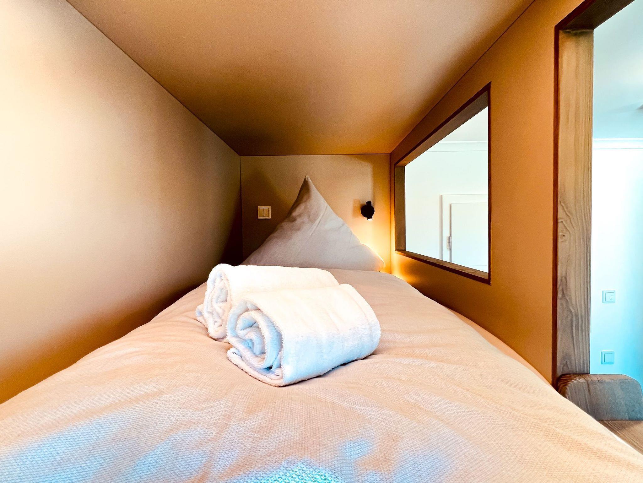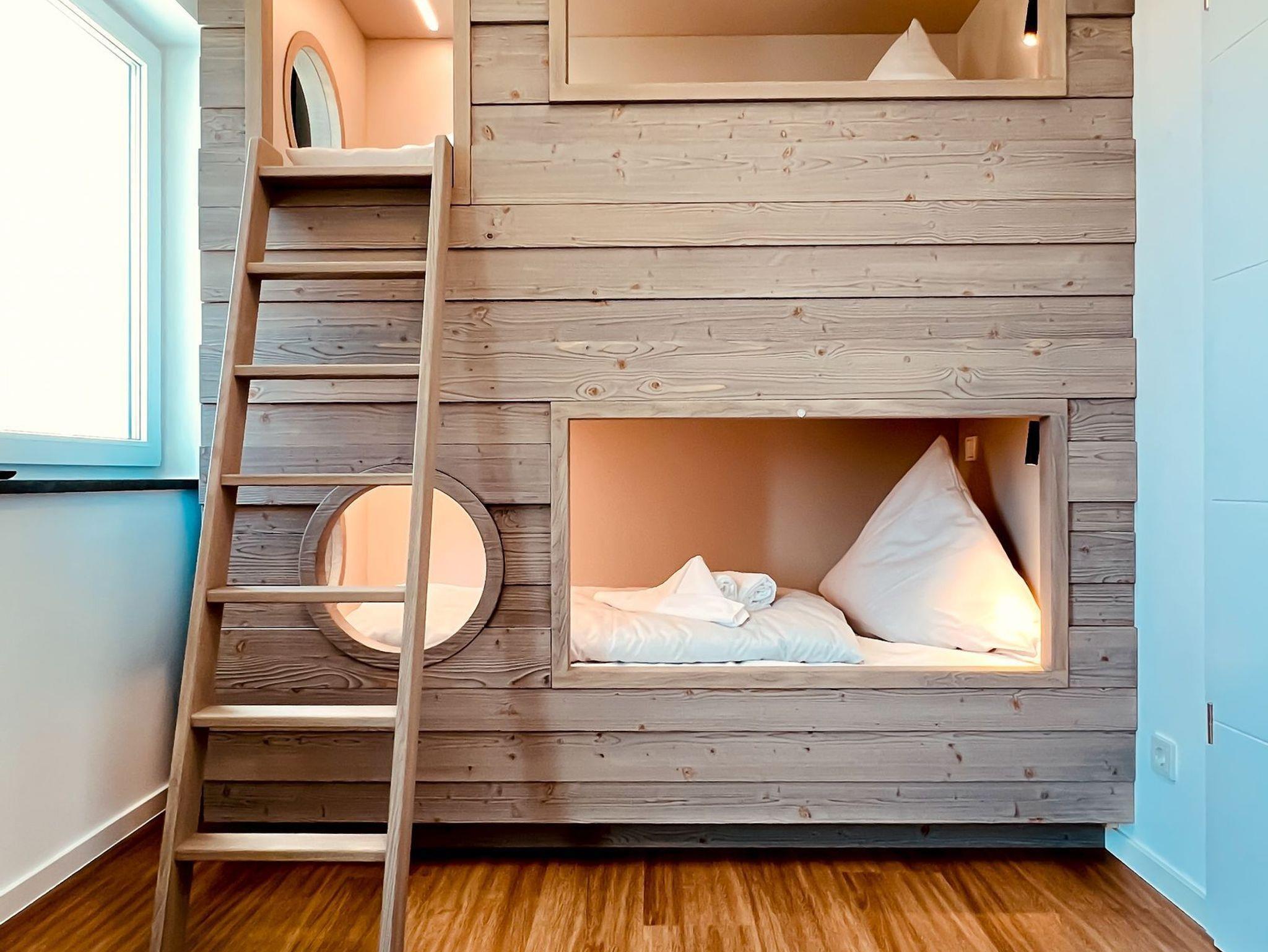 Die Ferienwohnung verfügt über eine 24 qm großen Dachterrasse, auf der Sie im Strandkorb den Sonnenuntergang exklusiv beobachten können. Ein Highlight ist das Etagenbett für Ihre Kinder, welches einer Koje nachempfunden wurde und viel Geborgenheit bietet. Ein Kinderbett inklusive Matratze und ein Hochstuhl stehen für Sie kostenfrei bereit.