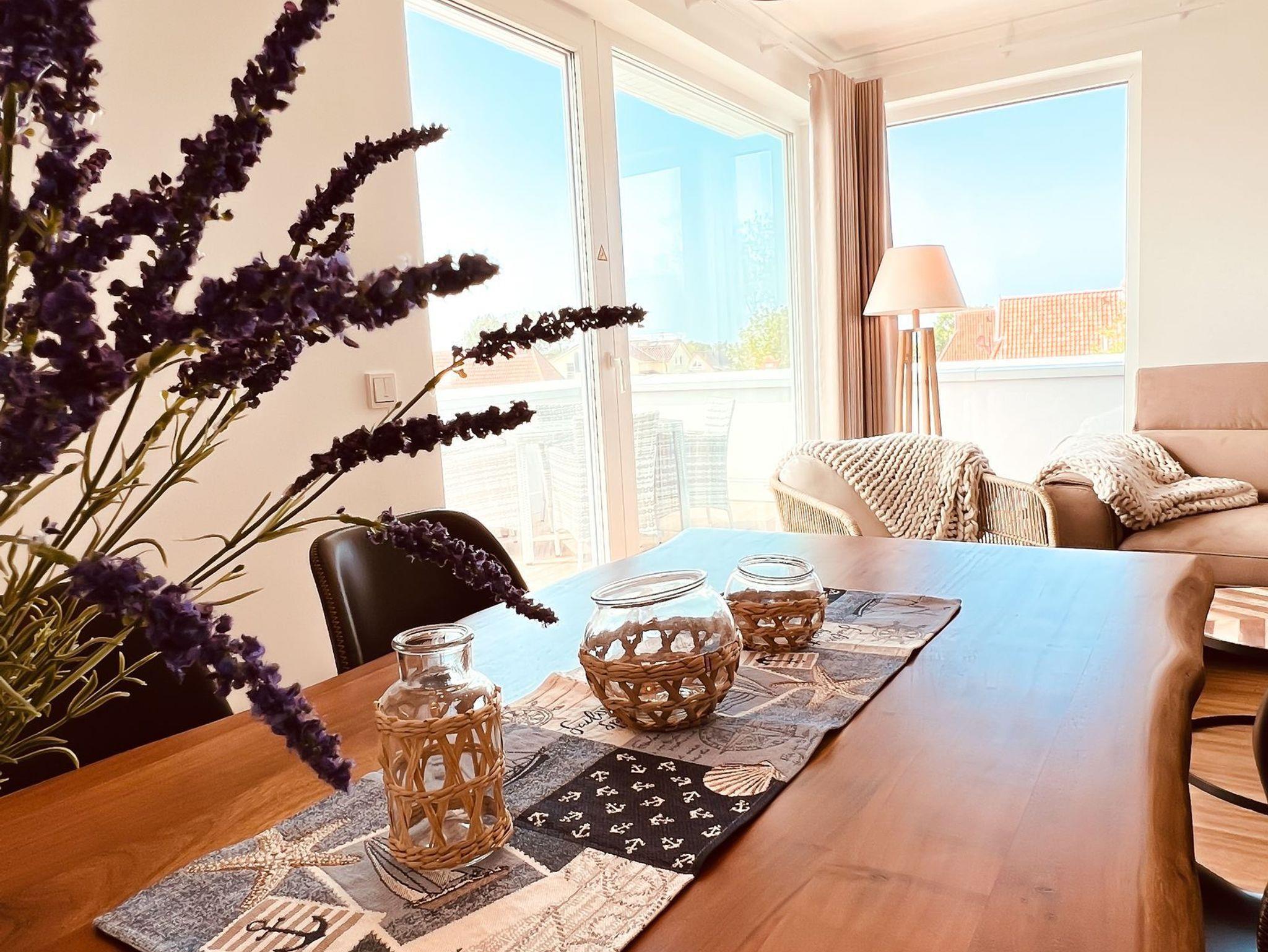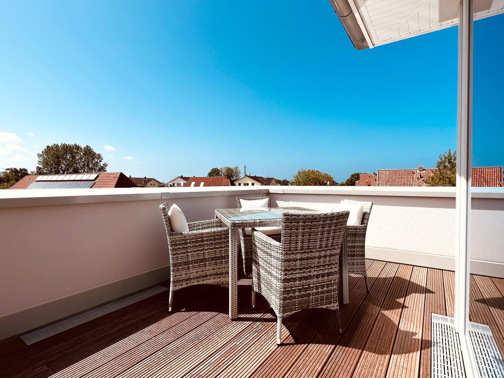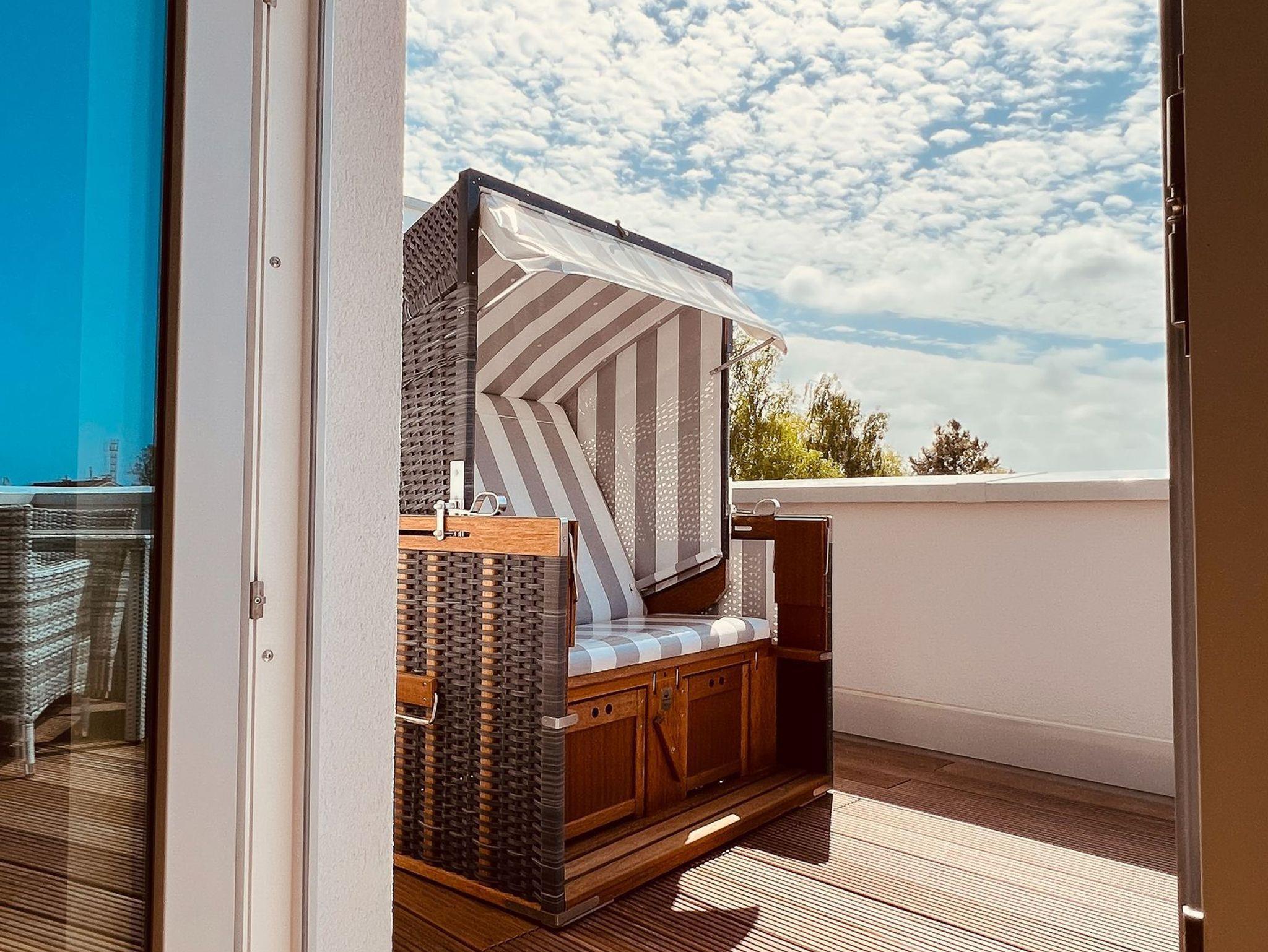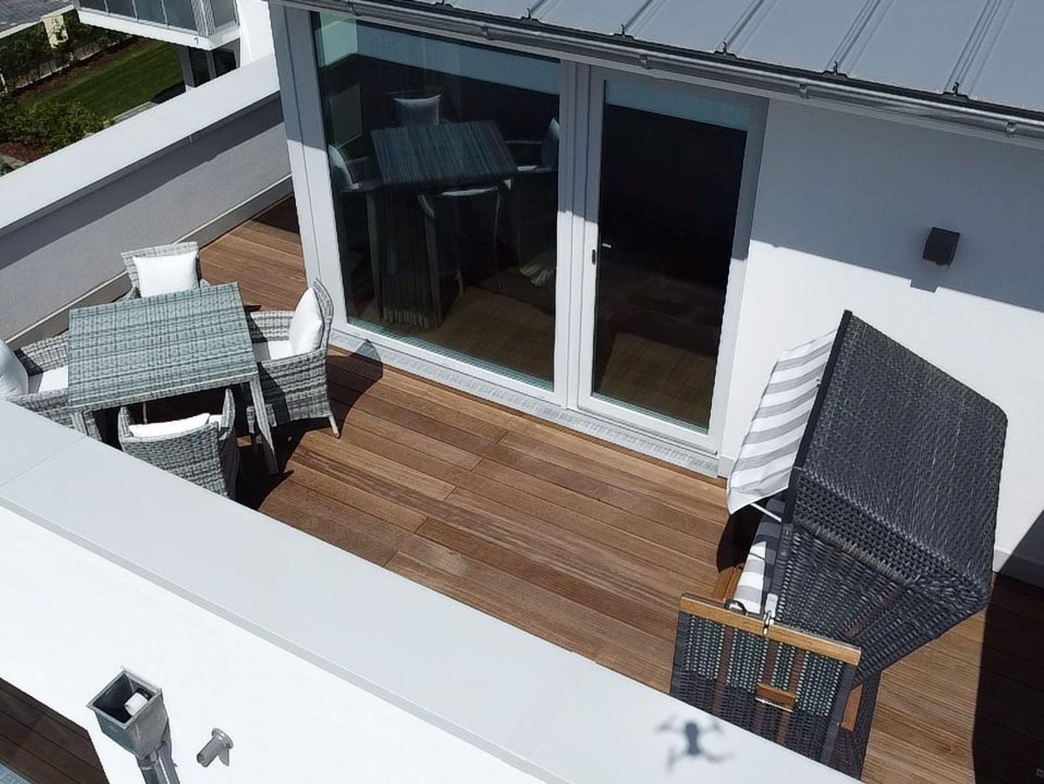 Moderne 3-Zimmer-Ferienwohnung mit großer Dachterrasse und Strandkorb nahe Ostseestrand.
