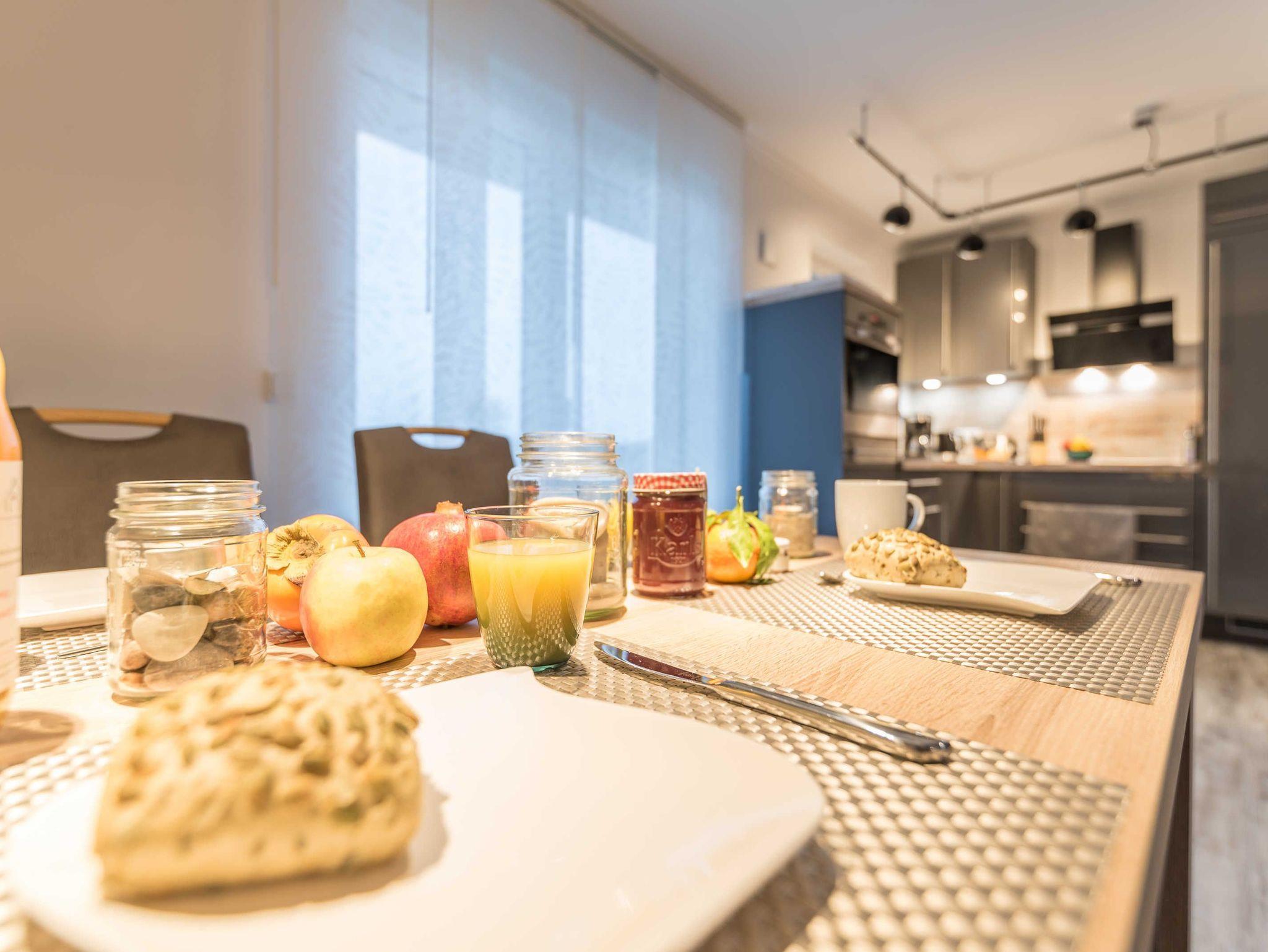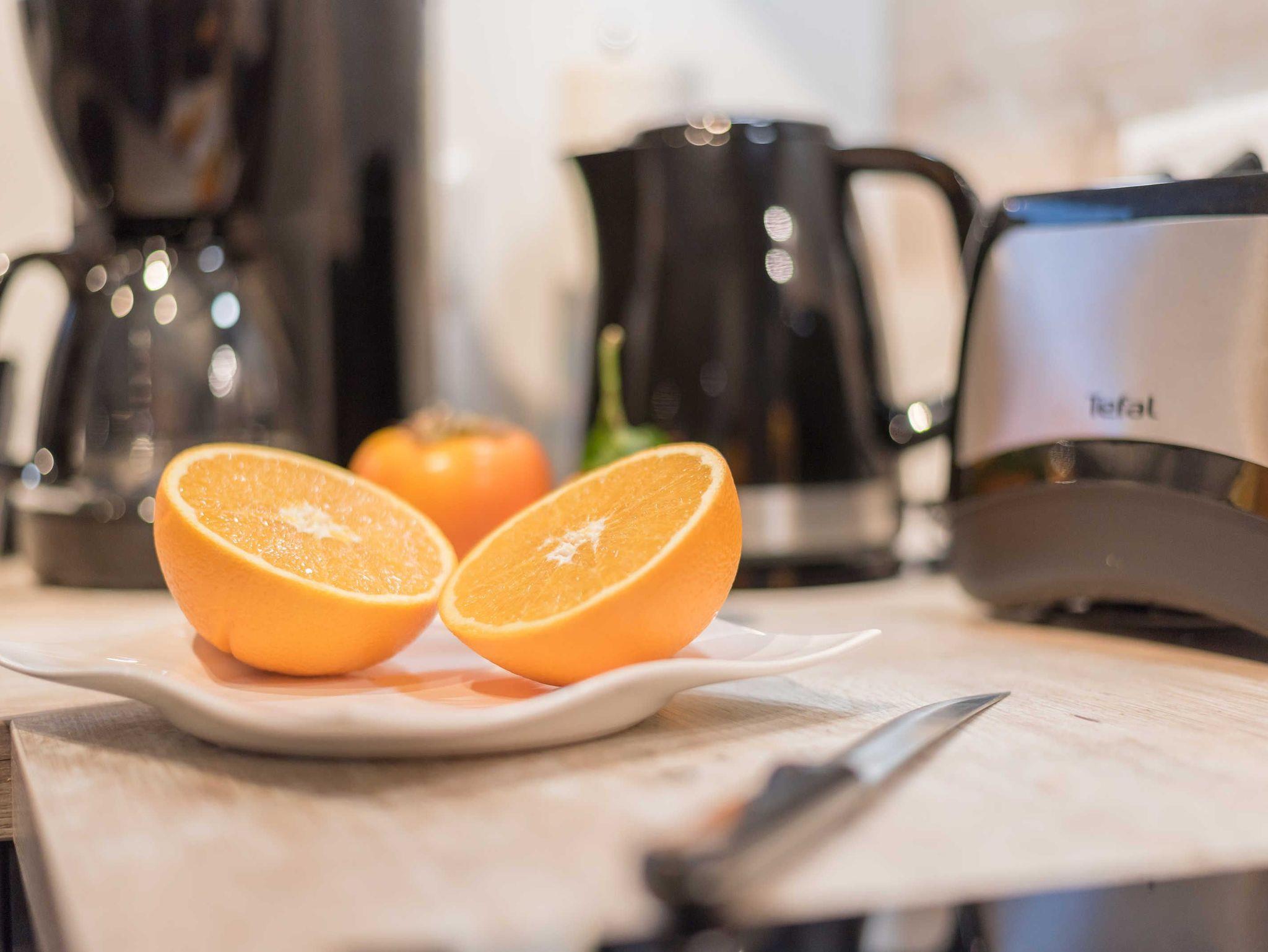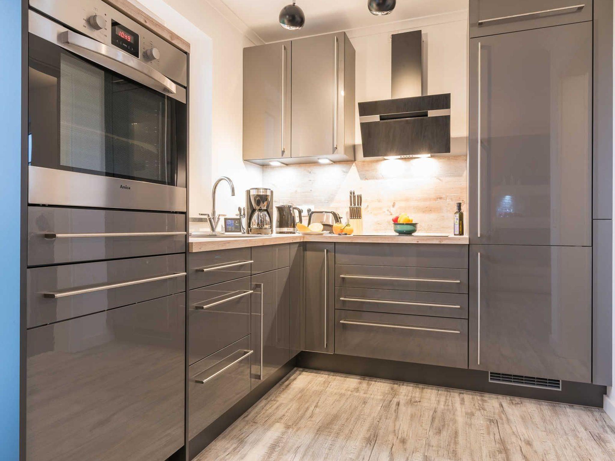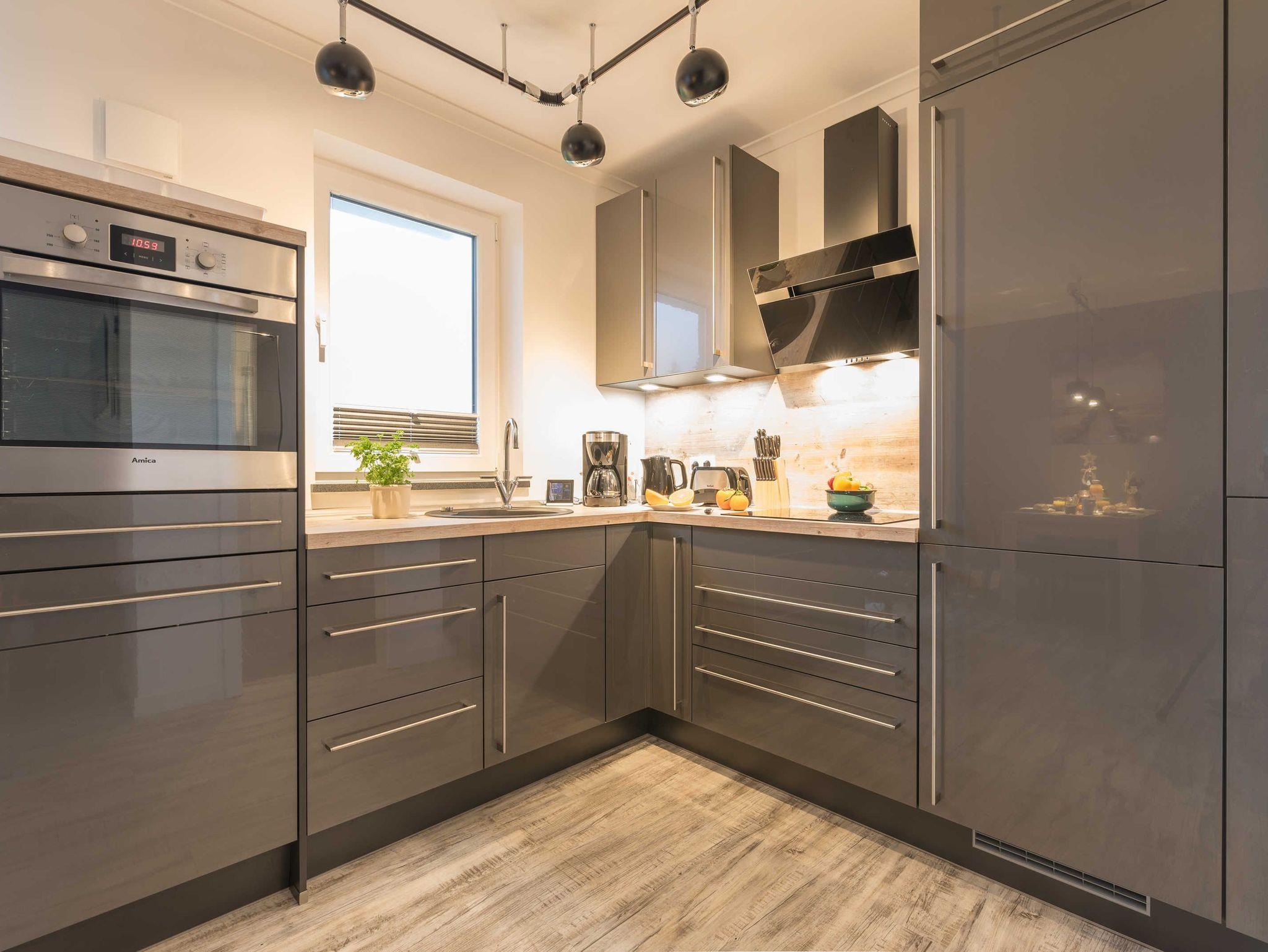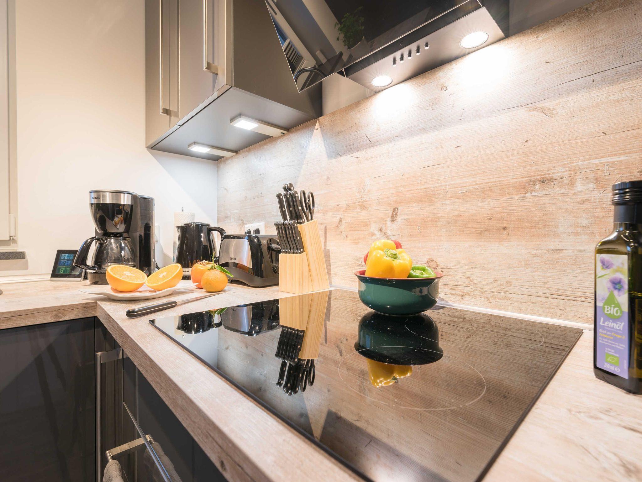 Die hochwertige Einbauküche verfügt über einen hochgebauten Backofen sowie Kaffeemaschine, Toaster, Wasserkocher, Mikrowelle, Kühl-/Gefrierschrank, Geschirrspüler und ein Cerankochfeld mit vier Platten.