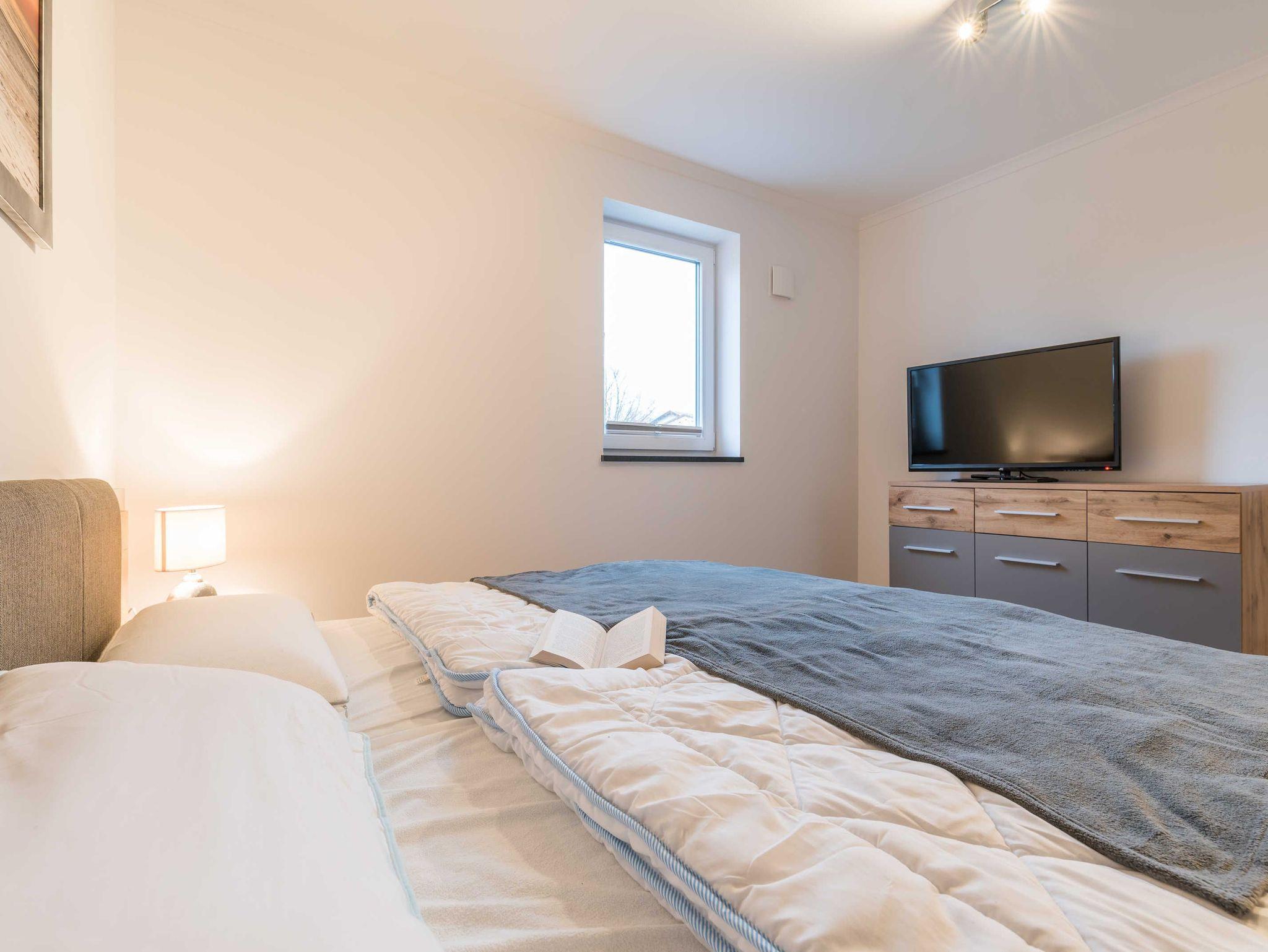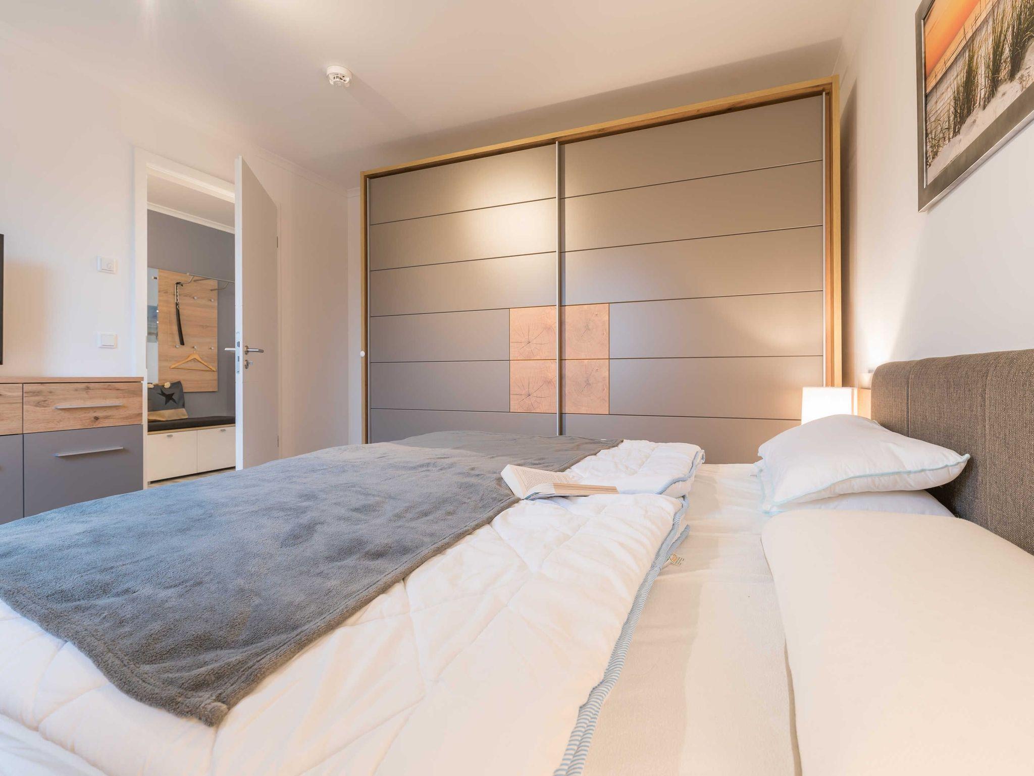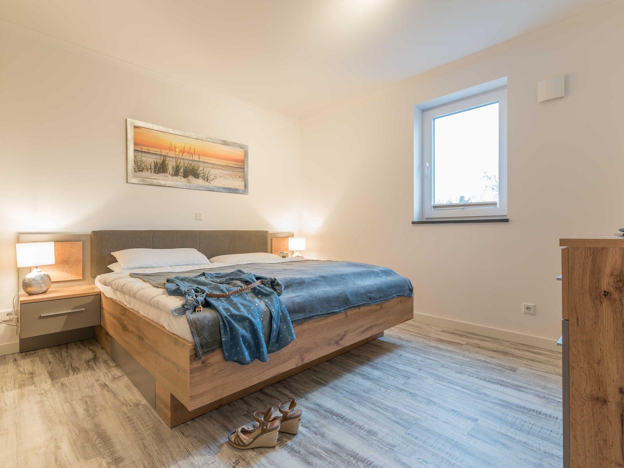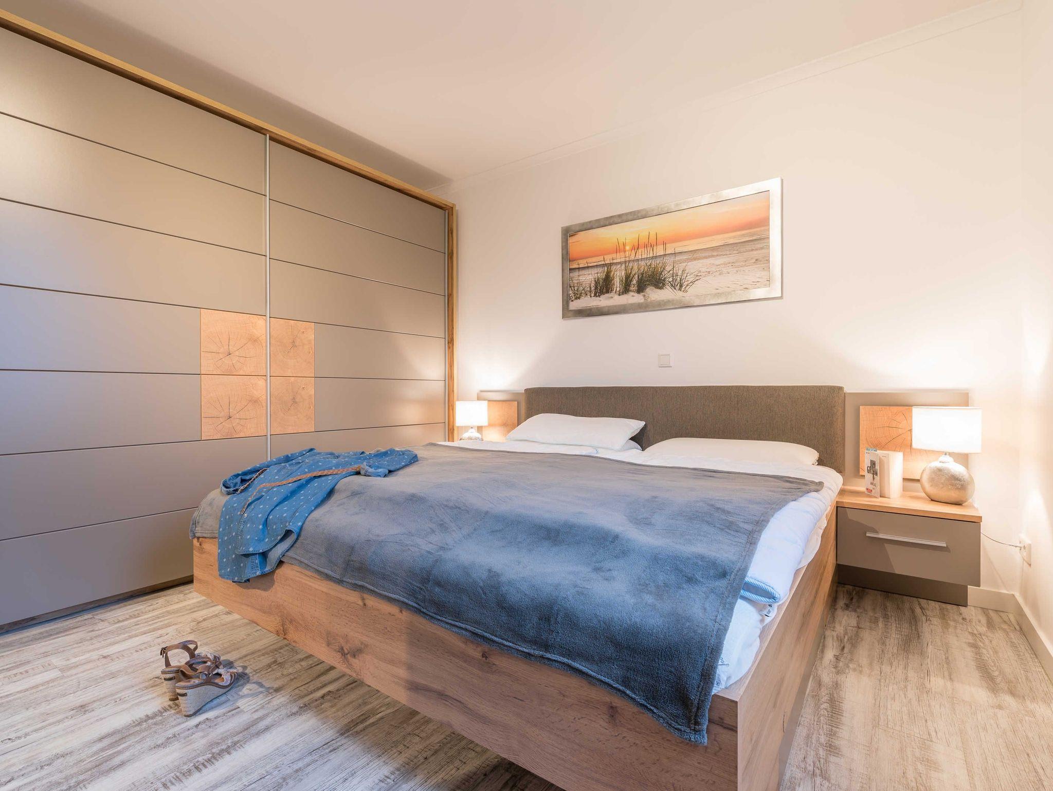 Das große Schlafzimmer ist mit einem komfortablen Bett (180x200 cm bestehend aus zwei Matratzen 90x200 cm), einem geräumigen Kleiderschrank und einem Sideboard ausgestattet.