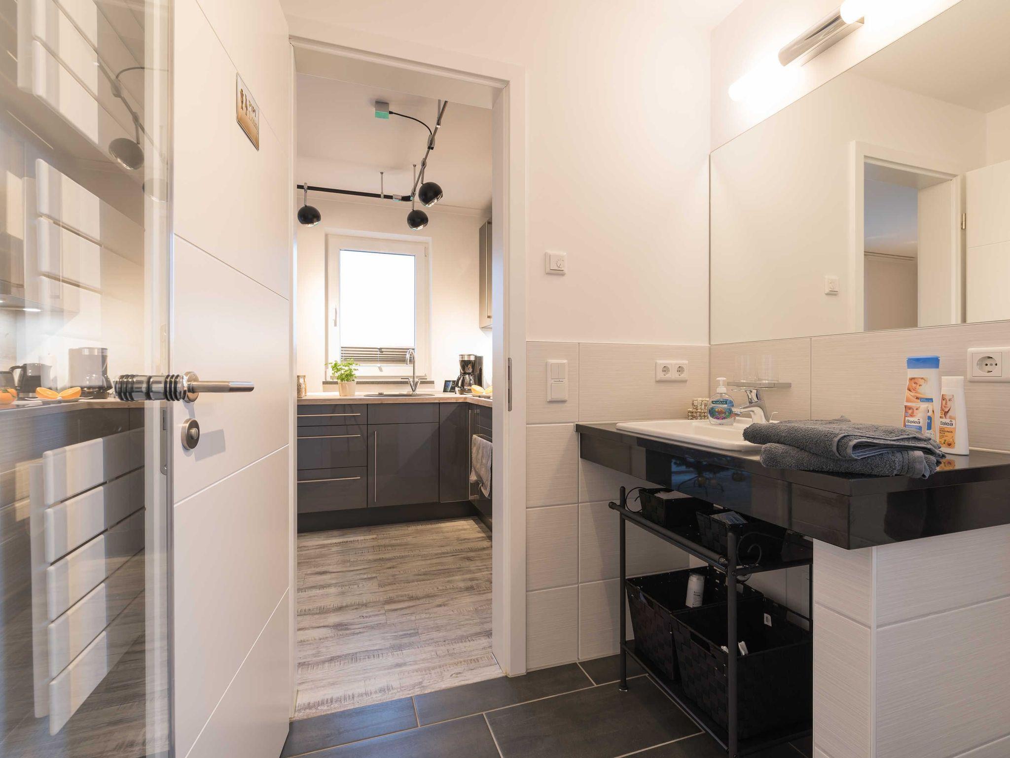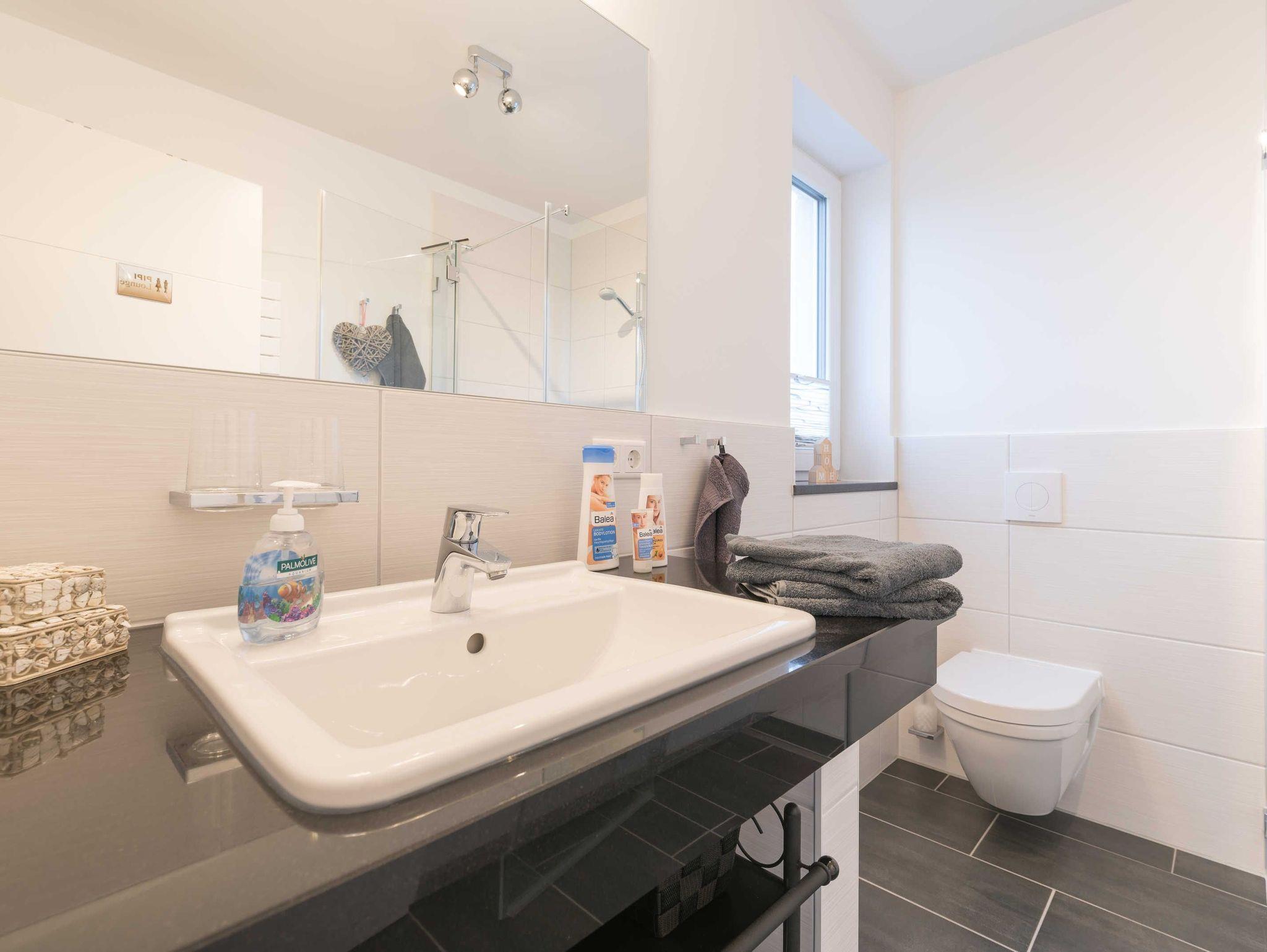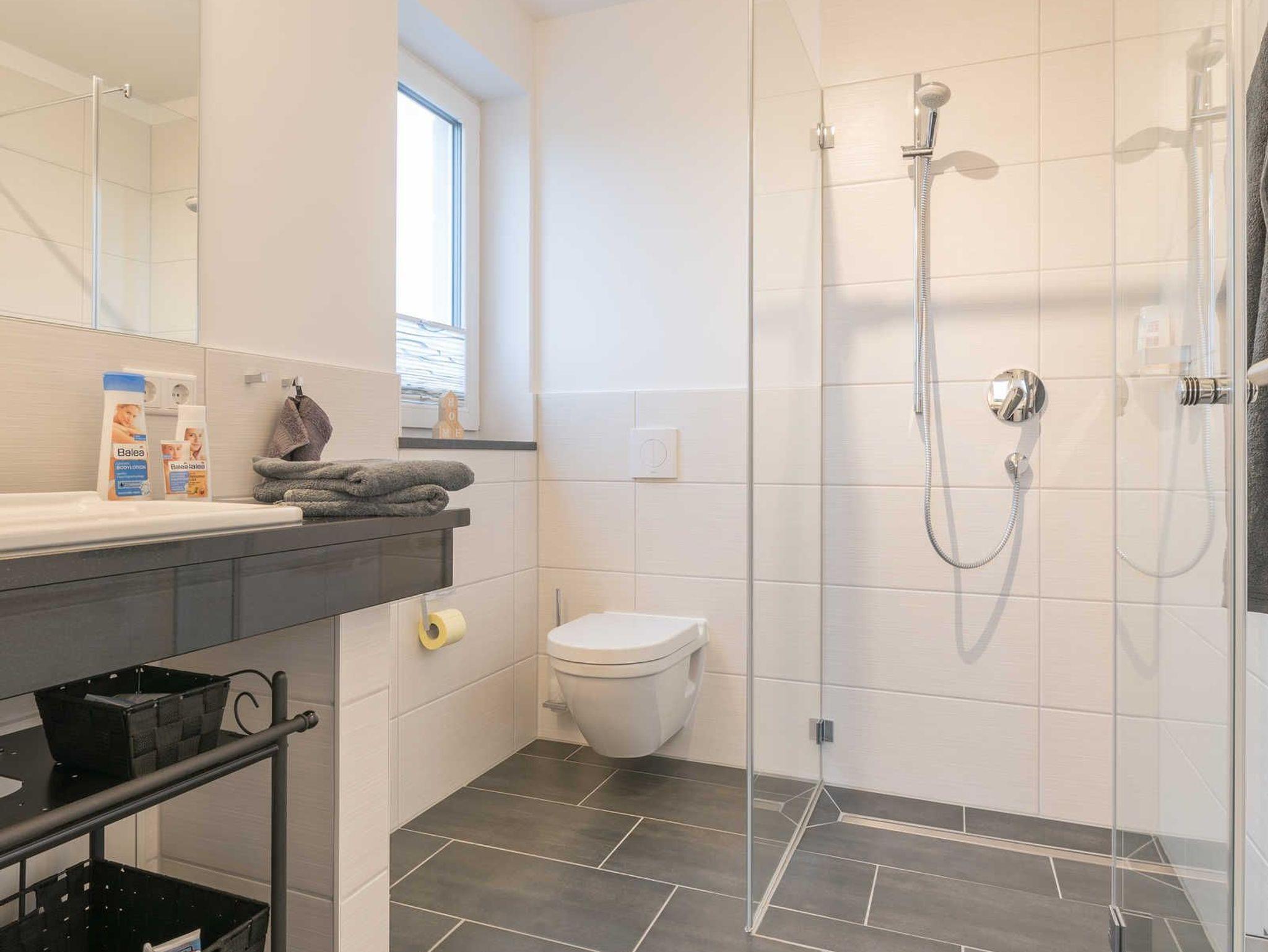 Das helle Badezimmer mit bodengleicher Dusche verfügt über einen geräumigen Waschtisch mit großem Spiegel, eine Toilette und einen Handtuchwärmer.