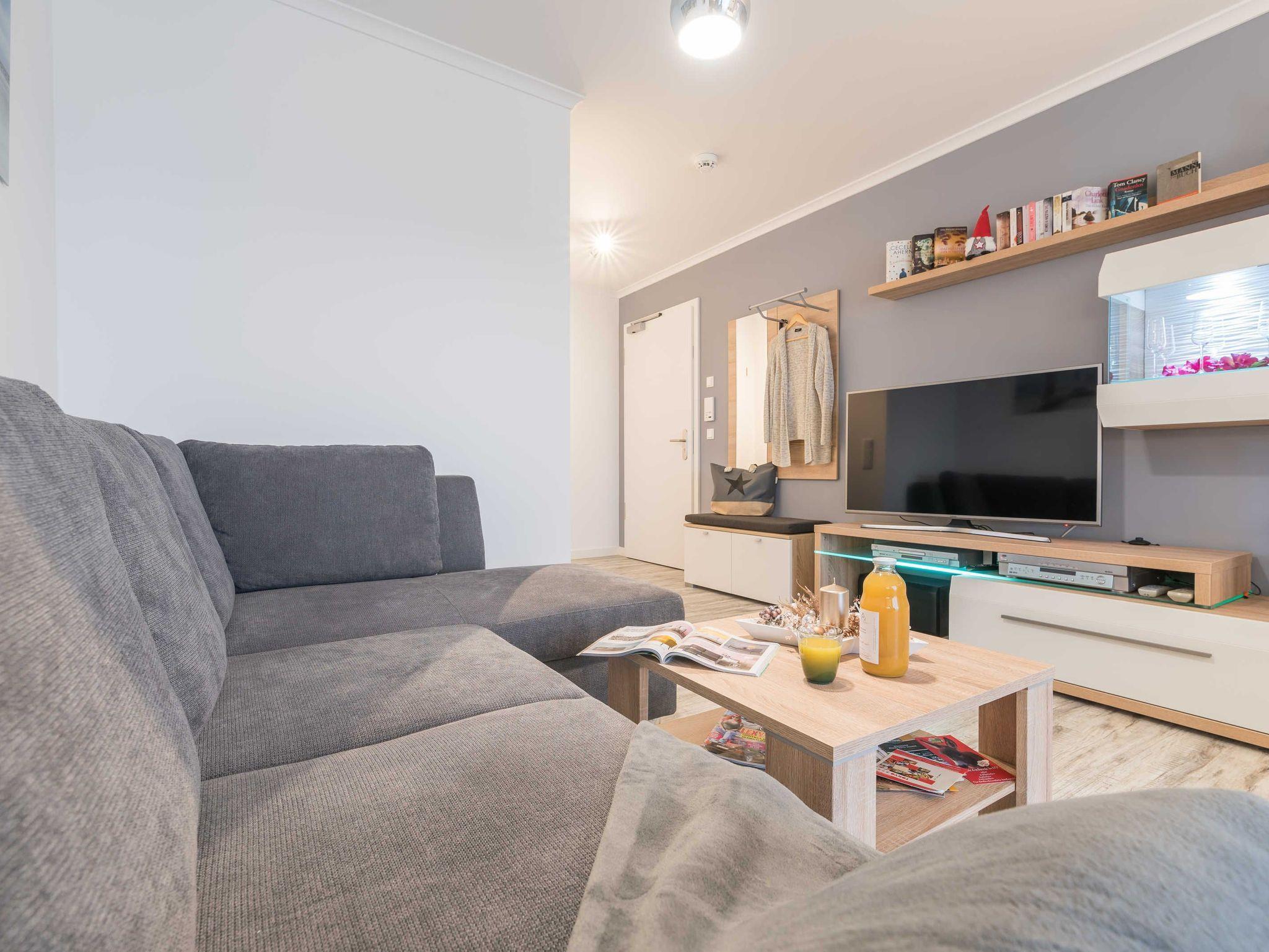 Der Wohnbereich ist hell und gemütlich. Das Sofa mit Schlaffunktion (Liegefläche 150x200 cm) wird ergänzt durch einen Couchtisch, einen Flat-TV 50? , einen Blu-Ray-Player sowie eine kleine Musikanlage.
