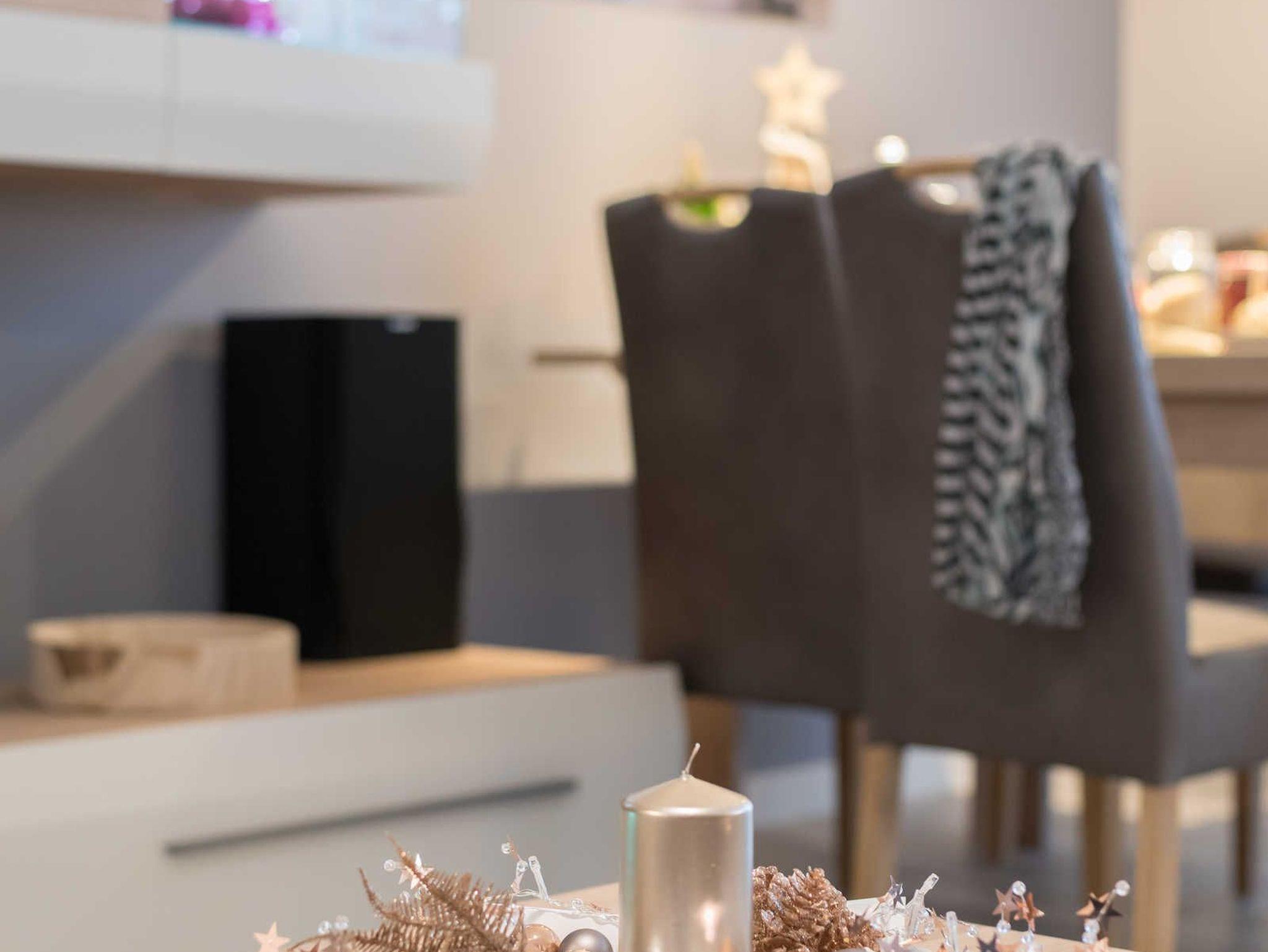 Der große, ausziehbare Esstisch mit vier bequemen Stühlen ermöglicht ein gemütliches Essen und ist auch bestens geeignet für gesellige Spieleabende.