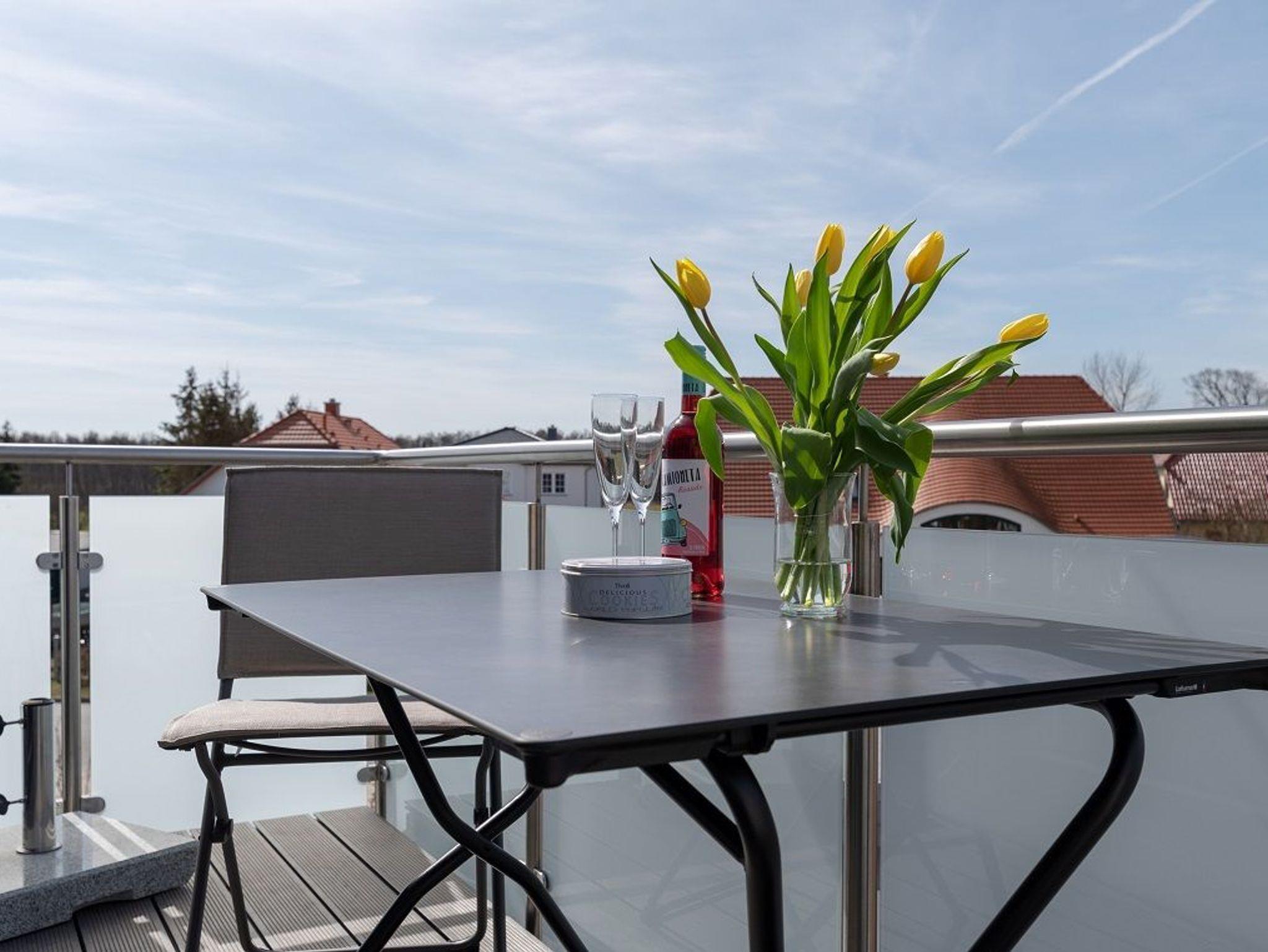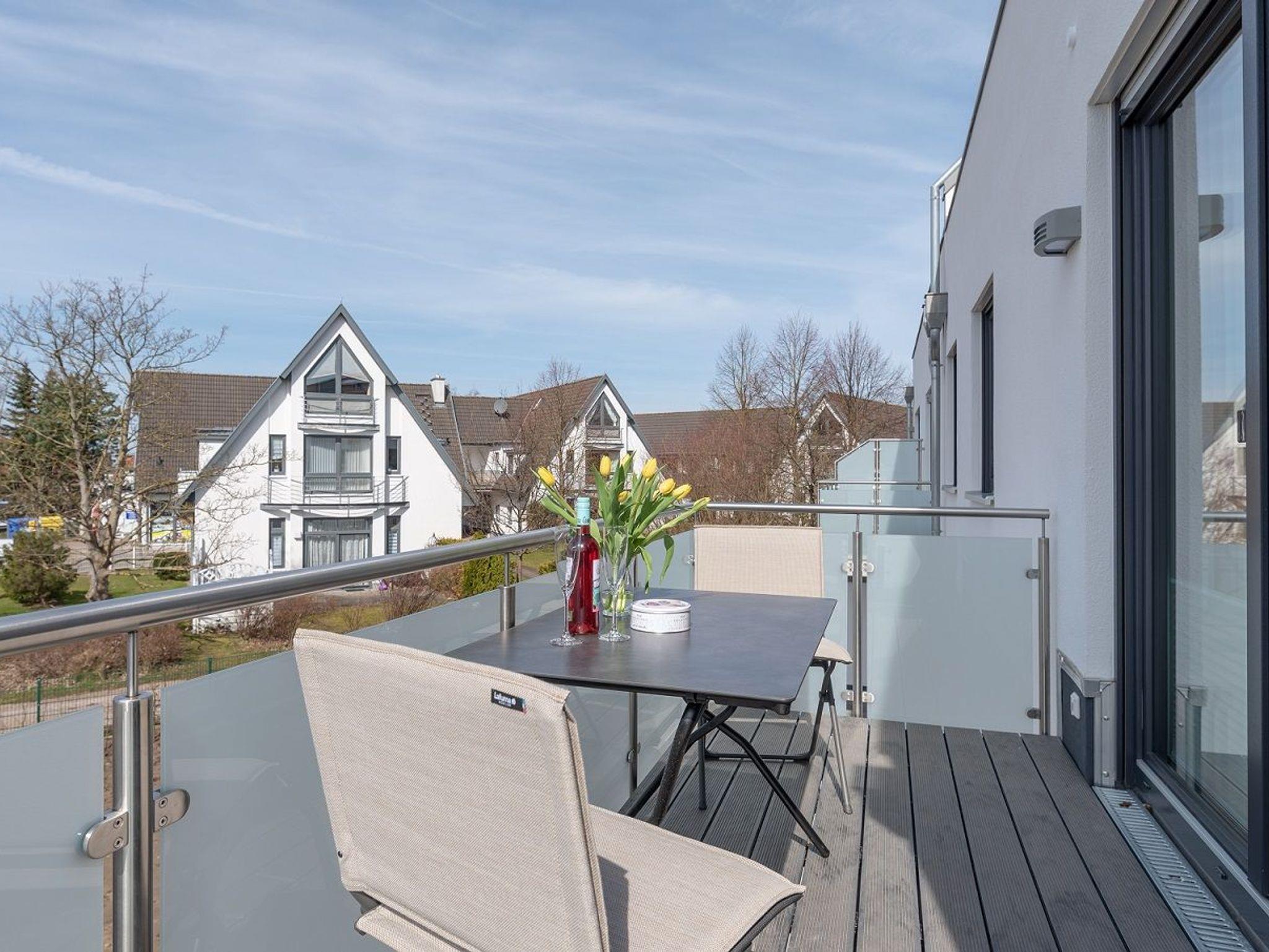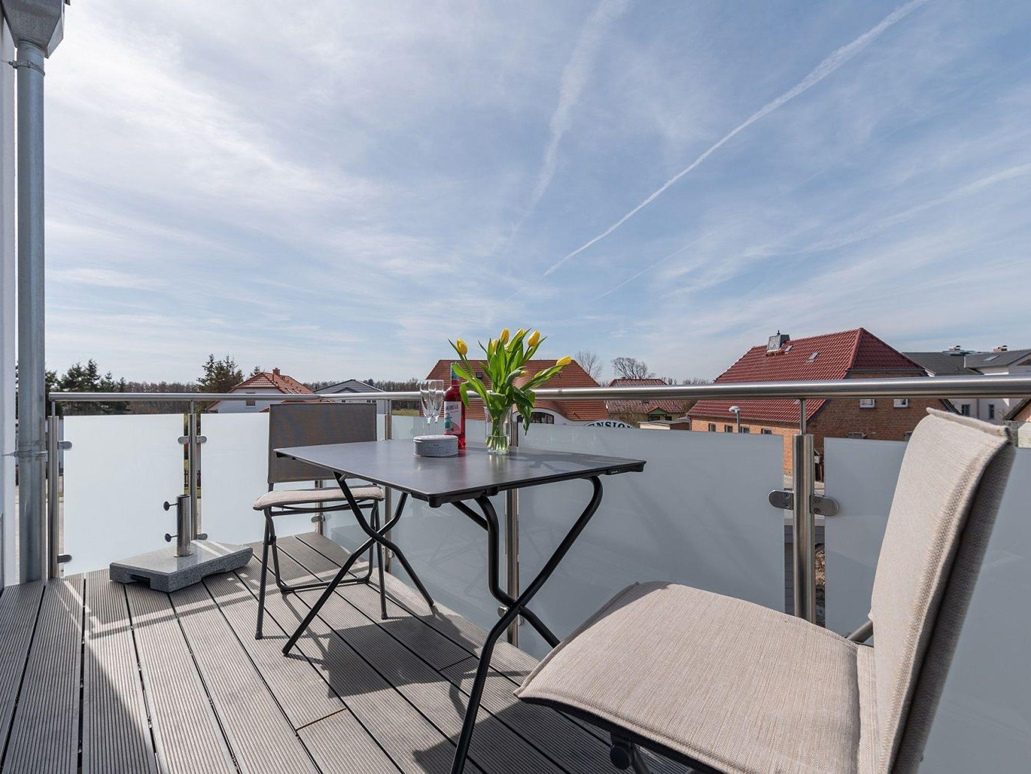Modernes Apartment Baltic Cube in Börgerende mit Balkon, maritimem Stil und Strandnähe für entspannte Urlaubstage.