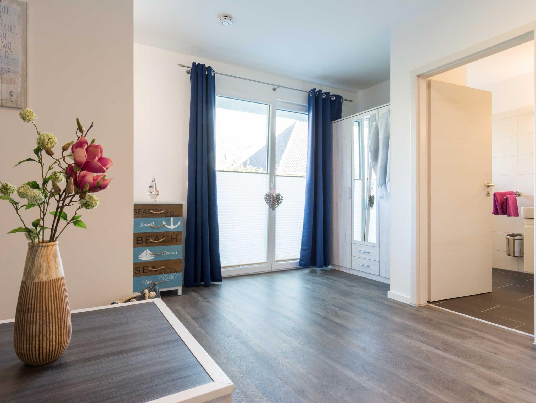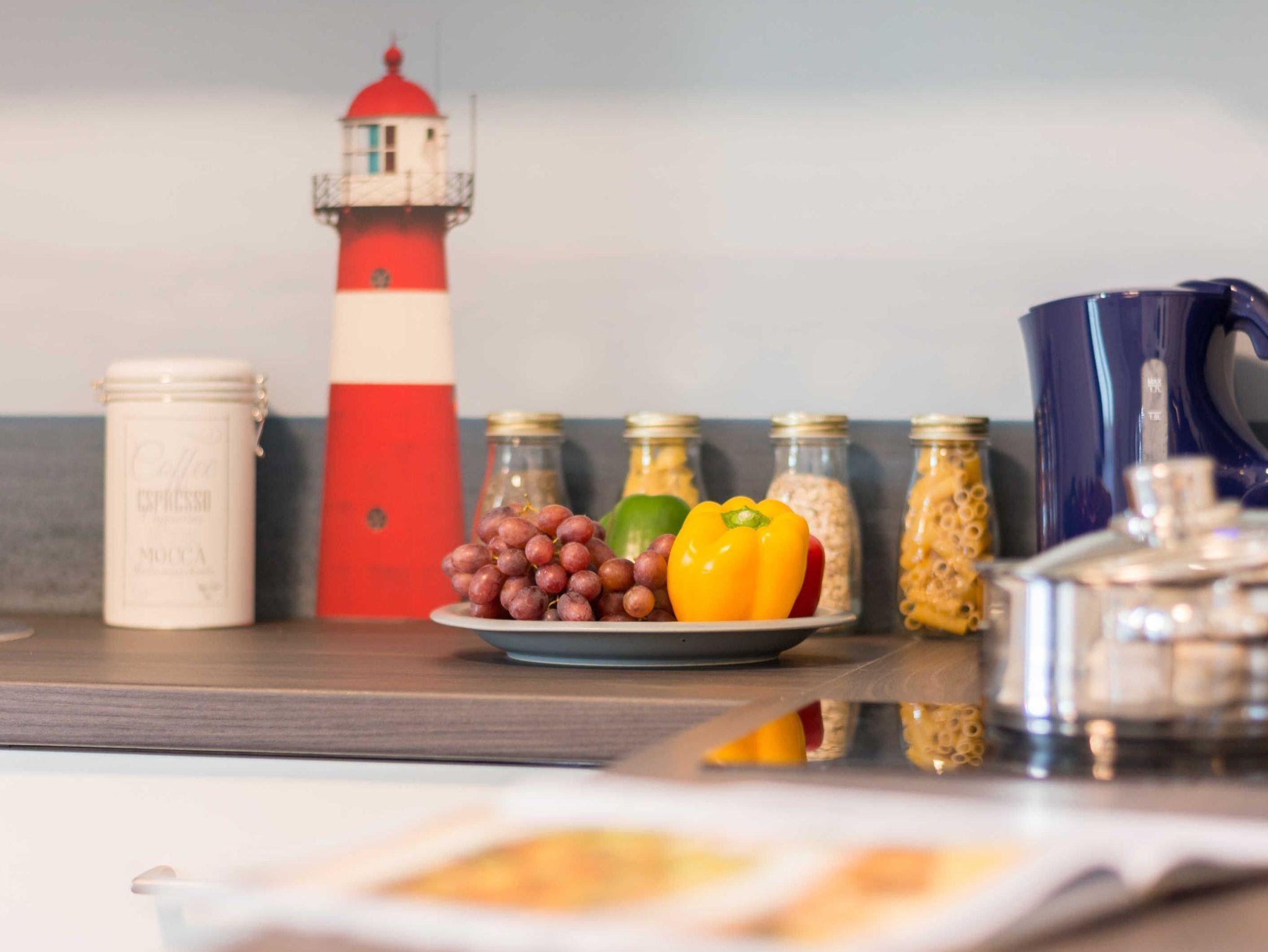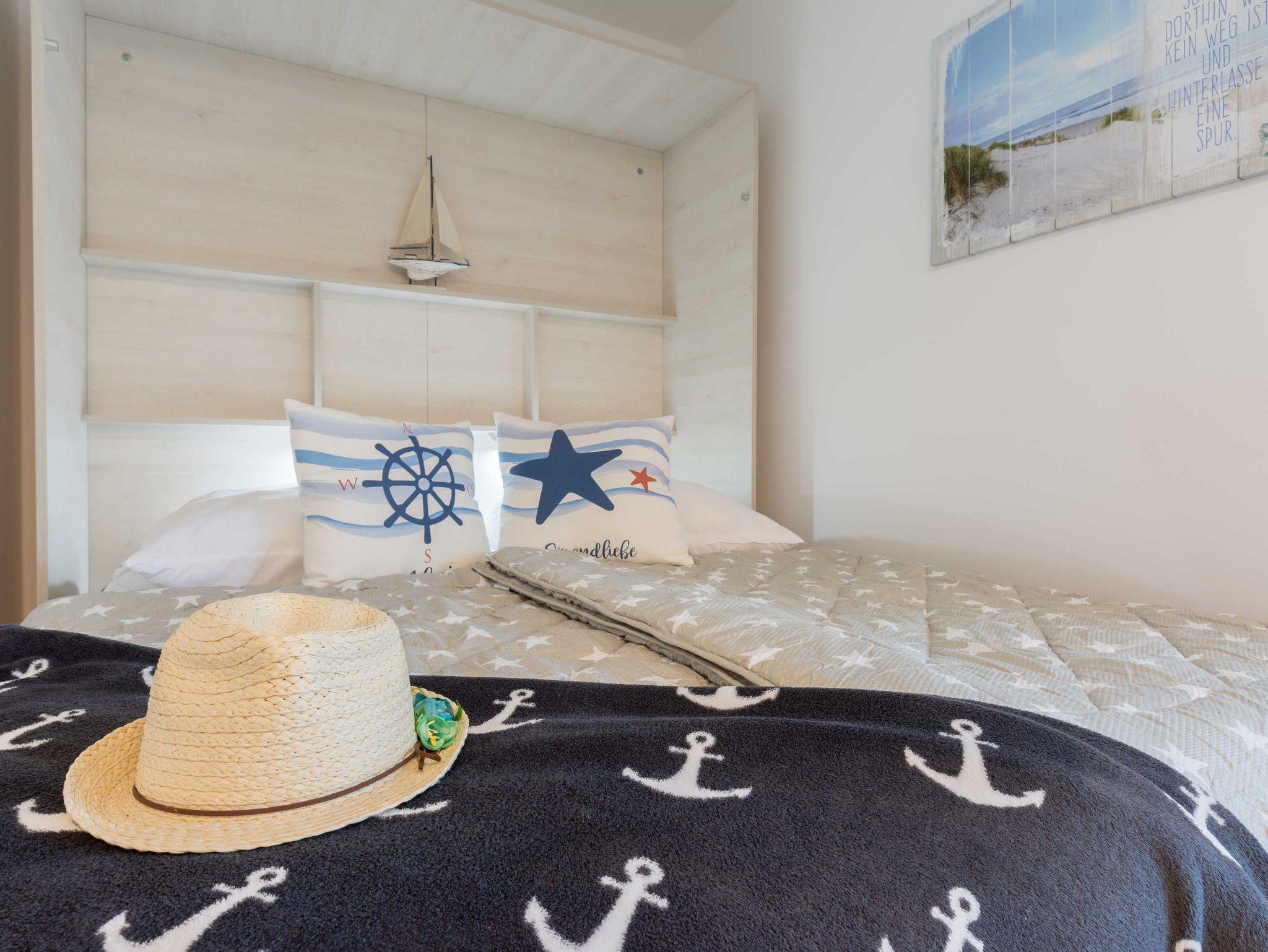Das 2017 fertig gestellte Einraumapartment ist im maritimen Wohnstil eingerichtet und lädt in gemütlicher Atmosphäre für Zeit zu Zweit ein. Ein Wandschrank mit Sofa lässt sich mit nur einem Handgriff zum Doppelbett umfunktionieren (Liegefläche 160[nbsp] x 200cm ). In der modernen Einbauküche mit Geschirrspüler, Mikrowelle, Kühl-Gefrierkombination, Cerankochfeld, Wasserkocher, Toaster und Kaffeemaschine kann man nach Herzenslust kochen. Im großzügigen Badezimmer befinden sich neben WC und ebenerdiger Glasdusche ein Badspiegel, ein Handtuchtrockner und ein Fön. Im Wohnbereich finden Ihre Sachen in einem großen Kleiderschrank mit integriertem Spiegel Platz. Zum besseren Einschlafen oder für gemütliche Abende sorgen das Radio oder der wandhängende 43-Zoll Flat-TV. Das kostenfreie WLAN der Unterkunft ist ausschließlich für die Verwendung von Social Media und den Austausch von Bildern mit Familie und Freunden gedacht. Die Nutzung zum Streamen von Filmen ist nicht vorgesehen.