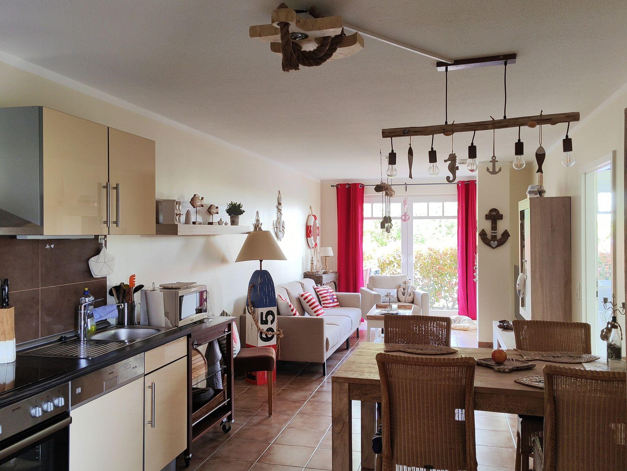 Im Wohnzimmer empfängt Sie eine gemütliche Leseecke mit Flat-TV. Der Fernseher ermöglicht Ihnen Streamingdienste mit vielen vor eingestellten Diensten. Am hölzernen Essplatz finden vier Personen Platz für gemeinsame Mahlzeiten und gesellige Spieleabende. Die offene Küche ist voll ausgestattet mit Herd, Backofen, Kühlschrank, einem separaten großen Gefrierschrank, mit dem Sie sich sehr gut selbst versorgen können, Mikrowelle, Geschirrspülmaschine, Kaffeemaschine und Wasserkocher. In beiden Schlafzimmern erwarten Sie ein geräumiger Kleiderschrank sowie exklusive Boxspring-Doppelbetten (1,60 x 2,00 m). Vom Wohnbereich aus haben Sie Zutritt auf die West-Terrasse mit entsprechenden Gartenmöbeln. Ein kleiner Flurbereich und das Badezimmer mit ebenerdiger und somit barrierefrei zugänglicher Dusche vervollständigen die Wohnung.