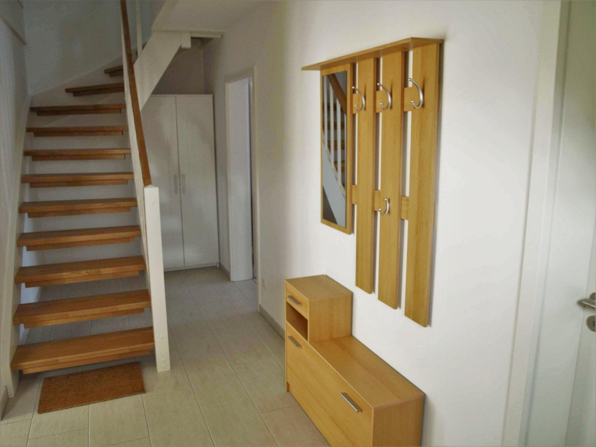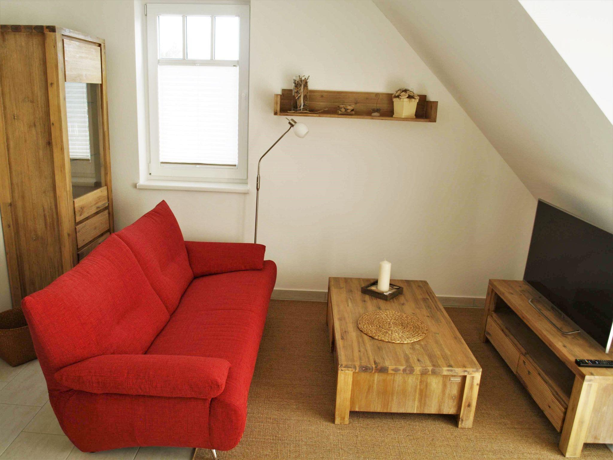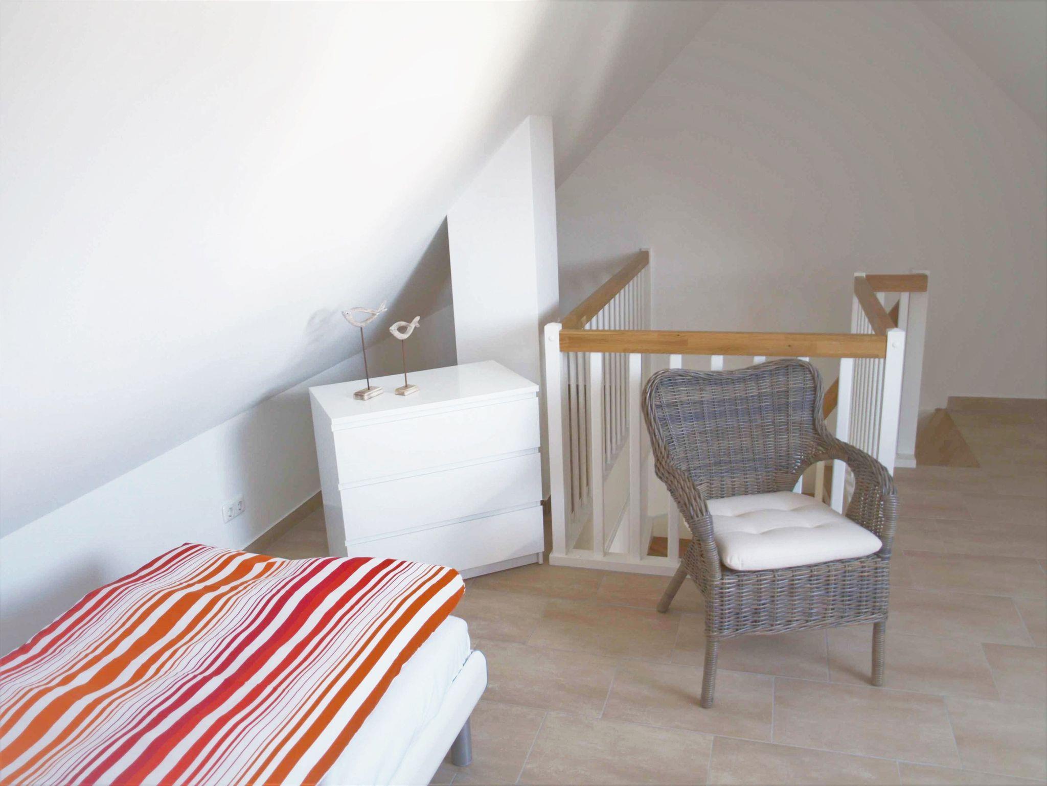 Die Ferienwohnung auf 60 Quadratmetern liegt im ersten Obergeschoss und verfügt über einen großen Wohn- und Essbereich sowie separates Schlafzimmer mit Doppelbett (einzelne Matratzen 180 x 200 cm), Fernseher und Kleiderschrank. In der offenen Maisonette befinden sich zwei Einzelbetten (je 100 x 200 cm) sowie eine Kommode. Der Wohnraum mit offener Küche und Essbereich ist das Herzstück Ihrer Ferienwohnung. Von hier aus gelangen Sie auf den möblierten Balkon in Richtung Westen. Vom Schlafzimmer gelangen Sie auf den Ostbalkon. Hier genießen Sie schöne Abendstunden. Im Wohnraum integriert befinden sich ein Esstisch mit vier Stühlen sowie eine ausgestattete Einbauküche mit Herd, Backofen, Kühlschrank, Mikrowelle, Kaffeemaschine und Geschirrspüler. Der Wohnbereich ist mit einem Sofa und TV eingerichtet. Ein kostenfreier PKW-Stellplatz und Fahrradbügel zum Anschließen stehen Ihnen während Ihres Aufenthaltes zur Verfügung.