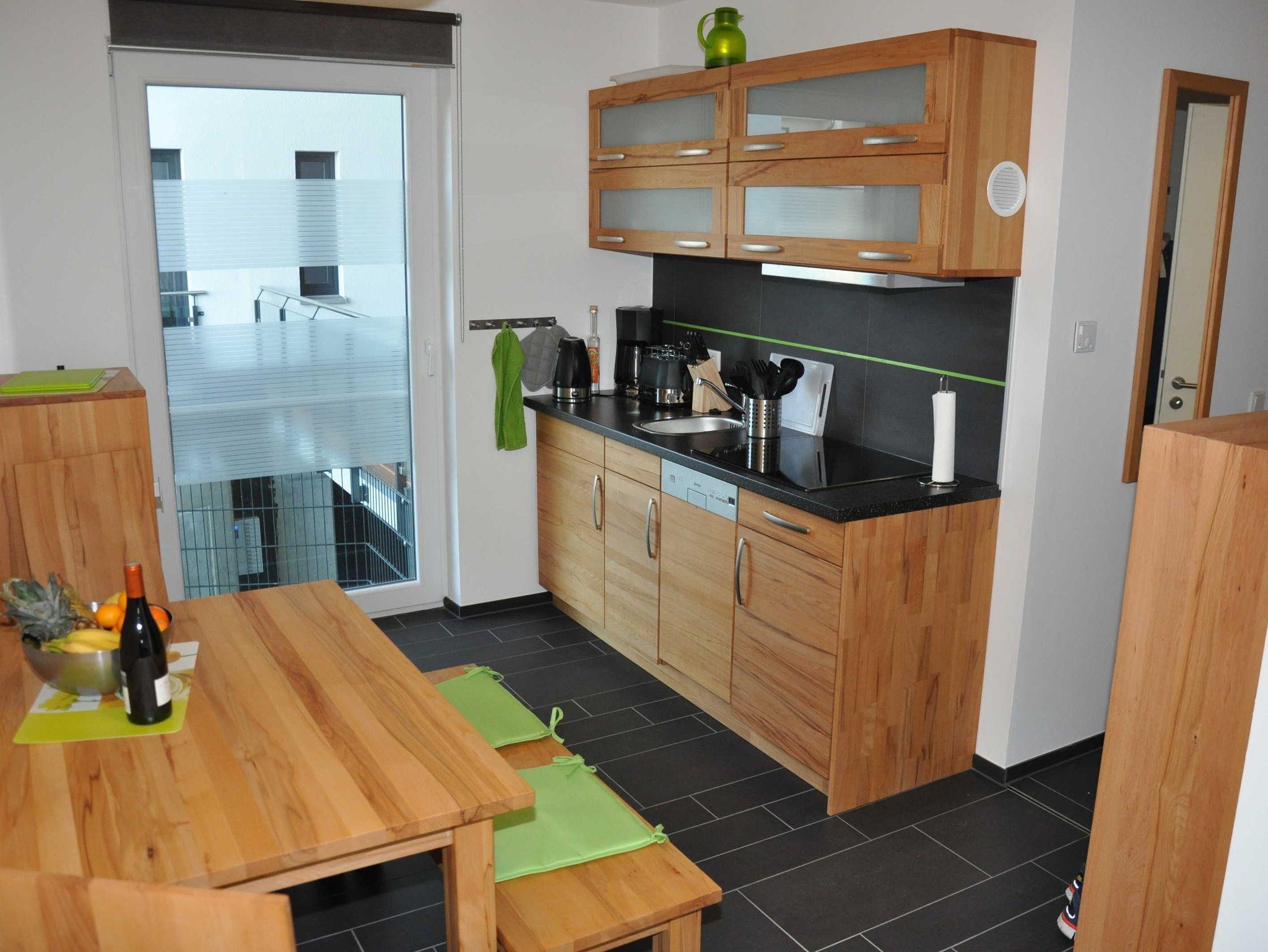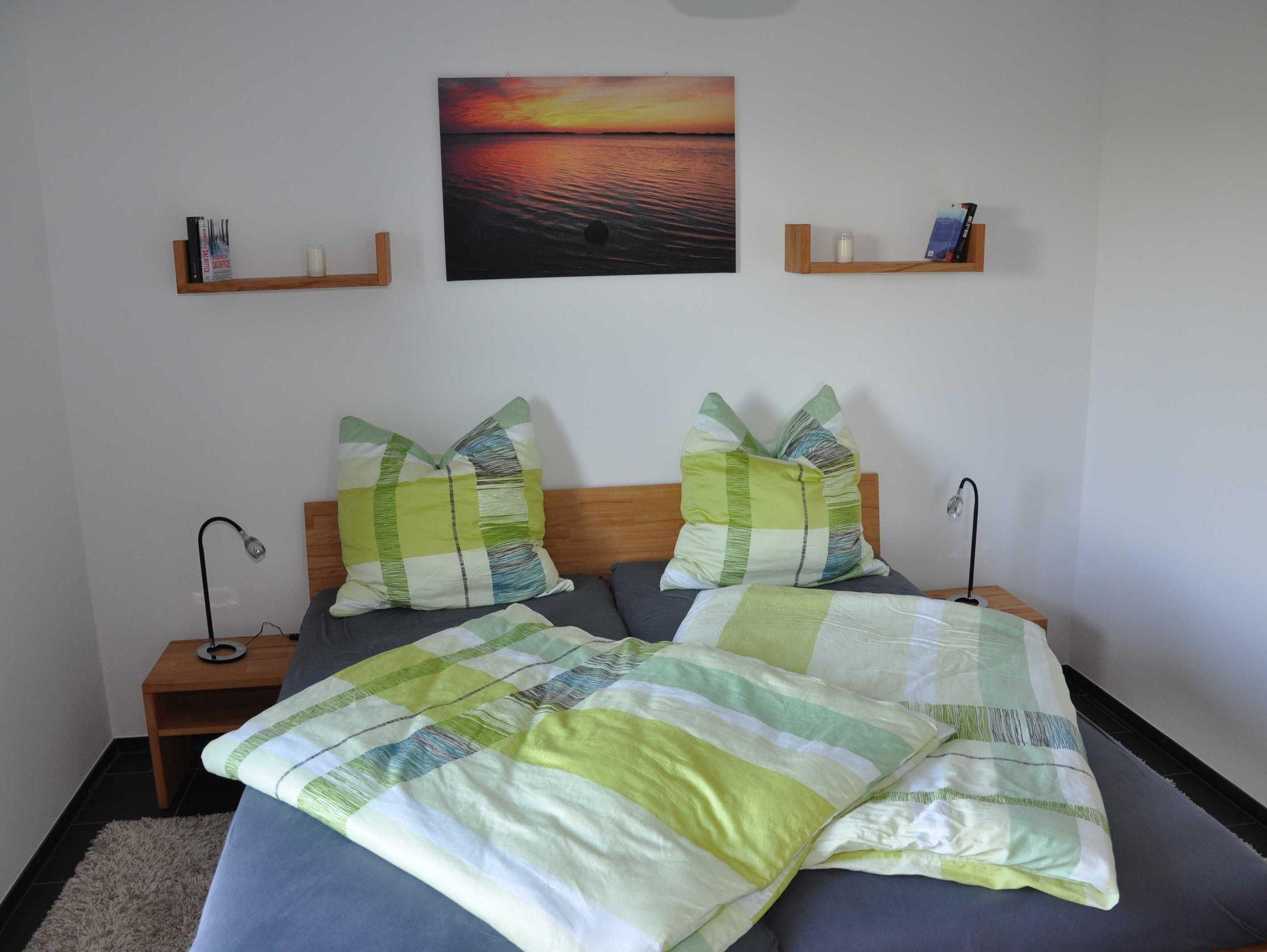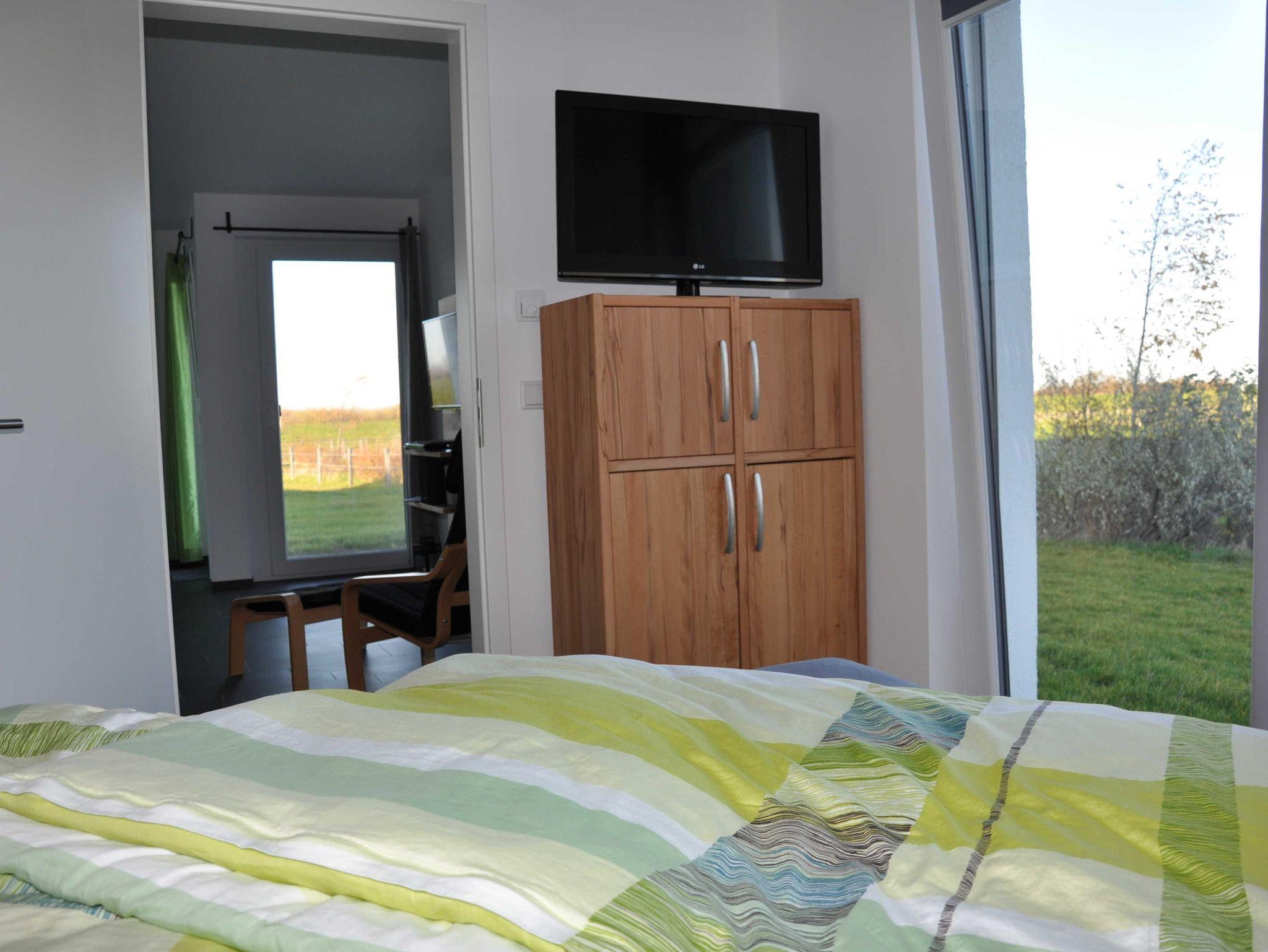Die Wohnung bietet Ihren Gästen ein Schlafzimmer mit einem komfortablen Doppelbett (getrennte Matratzen) und ein großes Wohnzimmer mit einer bequemen Schlafcouch. Hier finden zwei weitere Personen bequem Platz. Die Ferienwohnung ist stilvoll eingerichtet. Für bunte Unterhaltung sorgen ein LED-TV und eine Stereoanlage. In der offenen Küche befindet sich eine komplett eingerichtete Einbauküche mit Backofen, Ceranfeld, Kühlschrank inklusive Gefrierfach, Geschirrspüler, Mikrowelle, Wasserkocher, Kaffeemaschine und Toaster. Das Bad mit Tageslicht verfügt über eine Dusche, eine große Spiegelfront, einen Föhn und mehrere Abstellmöglichkeiten. In der kompletten Wohnung ist eine Fußbodenheizung installiert und von jedem Zimmer aus können Sie nach außen auf die Terrasse gelangen. Starten Sie Ihren Tag mit frischen Brötchen und den Klängen der umliegenden Natur.