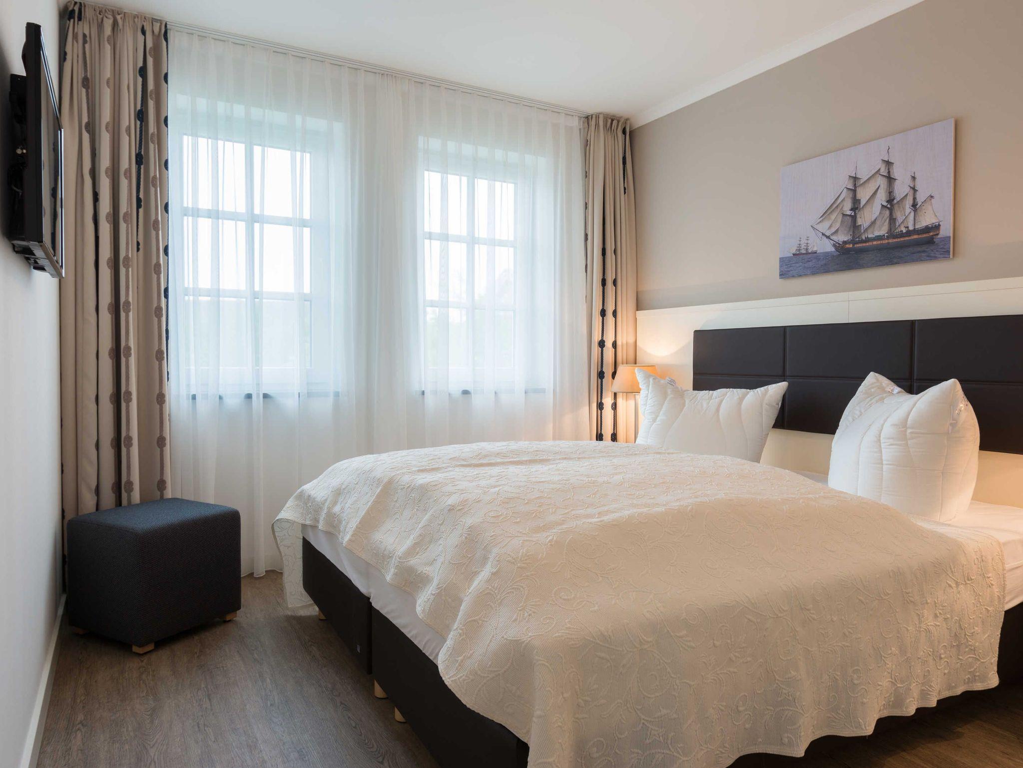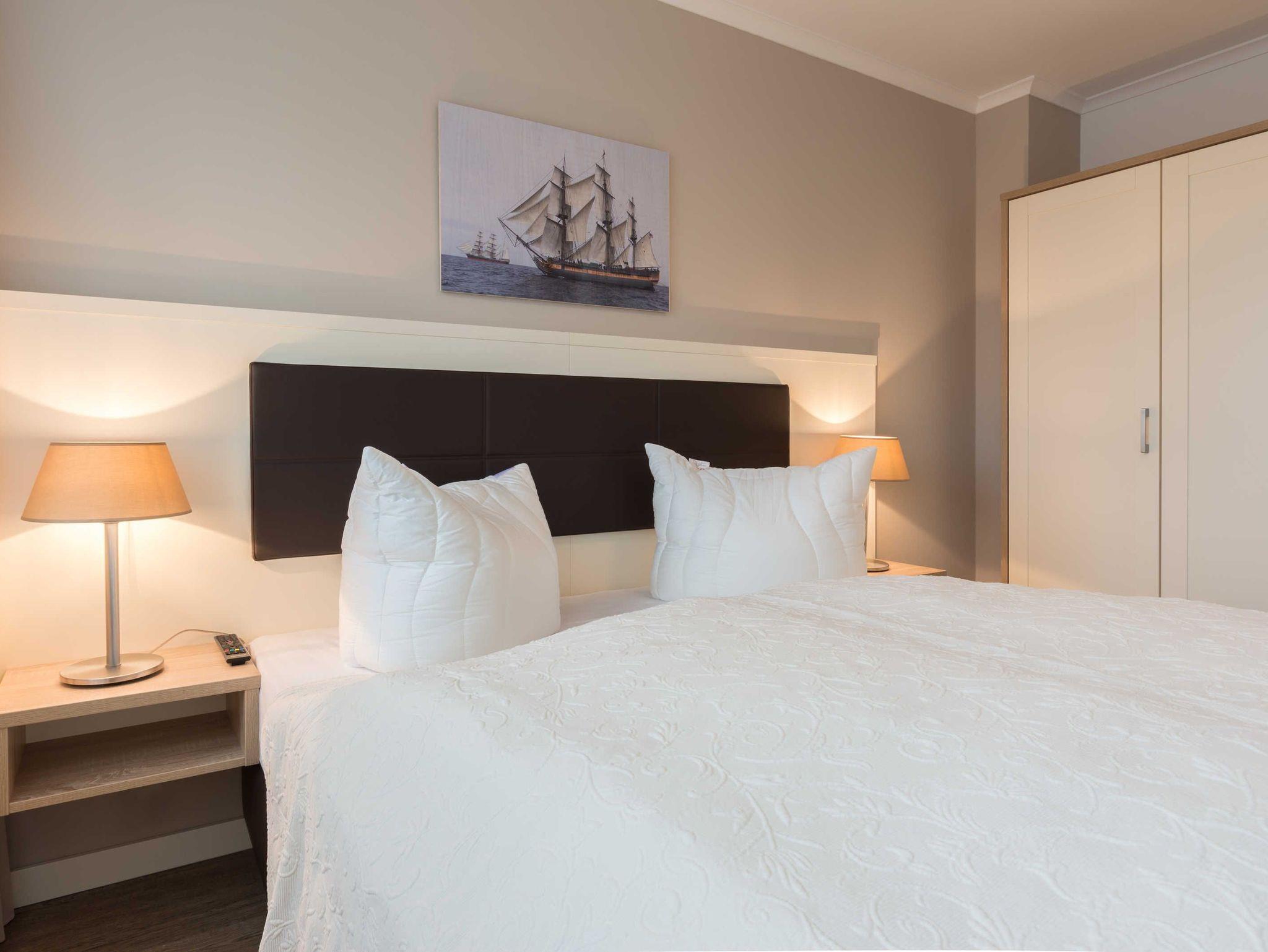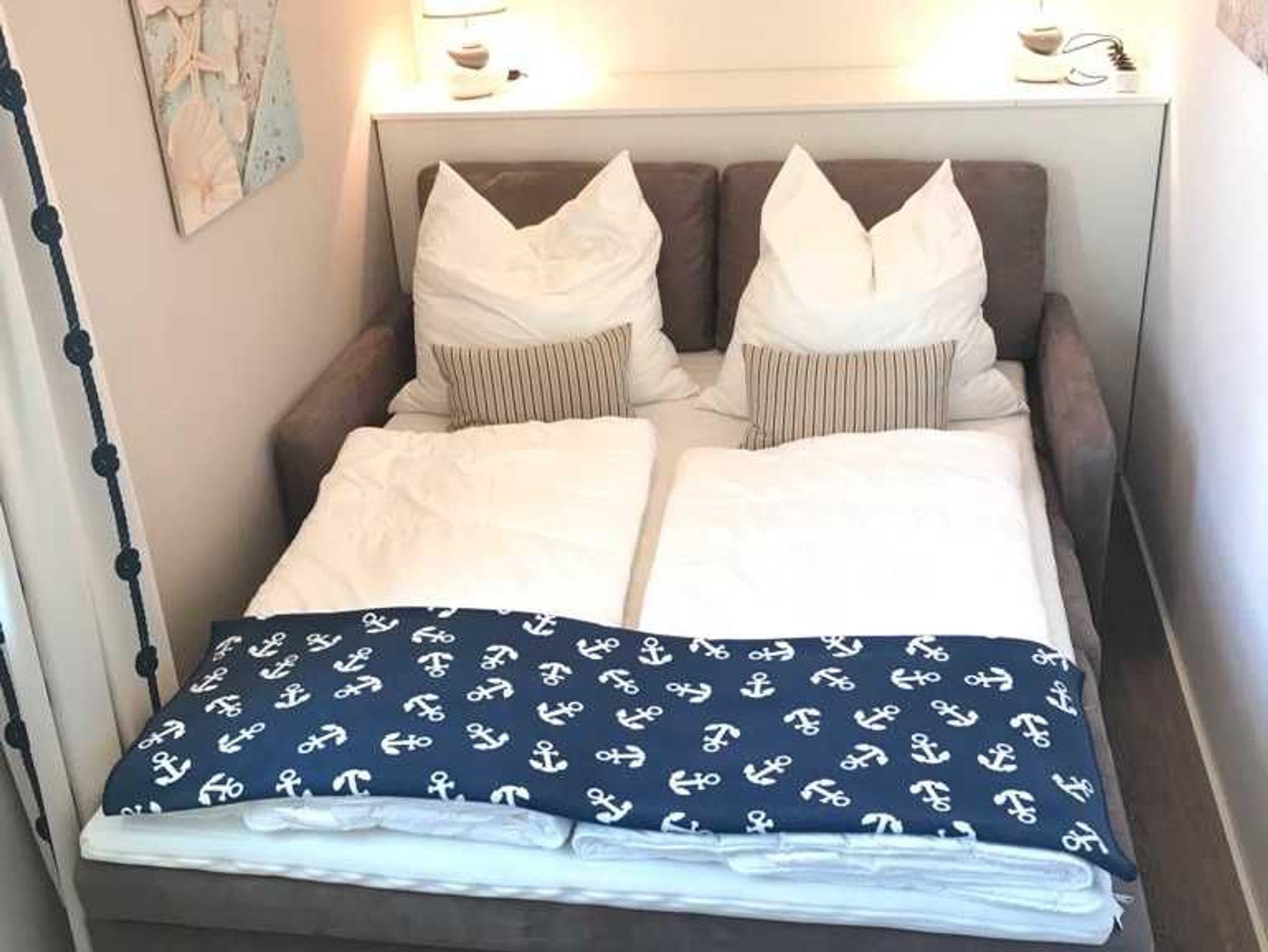 Im hellen und geschmackvoll eingerichteten Wohnzimmer laden eine gemütliche Couch mit passendem Sessel sowie ein großer Esstisch, der vier Personen bequem Platz bietet, zum Verweilen ein. Die Couch ist ausziehbar und kann so als zusätzliche Schlafmöglichkeit (1,50 m x 2,00 m) genutzt werden. Weiterhin gehören ein LED-TV, ein DVD-Player sowie eine kleine Stereo-Anlage zur Ausstattung. Direkt am Wohnzimmer befindet sich ein Balkon in östlicher Richtung. Genießen Sie hier ein gemütliches Frühstück in angenehmer Morgensonne. Neben dem Wohnbereich verfügt die Ferienwohnung über zwei separate Schlafräume. Im großen Schlafzimmer finden Sie neben einem weiteren LED-TV zwei komfortable Box-Springbetten (0,90 m x 2,00 m) und einen großen und geräumigen Kleiderschrank. Im zweiten Schlafzimmer befinden sich eine Schlafcouch (1,60 m x 2,00 m) und ein weiterer Kleiderschrank. Die Schlafräume bieten genug Platz für ein Kinderreisebett und können durch entsprechende Vorhänge gut abgedunkelt werden. An Herbst- und Wintertagen sorgt in allen Räumen eine Fußbodenheizung für angenehme Wärme und Gemütlichkeit.
