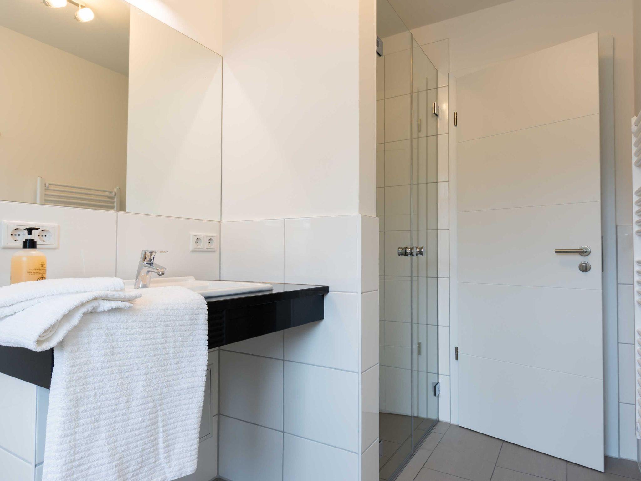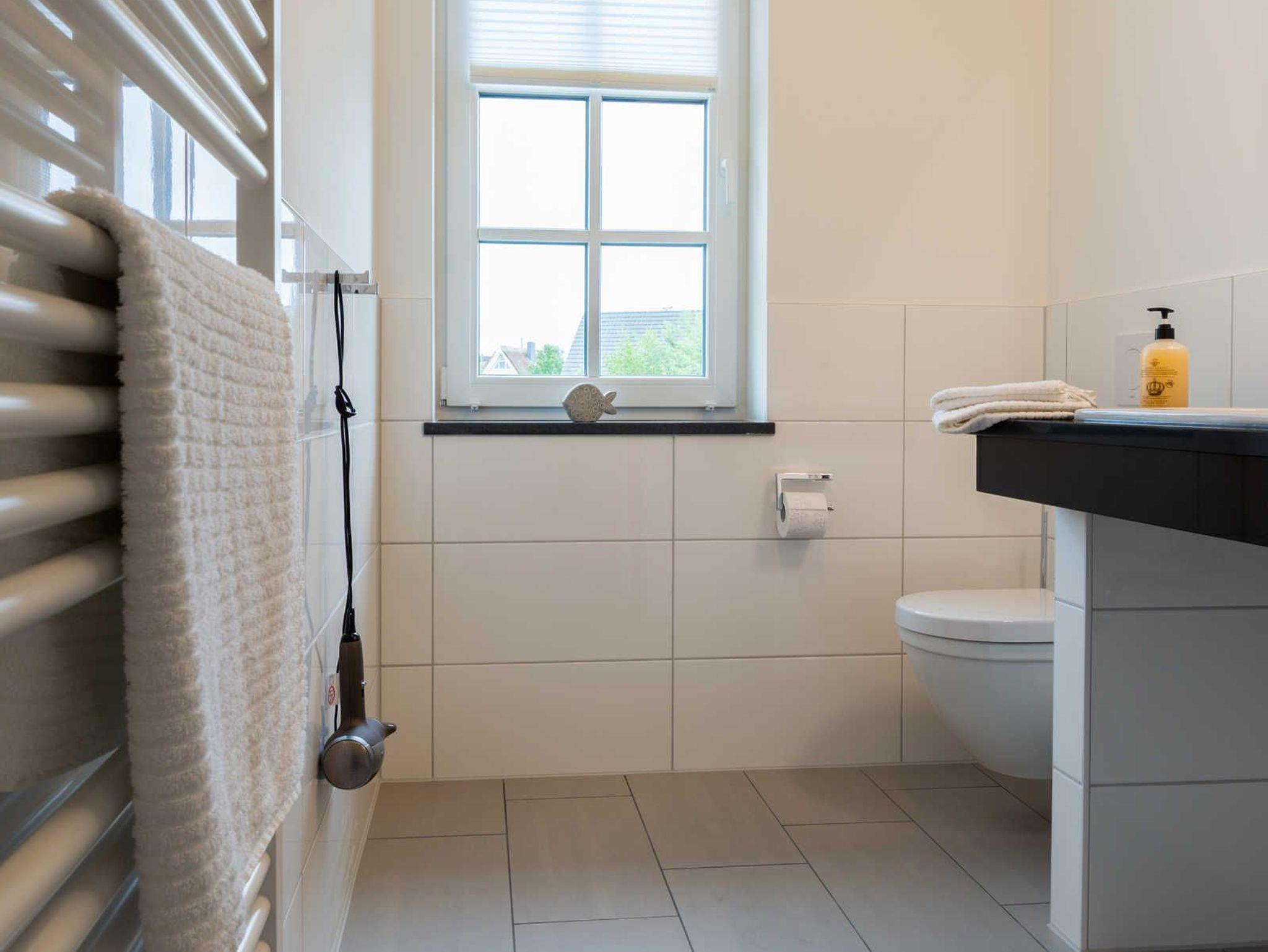 Das helle Badezimmer mit Fenster und bodengleicher Dusche verfügt über einen wandhängenden Badezimmerschrank, einen Waschtisch mit großem Spiegel, einen Kosmetikspiegel, einen Haartrockner und einen elektrisch beheizbaren Handtuchhalter.
