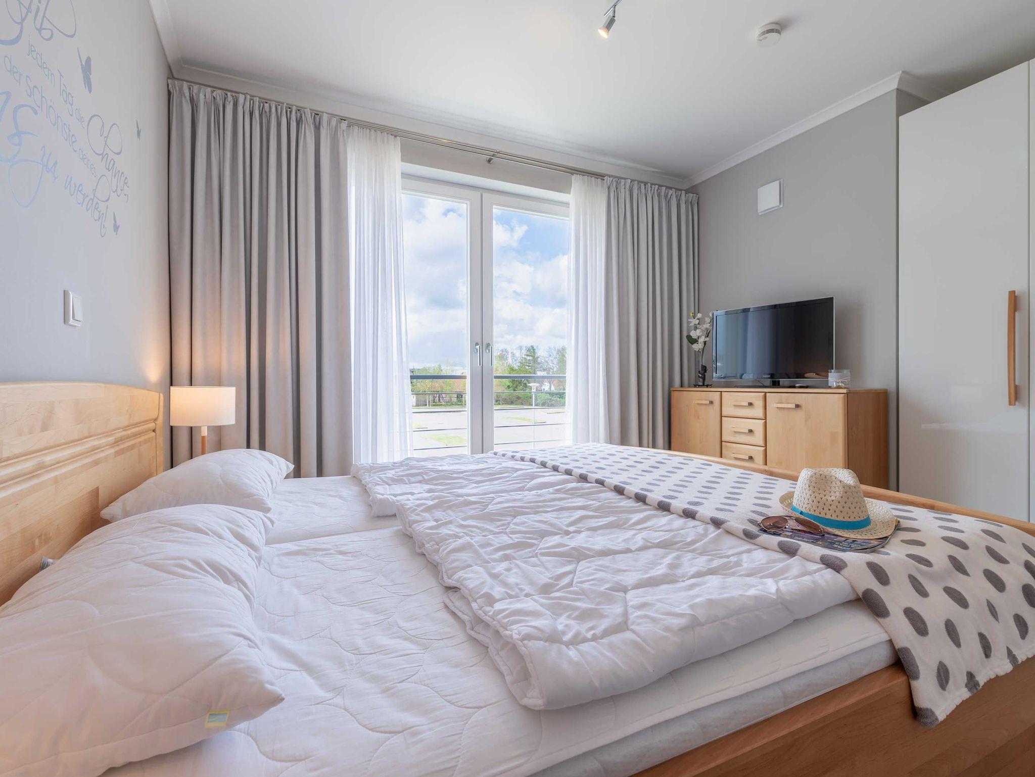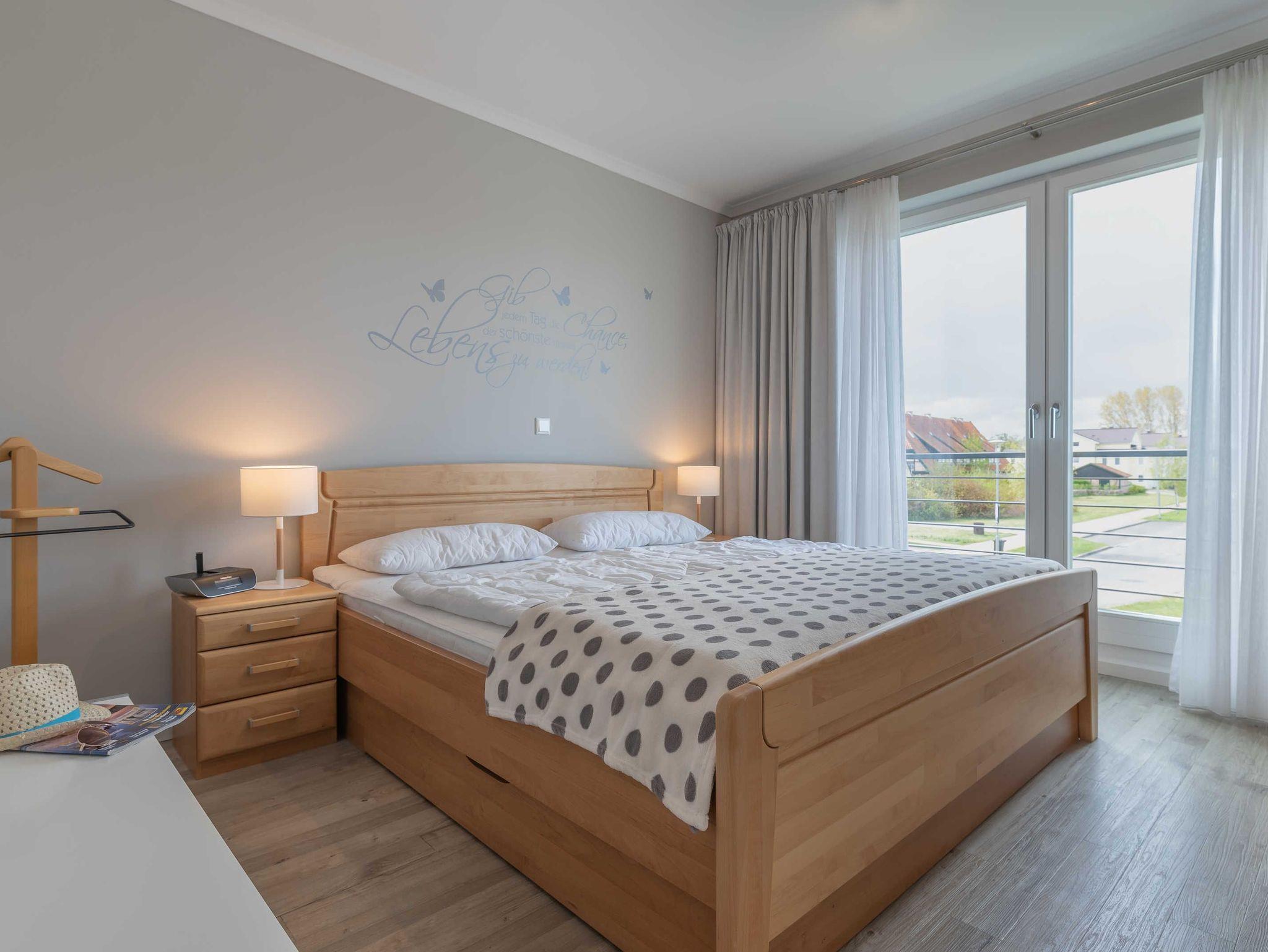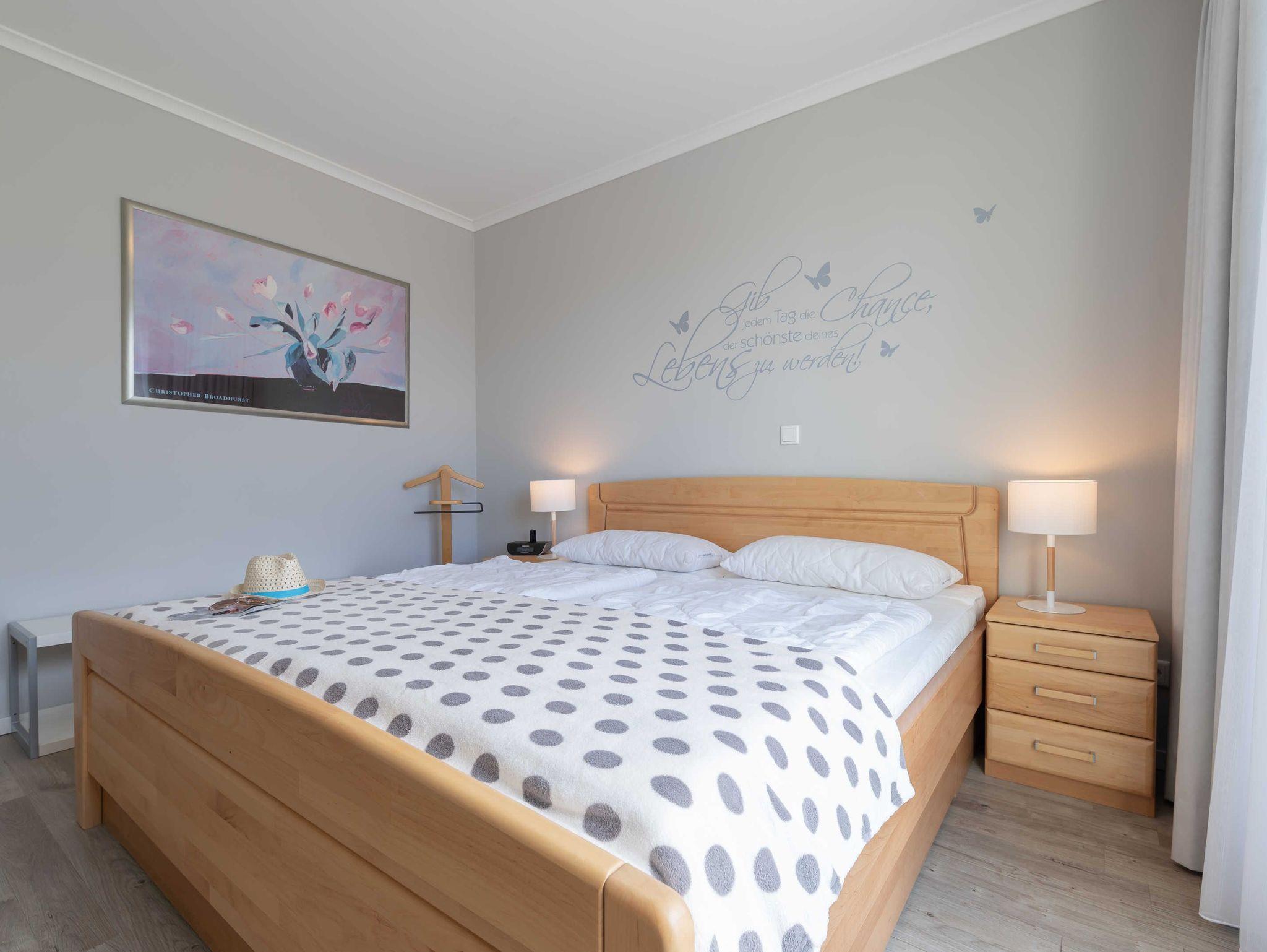 Im hellen freundlichen Schlafzimmer warten ein komfortables Doppelbett und ein großzügiger Schrank auf Sie.