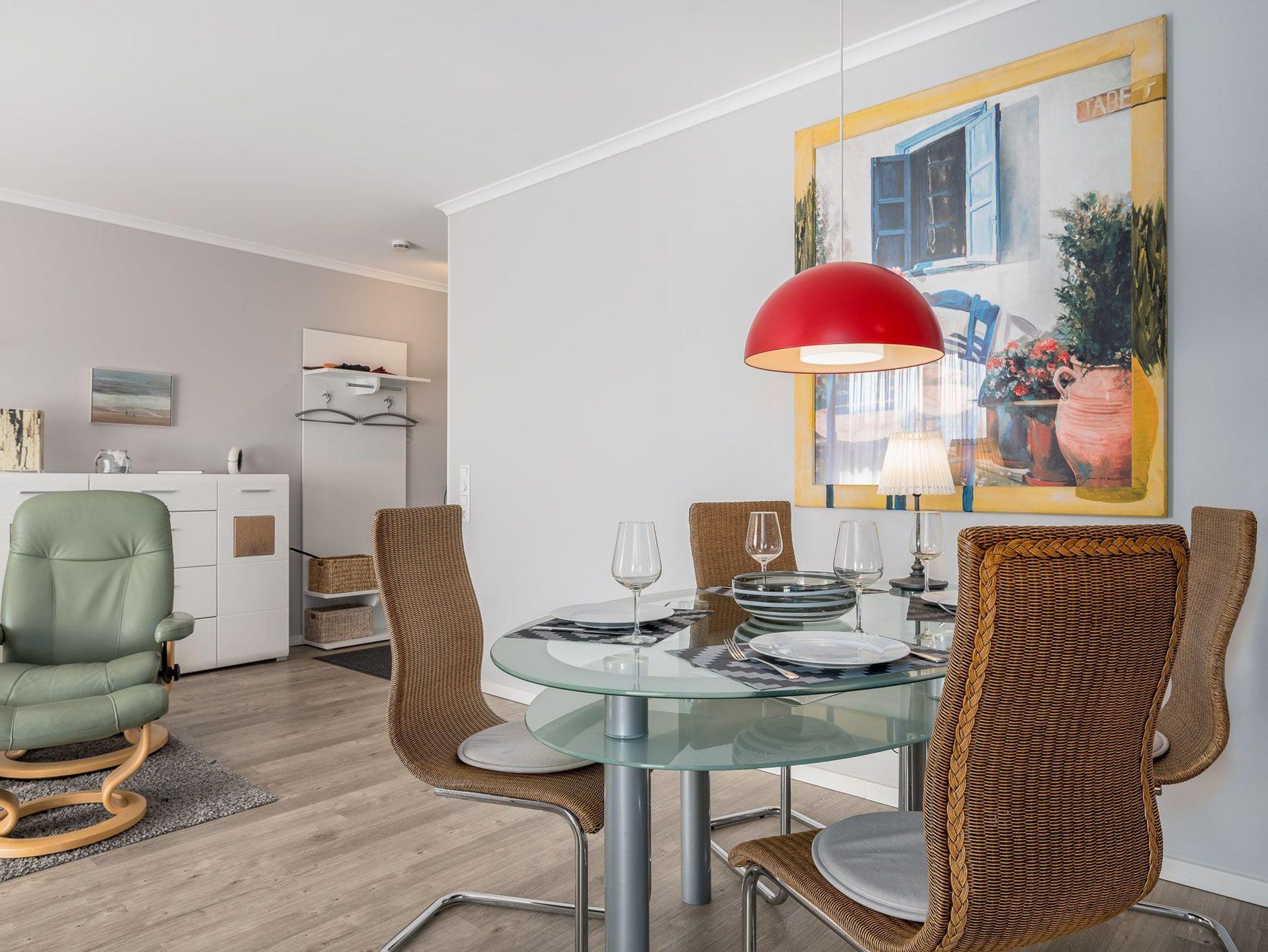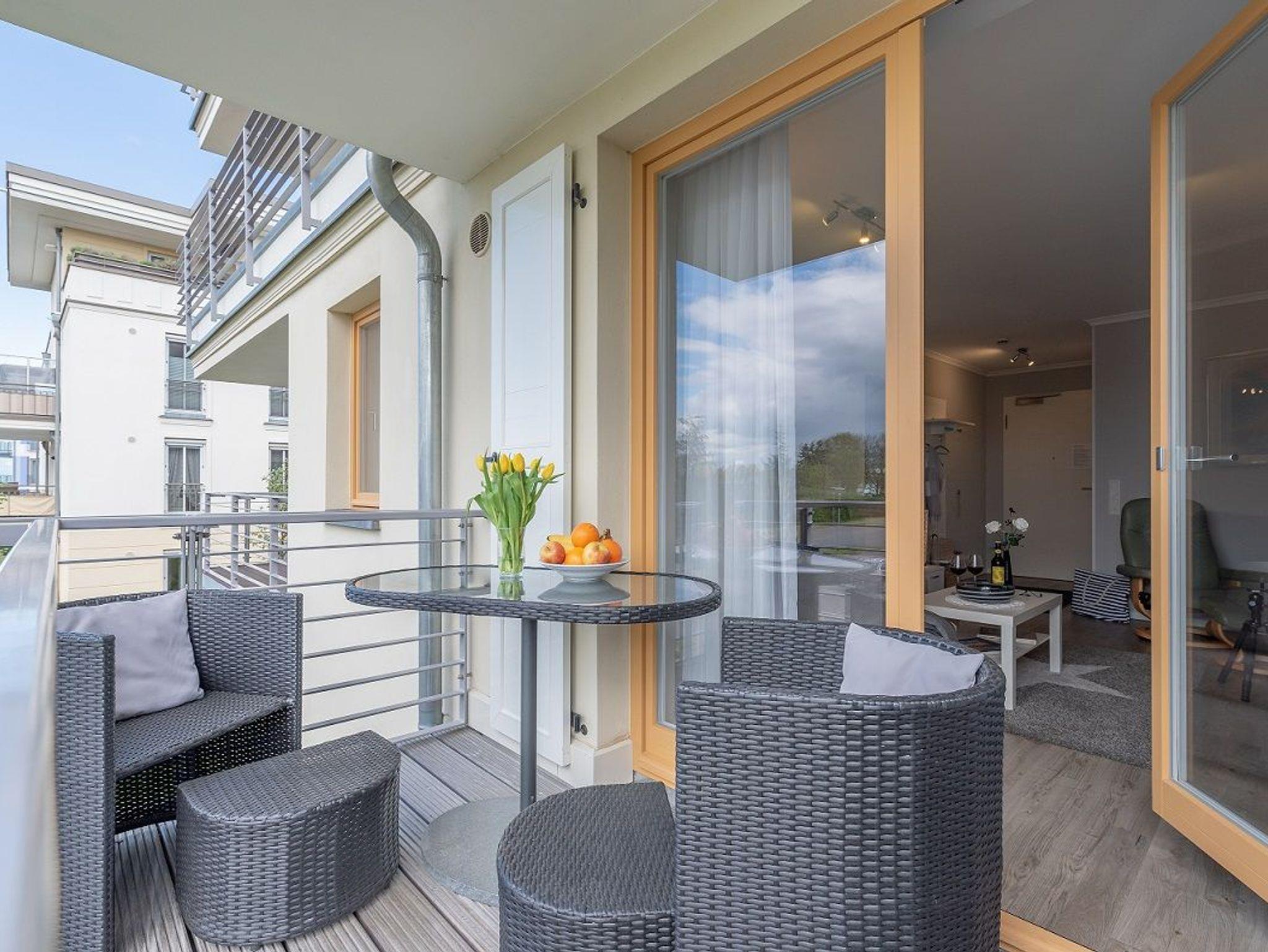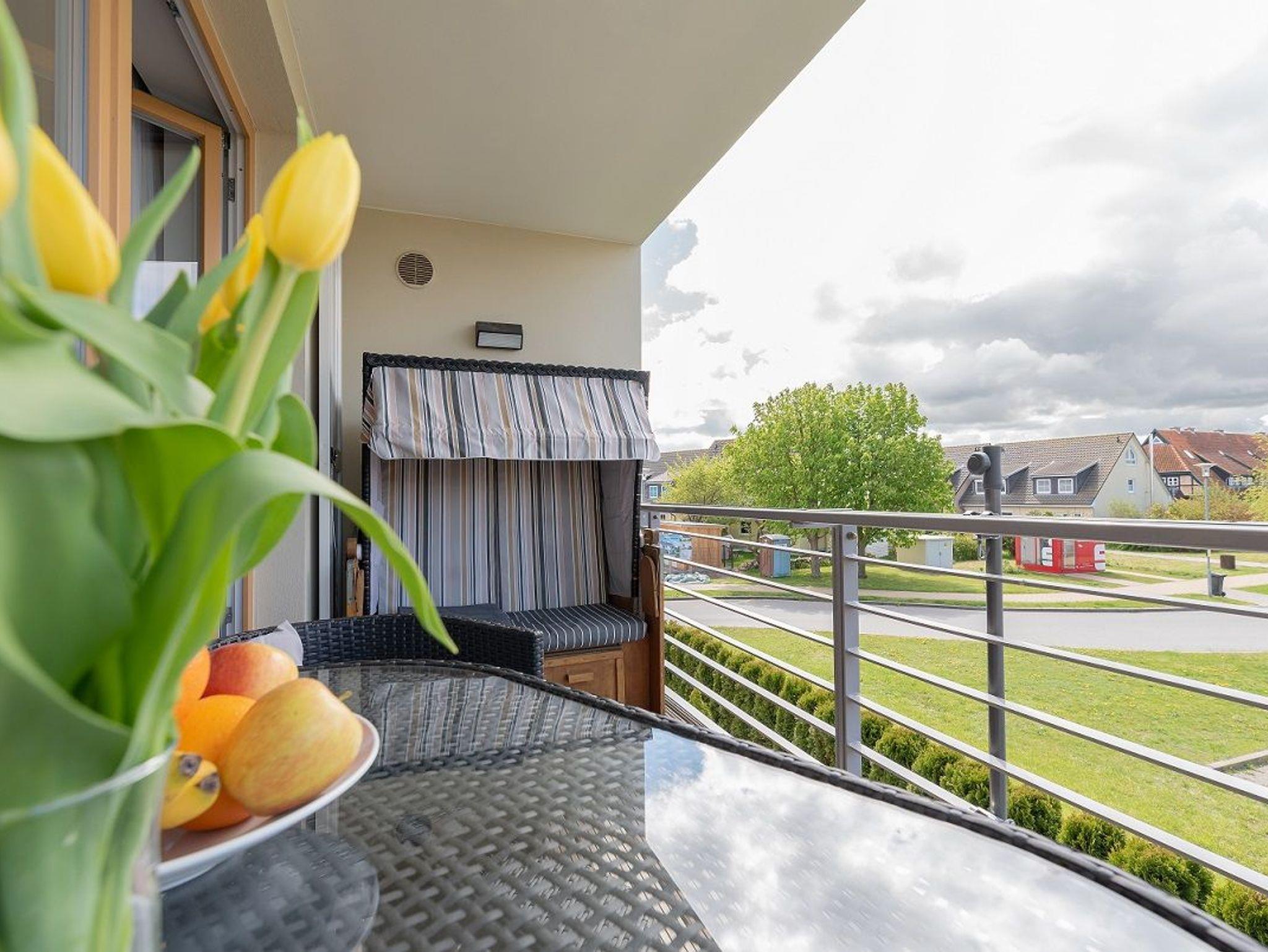 Geschmackvolle Zwei-Zimmer-Wohnung mit Balkon und Strandkorb in Börgerende-Rethwisch, nur wenige Schritte vom Ostseestrand entfernt.