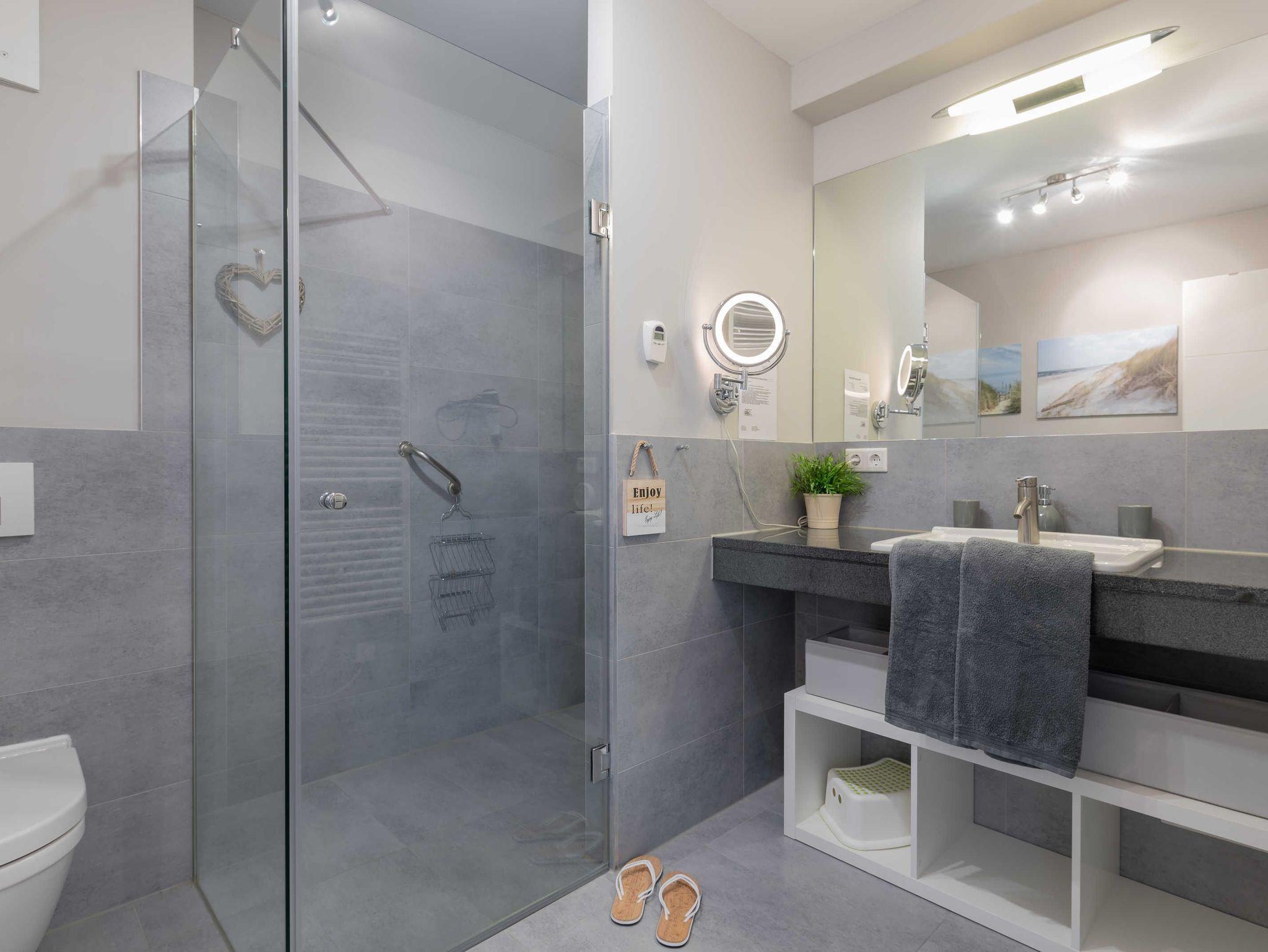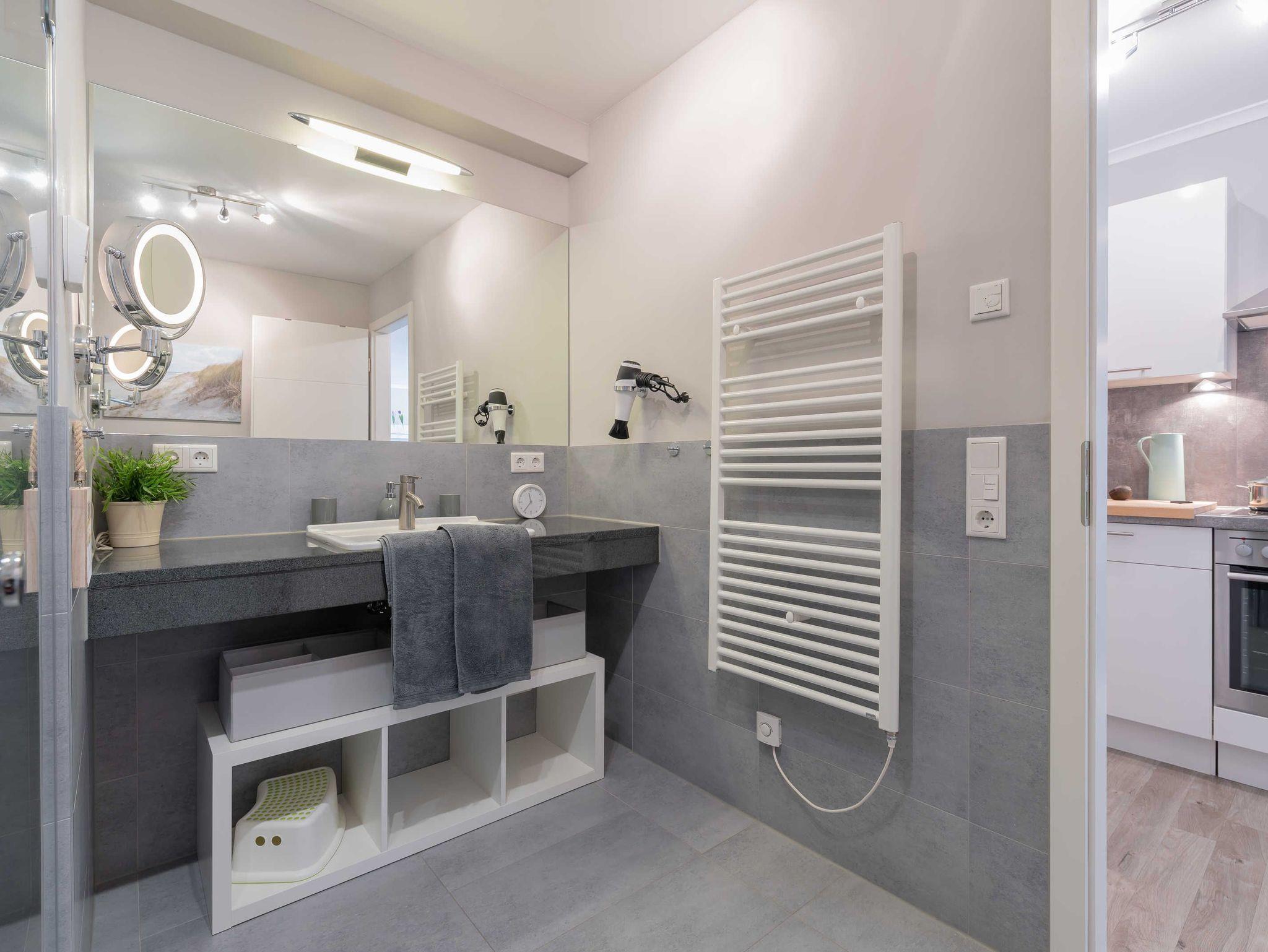 Das Badezimmer verfügt über eine bodengleiche Dusche und einen Handtuchwärmer.
