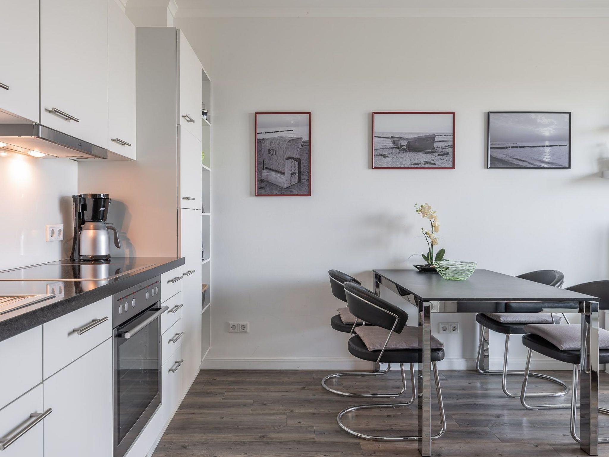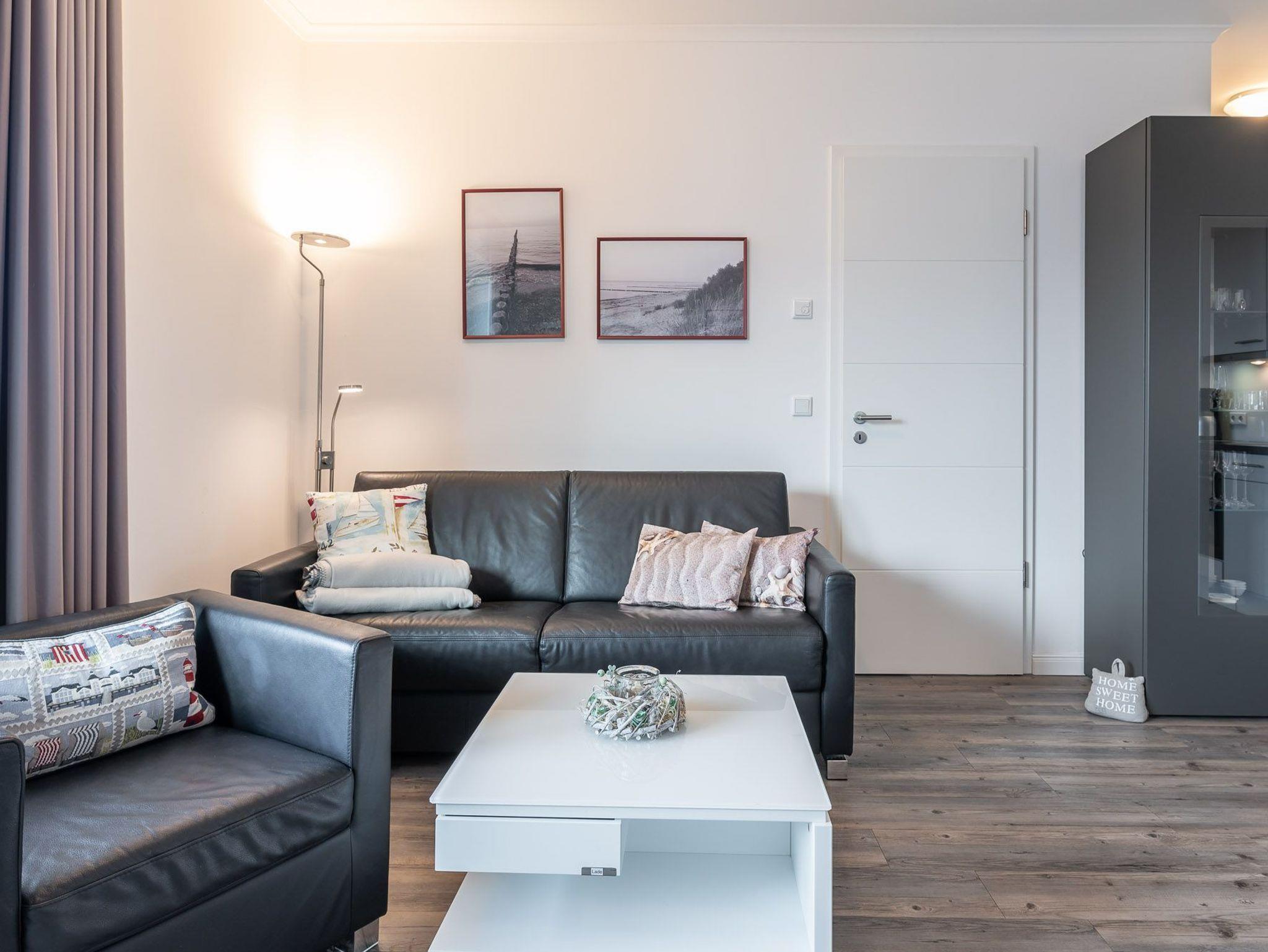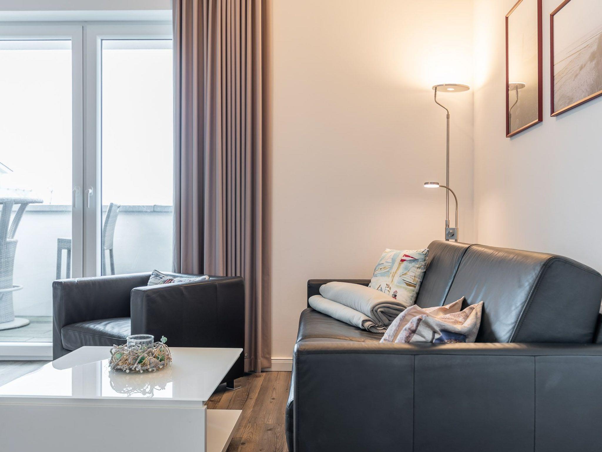 Diese Ferienwohnung ist für max. zwei Erwachsene und zwei Kinder (bis 15 Jahre) eingerichtet und befindet sich im ersten Obergeschoss der Residenz Am Meer. Das Schlafzimmer ist mit einem Doppelbett (durchgehende Matratze / 1,80 m), einer Einbauschrankwand und einem Flatscreen-TV ausgestattet. Vom Wohn- sowie vom Schlafbereich haben Sie Zugang zum Balkon. Verdunkelungsgardinen sind in beiden Zimmern vorhanden. Der schöne Nord-Balkon ist mit einem großen Tisch mit vier Stühlen und einem weiteren kleinen Tisch mit zwei Barhockern ausgestattet. Hier können Sie bei einem kühlen Getränk den Blick zum Meer genießen. Im Wohnraum befinden sich eine bequeme Ledercouch, ein Ledersessel und ein Glastisch. Die Couch kann ausgezogen und als zweites Bett verwendet werden. Zum weiterem Inventar gehören ein Flatscreen-TV mit integriertem Radio, BluRay-Player, ein Sound-System sowie eine kleine DVD- und Büchersammlung. Der offene Koch- und Essbereich verfügt über eine Einbauchküche mit Geschirrspüler, Backofen, Mikrowelle, Cerankochfeld, Kühlschrank mit getrenntem Gefrierfach, Waffeleisen sowie Handrührgerät. Ein ausziehbarer Esstisch mit vier Lederschwingstühlen bietet viel Platz für gemeinsame Mahlzeiten. Das Duschbad ist mit einer bodengleichen Dusche, einem Handtuchwärmer, einem breiten Waschtisch mit Spiegel und einem Fön ausgestattet. Zusätzlich gehört zu der Wohnung noch ein kleiner Abstellraum. Eine Waschmaschine und ein Trockner stehen im separaten Hauswirtschaftsraum im Erdgeschoss des Objekts zur Verfügung (gegen Gebühr / 1,00 € Münzen). Auf dem Gelände der Residenz befindet sich zudem ein kostenfreier Stellplatz für Ihren PKW und Fahrradständer.