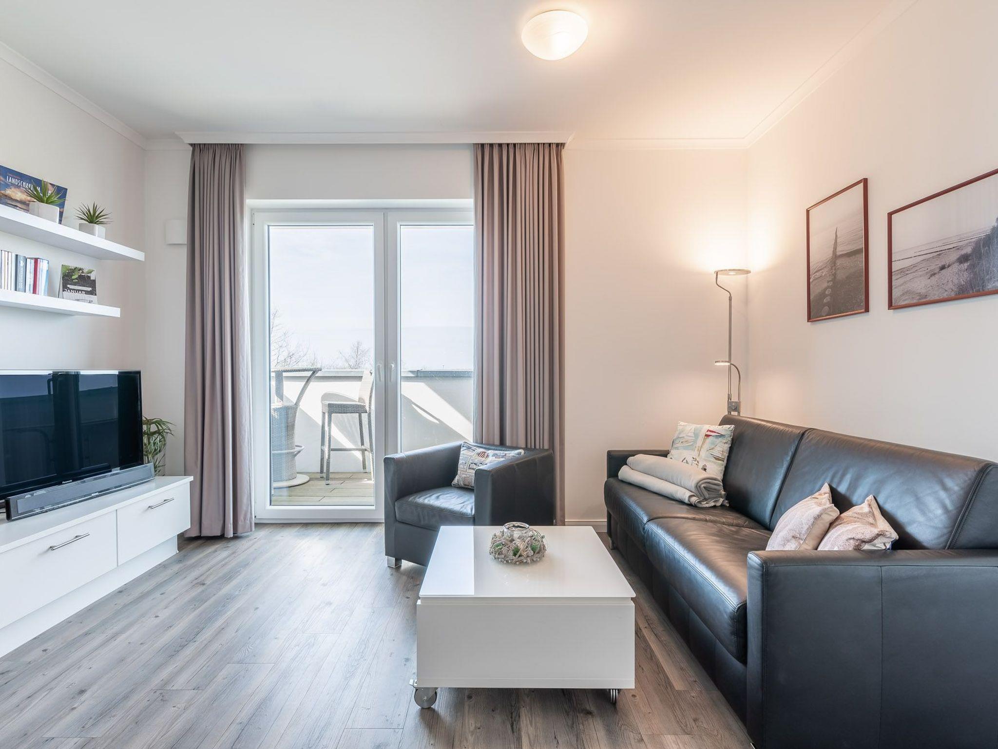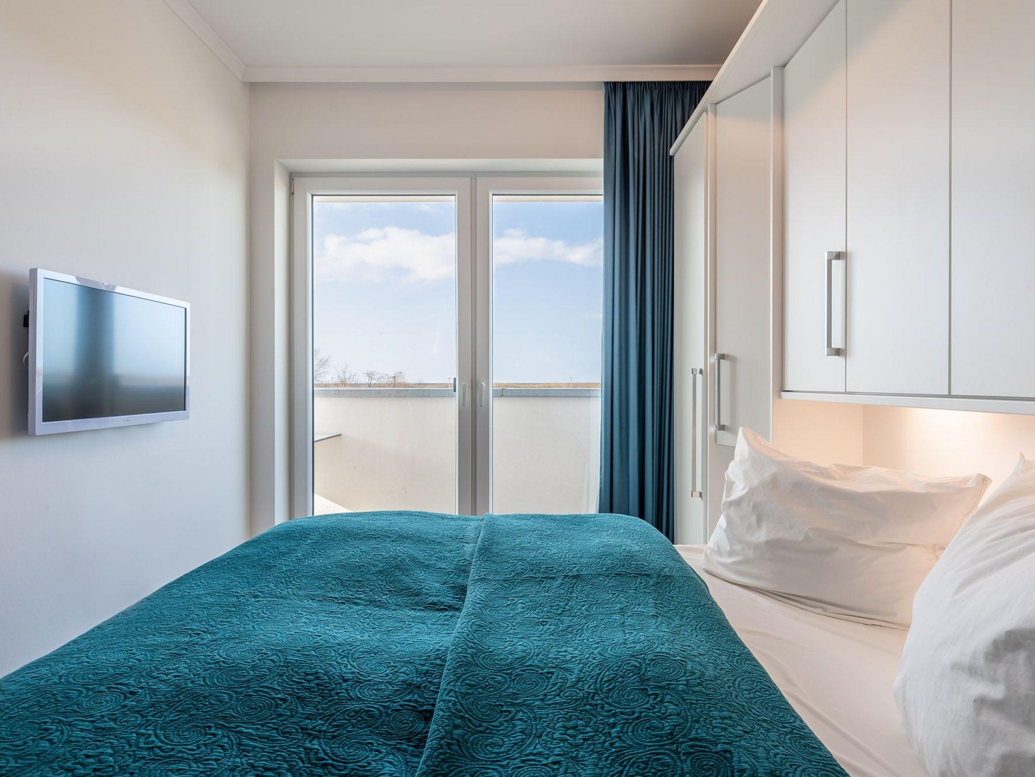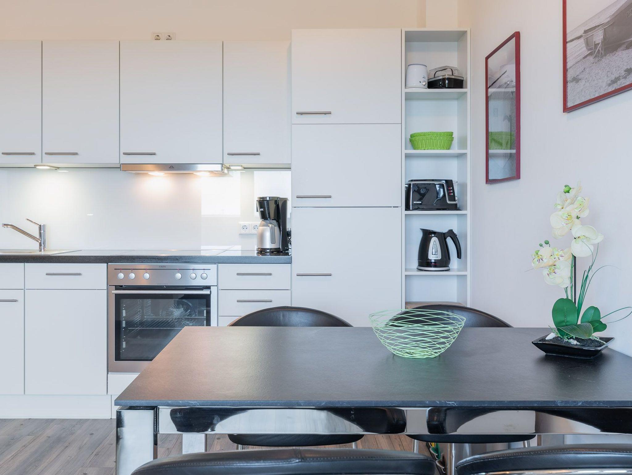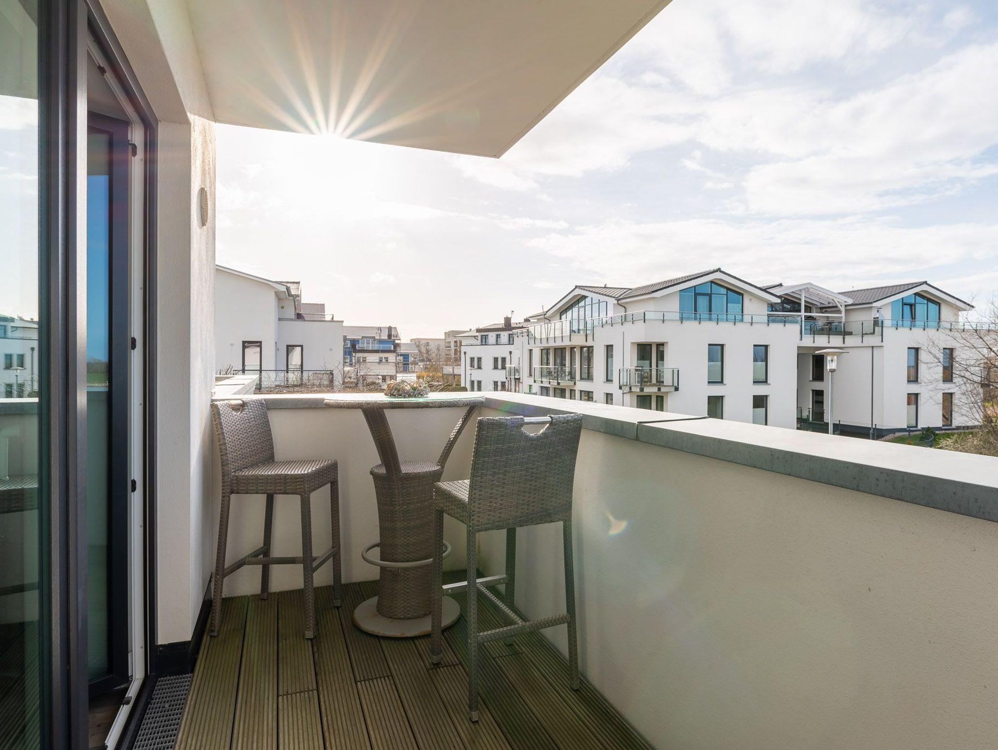 Diese Ferienwohnung ist für max. zwei Erwachsene und zwei Kinder (bis 15 Jahre) eingerichtet und befindet sich im ersten Obergeschoss der Residenz Am Meer. Das Schlafzimmer ist mit einem Doppelbett (durchgehende Matratze / 1,80 m), einer Einbauschrankwand und einem Flatscreen-TV ausgestattet. Vom Wohn- sowie vom Schlafbereich haben Sie Zugang zum Balkon. Verdunkelungsgardinen sind in beiden Zimmern vorhanden. Der schöne Nord-Balkon ist mit einem großen Tisch mit vier Stühlen und einem weiteren kleinen Tisch mit zwei Barhockern ausgestattet. Hier können Sie bei einem kühlen Getränk den Blick zum Meer genießen. Im Wohnraum befinden sich eine bequeme Ledercouch, ein Ledersessel und ein Glastisch. Die Couch kann ausgezogen und als zweites Bett verwendet werden. Zum weiterem Inventar gehören ein Flatscreen-TV mit integriertem Radio, BluRay-Player, ein Sound-System sowie eine kleine DVD- und Büchersammlung. Der offene Koch- und Essbereich verfügt über eine Einbauchküche mit Geschirrspüler, Backofen, Mikrowelle, Cerankochfeld, Kühlschrank mit getrenntem Gefrierfach, Waffeleisen sowie Handrührgerät. Ein ausziehbarer Esstisch mit vier Lederschwingstühlen bietet viel Platz für gemeinsame Mahlzeiten. Das Duschbad ist mit einer bodengleichen Dusche, einem Handtuchwärmer, einem breiten Waschtisch mit Spiegel und einem Fön ausgestattet. Zusätzlich gehört zu der Wohnung noch ein kleiner Abstellraum. Eine Waschmaschine und ein Trockner stehen im separaten Hauswirtschaftsraum im Erdgeschoss des Objekts zur Verfügung (gegen Gebühr / 1,00 € Münzen). Auf dem Gelände der Residenz befindet sich zudem ein kostenfreier Stellplatz für Ihren PKW und Fahrradständer.