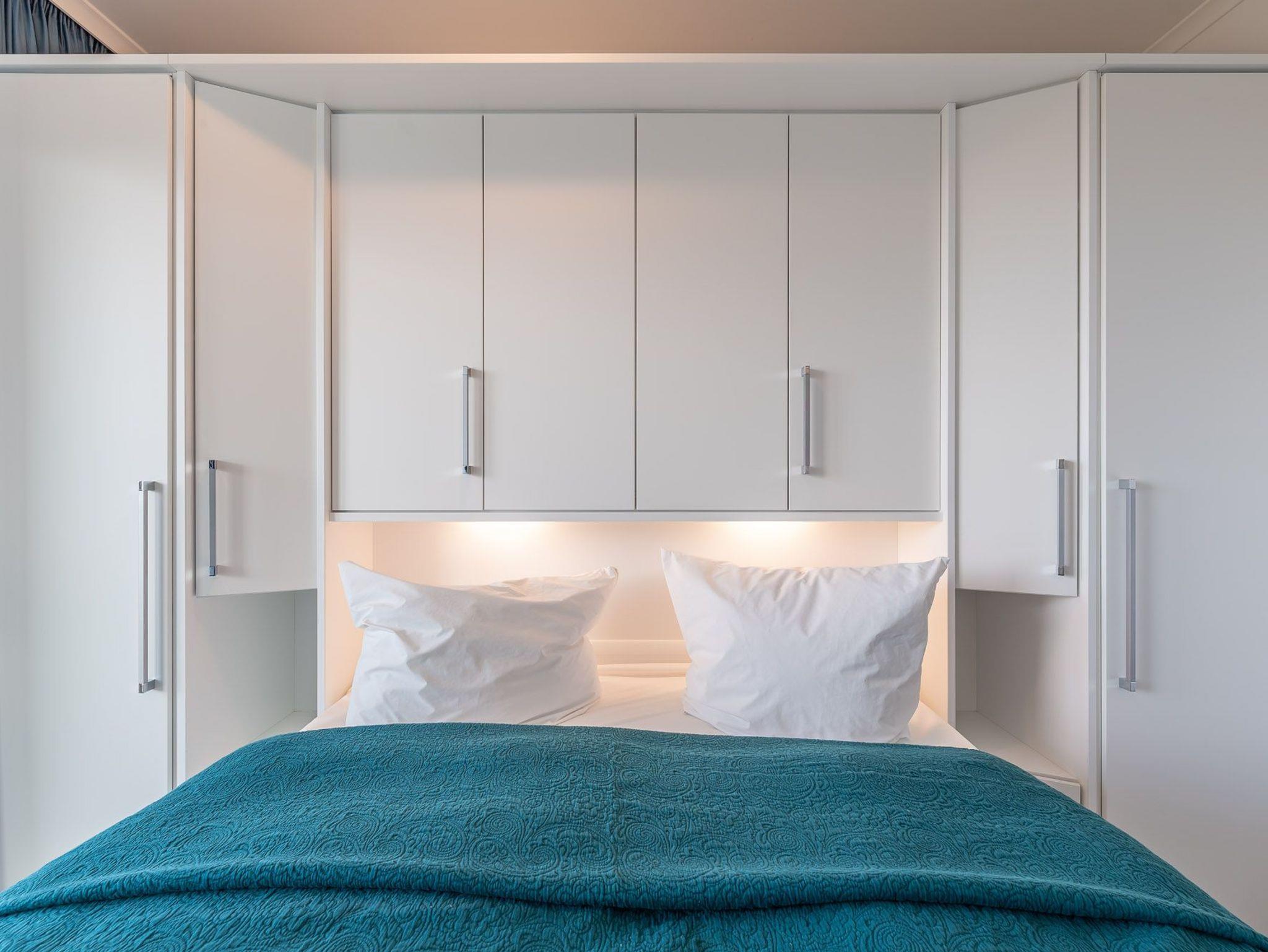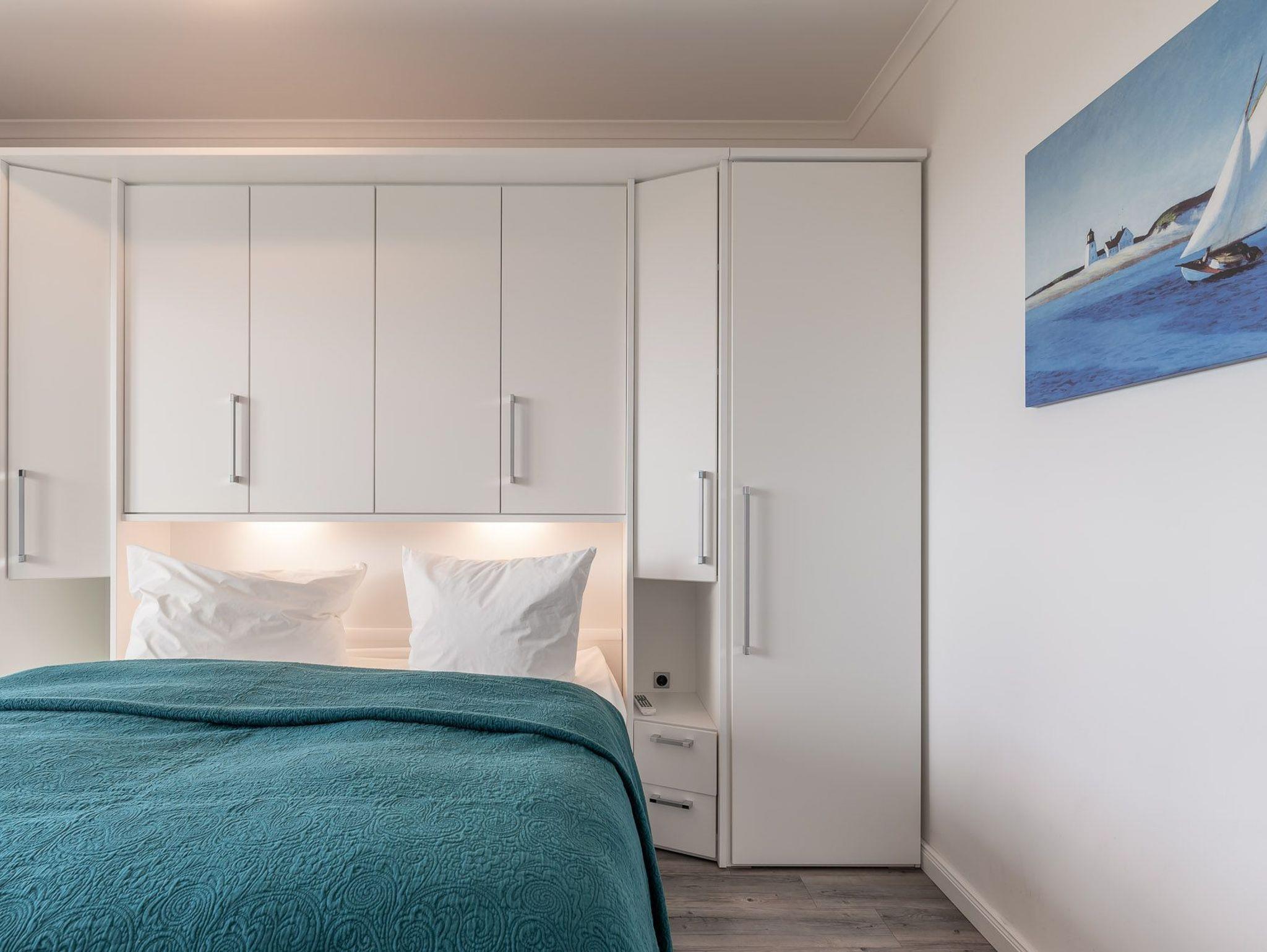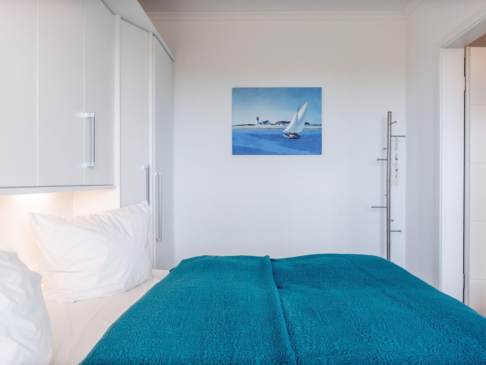 Diese Ferienwohnung ist für max. zwei Erwachsene und zwei Kinder (bis 15 Jahre) eingerichtet und befindet sich im ersten Obergeschoss der Residenz Am Meer. Das Schlafzimmer ist mit einem Doppelbett (durchgehende Matratze / 1,80 m), einer Einbauschrankwand und einem Flatscreen-TV ausgestattet. Vom Wohn- sowie vom Schlafbereich haben Sie Zugang zum Balkon. Verdunkelungsgardinen sind in beiden Zimmern vorhanden. Der schöne Nord-Balkon ist mit einem großen Tisch mit vier Stühlen und einem weiteren kleinen Tisch mit zwei Barhockern ausgestattet. Hier können Sie bei einem kühlen Getränk den Blick zum Meer genießen. Im Wohnraum befinden sich eine bequeme Ledercouch, ein Ledersessel und ein Glastisch. Die Couch kann ausgezogen und als zweites Bett verwendet werden. Zum weiterem Inventar gehören ein Flatscreen-TV mit integriertem Radio, BluRay-Player, ein Sound-System sowie eine kleine DVD- und Büchersammlung. Der offene Koch- und Essbereich verfügt über eine Einbauchküche mit Geschirrspüler, Backofen, Mikrowelle, Cerankochfeld, Kühlschrank mit getrenntem Gefrierfach, Waffeleisen sowie Handrührgerät. Ein ausziehbarer Esstisch mit vier Lederschwingstühlen bietet viel Platz für gemeinsame Mahlzeiten. Das Duschbad ist mit einer bodengleichen Dusche, einem Handtuchwärmer, einem breiten Waschtisch mit Spiegel und einem Fön ausgestattet. Zusätzlich gehört zu der Wohnung noch ein kleiner Abstellraum. Eine Waschmaschine und ein Trockner stehen im separaten Hauswirtschaftsraum im Erdgeschoss des Objekts zur Verfügung (gegen Gebühr / 1,00 Euro Münzen). Auf dem Gelände der Residenz befindet sich zudem ein kostenfreier Stellplatz für Ihren PKW und Fahrradständer.