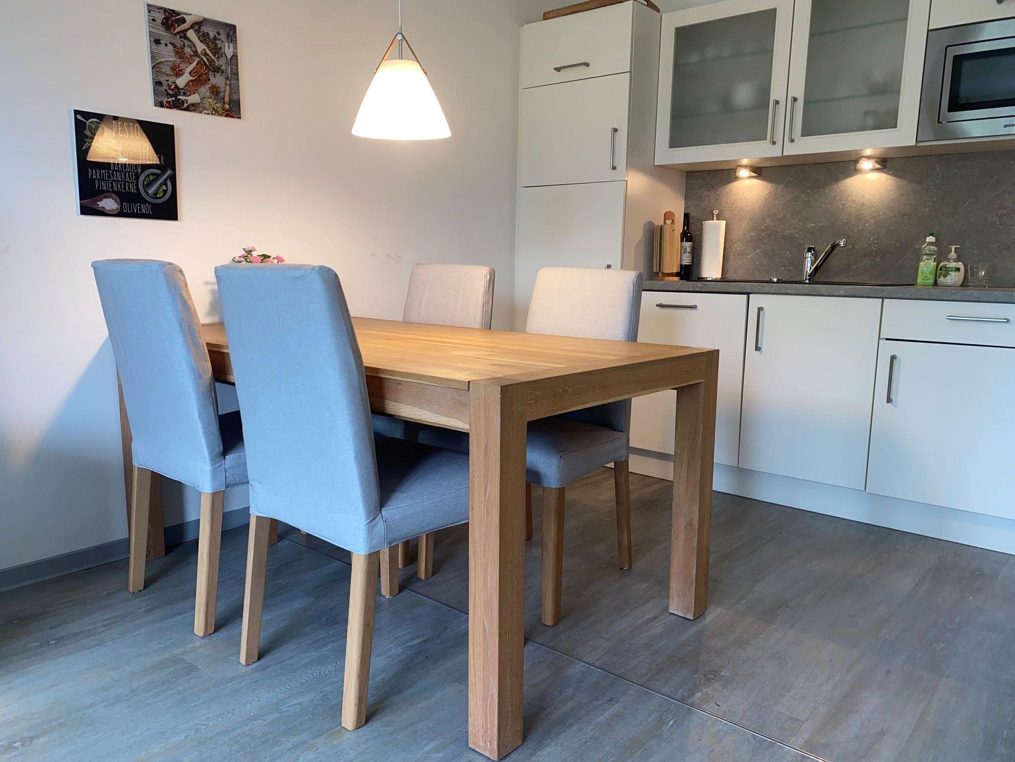 Die hochwertige Einbauküche verfügt neben einem Herd mit Ceranfeld und Backofen, einen Kühlschrank mit Gefrierfach, einen Geschirrspüler, eine Mikrowelle, eine Kaffeemaschine, einen Wasserkocher, einen Eierkocher, einen Mixer und einen Toaster. Im Essbereich befindet sich ein großer Esstisch mit sechs Stühlen. Ein Kinderhochstuhl ist ebenfalls vorhanden. Die Wohnung verfügt über Fußbodenheizung und elektrische Rolläden. Der gemütliche offene Wohnbereich mit großem TV-Flachbildschirm und Bluetooth-Musikanlage (Radio, CD usw.) lädt zum Entspannen und Durchatmen ein. Von hier gelangen Sie auf die nach Süd-Westen ausgerichtete und mit Gartenmöbeln, Sonnenliegen und Sonnenschirm ausgestattete Terrasse mit angrenzendem Gemeinschaftsgarten.