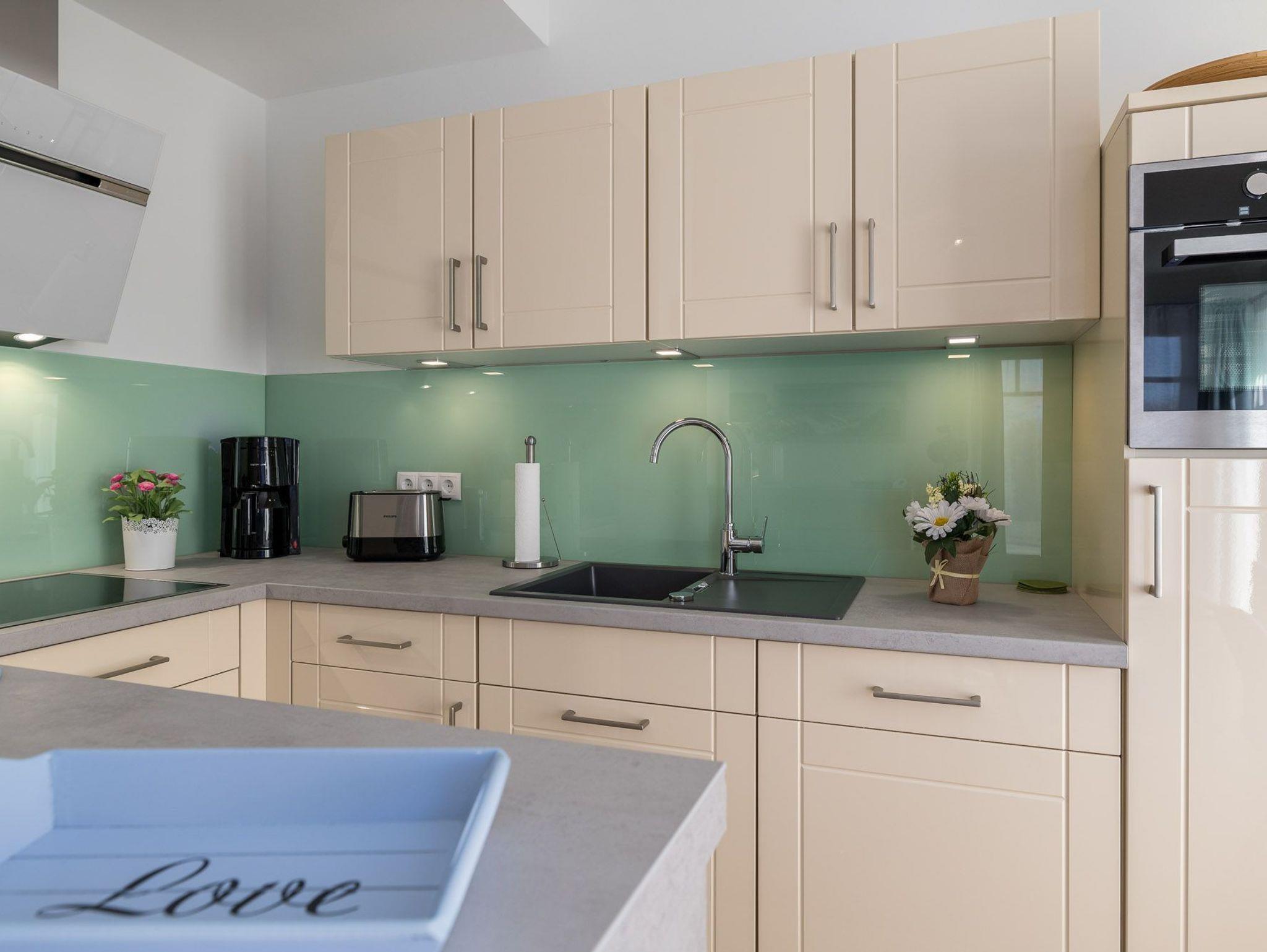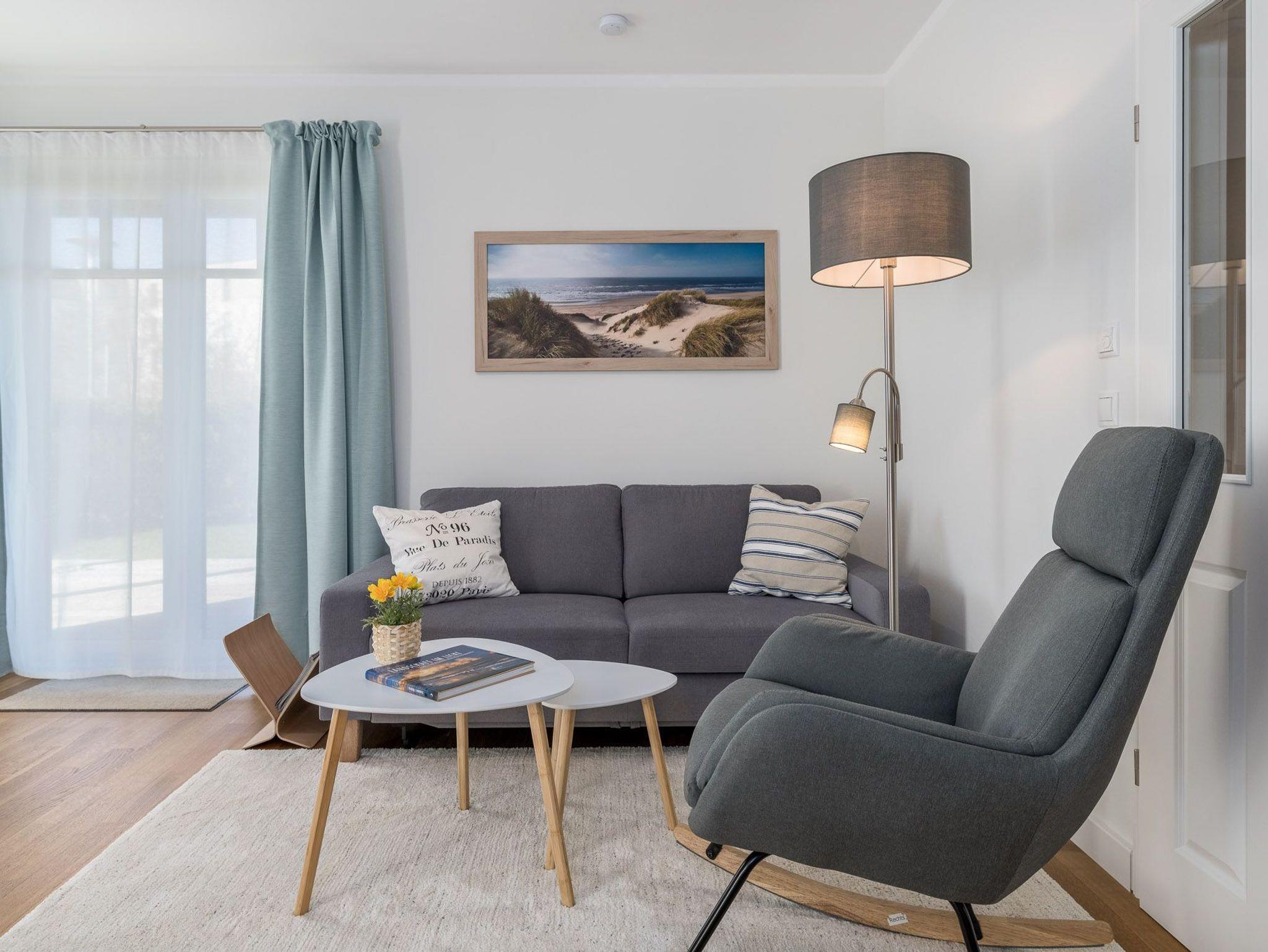 Der offene Wohn- und Essbereich verfügt über eine gemütlichen Sitzecke mit lauschiger Couch und dekorativem Kamin (nicht nutzbar). Ein zusätzlicher Schaukelsessel, ein TV-Flatscreen sowie ein DAB-Radio laden zum Verweilen ein. Leckere gemeinsame Mahlzeiten nehmen Sie gemeinsam am modernen runden Esstisch ein. Die Küche ist komplett mit modernen Geräten ausgestattet: Backofen, Herd, Geschirrspüler, Kühlschrank mit Gefrierfach, Kaffeemaschine, Wasserkocher, Toaster sowie verschiedene Küchenutensilien sind vorhanden. Im Schlafzimmer erwartet Sie ein gemütliches Boxspringbett (180 x 200 cm / durchgehende Matratze). Das moderne Bad verfügt über eine ebenerdige Dusche, einen Waschtisch mit großem Spiegel sowie einen zusätzlichen Kosmetikspiegel.