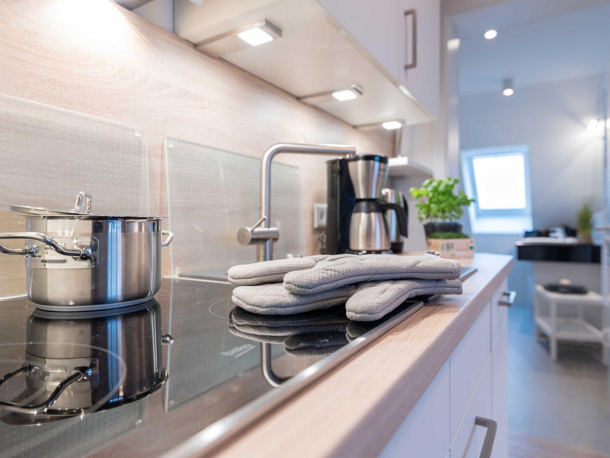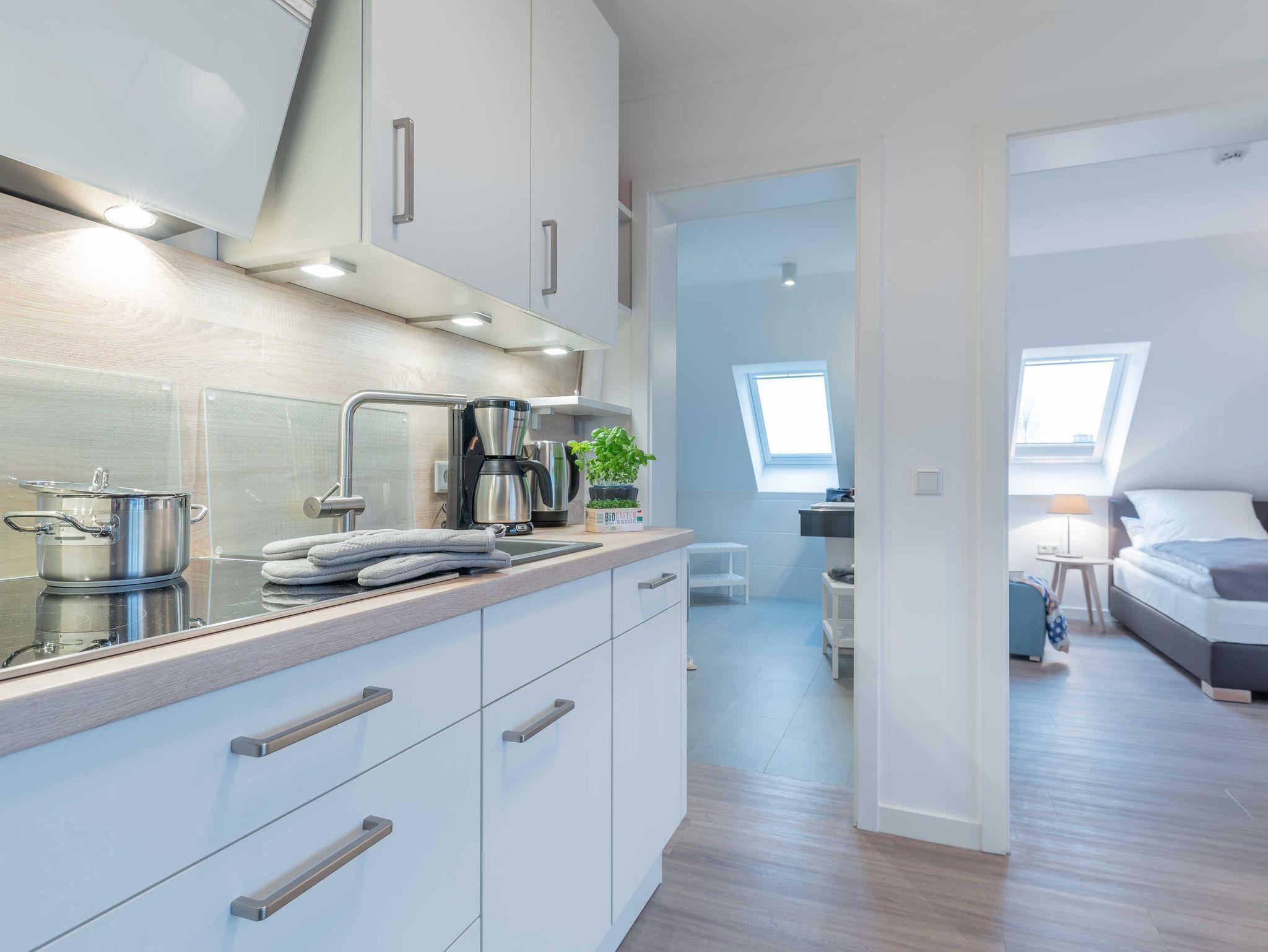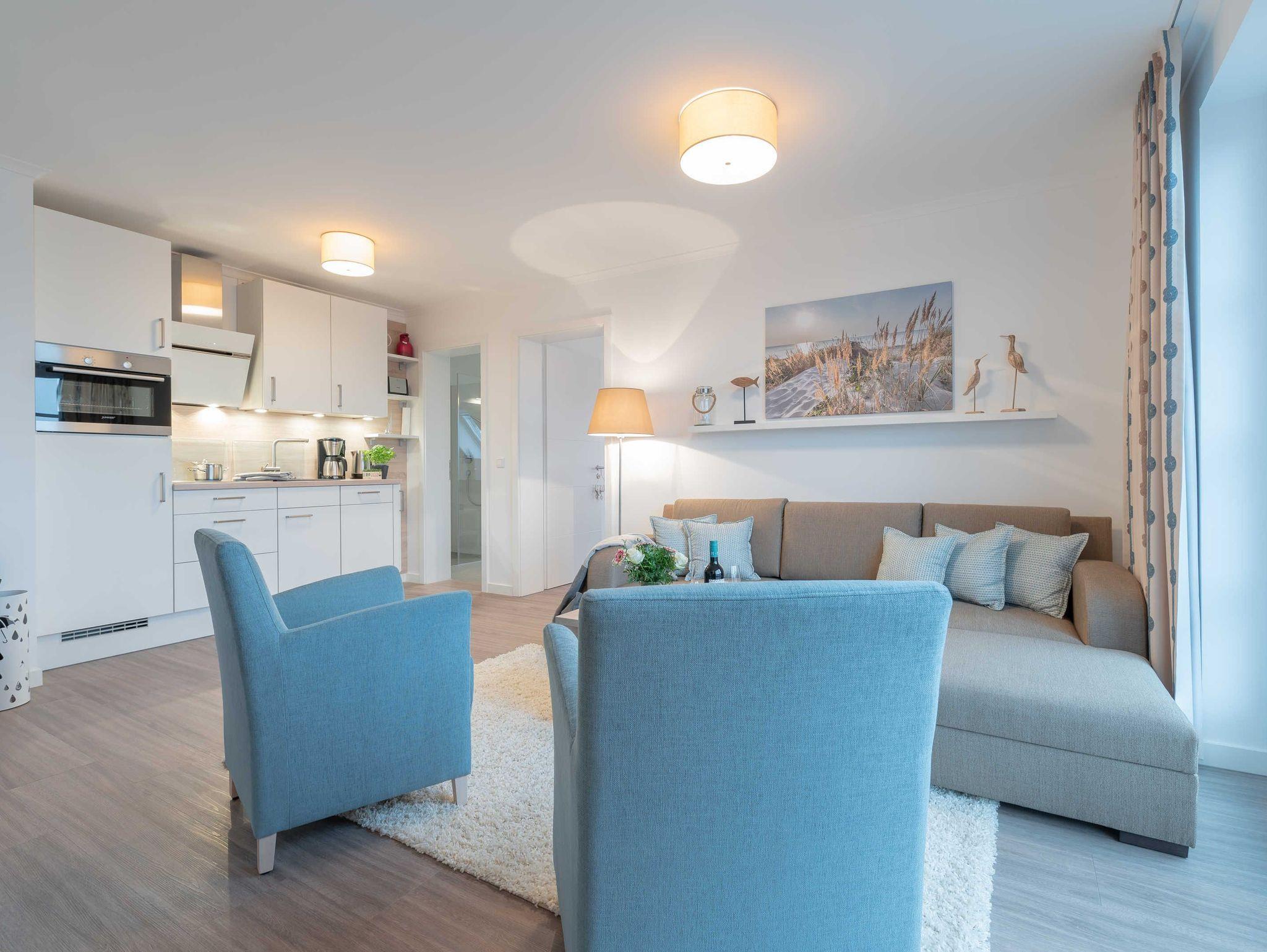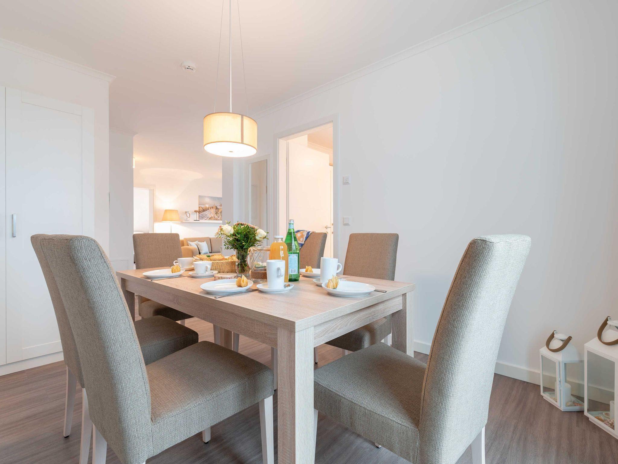 Das helle Wohnzimmer in direkter Süd-West-Ausrichtung besitzt einen gemütlichen Couch- und Fernsehbereich mit einem 55 Zoll-TV, einem DVD-Player und einer Musikanlage inklusive CD-Player und Radio. Die hochwertige Einbauküche verfügt über ein Vier-Feld-Cerankochfeld, einen Backofen, einen Geschirrspüler, einen Kühlschrank mit Tiefkühlfach sowie umfangreiches Zubehör. Im angrenzenden Esszimmer mit direktem Balkonzugang haben Sie die Möglichkeit bei genußvollen Mahlzeiten oder gemütlichen Spieleabenden direkt auf die Ostsee zu blicken.