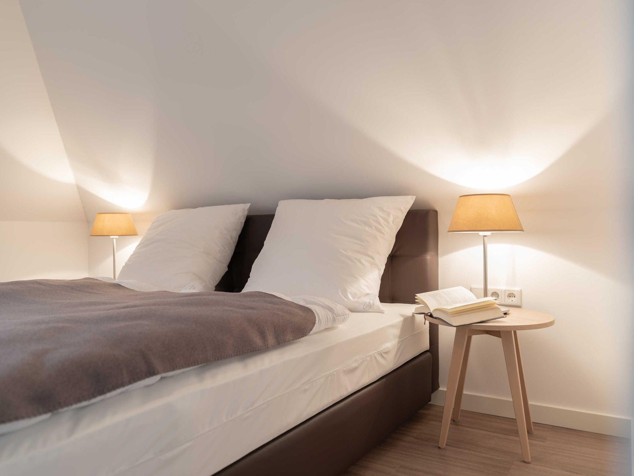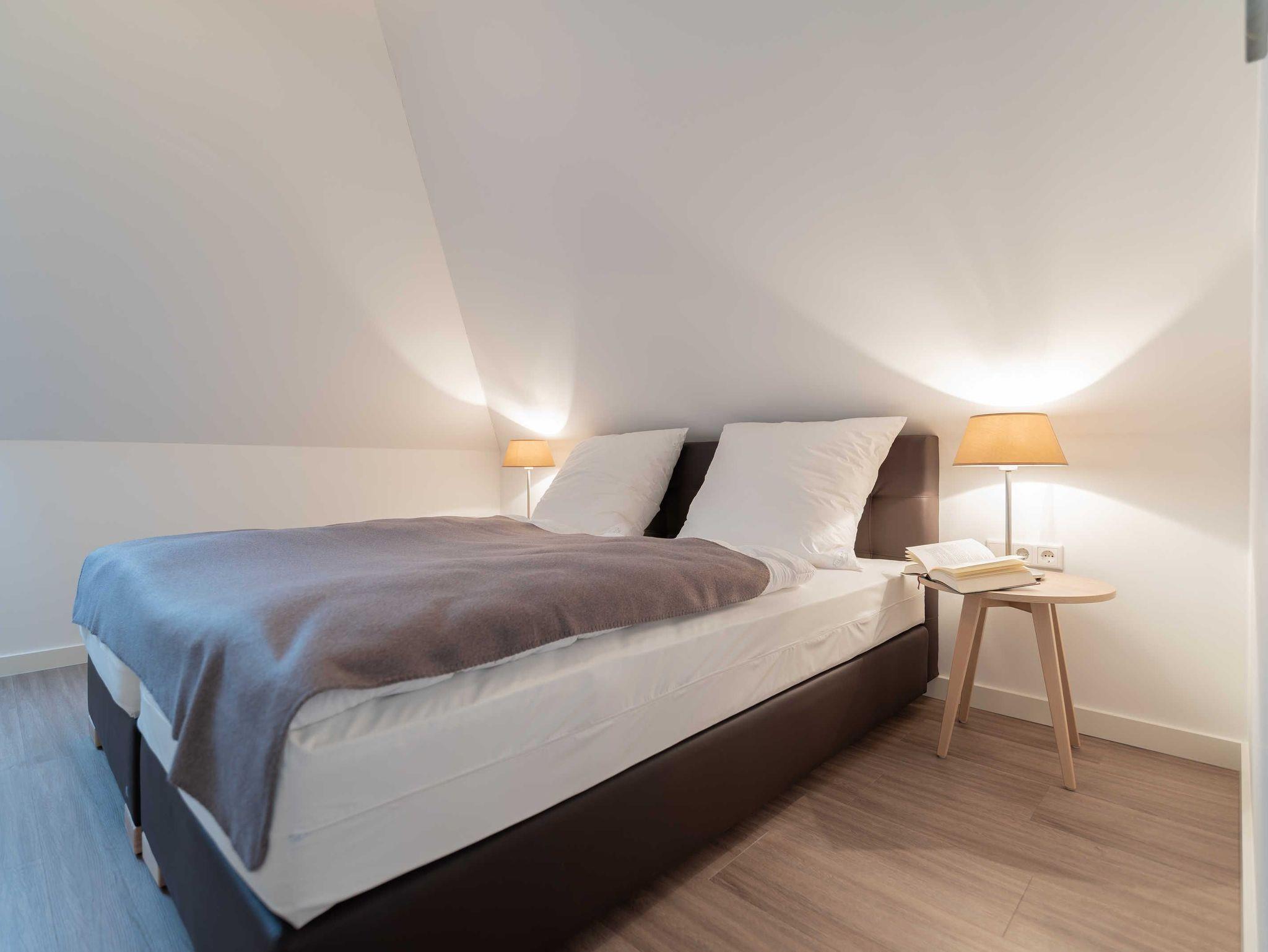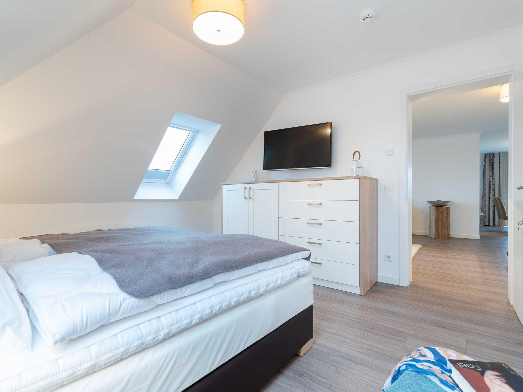 Die beiden Schlafzimmer sind jeweils mit hochwertigen Boxspringbetten als Doppelbetten (Matratzen je 90 x 200 cm) und geräumigen Schrankelementen ausgestattet. Zusätzlich enthält eines der Schlafzimmer einen zusätzlichen 43 Zoll-TV und einen Schranktresor.