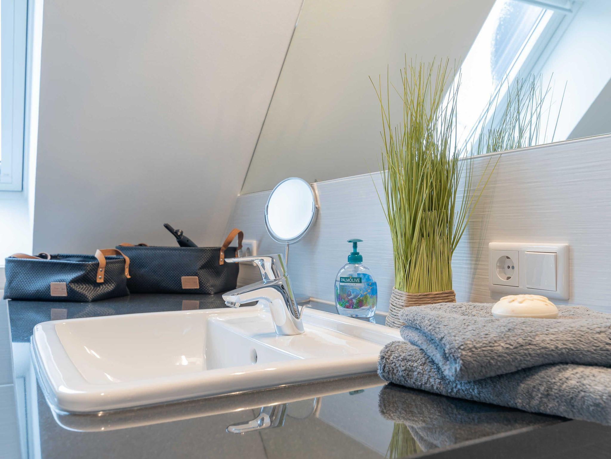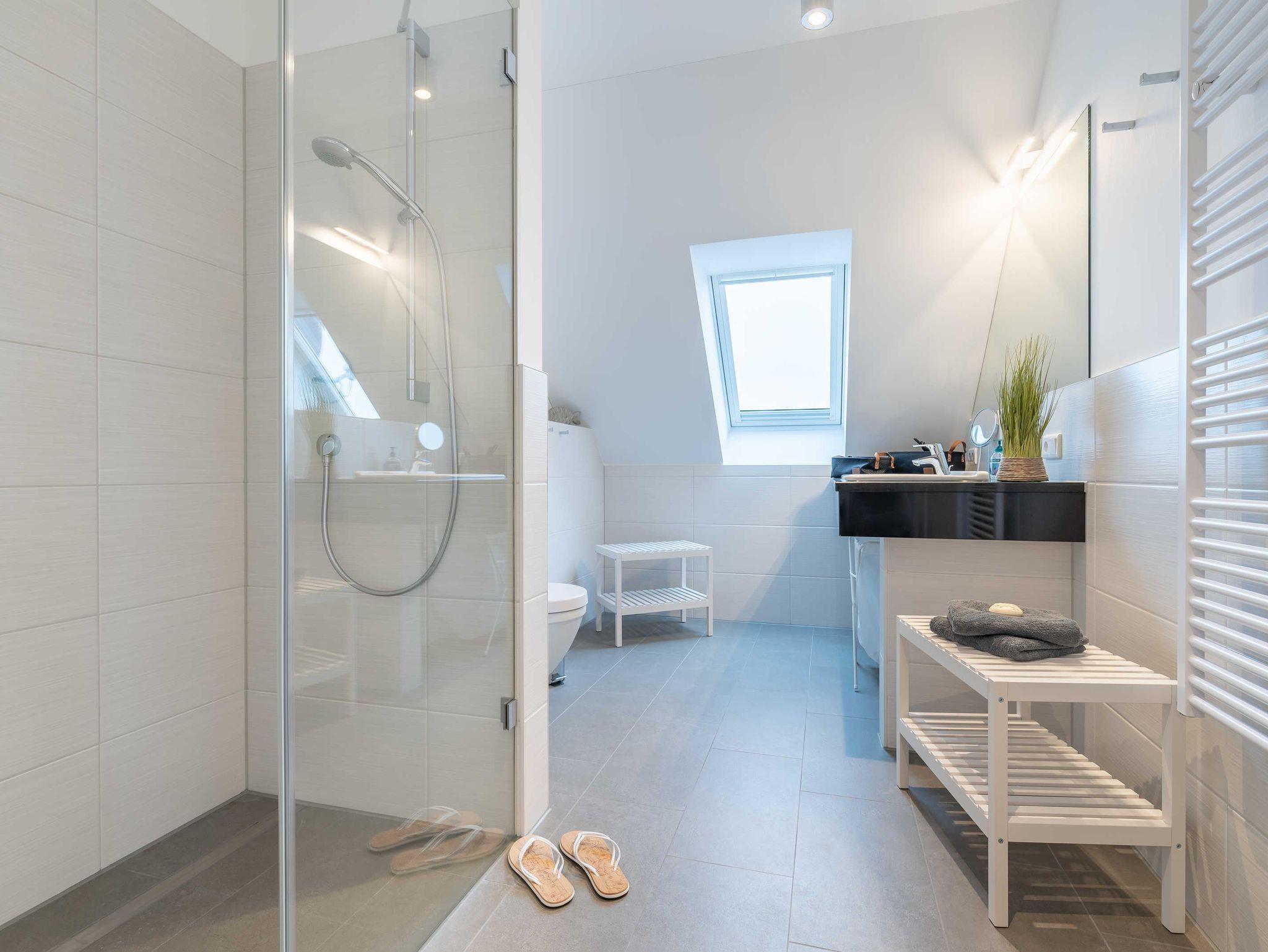 Starten Sie Ihren Urlaubstag im modernen Tageslicht-Badezimmer mit einem Blick in die Morgensonne. Das geräumige Bad verfügt über eine bodengleiche Dusche, einen elektrischen Handtuchheizkörper, einen großzügigen Waschtisch sowie einen Haartrockner und einen Schminkspiegel.
