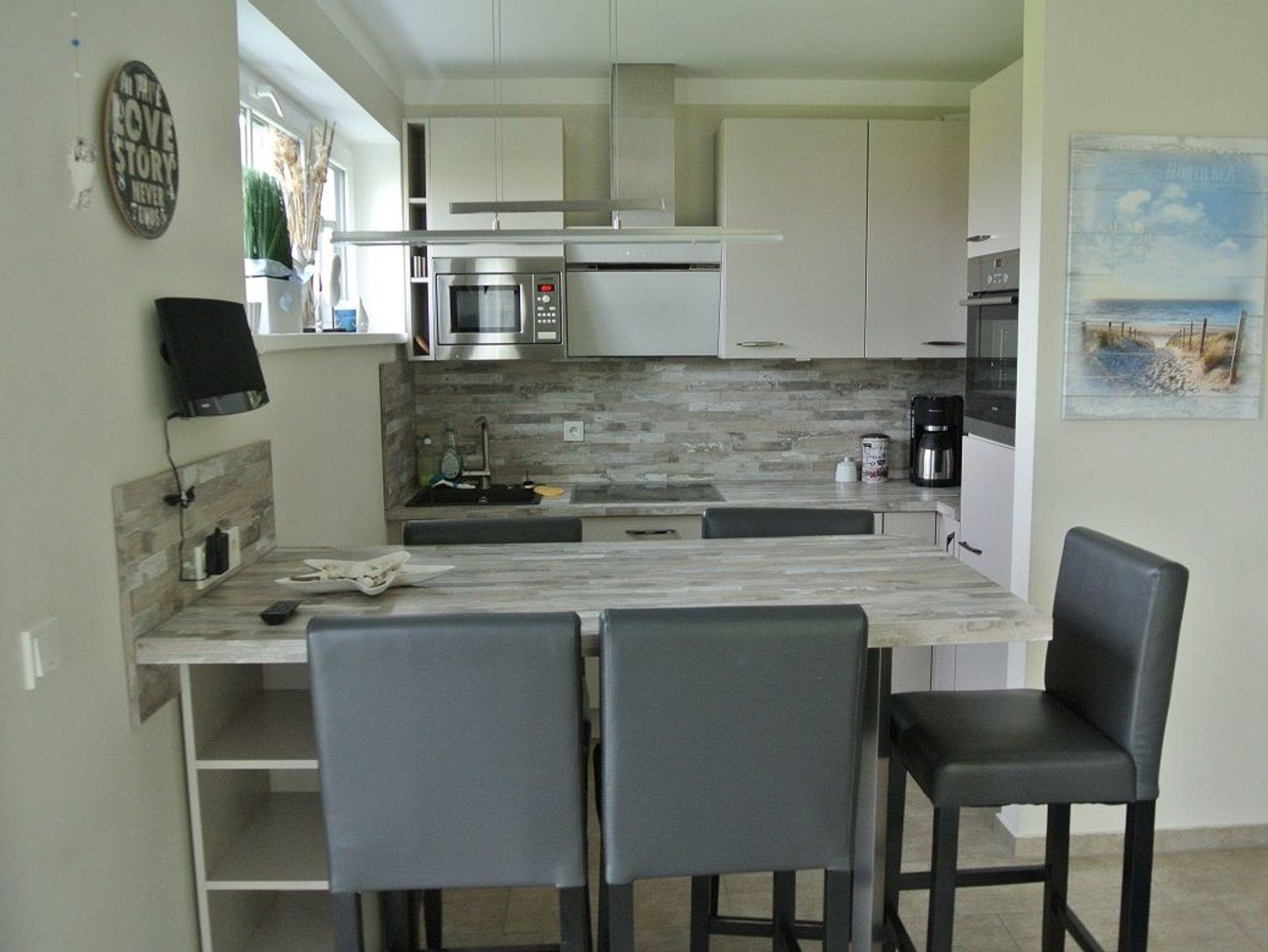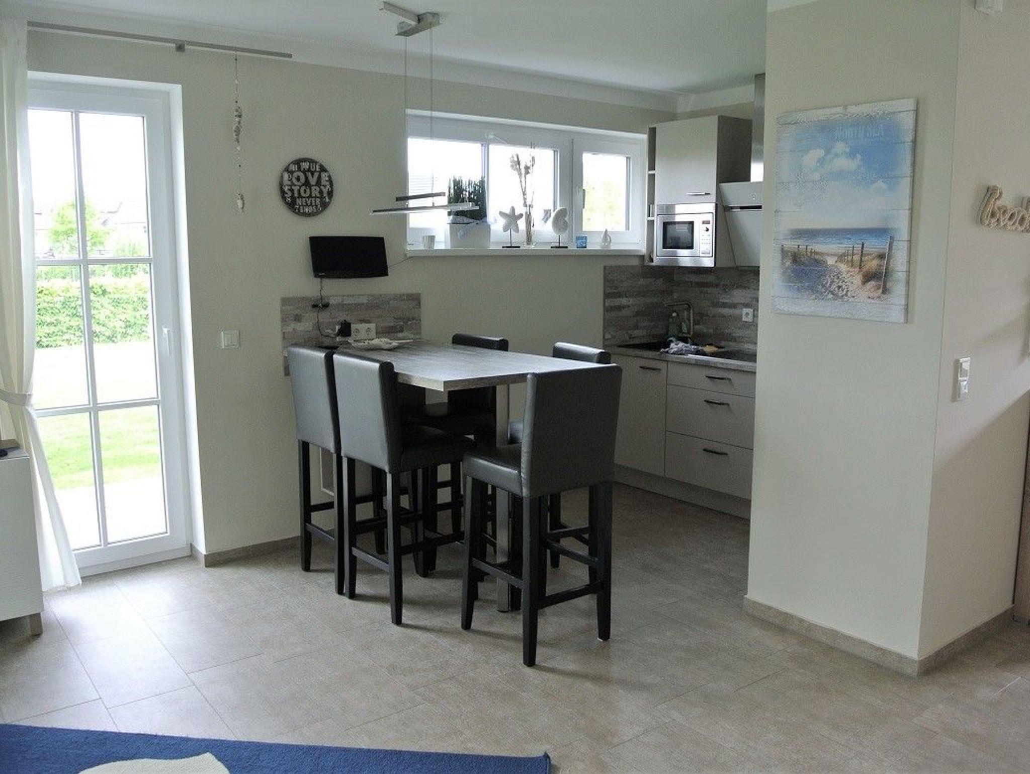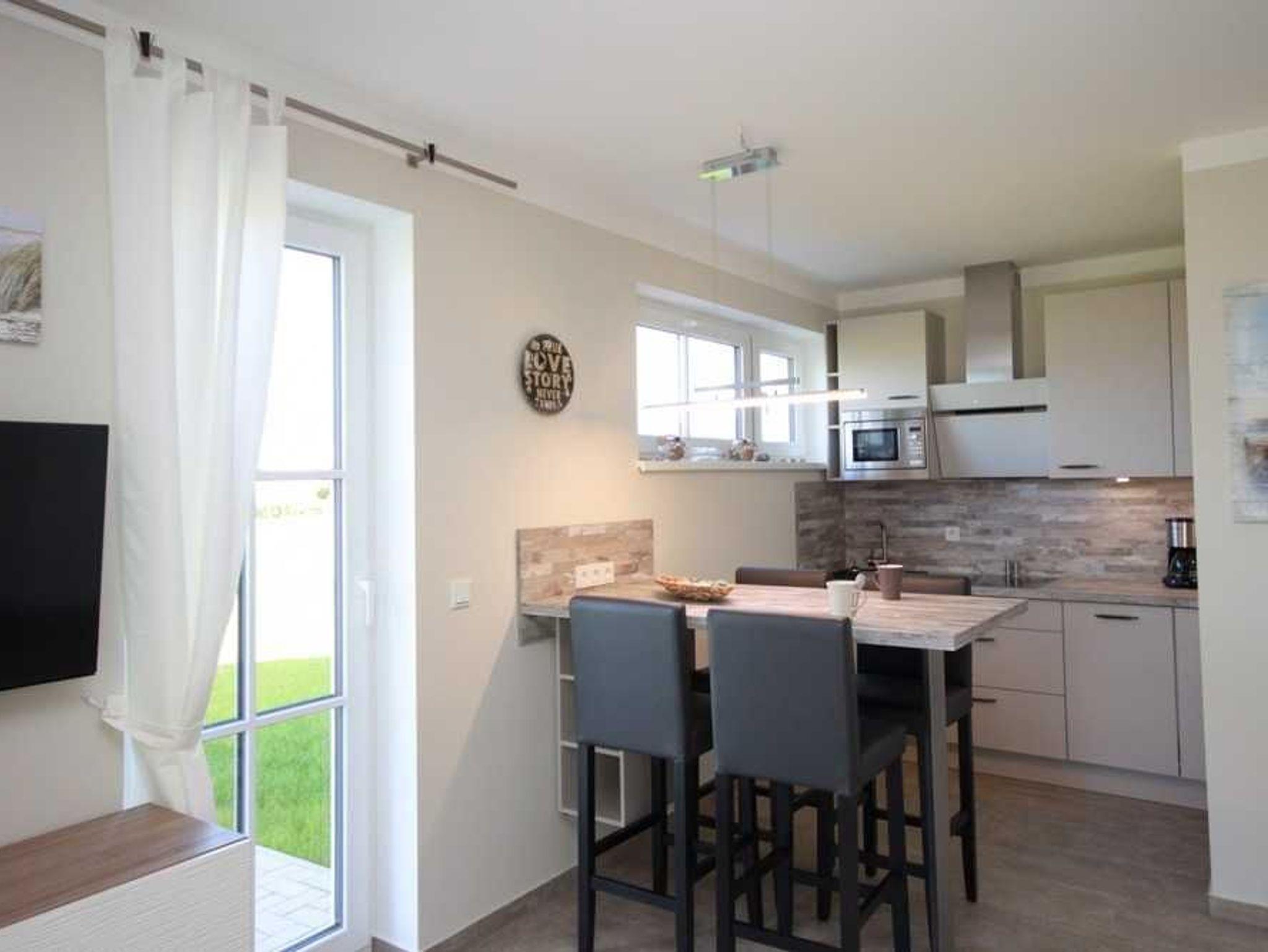 Der großzügig gestaltete Wohn-Essbereich befindet sich ebenfalls im Erdgeschoss. Die moderne Einbauküche sowie div. Küchengeräte wie Toaster, Eierkocher, Kaffeemaschine, Wasserkocher, Mikrowelle und Herd mit Cerankochfeld und Backofen bieten ambitionierten Hobbyköchen, auch im Urlaub, die Möglichkeit Essen nach eigenen Wünschen zu kochen. Im Küchenbereich rundet ein Hochtisch inkl. vier Barhocker das moderne Design ab.
