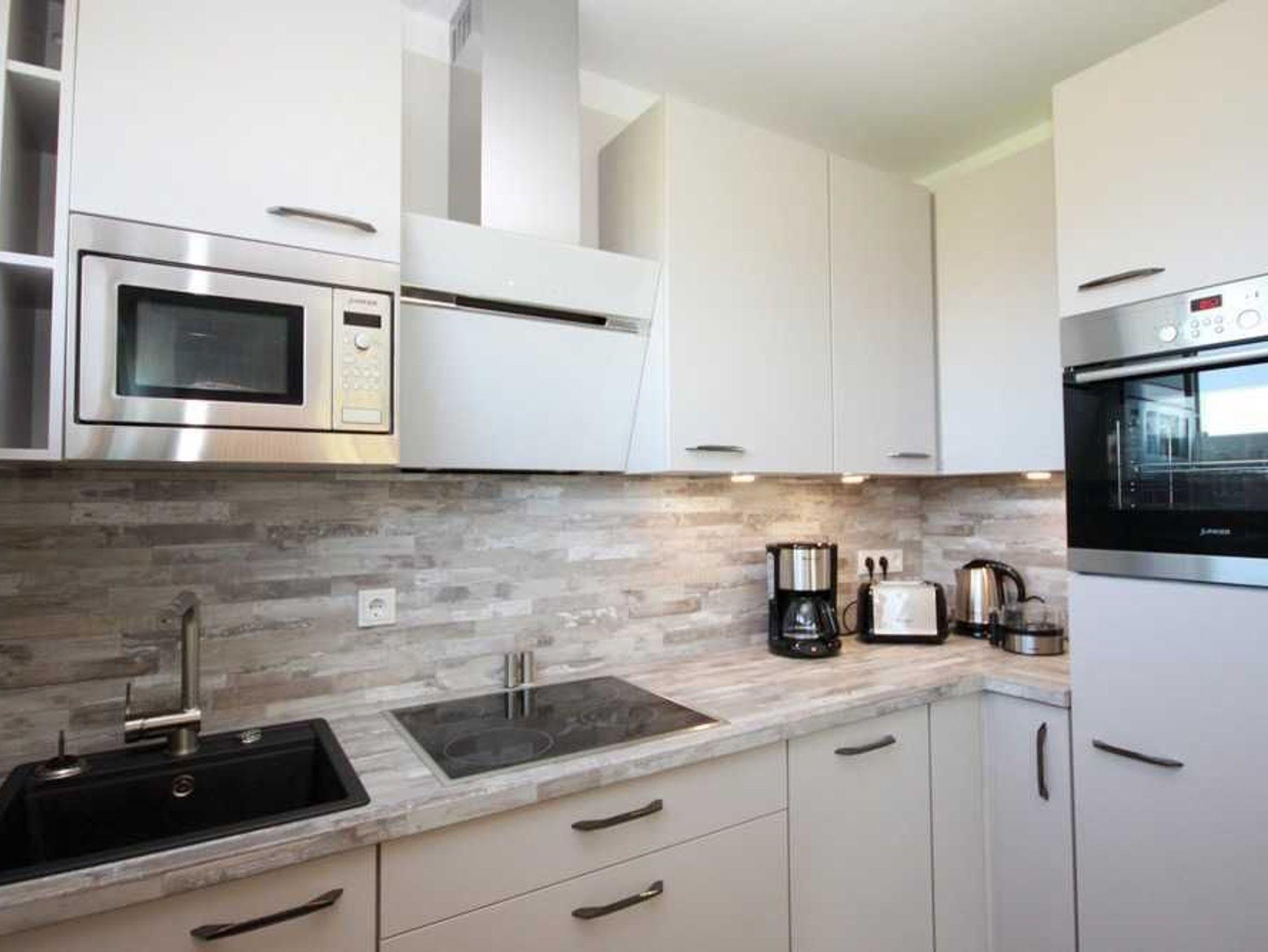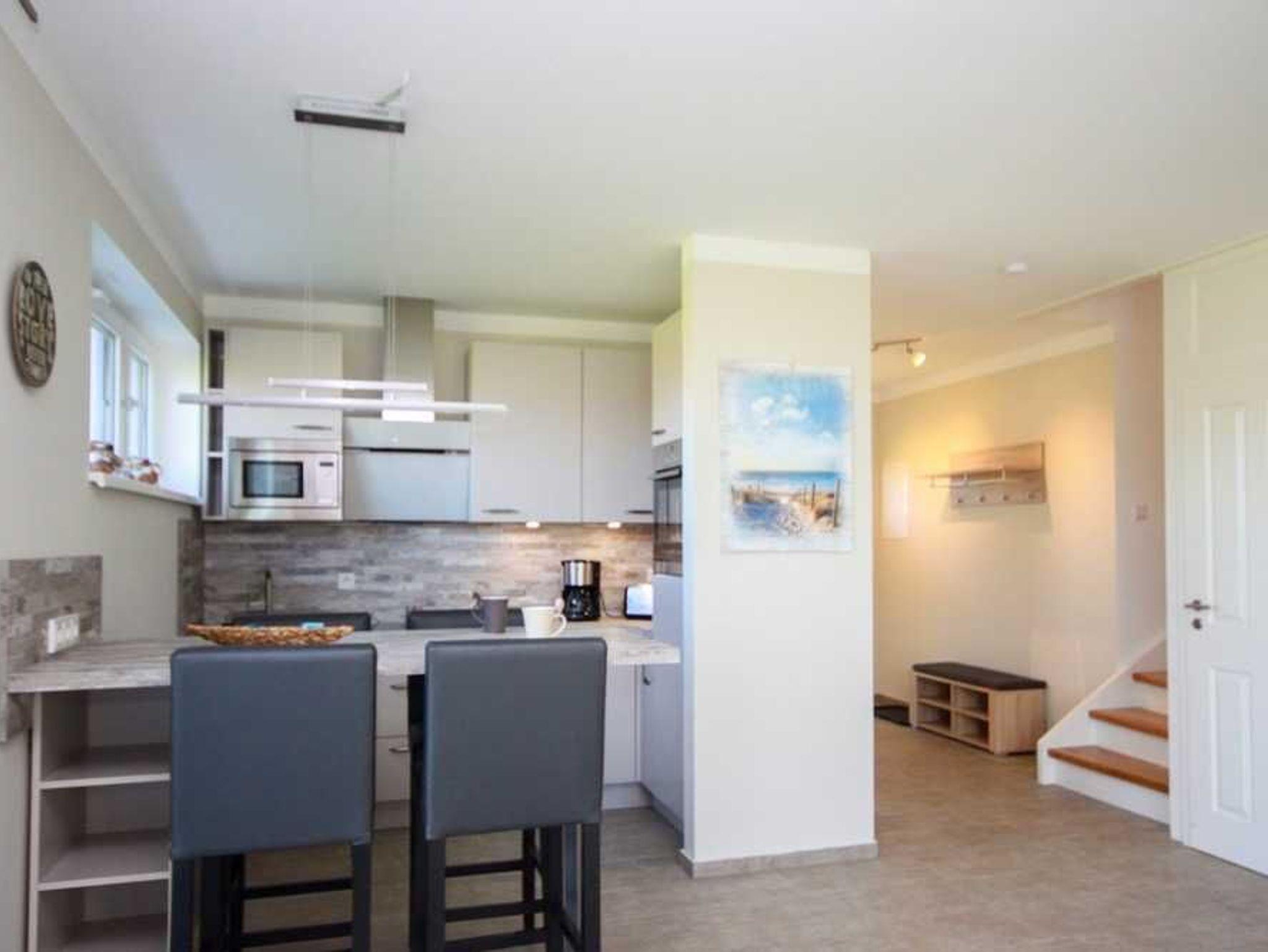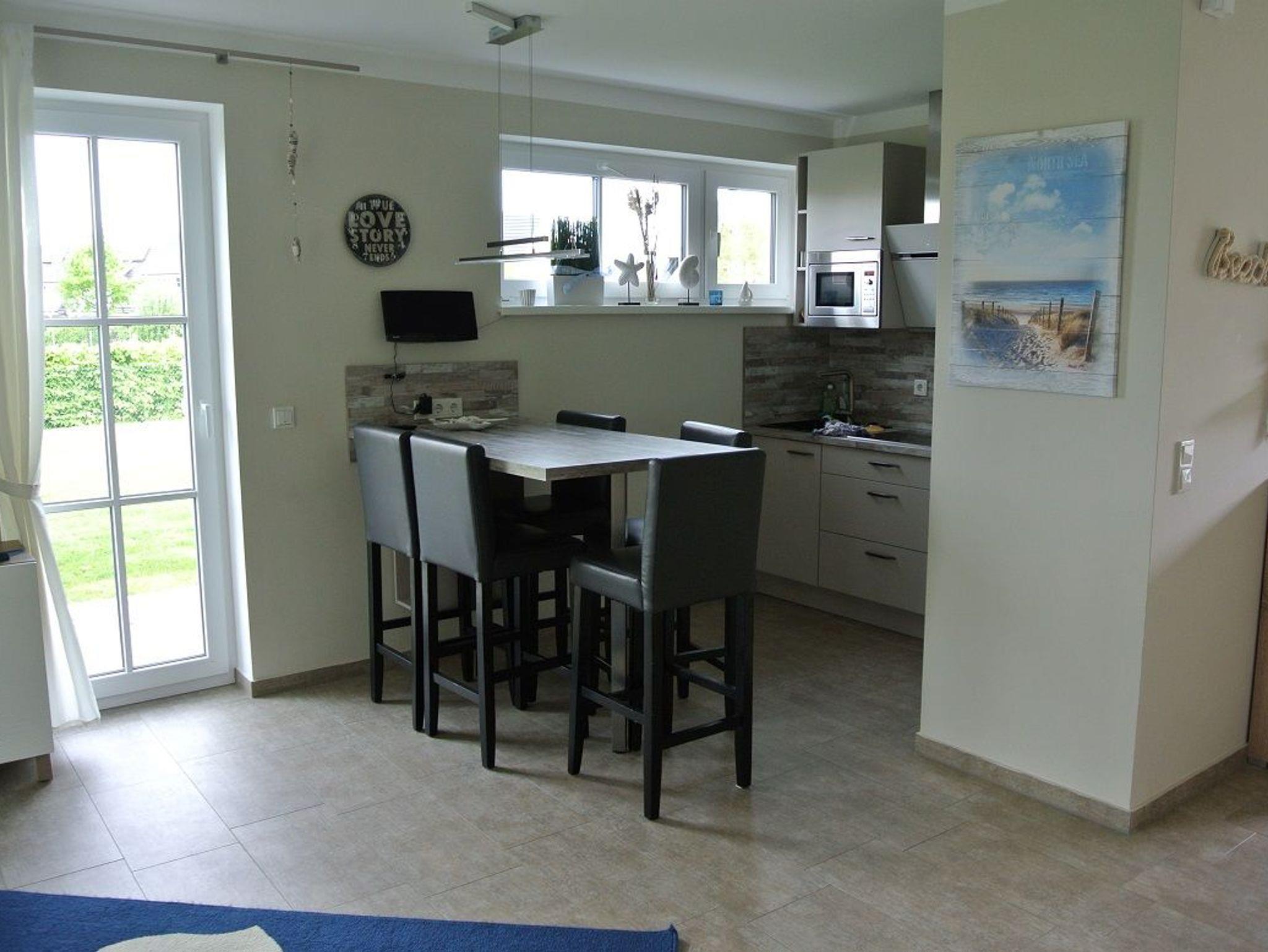 Der großzügig gestaltete Wohn-Essbereich befindet sich ebenfalls im Erdgeschoss. Die moderne Einbauküche sowie div. Küchengeräte wie Toaster, Eierkocher, Kaffeemaschine, Wasserkocher, Mikrowelle und Herd mit Cerankochfeld und Backofen bieten ambitionierten Hobbyköchen, auch im Urlaub, die Möglichkeit Essen nach eigenen Wünschen zu kochen. Im Küchenbereich rundet ein Hochtisch inkl. vier Barhocker das moderne Design ab.