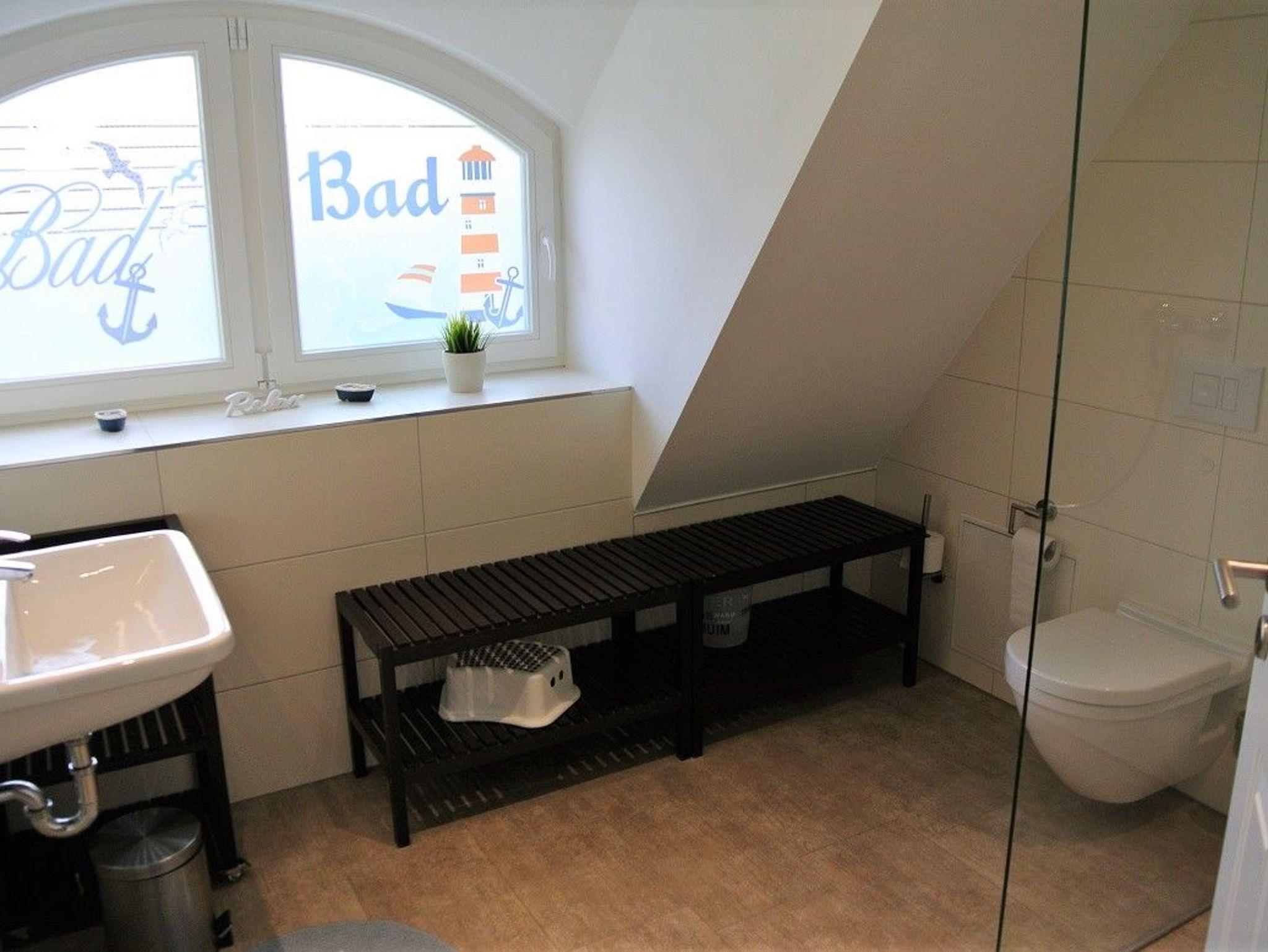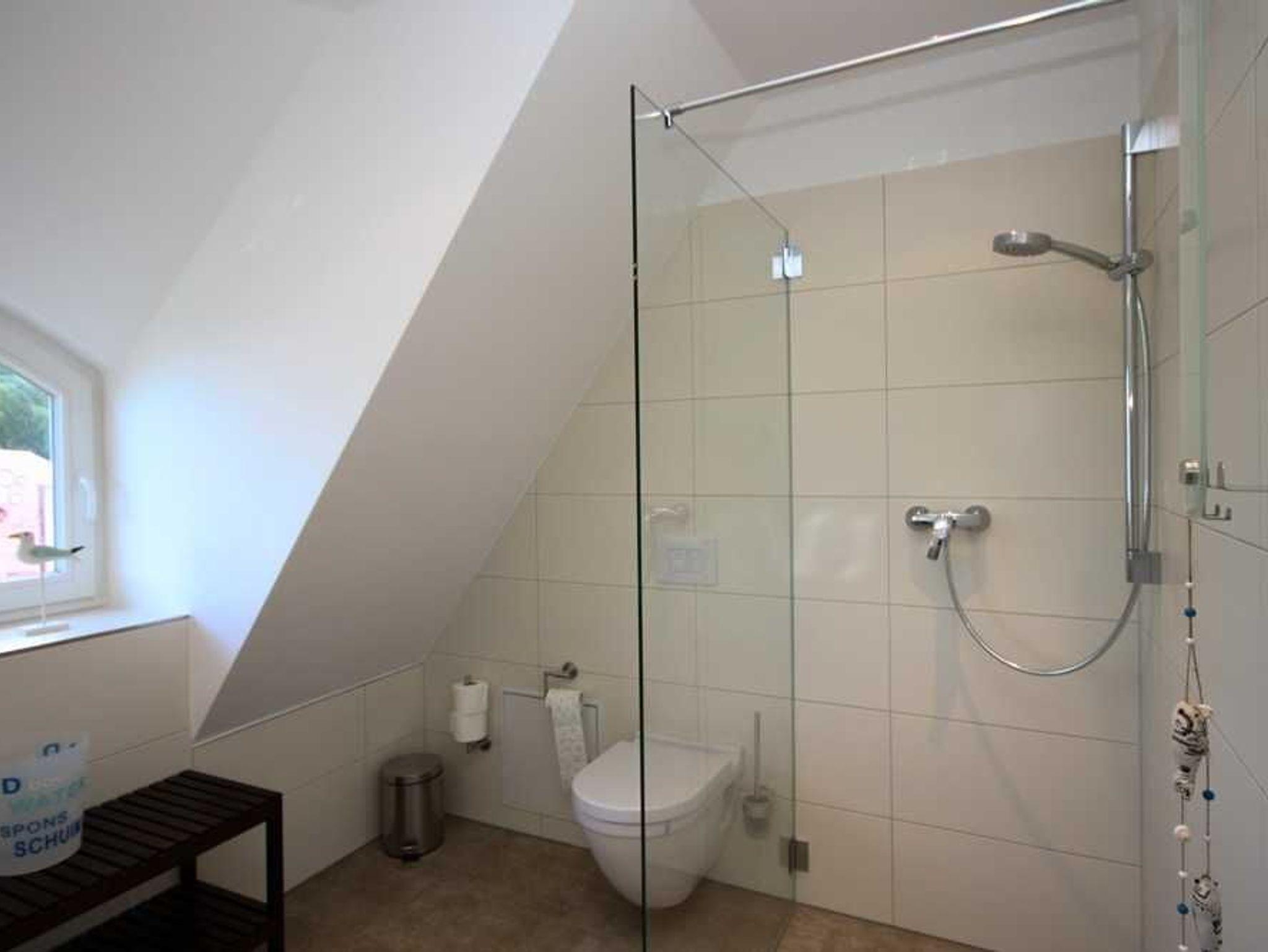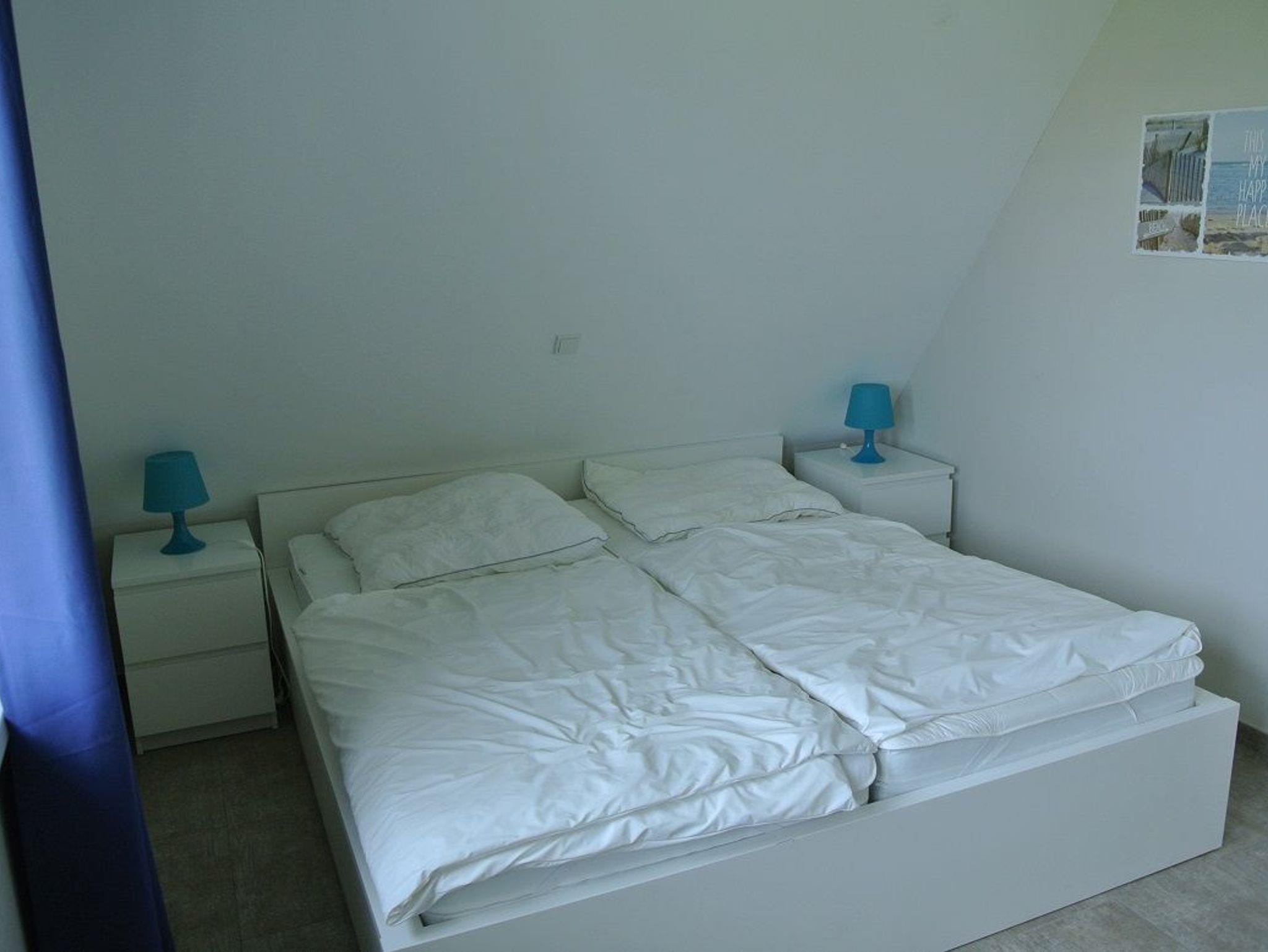 Im Obergeschoss befindet sich das zweite großzügig und hell angelegte Badezimmer mit Dusche und Handtuchtrockner. Beide sich im Obergeschoss befindlichen Schlafzimmer sind mit geräumigen Kleiderschränken, Sitzgelegenheiten und Kommoden sowie zwei Doppelbetten (1,80 x 2,00 m) mit Einzelmatratzen ausgestattet. Zum besseren Einschlafen kann in beiden Räumen auf den installierten Flat-TV Fernsehen geschaut werden.