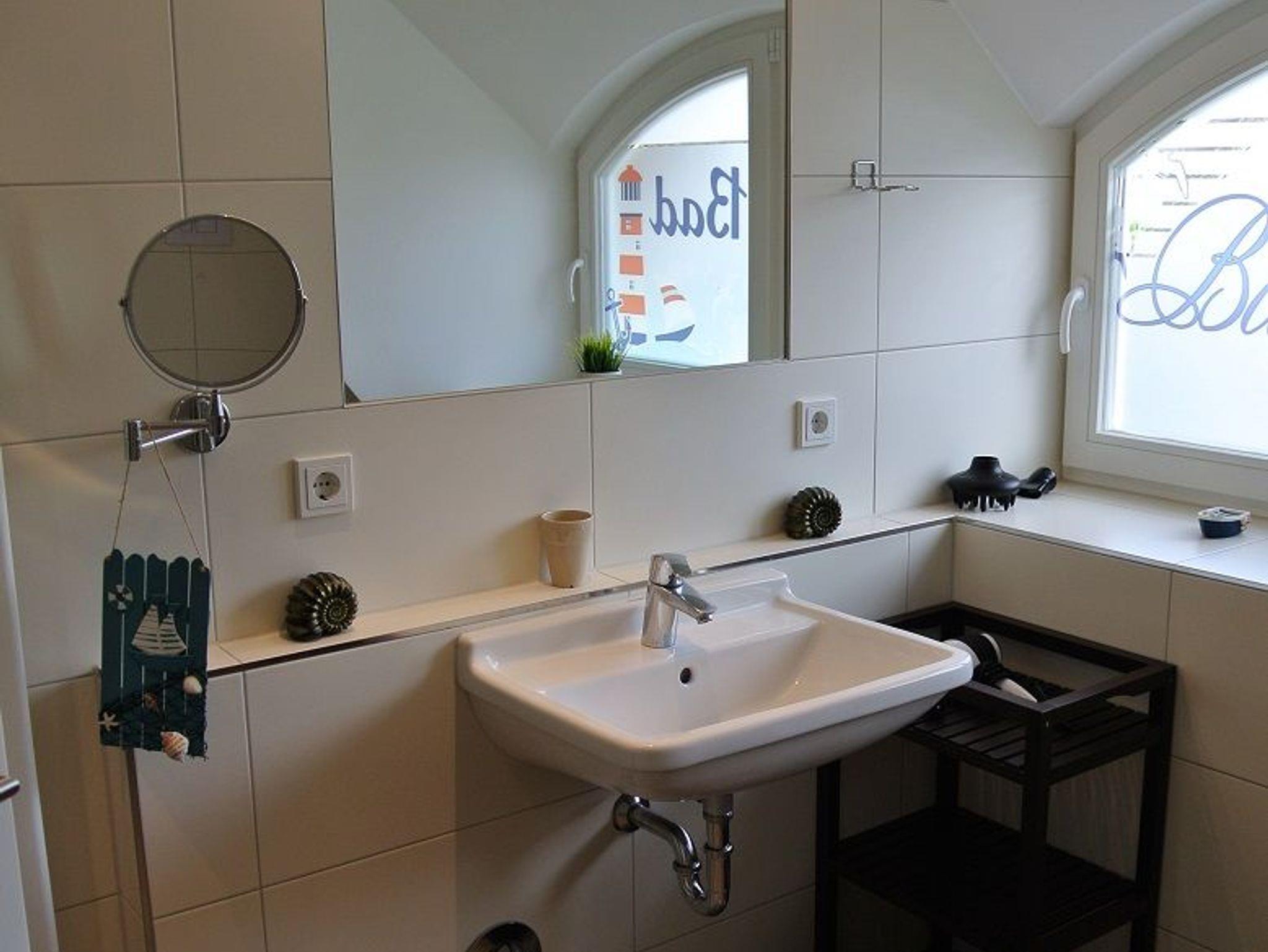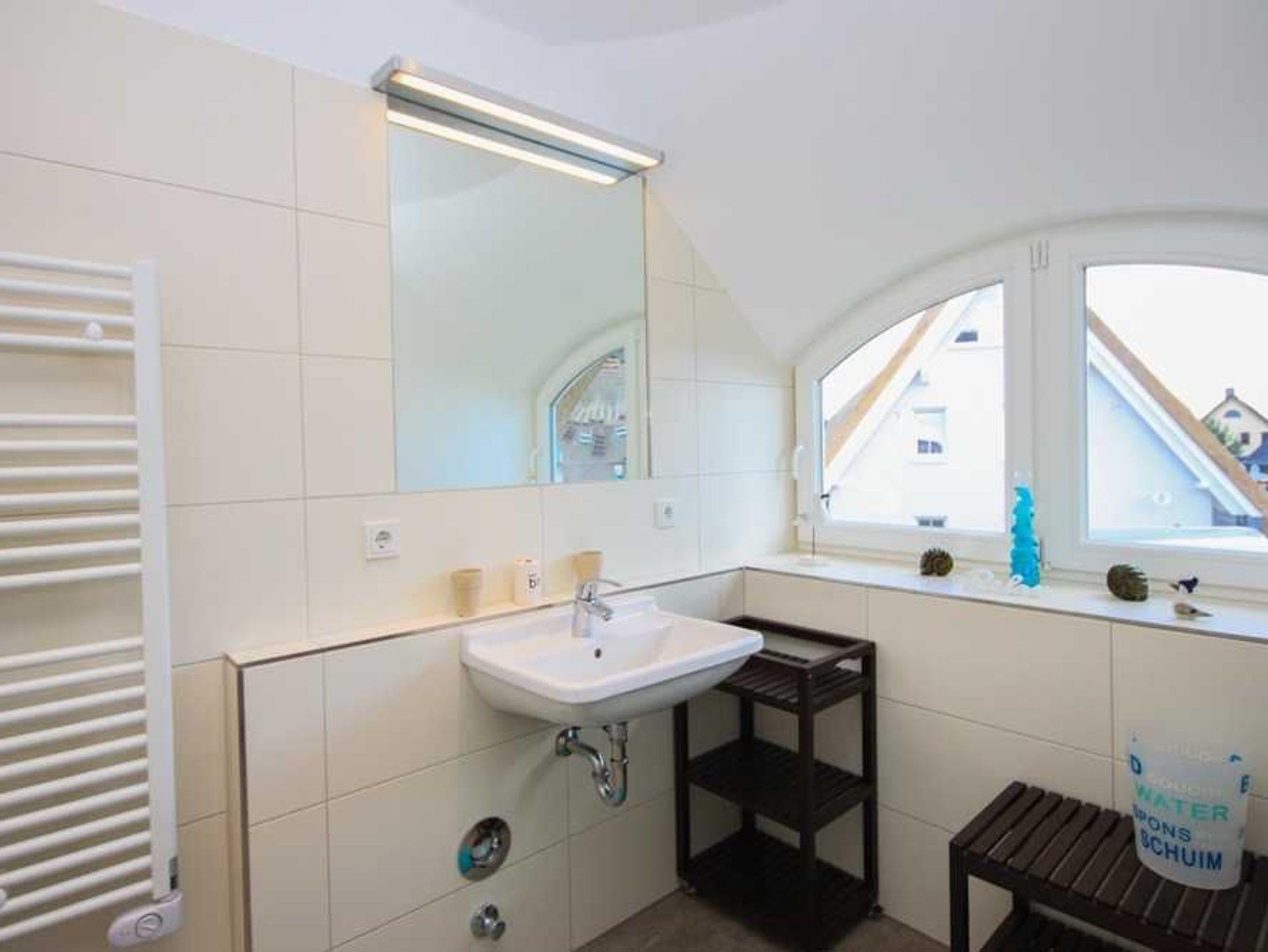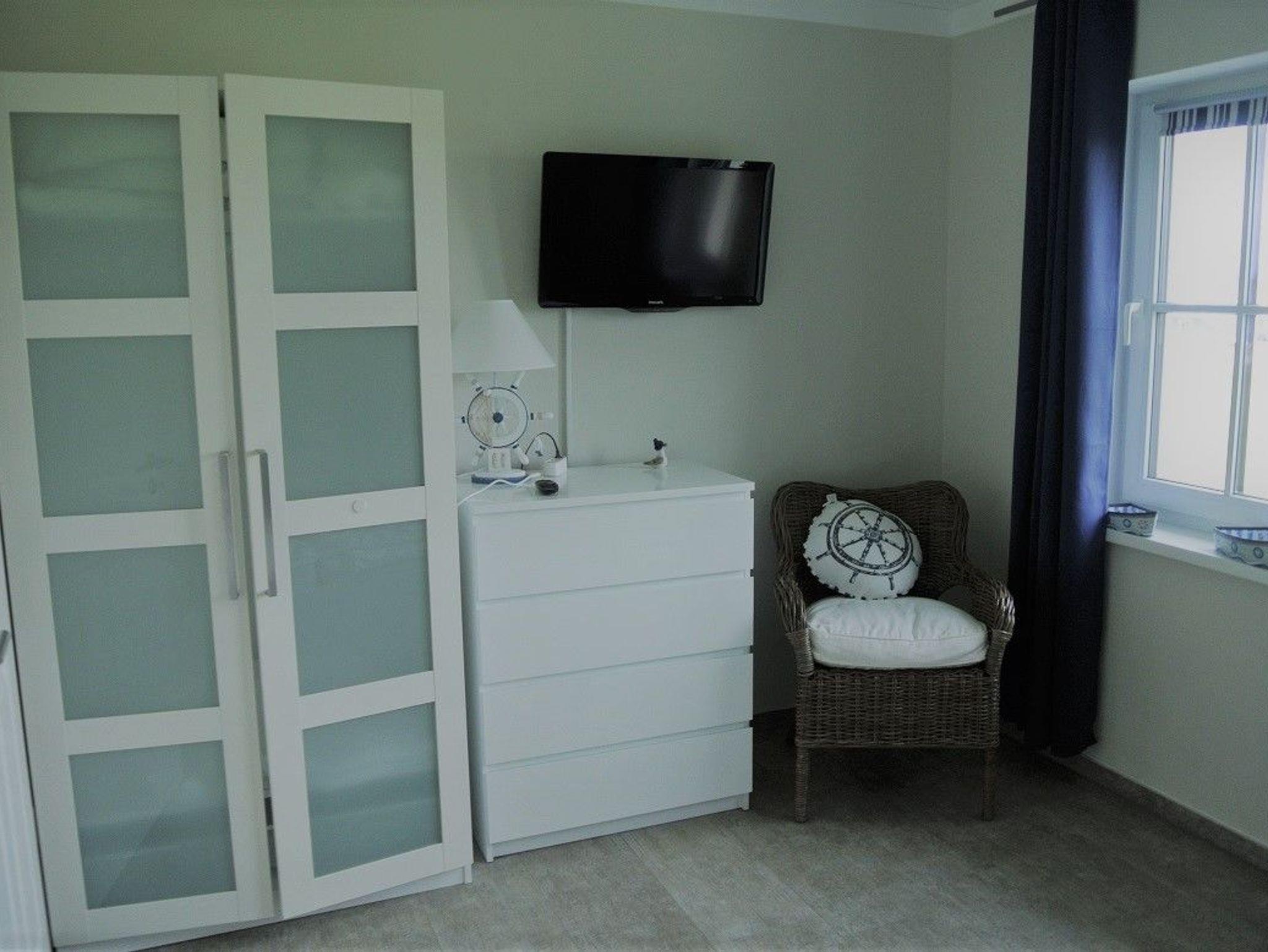 Im Obergeschoss befindet sich das zweite großzügig und hell angelegte Badezimmer mit Dusche und Handtuchtrockner. Beide sich im Obergeschoss befindlichen Schlafzimmer sind mit geräumigen Kleiderschränken, Sitzgelegenheiten und Kommoden sowie zwei Doppelbetten (1,80 x 2,00 m) mit Einzelmatratzen ausgestattet. Zum besseren Einschlafen kann in beiden Räumen auf den installierten Flat-TV Fernsehen geschaut werden.