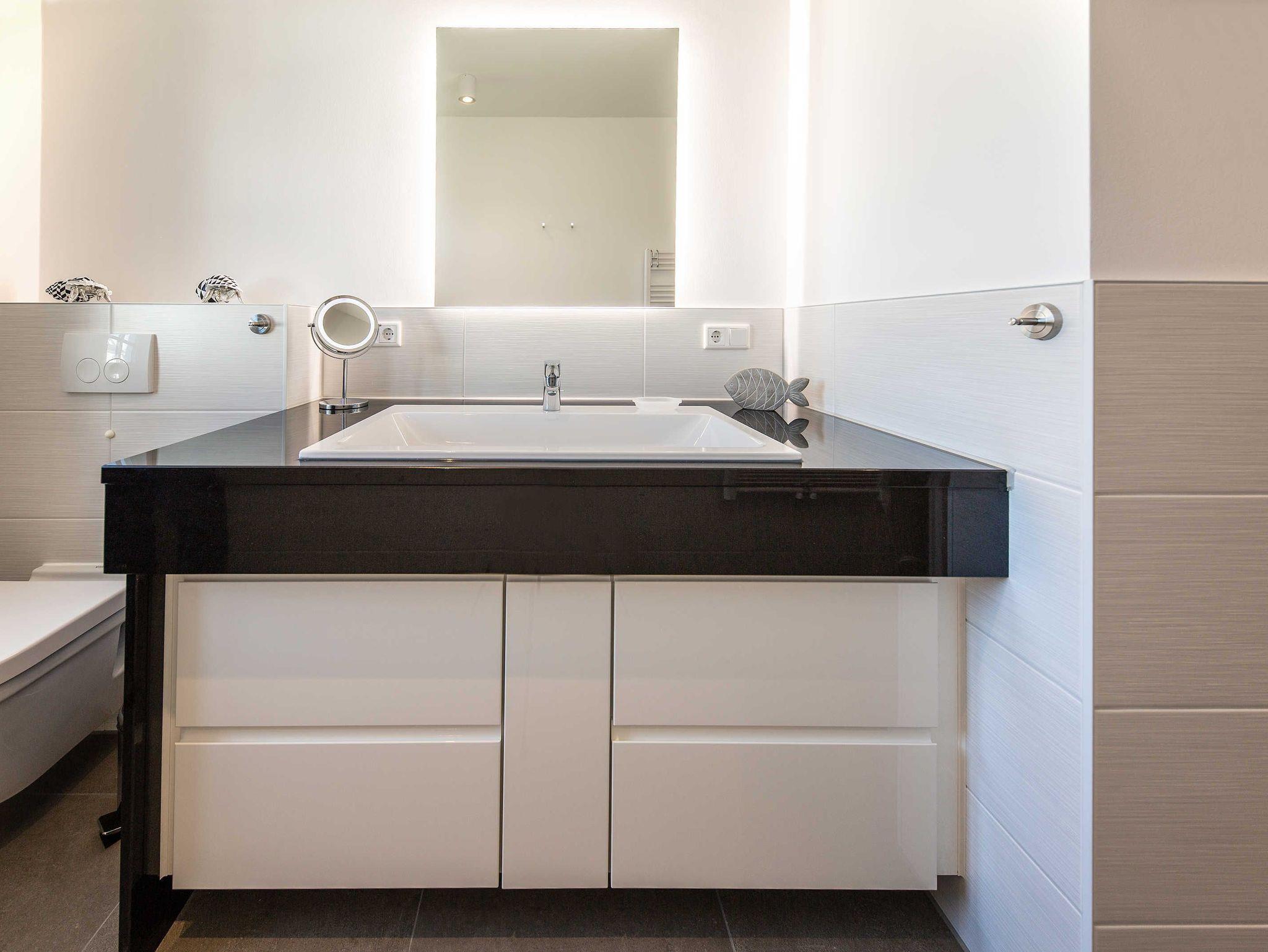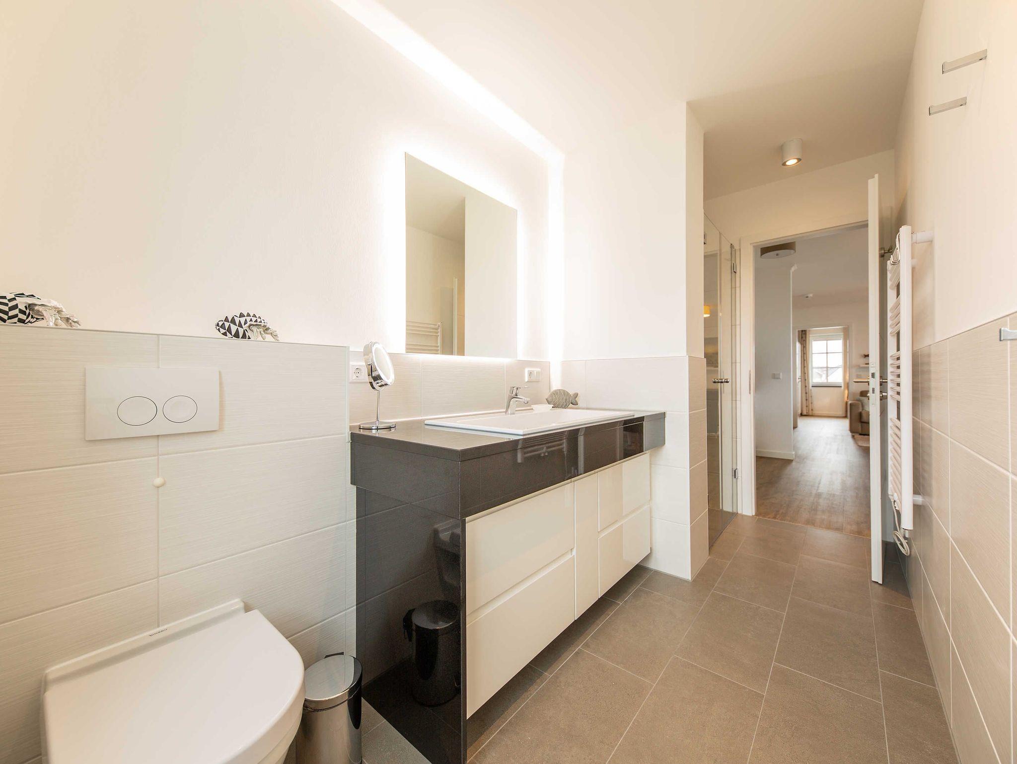 Das elegante Bad besticht mit einer bodengleichen Dusche, einem Waschtisch mit großem Spiegel, einem Föhn sowie einem elektrischen Handtuchheizkörper. Die gesamte Wohnung ist mit einer komfortablen Fußbodenheizung ausgerüstet.
