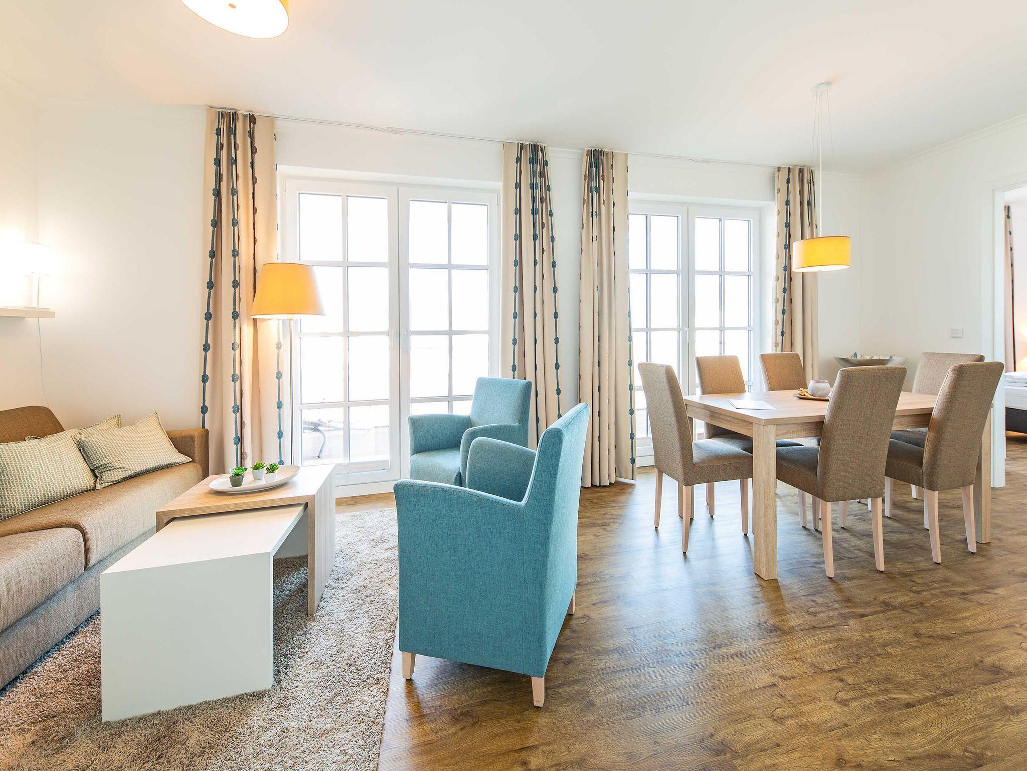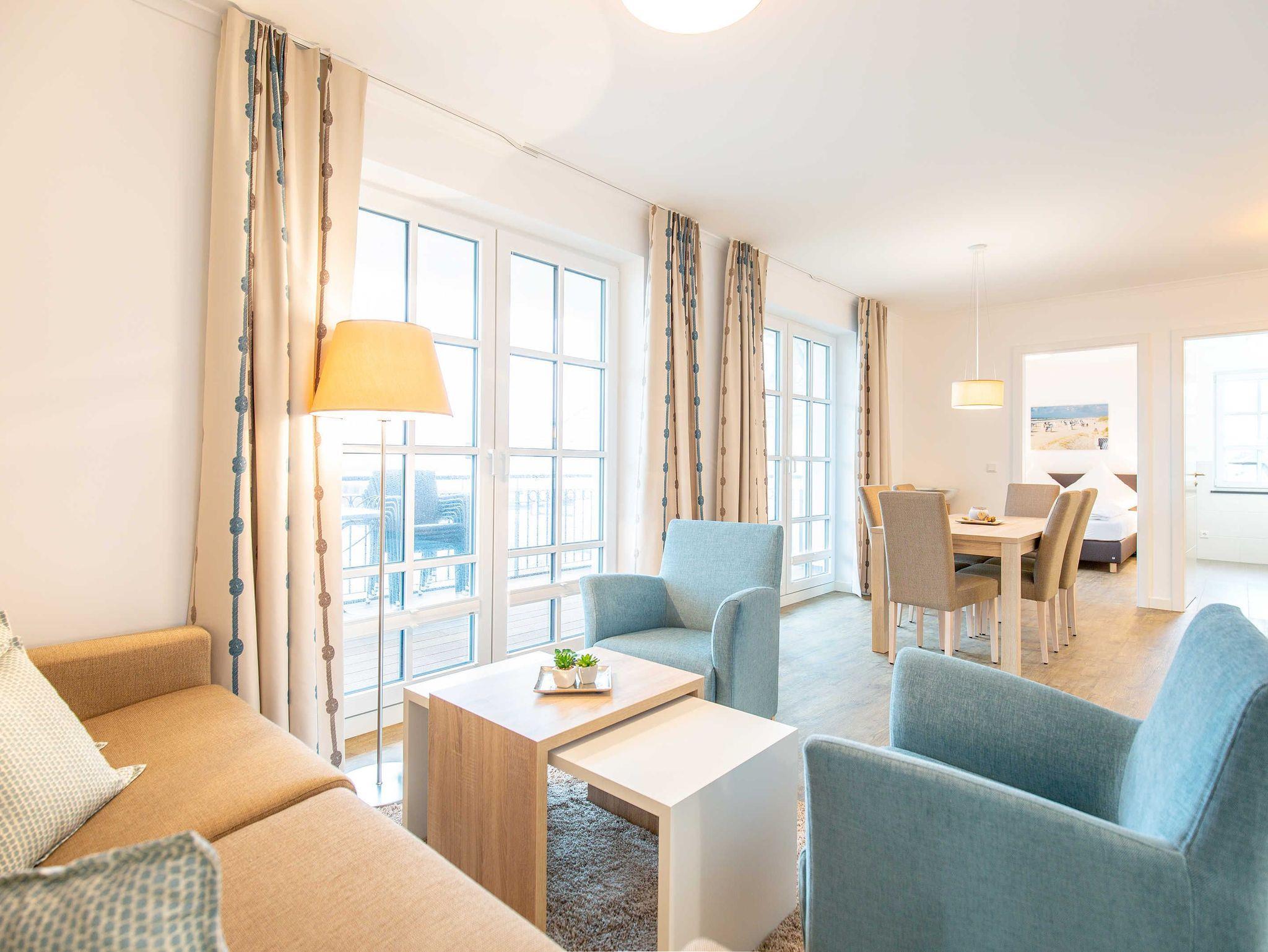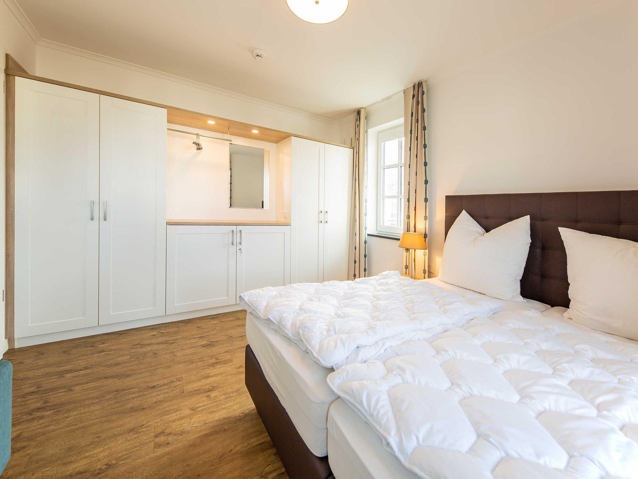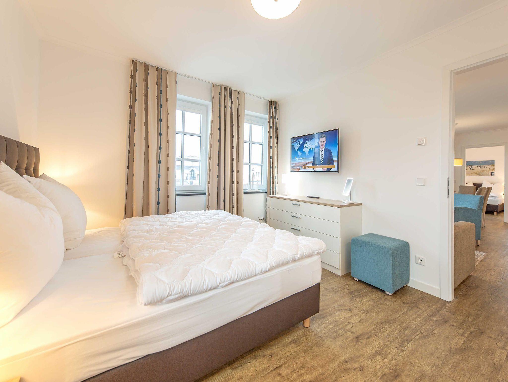 Geeignet ist die 64 m² große Unterkunft im ersten Obergeschoss für bis zu maximal fünf Personen. Das erste Schlafzimmer ist mit einem 1,80 x 2,00 m großen Boxspringbett ausgestattet und bietet genügend Platz für ein Kinderreisebett. Im zweiten Schlafzimmer befindet sich ein 1,60 x 2,00 m großes Boxspringbett (durchgehenden Matratze). In beiden Räumen befindet sich ausreichend Stauraum für Ihr Gepäck. Im freundlichen Wohnraum erwartet Sie ein Längsschläfersofa, welches bei Bedarf Platz ebenfalls als Schlafplatz genutzt werden kann (Liegefläche von 1,60 x 1,95 m). Alle drei Zimmer sind für beste Unterhaltung mit einem Flat-TV ausgestattet - im Wohnzimmer 55 Zoll (sowie Blu-Ray/DVD-Player und DVD`s für lange Winterabende) und in den Schlafzimmern jeweils 43 Zoll.