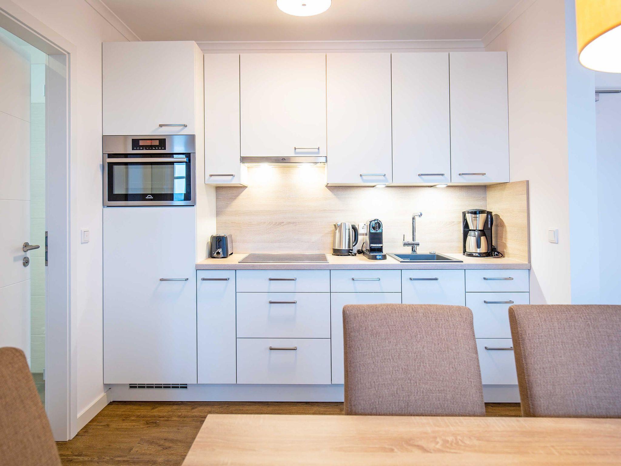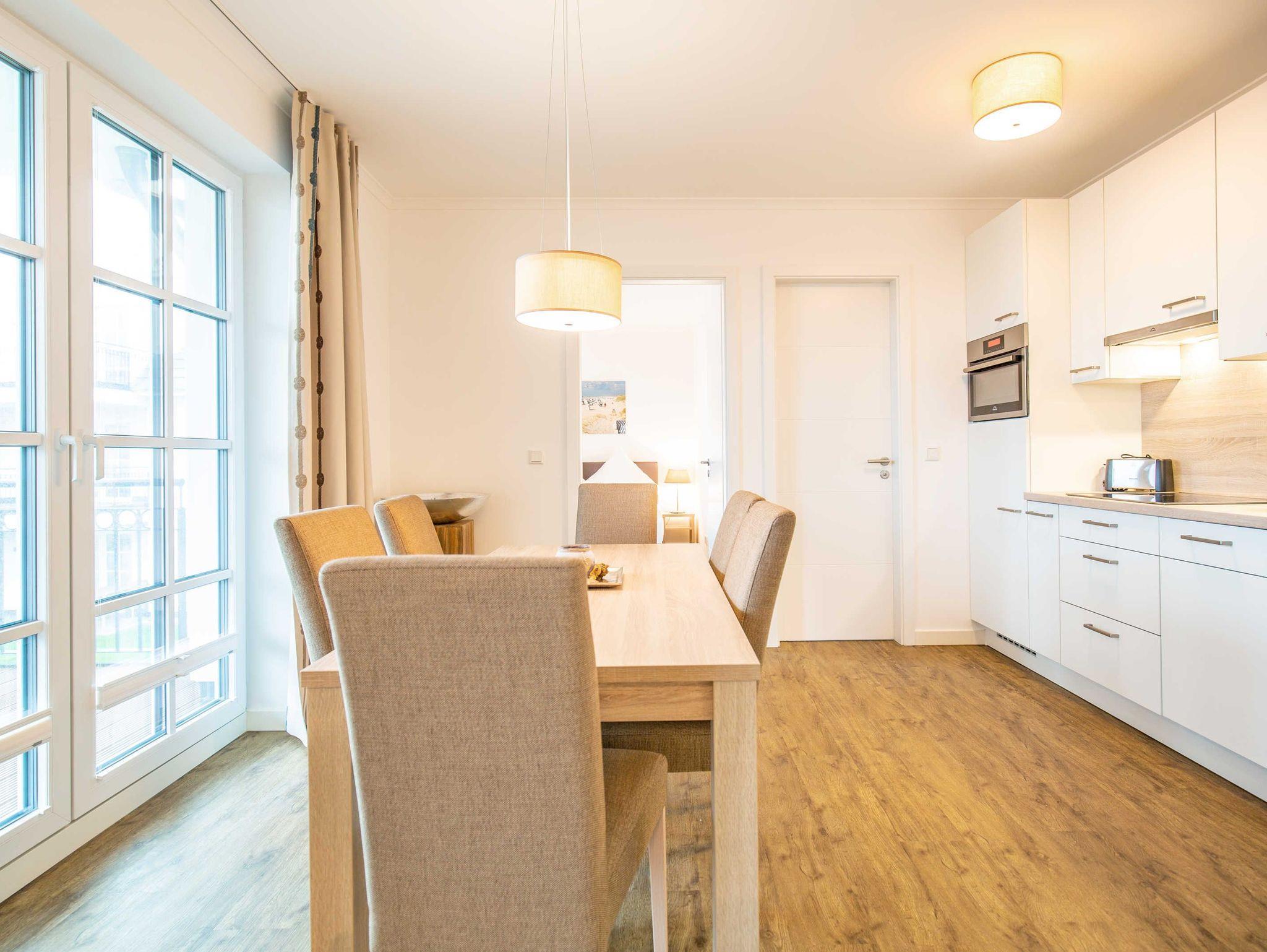 Neben der Sitzgarnitur bieten ein breiter Schreibtisch sowie ein großer hölzerner Esstisch mit sechs Stühlen viel Platz zum Verweilen. In der voll ausgestatteten Küchenzeile im Wohn-/Essbereich finden Sie alles, was Sie für einen angenehmen Aufenthalt benötigen: Backofen mit integrierter Mikrowelle, 4-Platten-Cerankochfeld, Kühlschrank mit Tiefkühlfach, Geschirrspüler, Filterkaffeemaschine, Nespressomaschine, Toaster, Wasserkocher, Handmixer usw.