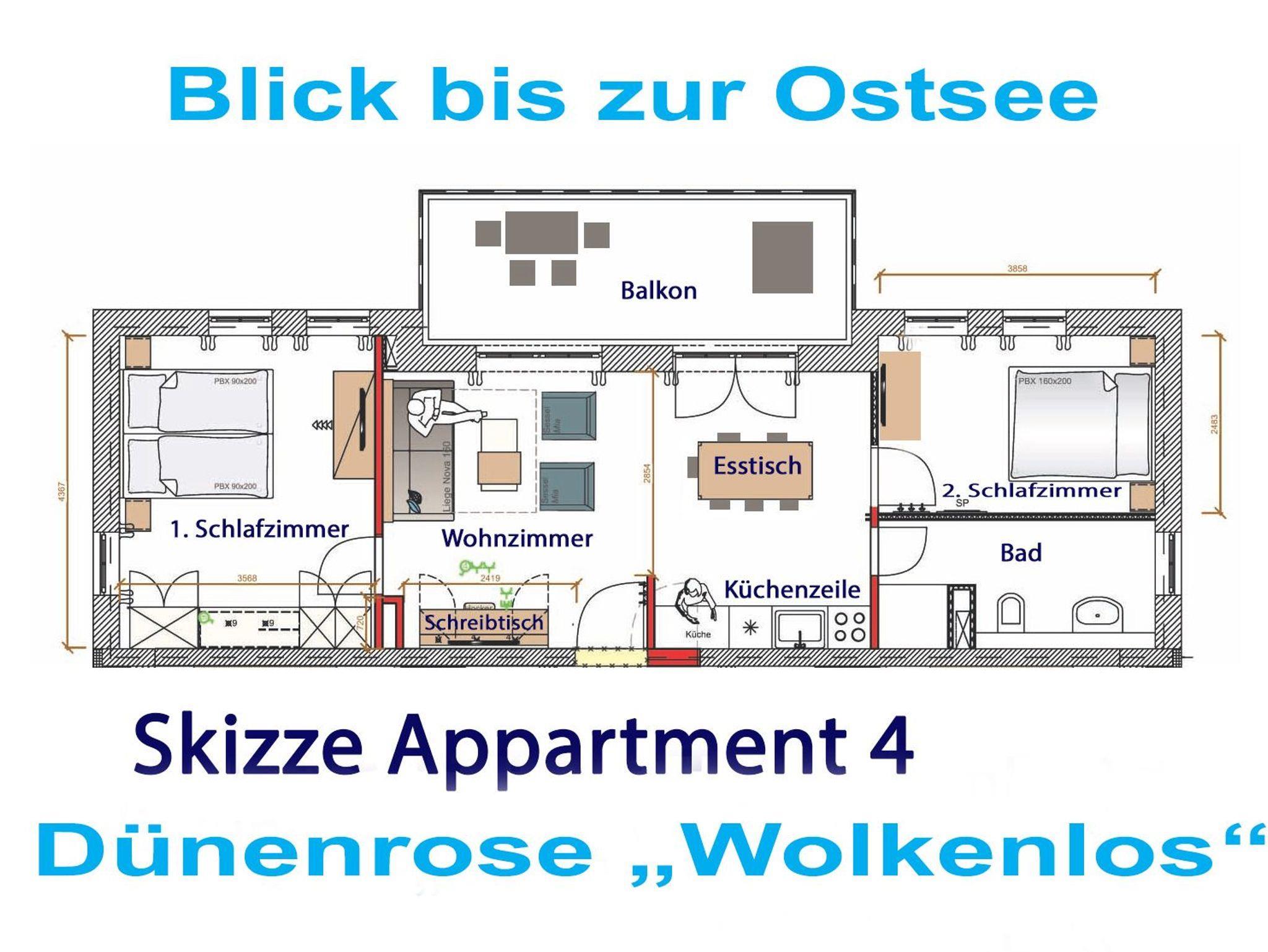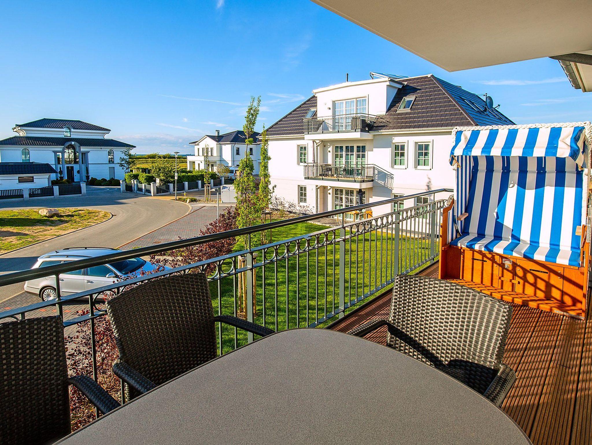 Besonders hervorzuheben für diese Ferienwohnung ist der großzügige Balkon (13 m²). Hier genießen Sie einen direkten Blick auf die nahe Ostsee. Stilecht im maritimen Strandkorb können Sie auf dem geschützten großen Balkon bei schönem Wetter die Nachmittags- und Abendsonne genießen.