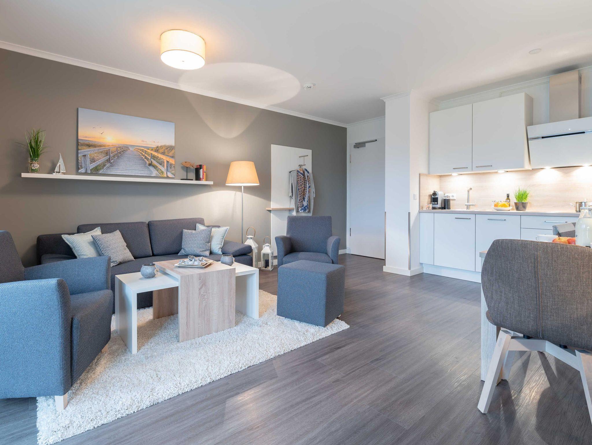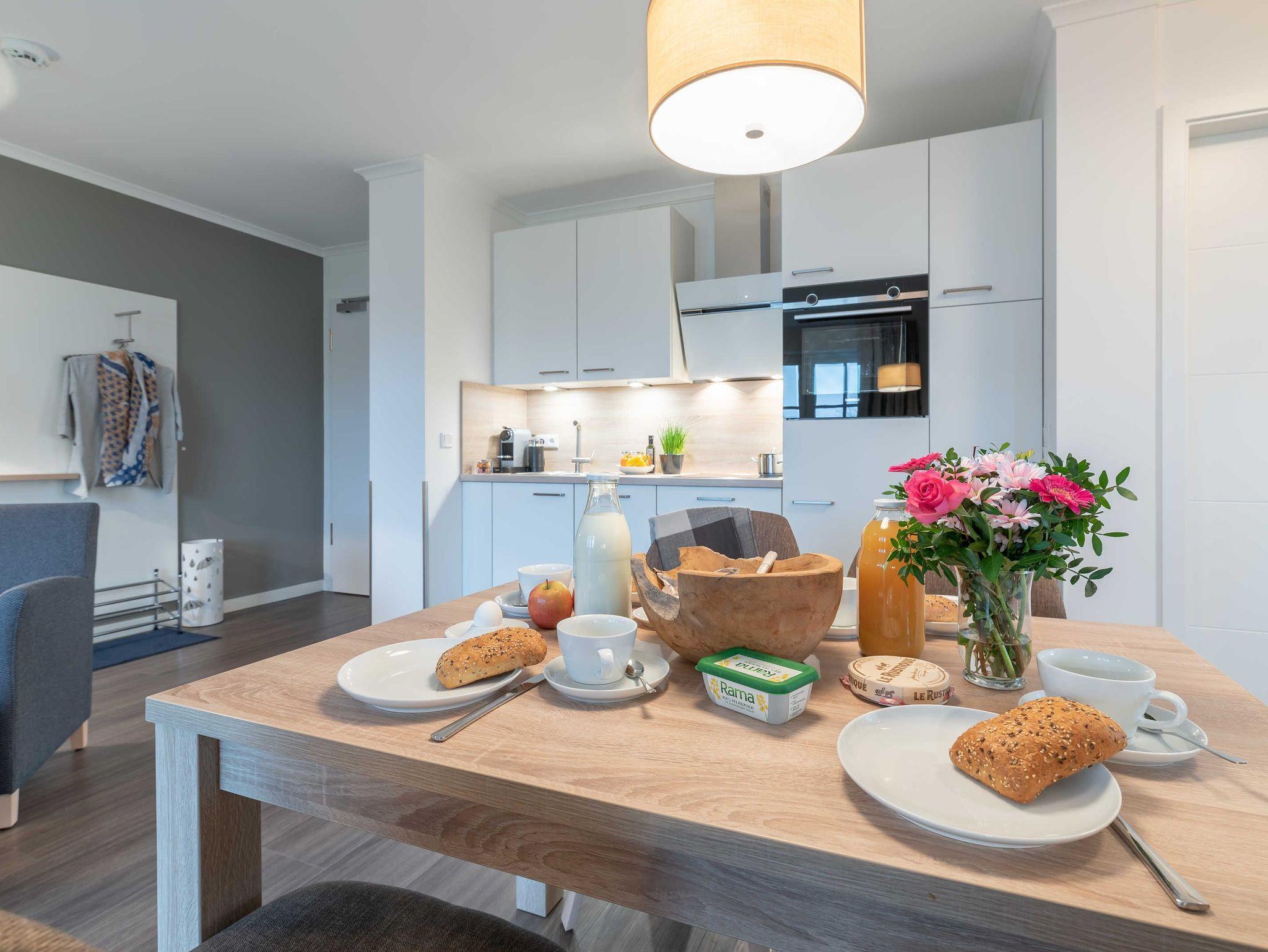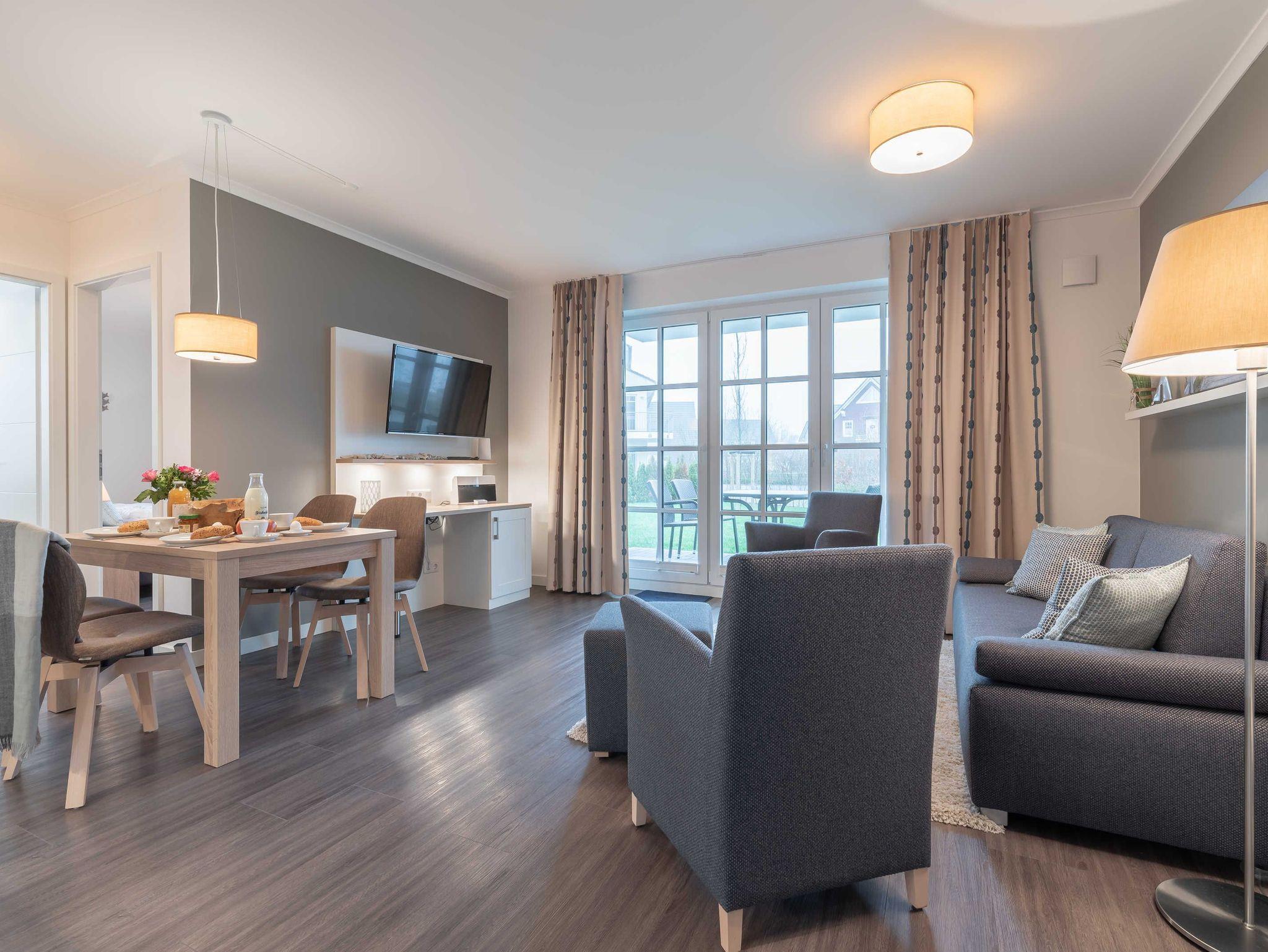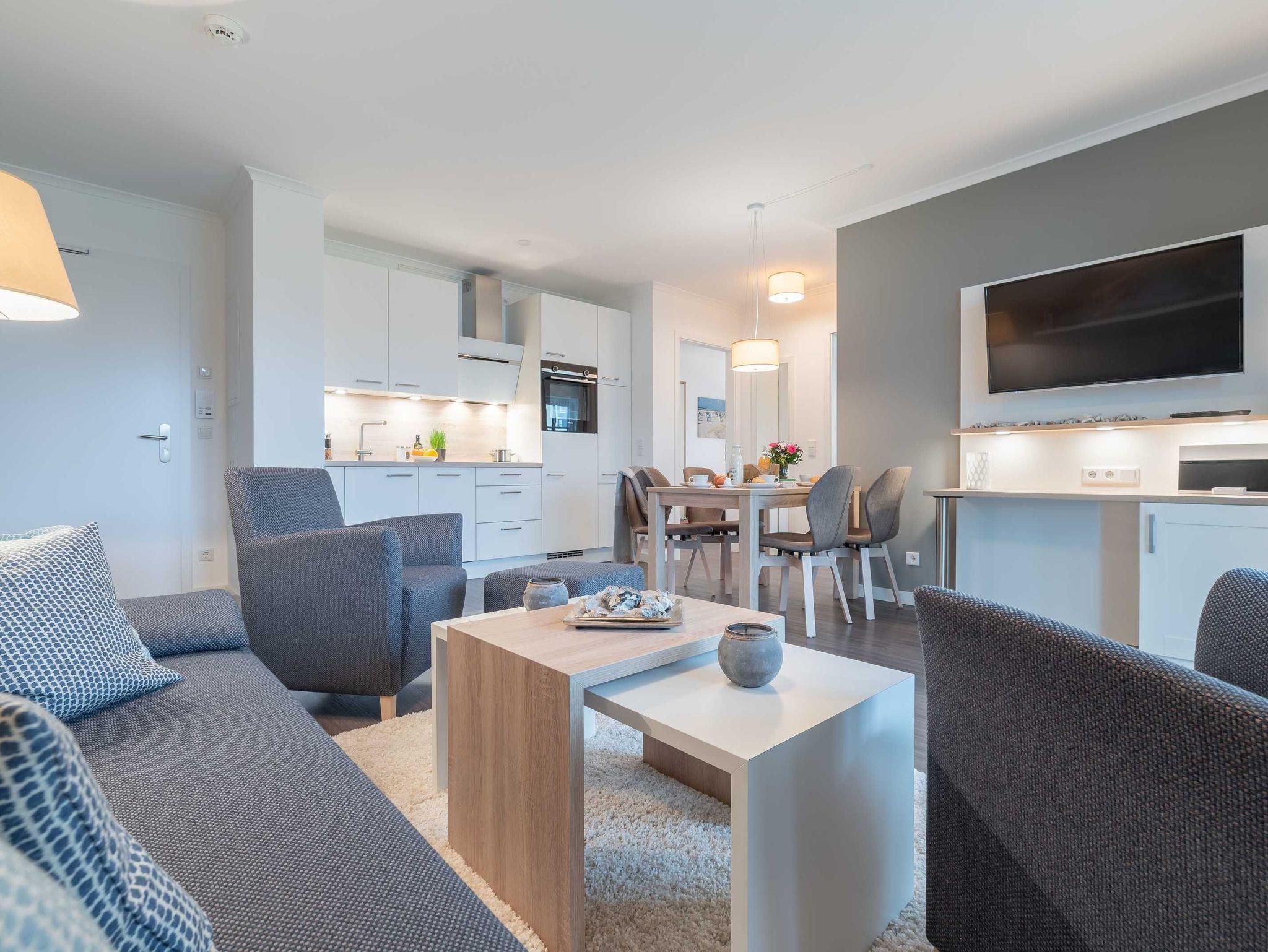Die Wohnung besteht aus einem geschmackvoll eingerichteten Wohn-/Esszimmer mit Einbauküche und zwei Schlafräumen und verfügt zusätzlich über eine Süd-West-Terrasse, auf der man die Sonne von mittags bis zum frühen Abend genießen kann. Gemütliche Stunden lassen sich gut verbringen auf der bequemen Wohnzimmercouch mit Sessel, Fußhocker, Flachbild-TV und Blu-Ray-Player. Der Esstisch mit vier bequemen Stühlen lädt zu geselligen Spieleabenden ein. Im größeren Schlafzimmer empfangen Sie ein Boxspringbett (1,80 x 2,00 m), ein geräumiger Kleiderschrank, ein weiterer Flachbild-TV und ein integrierter Tresor für Ihre Wertsachen. Im kleinen Schlafzimmer befinden sich ein Boxspringbett (1,40 x 2,00 m) und ein geräumiger Kleiderschrank. Die Einbauküche ist voll ausgestattet mit 4-Platten-Glaskeramik-Kochfeld, Backofen, Kühlschrank inklusive Tiefkühlfach, Geschirrspüler, Nespresso-Maschine, Toaster, Kaffeemaschine und Wasserkocher. Im Tageslicht-Badezimmer befinden sich eine bodengleiche Dusche, ein großer Waschtisch mit beleuchtetem Spiegel, ein elektrischer Handtuchheizkörper sowie ein Haartrockner. In der kälteren Jahreszeit sorgt die Fußbodenheizung in allen Räumen für wohlige Wärme in der Wohnung. Ein modernes Lüftungssystem sichert ein angenehmes Raumklima.