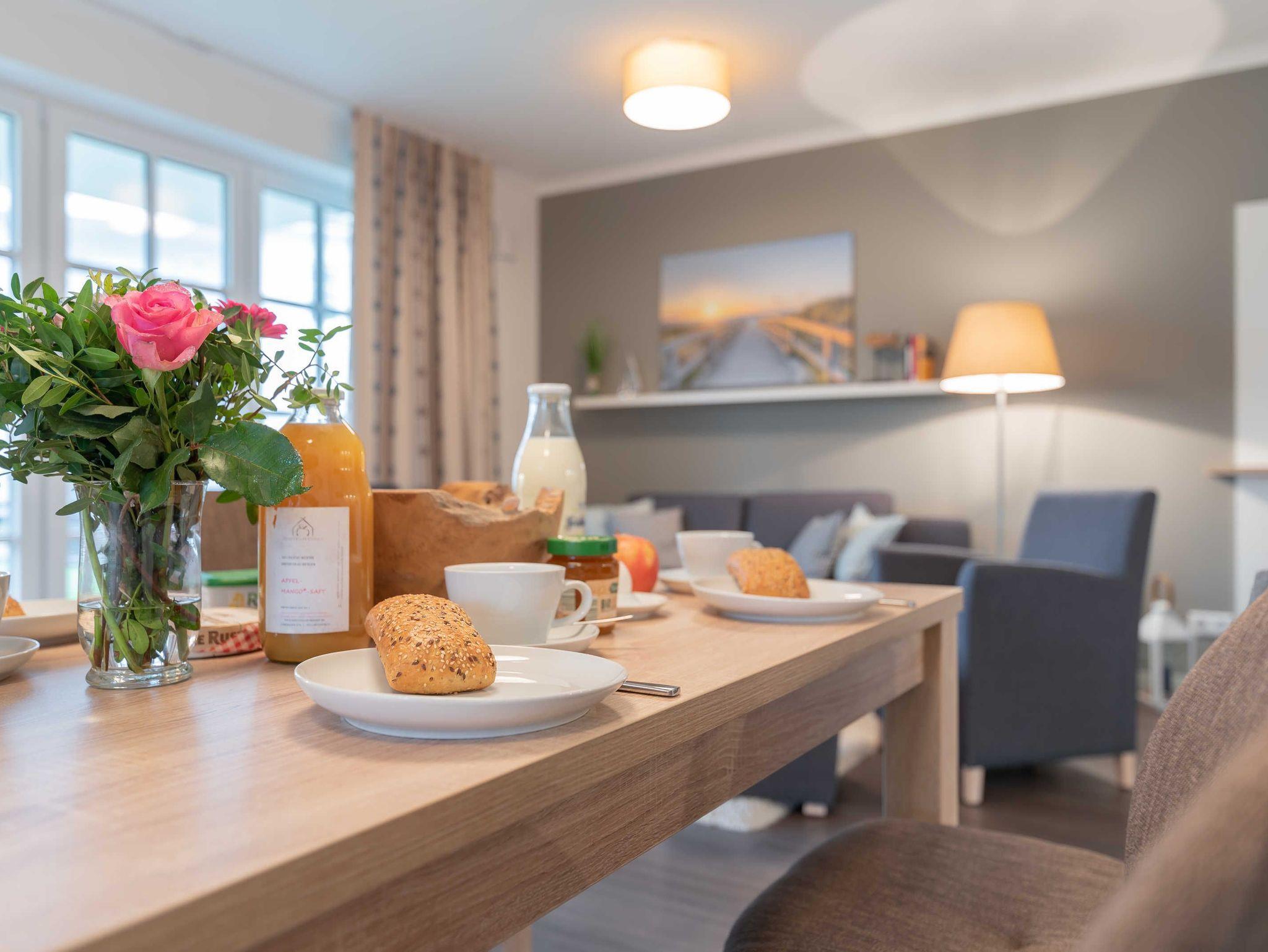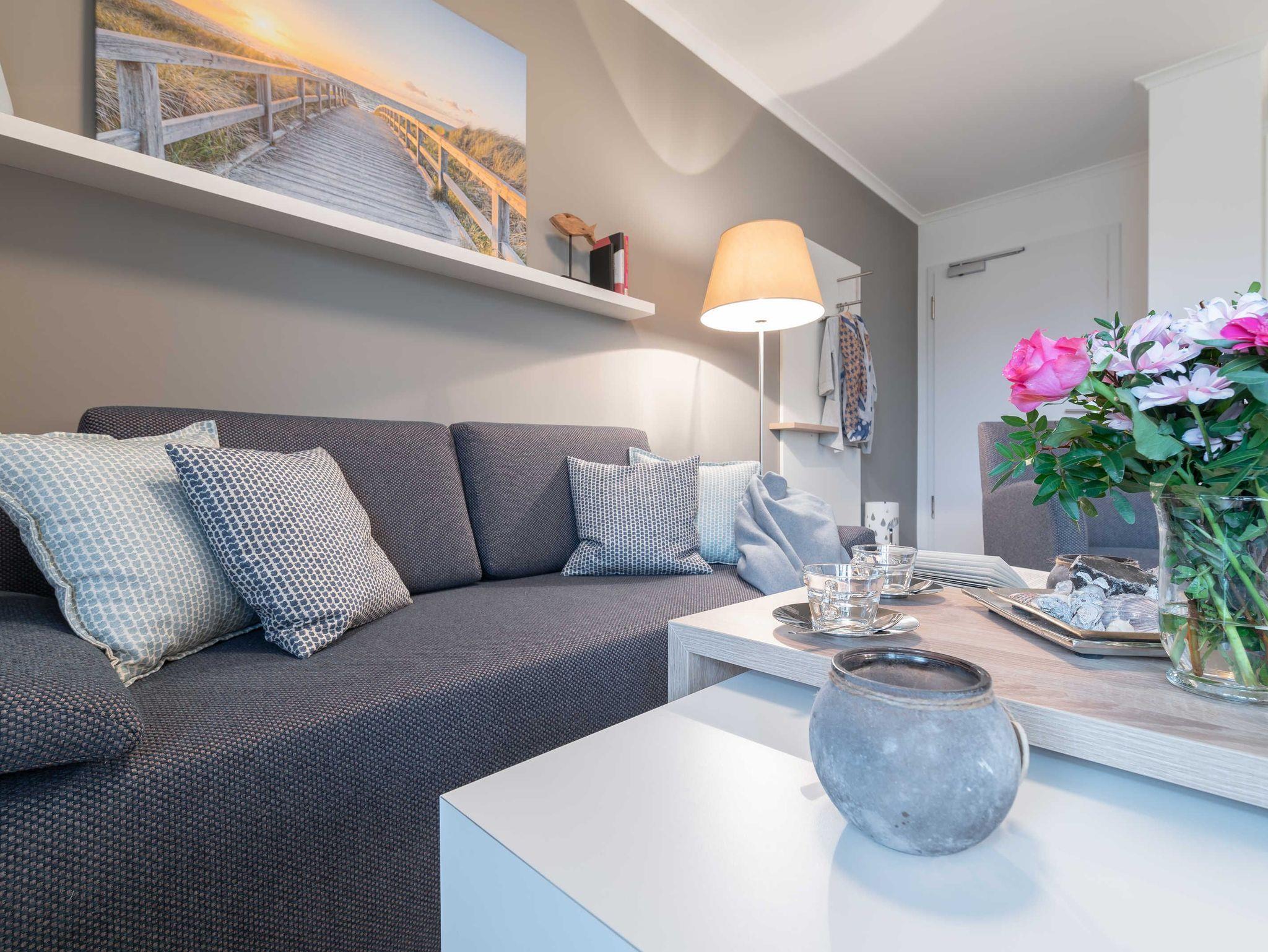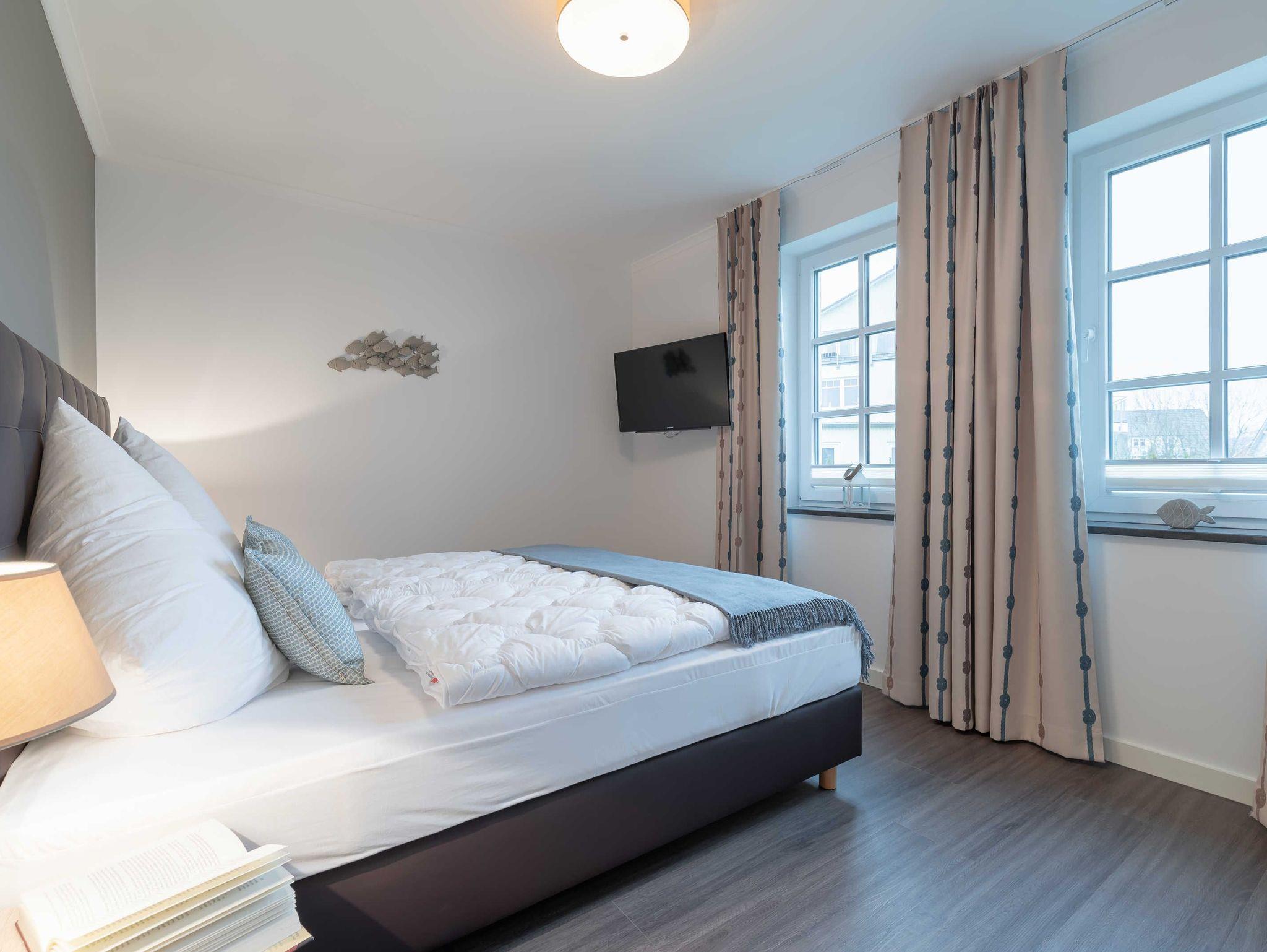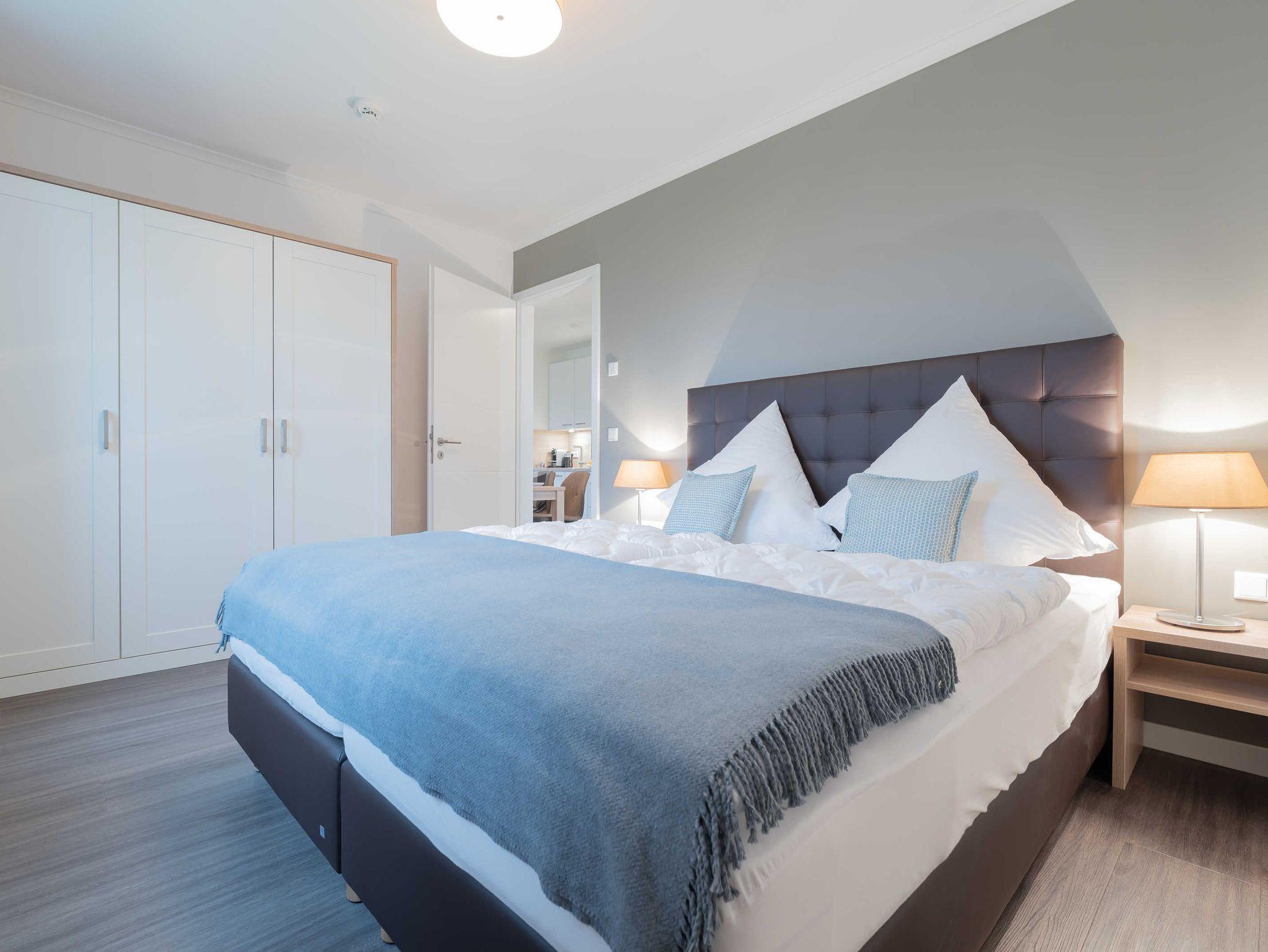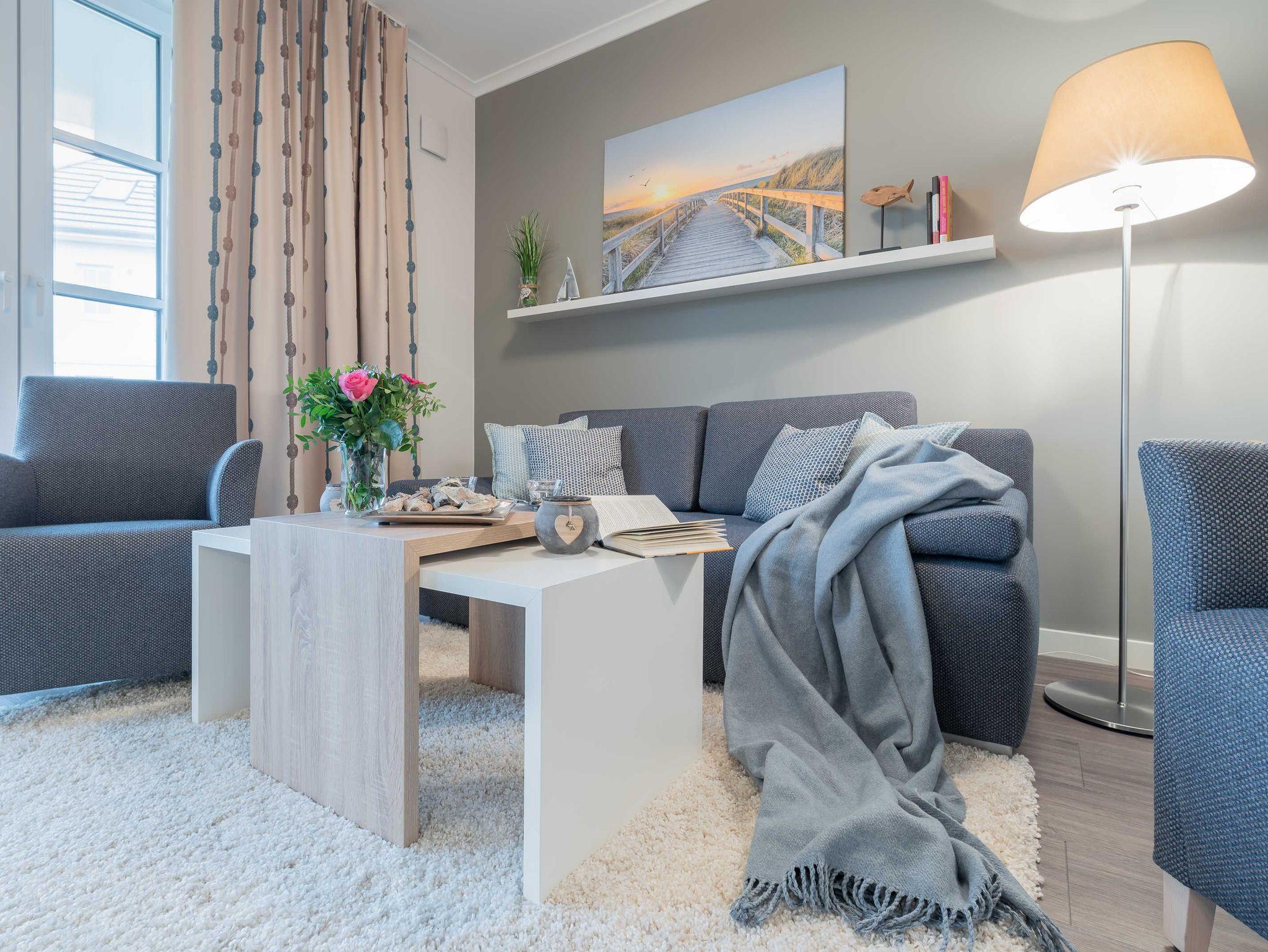 Die Wohnung besteht aus einem geschmackvoll eingerichteten Wohn-/Esszimmer mit Einbauküche und zwei Schlafräumen und verfügt zusätzlich über eine Süd-West-Terrasse, auf der man die Sonne von mittags bis zum frühen Abend genießen kann. Gemütliche Stunden lassen sich gut verbringen auf der bequemen Wohnzimmercouch mit Sessel, Fußhocker, Flachbild-TV und Blu-Ray-Player. Der Esstisch mit vier bequemen Stühlen lädt zu geselligen Spieleabenden ein. Im größeren Schlafzimmer empfangen Sie ein Boxspringbett (1,80 x 2,00 m), ein geräumiger Kleiderschrank, ein weiterer Flachbild-TV und ein integrierter Tresor für Ihre Wertsachen. Im kleinen Schlafzimmer befinden sich ein Boxspringbett (1,40 x 2,00 m) und ein geräumiger Kleiderschrank. Die Einbauküche ist voll ausgestattet mit 4-Platten-Glaskeramik-Kochfeld, Backofen, Kühlschrank inklusive Tiefkühlfach, Geschirrspüler, Nespresso-Maschine, Toaster, Kaffeemaschine und Wasserkocher. Im Tageslicht-Badezimmer befinden sich eine bodengleiche Dusche, ein großer Waschtisch mit beleuchtetem Spiegel, ein elektrischer Handtuchheizkörper sowie ein Haartrockner. In der kälteren Jahreszeit sorgt die Fußbodenheizung in allen Räumen für wohlige Wärme in der Wohnung. Ein modernes Lüftungssystem sichert ein angenehmes Raumklima.
