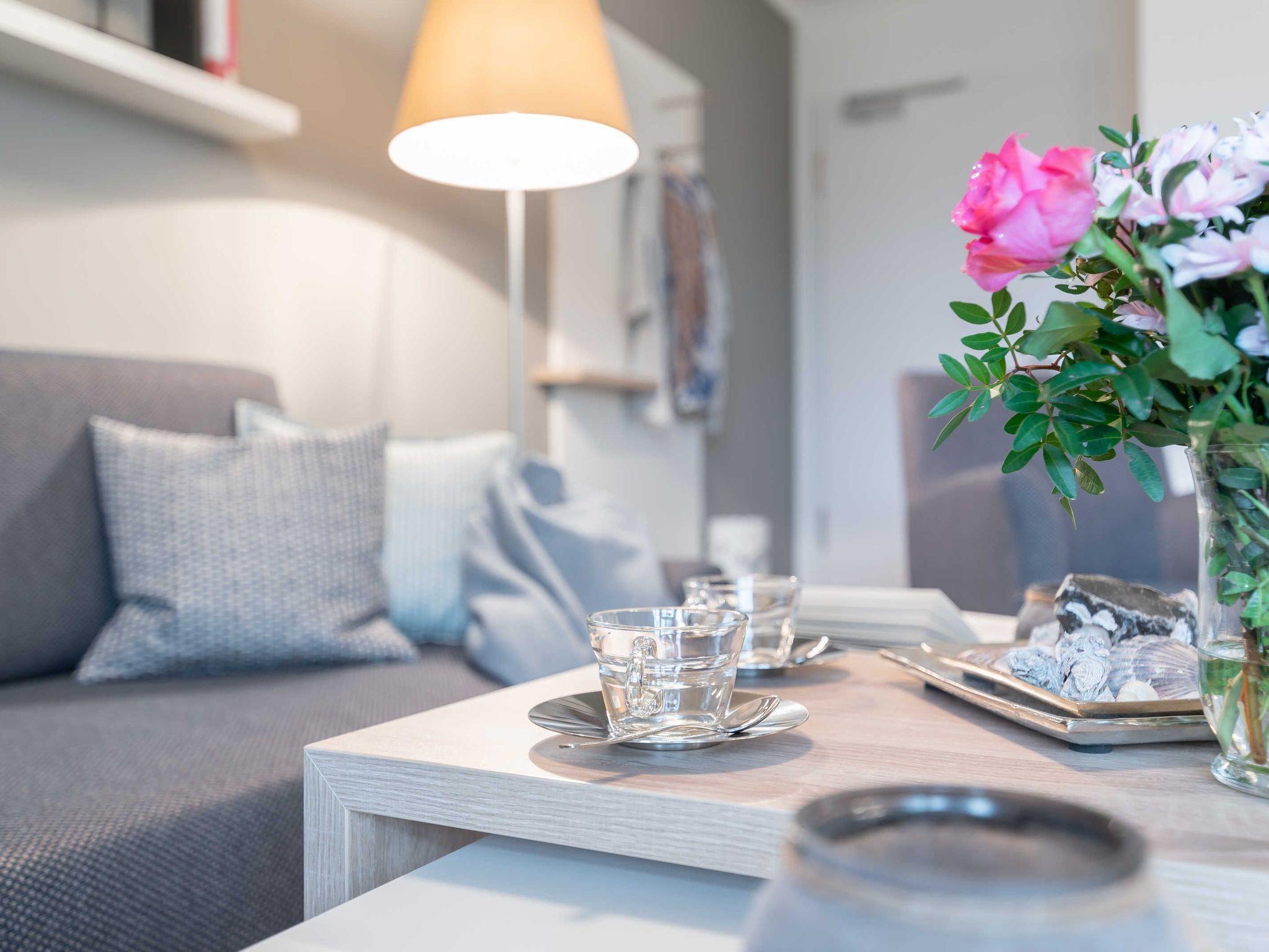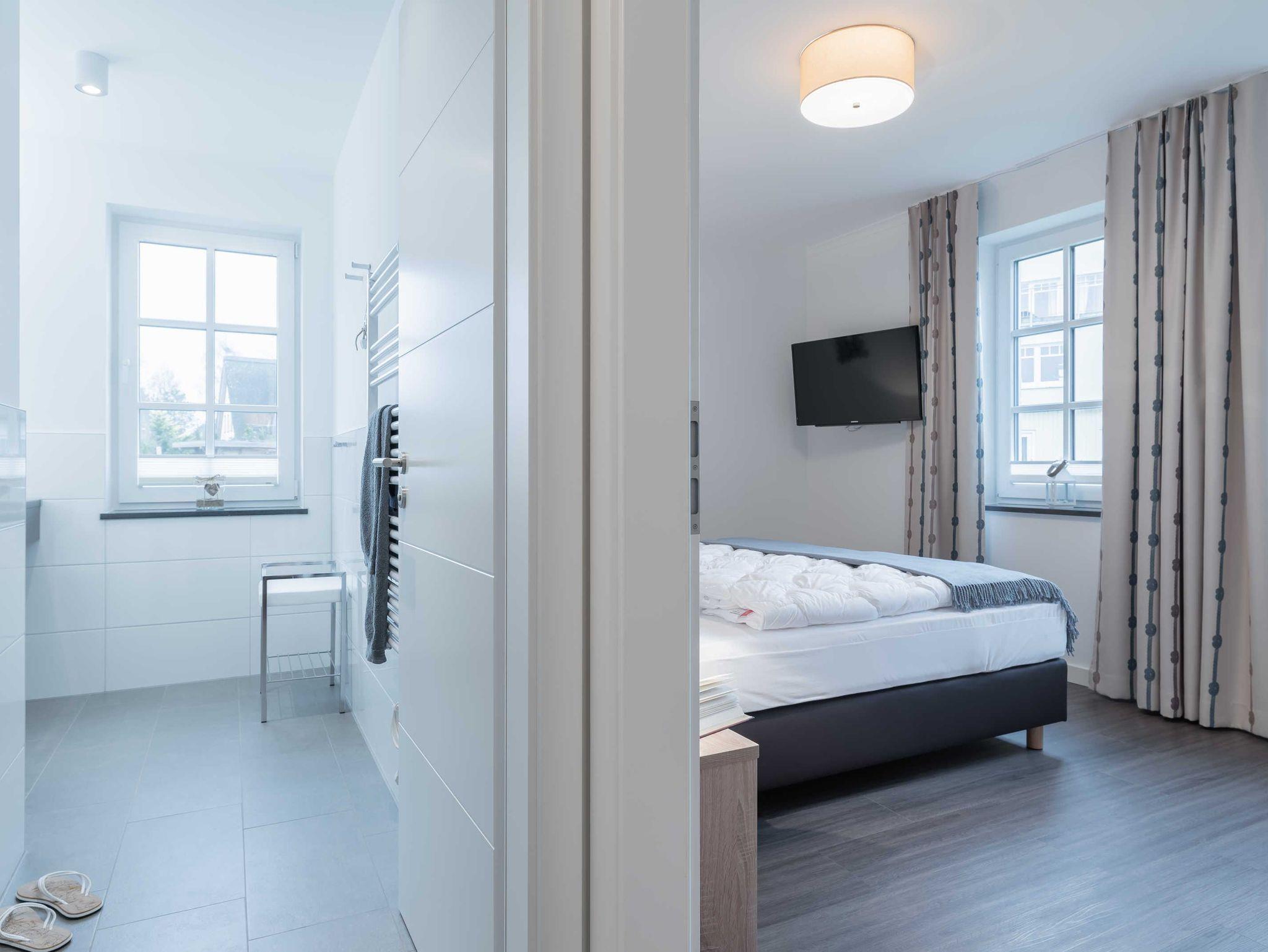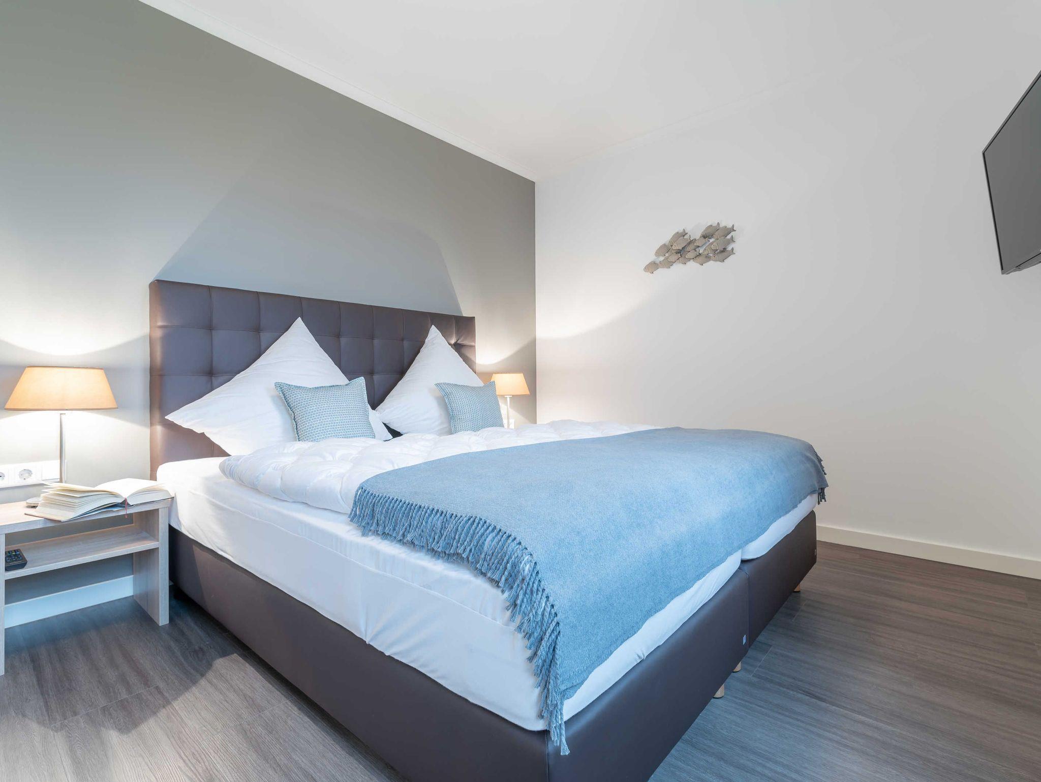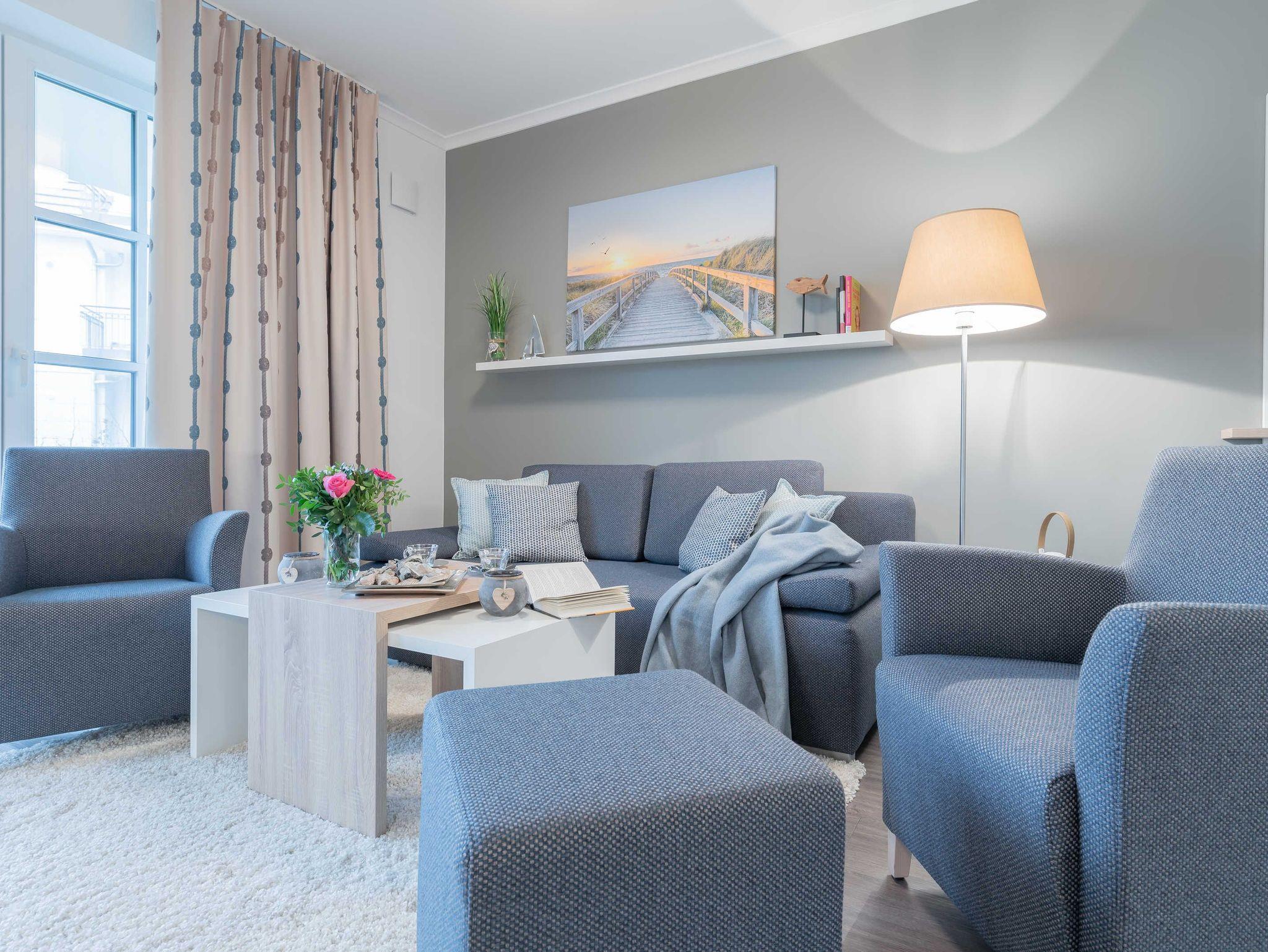 Die Wohnung besteht aus einem geschmackvoll eingerichteten Wohn-/Esszimmer mit Einbauküche und zwei Schlafräumen und verfügt zusätzlich über eine Süd-West-Terrasse, auf der man die Sonne von mittags bis zum frühen Abend genießen kann. Gemütliche Stunden lassen sich gut verbringen auf der bequemen Wohnzimmercouch mit Sessel, Fußhocker, Flachbild-TV und Blu-Ray-Player. Der Esstisch mit vier bequemen Stühlen lädt zu geselligen Spieleabenden ein. Im größeren Schlafzimmer empfangen Sie ein Boxspringbett (1,80 x 2,00 m), ein geräumiger Kleiderschrank, ein weiterer Flachbild-TV und ein integrierter Tresor für Ihre Wertsachen. Im kleinen Schlafzimmer befinden sich ein Boxspringbett (1,40 x 2,00 m) und ein geräumiger Kleiderschrank. Die Einbauküche ist voll ausgestattet mit 4-Platten-Glaskeramik-Kochfeld, Backofen, Kühlschrank inklusive Tiefkühlfach, Geschirrspüler, Nespresso-Maschine, Toaster, Kaffeemaschine und Wasserkocher. Im Tageslicht-Badezimmer befinden sich eine bodengleiche Dusche, ein großer Waschtisch mit beleuchtetem Spiegel, ein elektrischer Handtuchheizkörper sowie ein Haartrockner. In der kälteren Jahreszeit sorgt die Fußbodenheizung in allen Räumen für wohlige Wärme in der Wohnung. Ein modernes Lüftungssystem sichert ein angenehmes Raumklima.