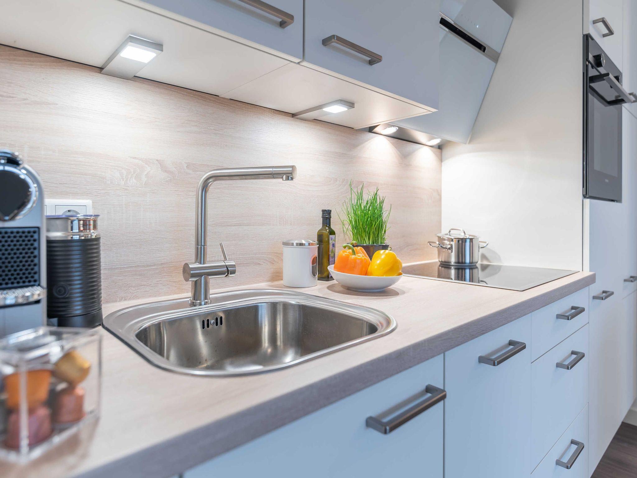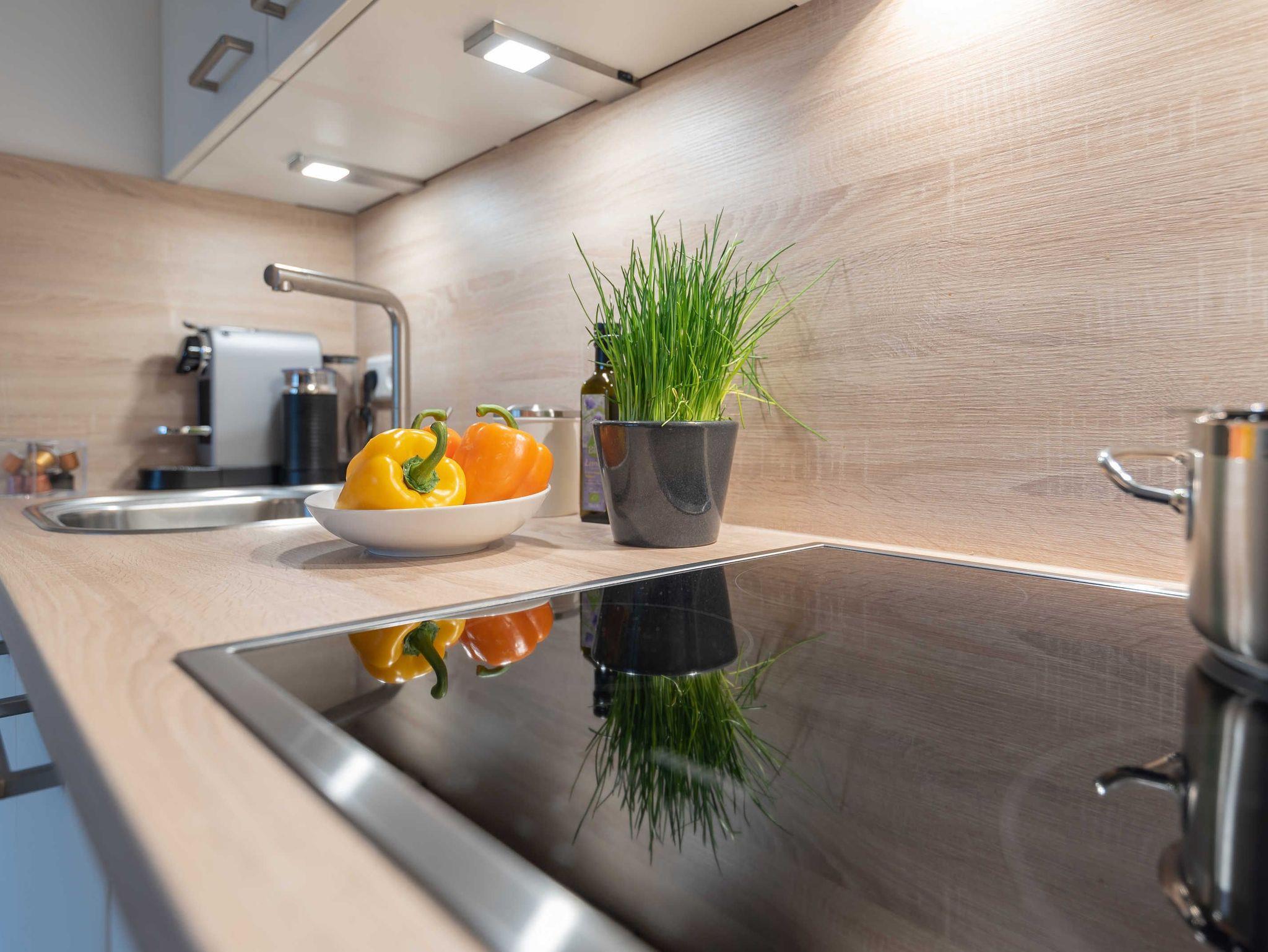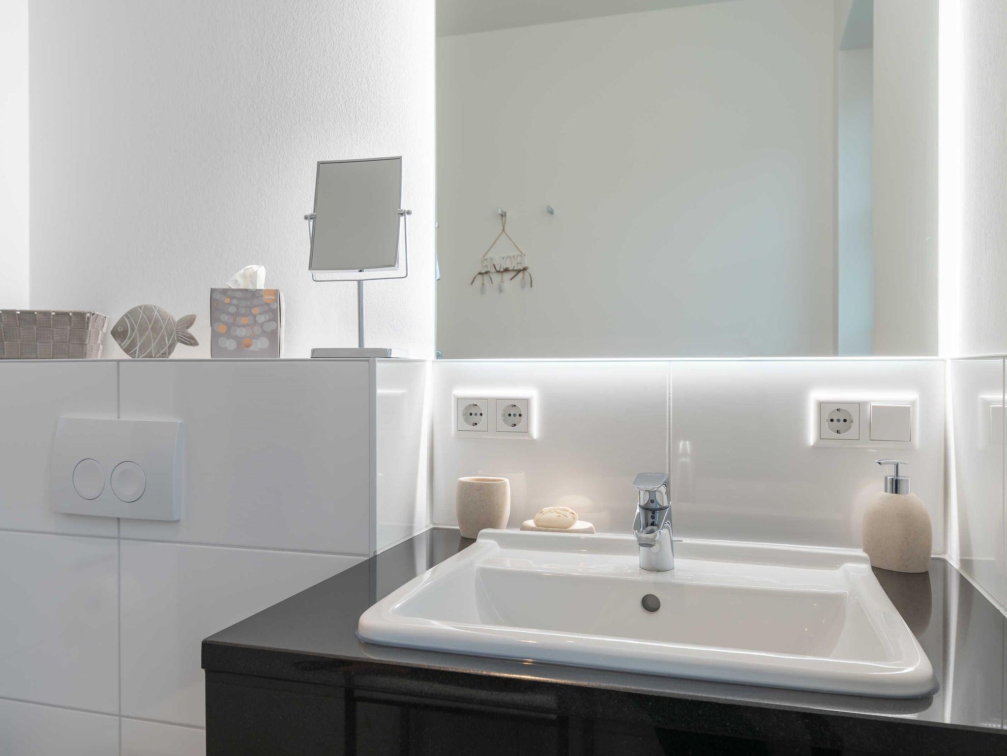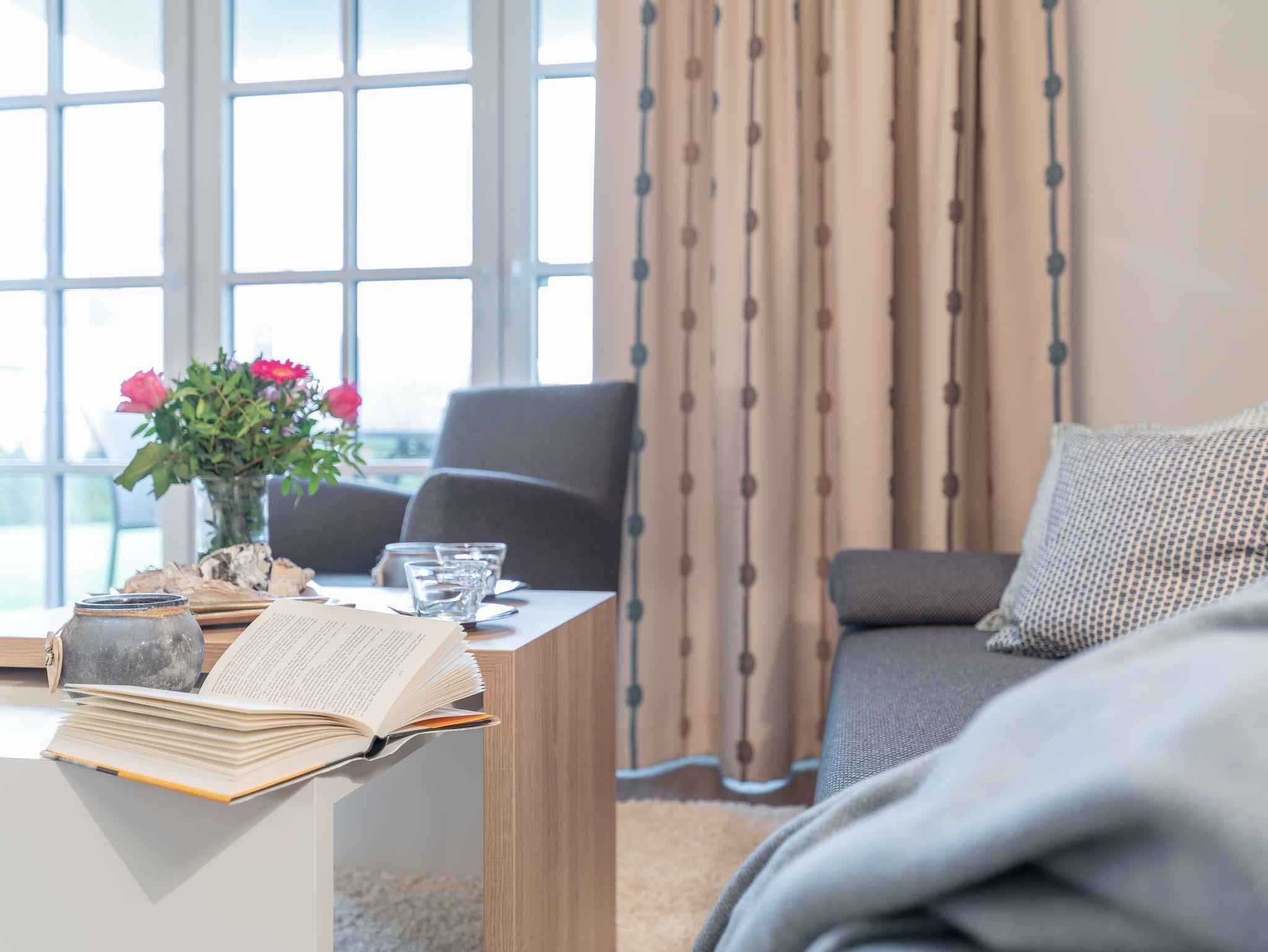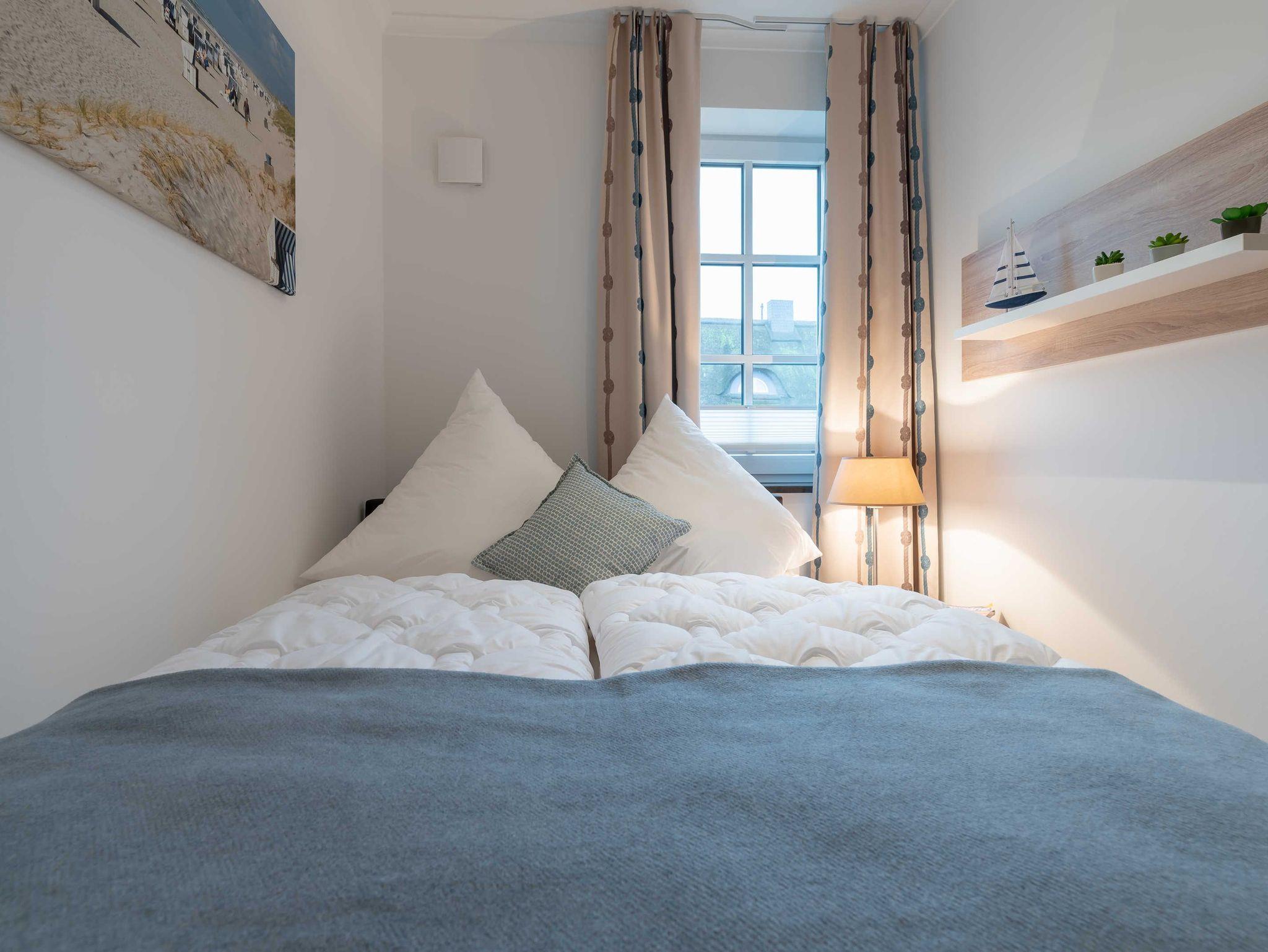 Die Wohnung besteht aus einem geschmackvoll eingerichteten Wohn-/Esszimmer mit Einbauküche und zwei Schlafräumen und verfügt zusätzlich über eine Süd-West-Terrasse, auf der man die Sonne von mittags bis zum frühen Abend genießen kann. Gemütliche Stunden lassen sich gut verbringen auf der bequemen Wohnzimmercouch mit Sessel, Fußhocker, Flachbild-TV und Blu-Ray-Player. Der Esstisch mit vier bequemen Stühlen lädt zu geselligen Spieleabenden ein. Im größeren Schlafzimmer empfangen Sie ein Boxspringbett (1,80 x 2,00 m), ein geräumiger Kleiderschrank, ein weiterer Flachbild-TV und ein integrierter Tresor für Ihre Wertsachen. Im kleinen Schlafzimmer befinden sich ein Boxspringbett (1,40 x 2,00 m) und ein geräumiger Kleiderschrank. Die Einbauküche ist voll ausgestattet mit 4-Platten-Glaskeramik-Kochfeld, Backofen, Kühlschrank inklusive Tiefkühlfach, Geschirrspüler, Nespresso-Maschine, Toaster, Kaffeemaschine und Wasserkocher. Im Tageslicht-Badezimmer befinden sich eine bodengleiche Dusche, ein großer Waschtisch mit beleuchtetem Spiegel, ein elektrischer Handtuchheizkörper sowie ein Haartrockner. In der kälteren Jahreszeit sorgt die Fußbodenheizung in allen Räumen für wohlige Wärme in der Wohnung. Ein modernes Lüftungssystem sichert ein angenehmes Raumklima.