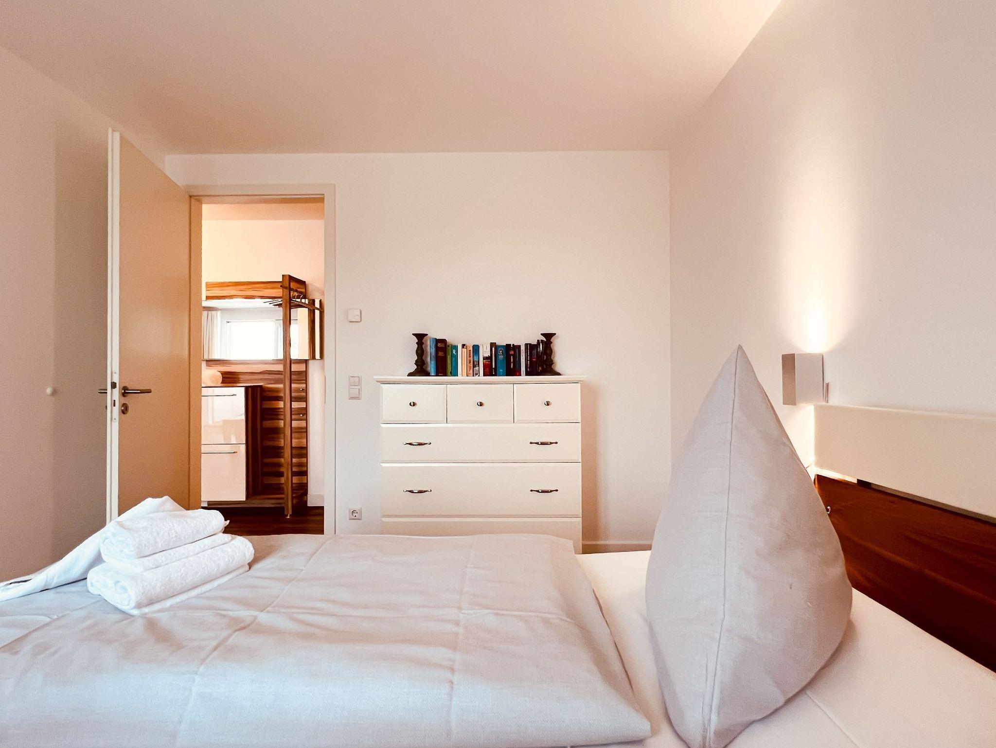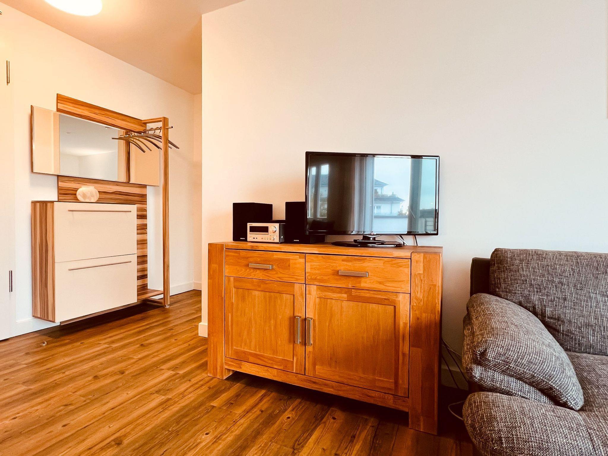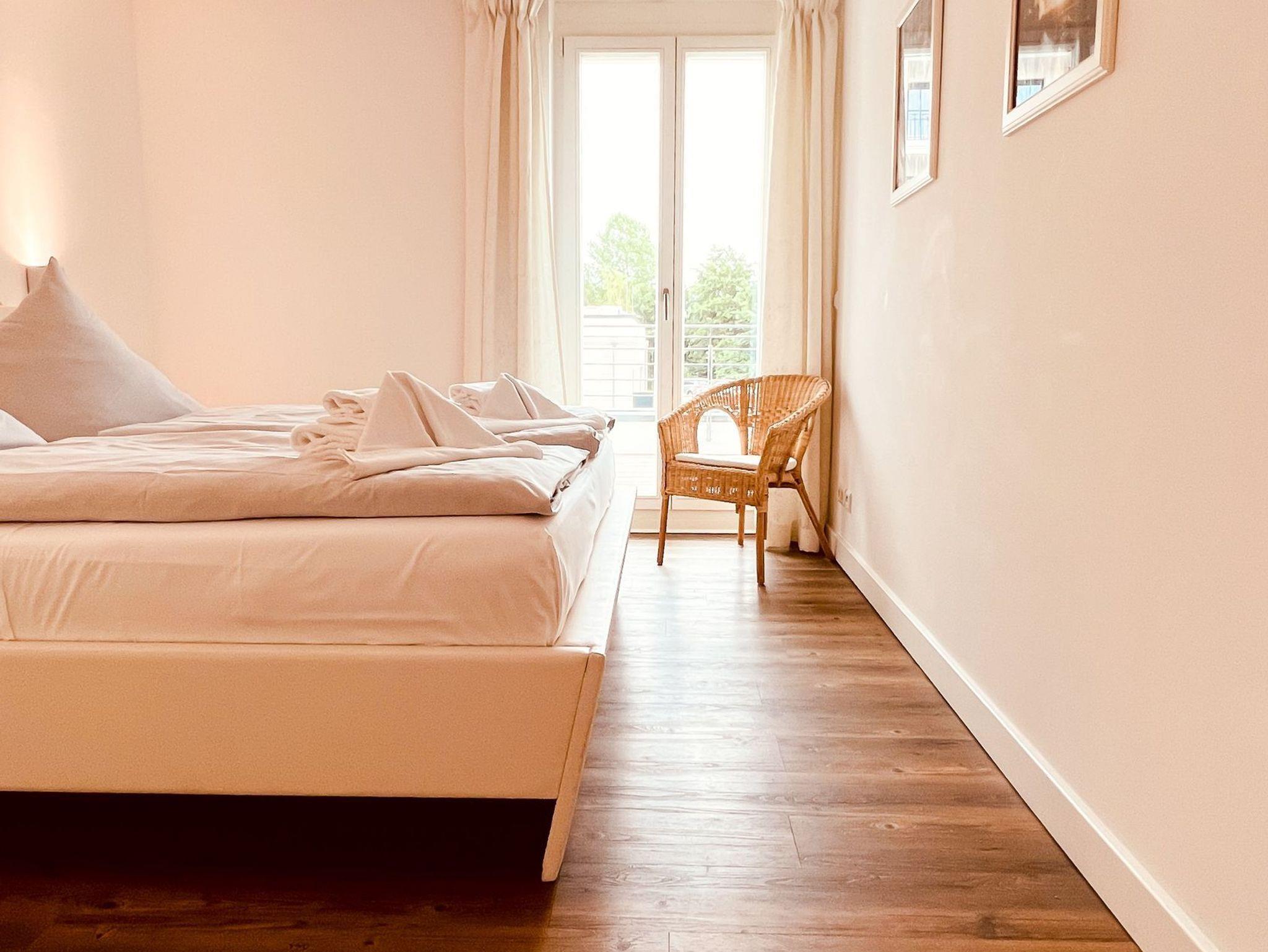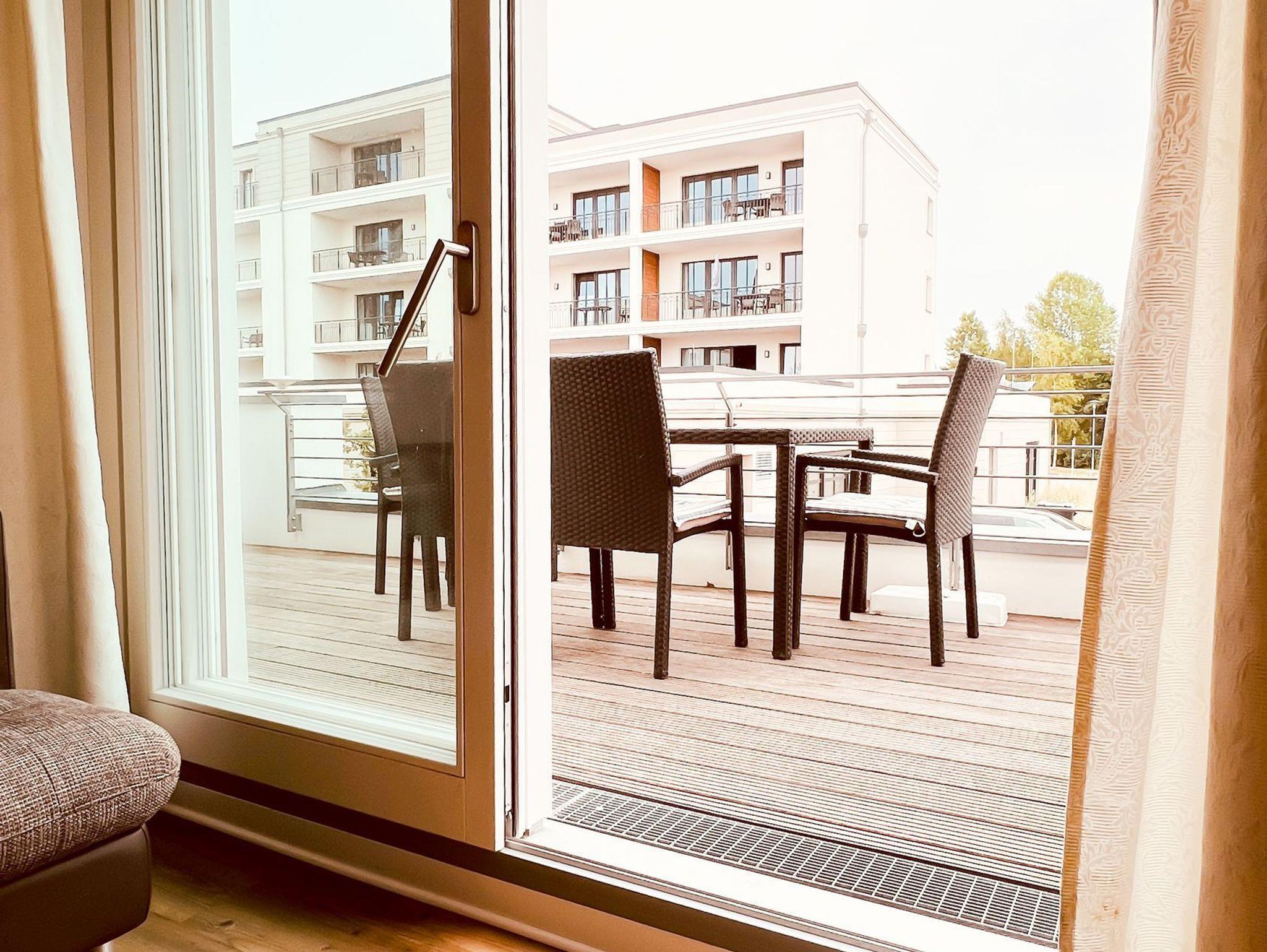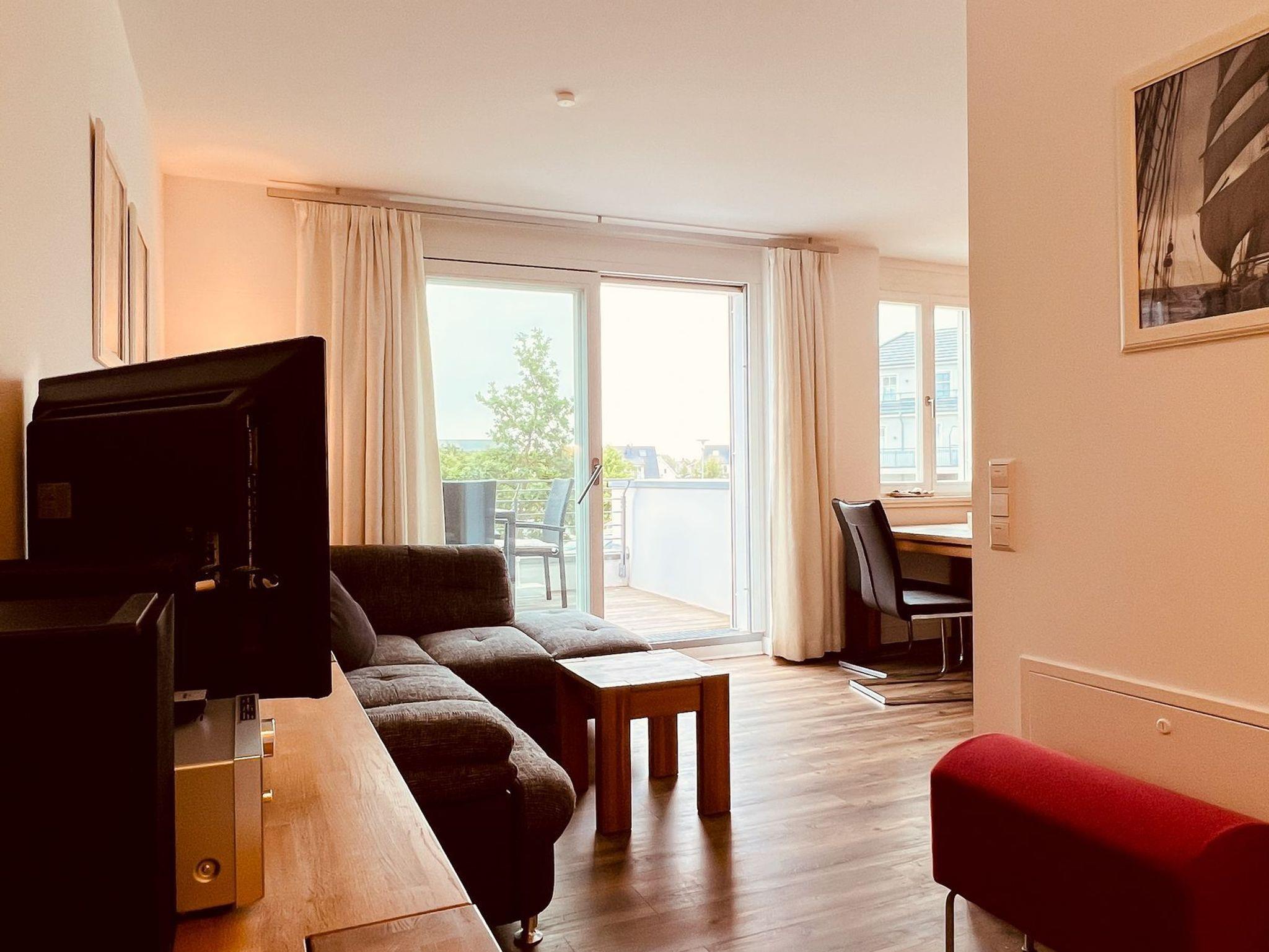 Strandnahe Zwei-Raumwohnung für max. vier Erwachsene und ein Kind mit seitlichem Meerblick, Sauna und Balkon im 1. OG.